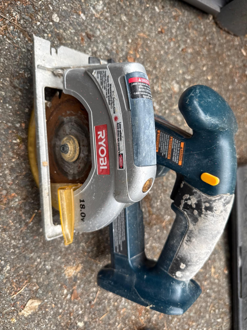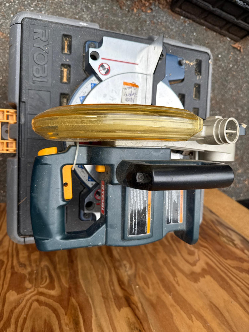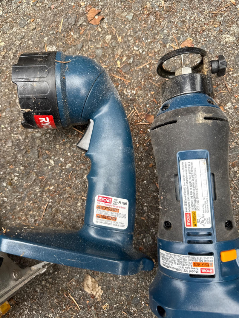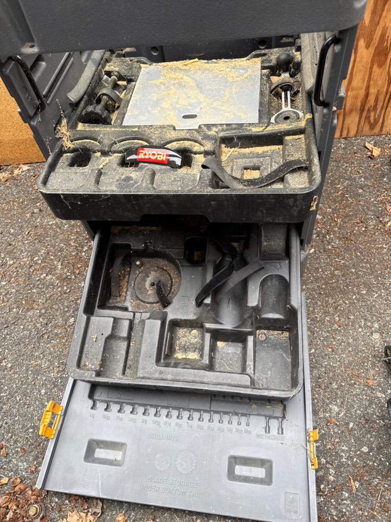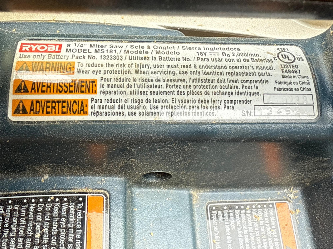 Rolling Ryobi tool shop. Tools require battery power. Model SPC18 Rolling box with drawers, ruler and adjustable handle. Model P500 5.5in circular saw. Model RJC181 reciprocating saw Model MS181 8 1/4in Miter Saw Additional tools include, flashlight, palm sander, detail tool, vacuum bag Tools require a battery and charger. If found will be added.