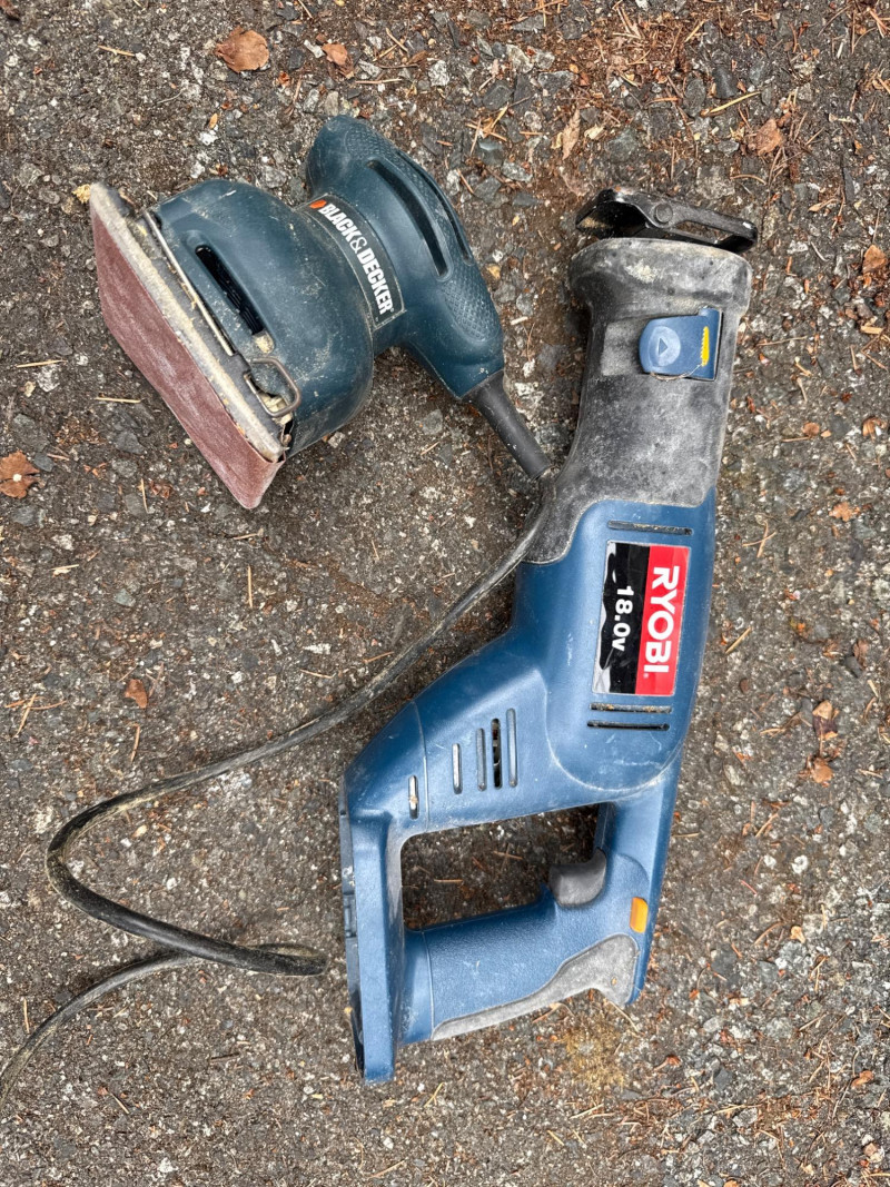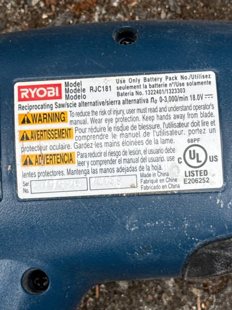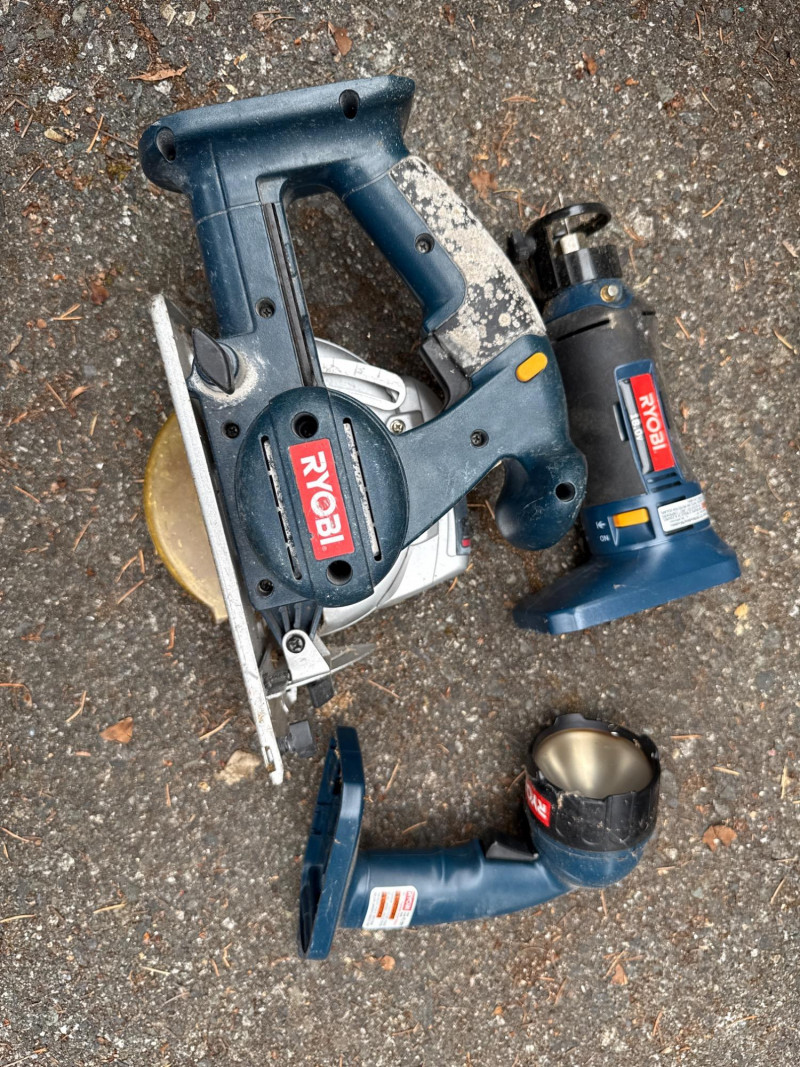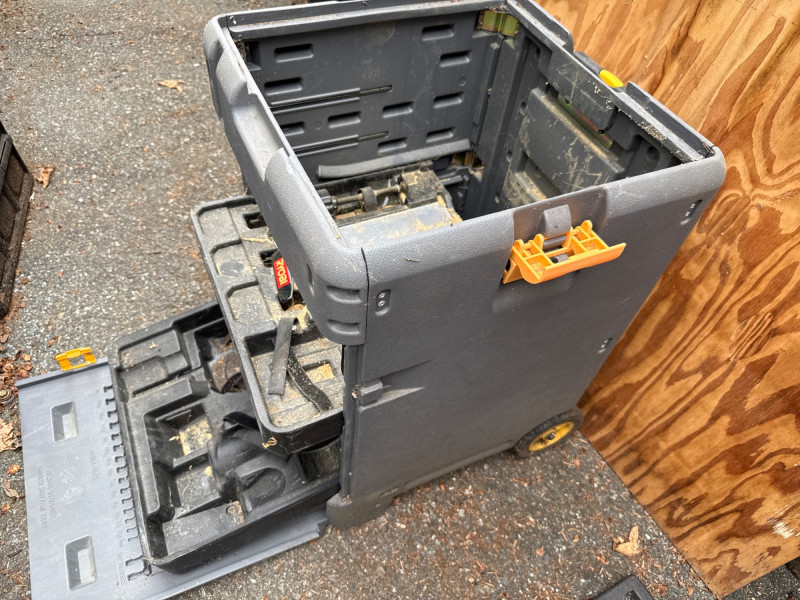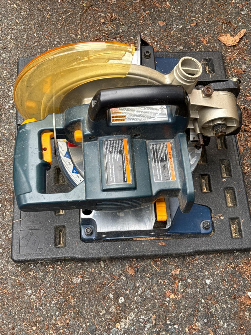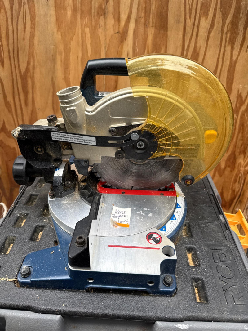 Rolling Ryobi tool shop. Tools require battery power. Model SPC18 Rolling box with drawers, ruler and adjustable handle. Model P500 5.5in circular saw. Model RJC181 reciprocating saw Model MS181 8 1/4in Miter Saw Additional tools include, flashlight, palm sander, detail tool, vacuum bag Tools require a battery and charger. If found will be added.