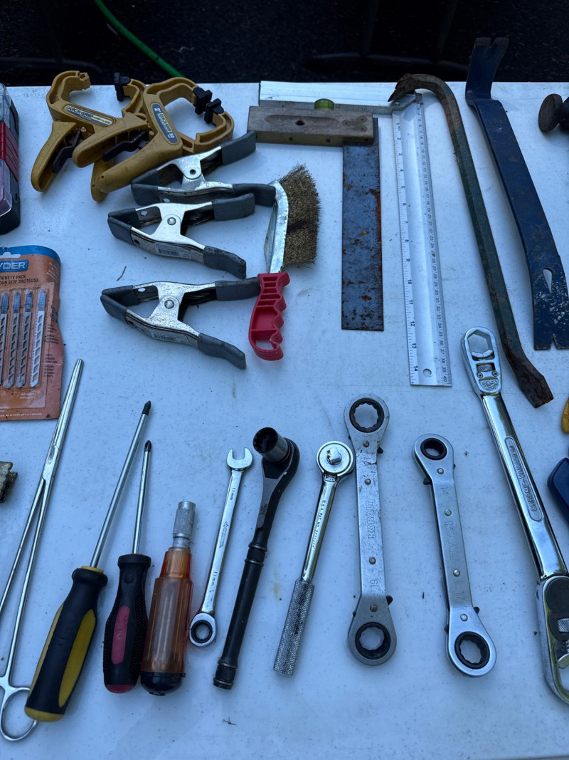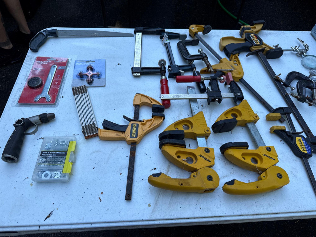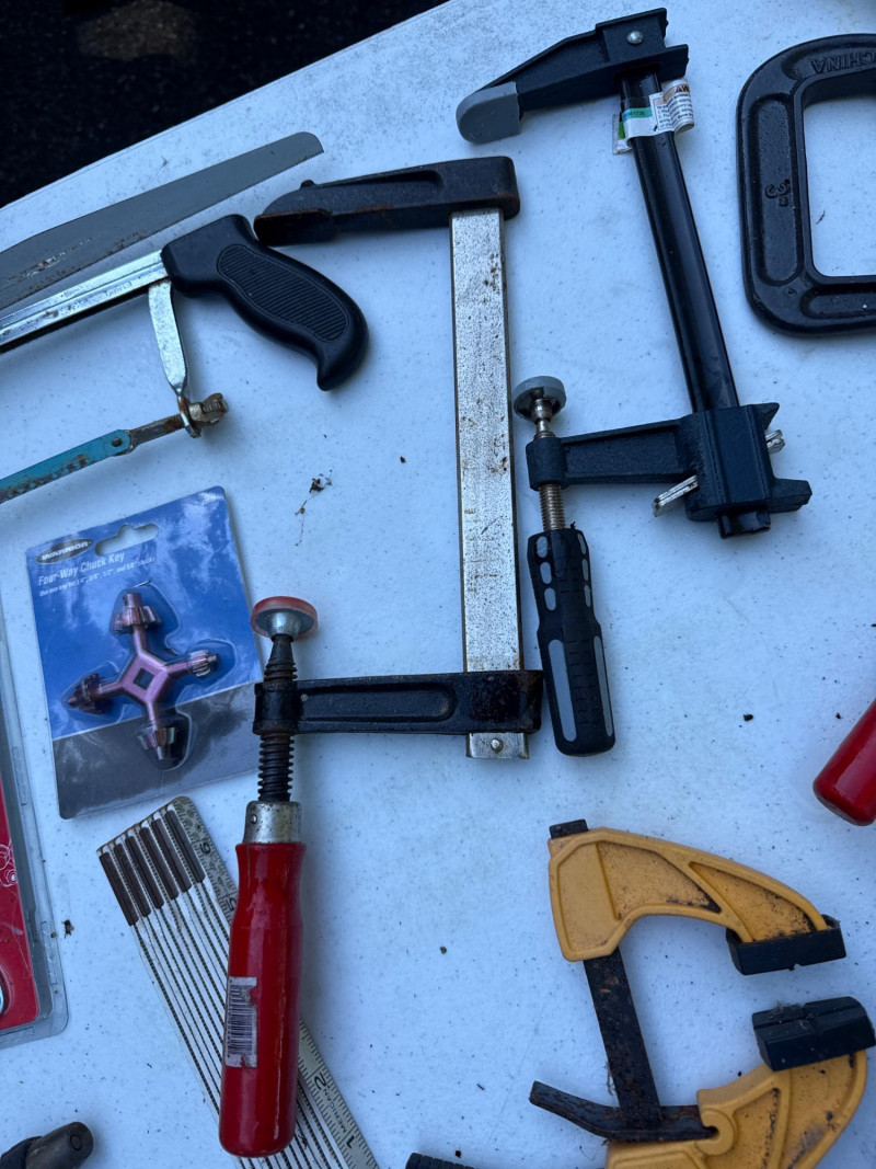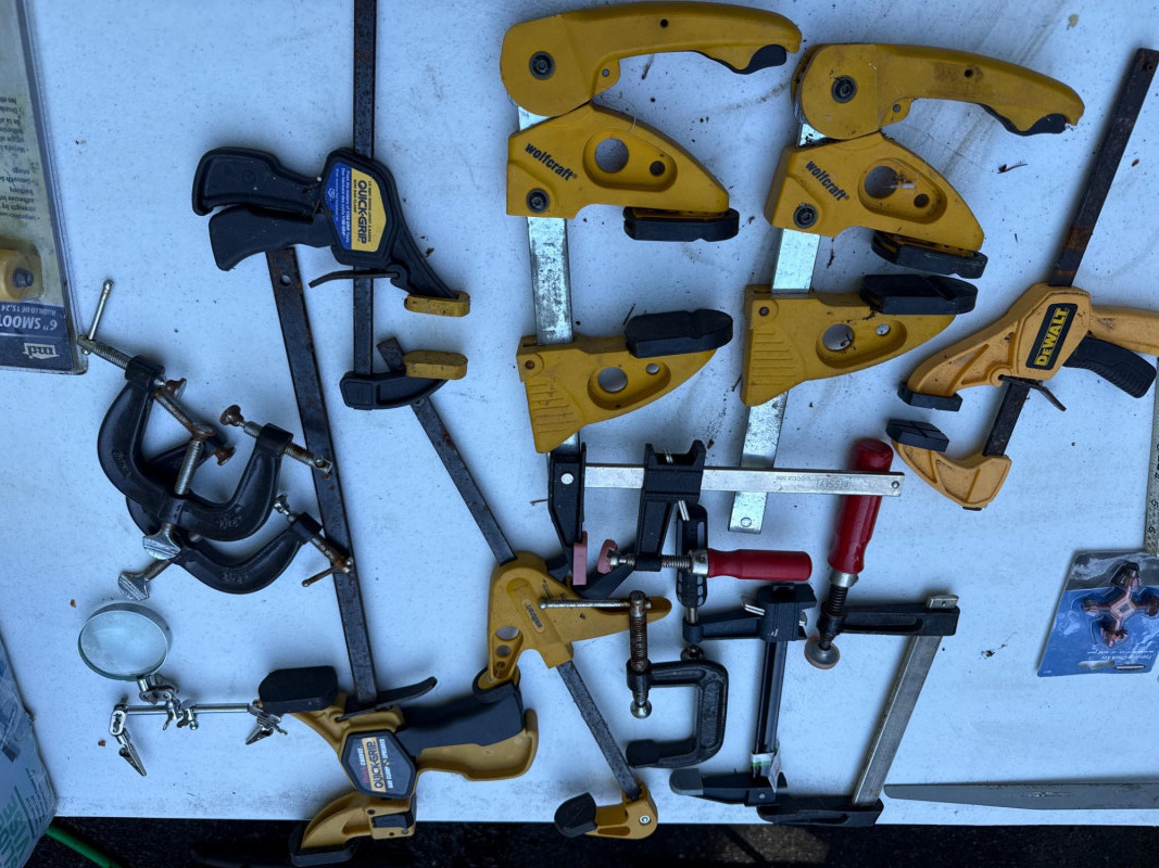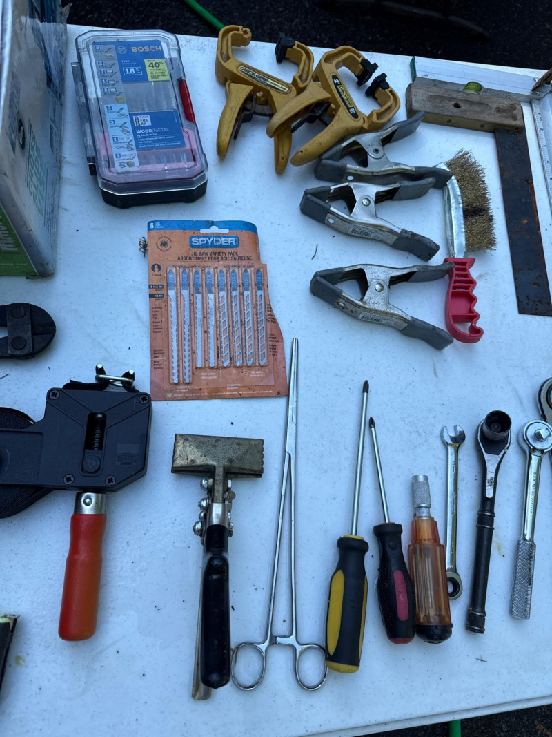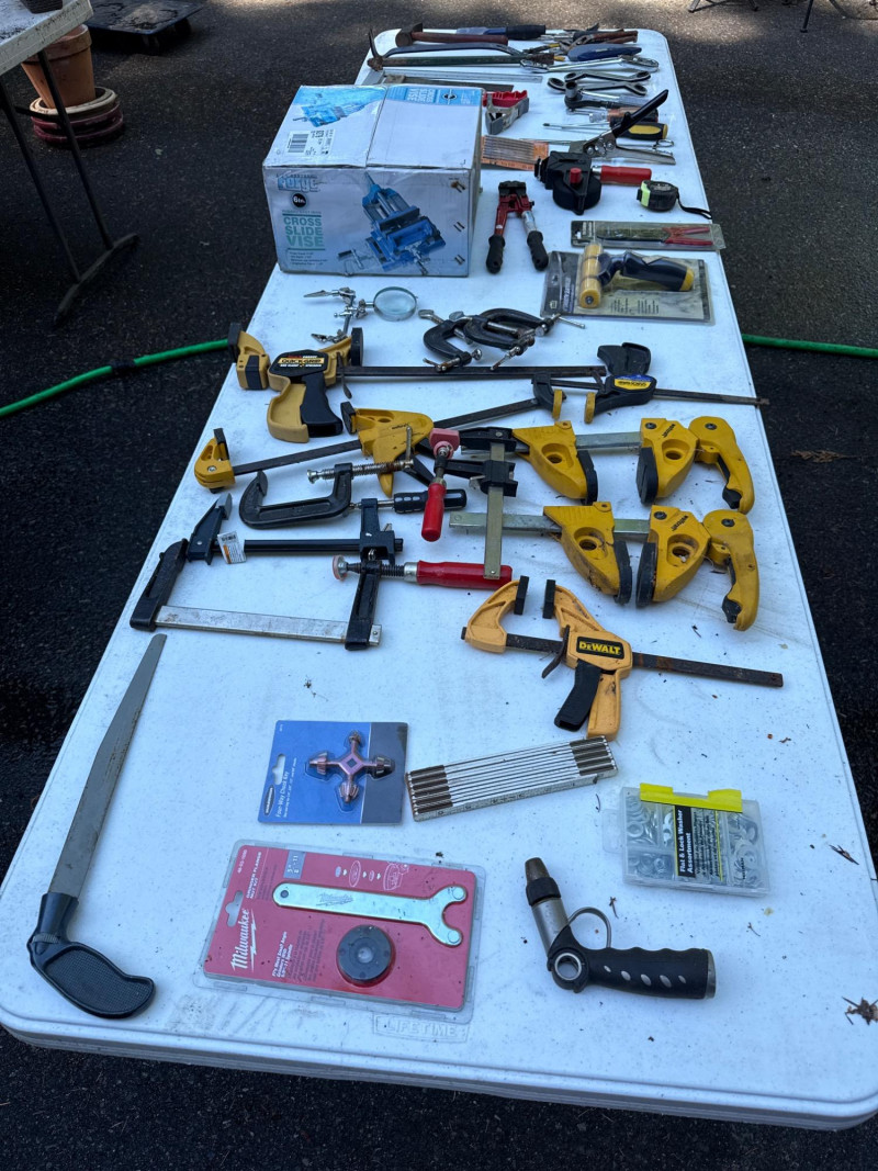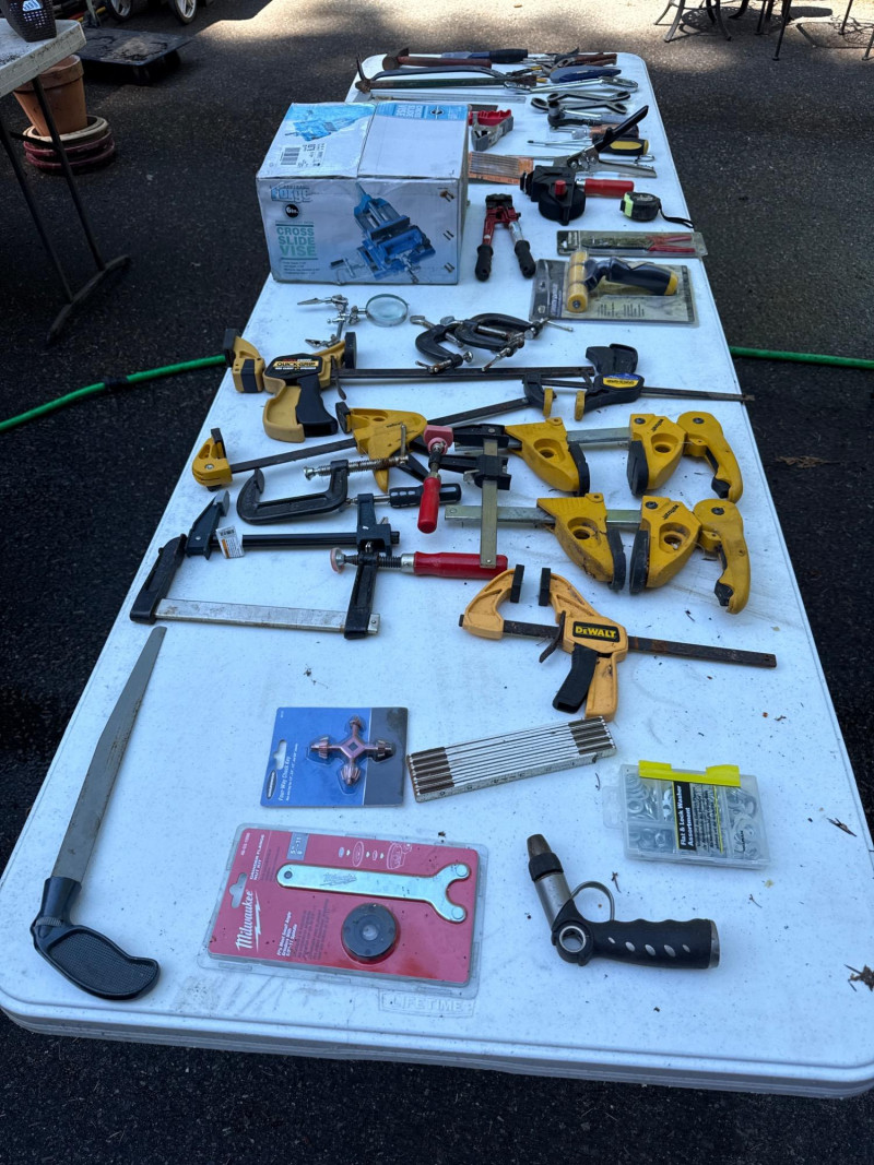 Table of tools with new and used items. NIB-Central Forge cross slide vice. Wolfcraft, Irwin and Bessel bar clamps. Bosch blades, Spyder blades Lots to view. Bring your own container to haul