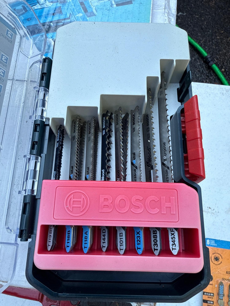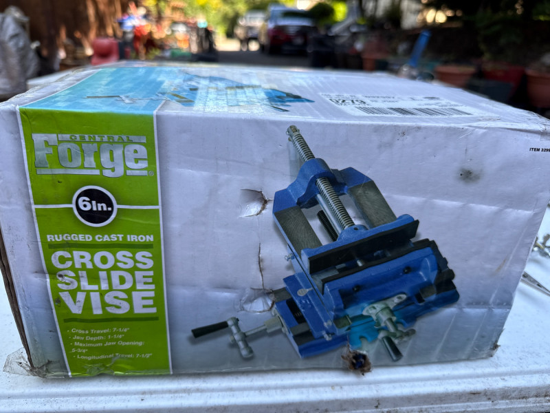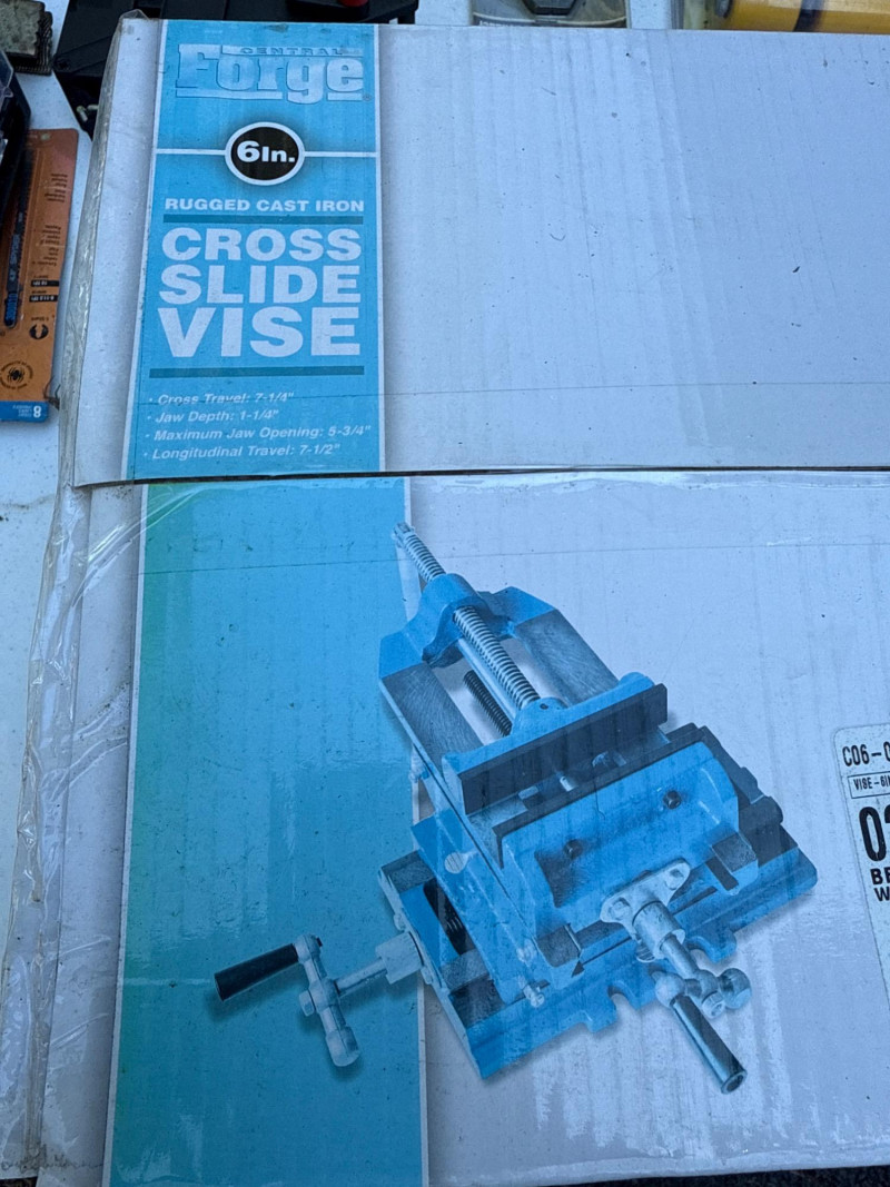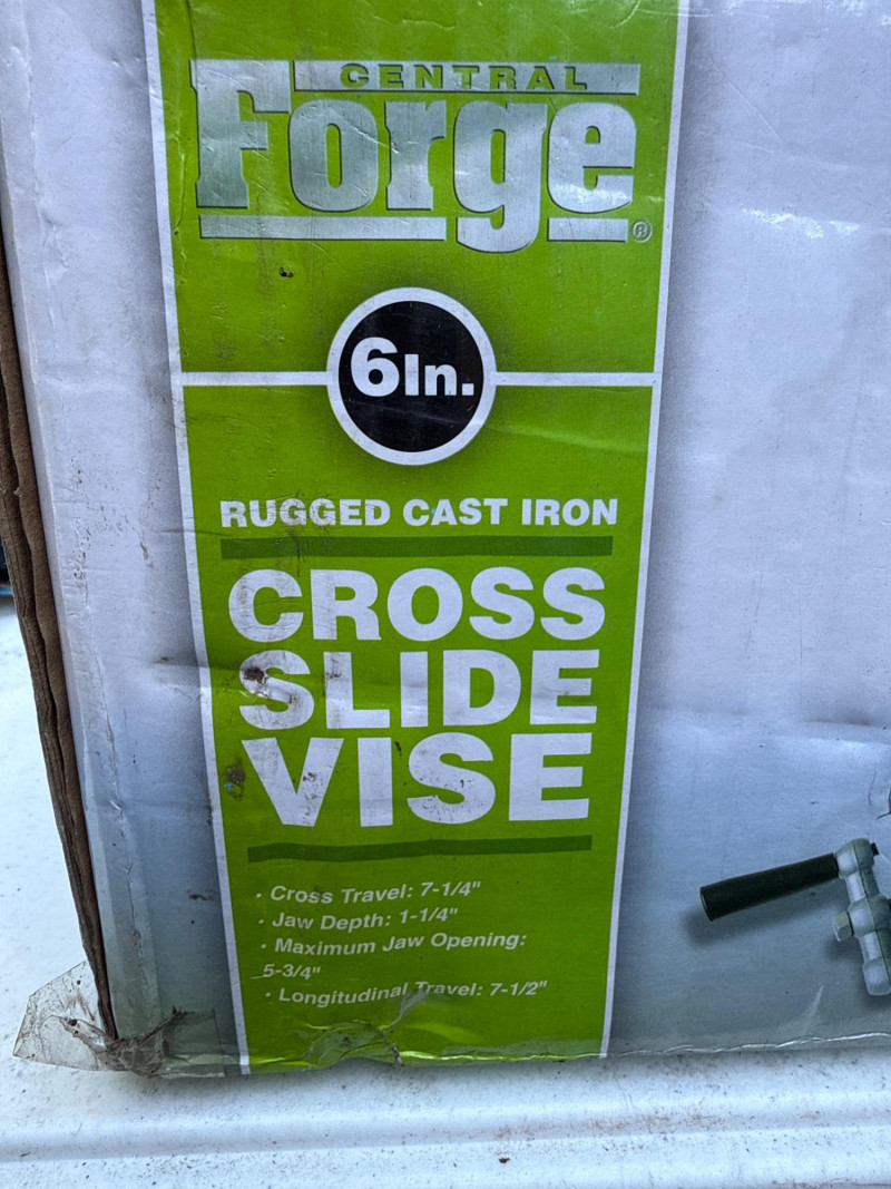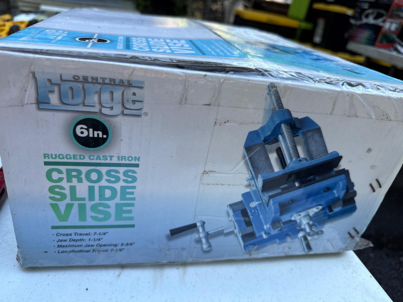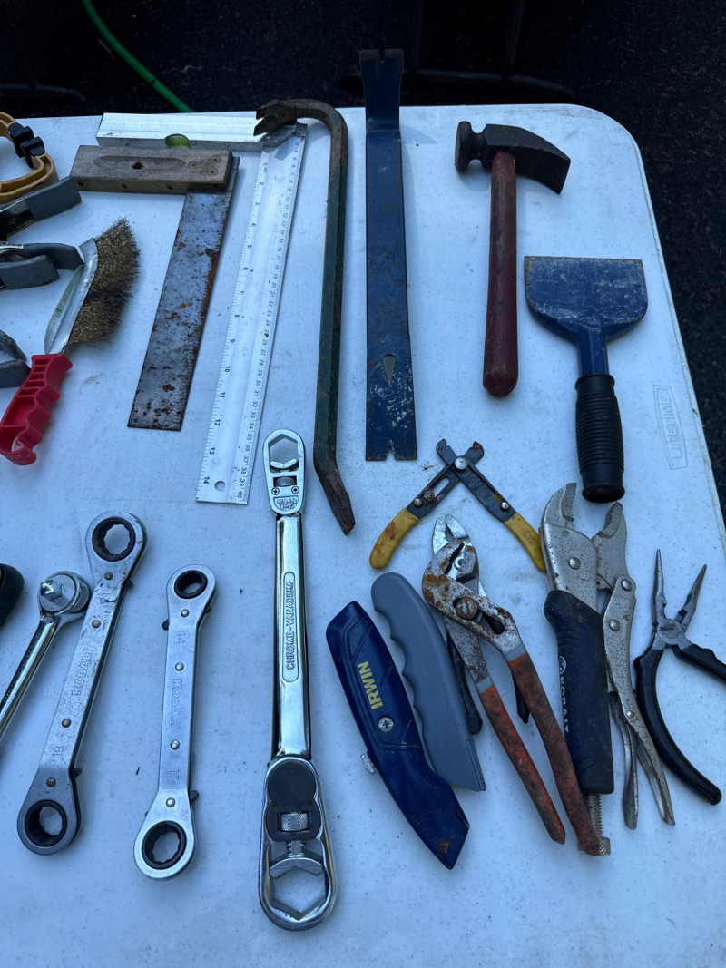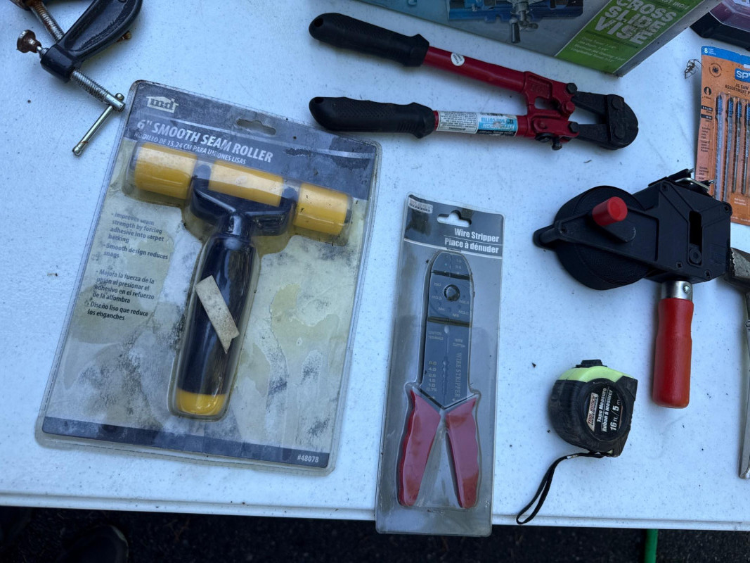 Table of tools with new and used items. NIB-Central Forge cross slide vice. Wolfcraft, Irwin and Bessel bar clamps. Bosch blades, Spyder blades Lots to view. Bring your own container to haul