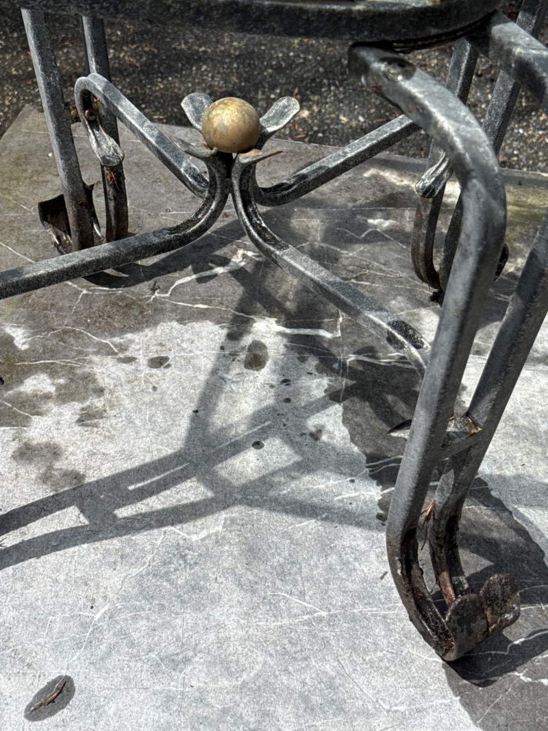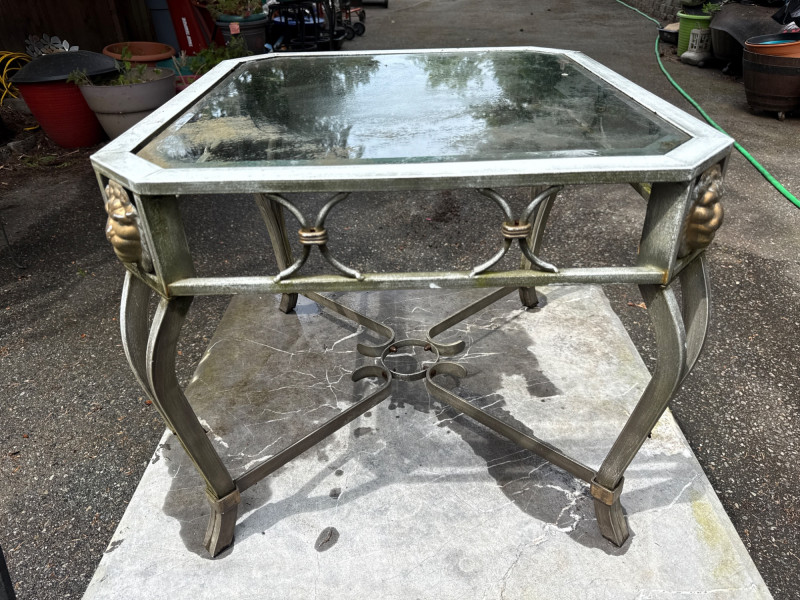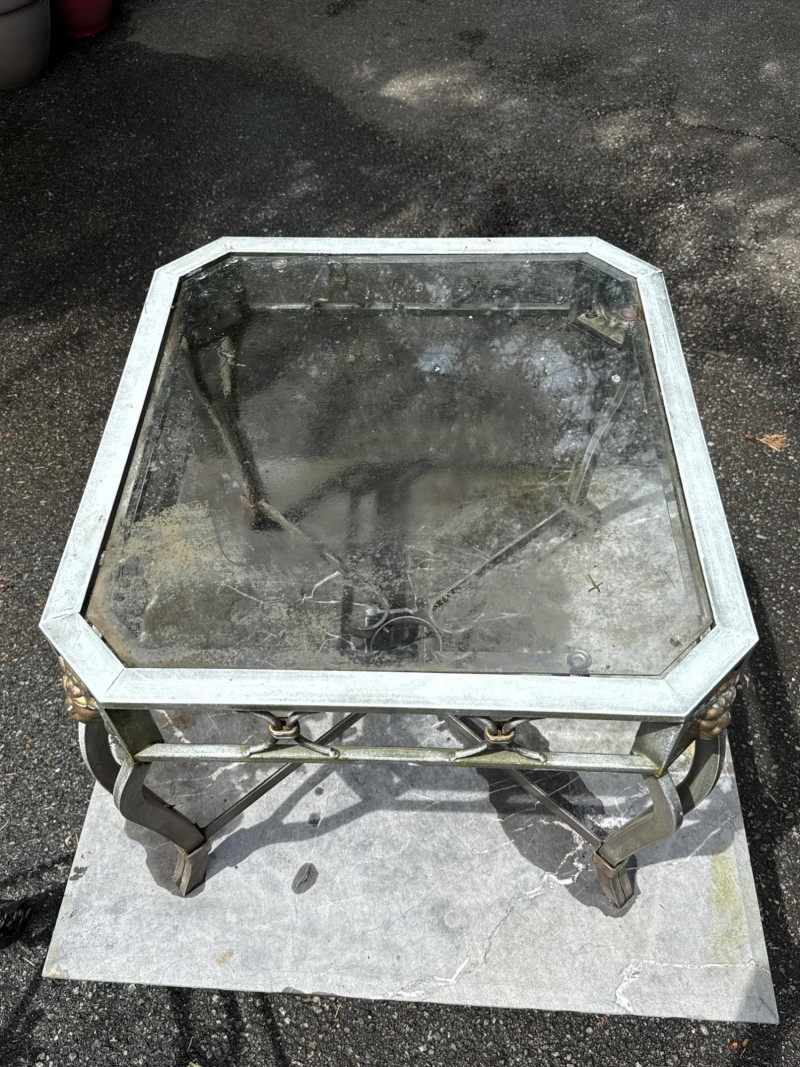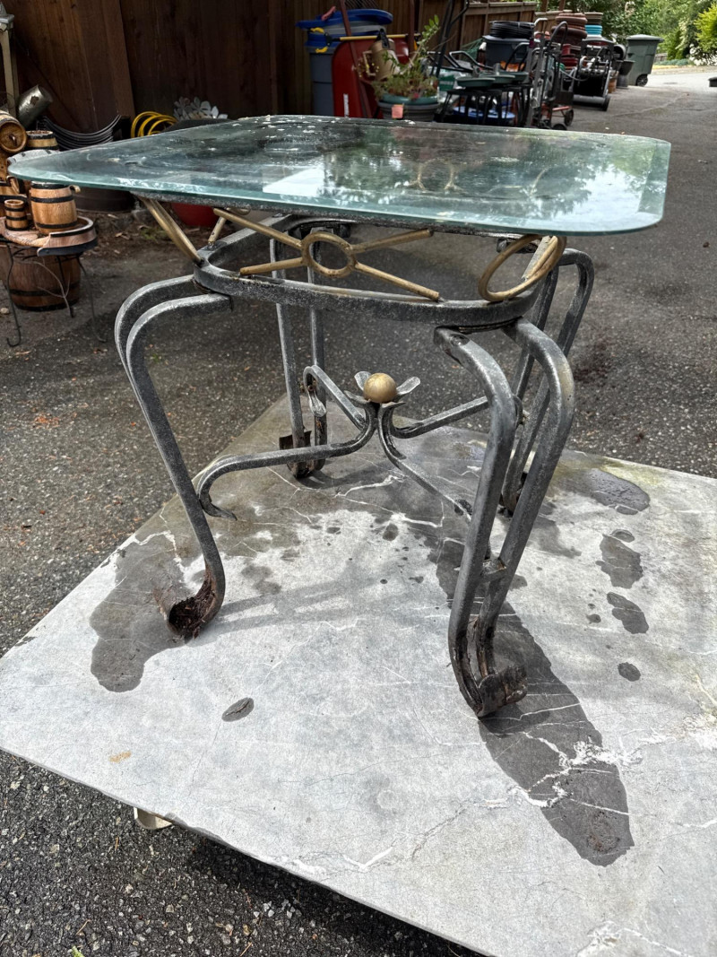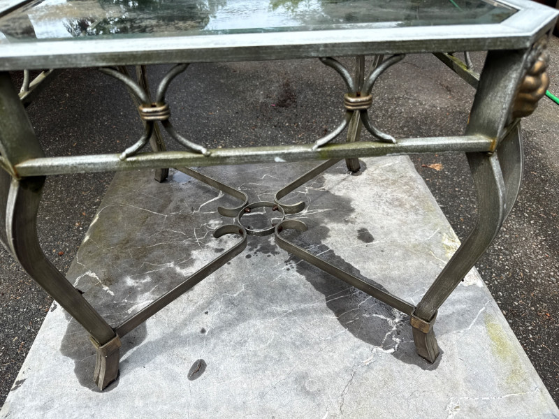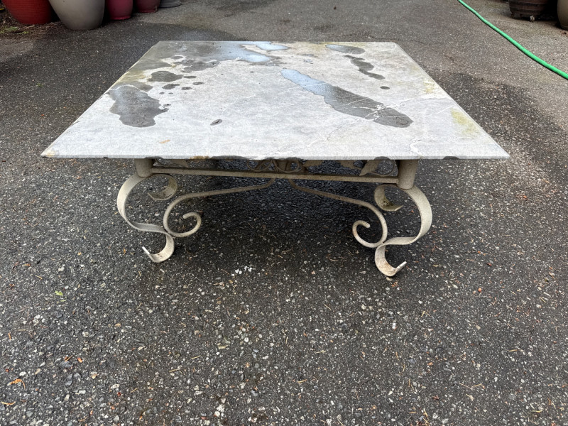 Four ornate tables with metal frames and glass/marble tops. Glass is beveled and in good condition. Needs cleaned. Large square table includes very heavy marble top. Will need two people to load. All need cleaned and have been used outdoors. Two are matching styles.