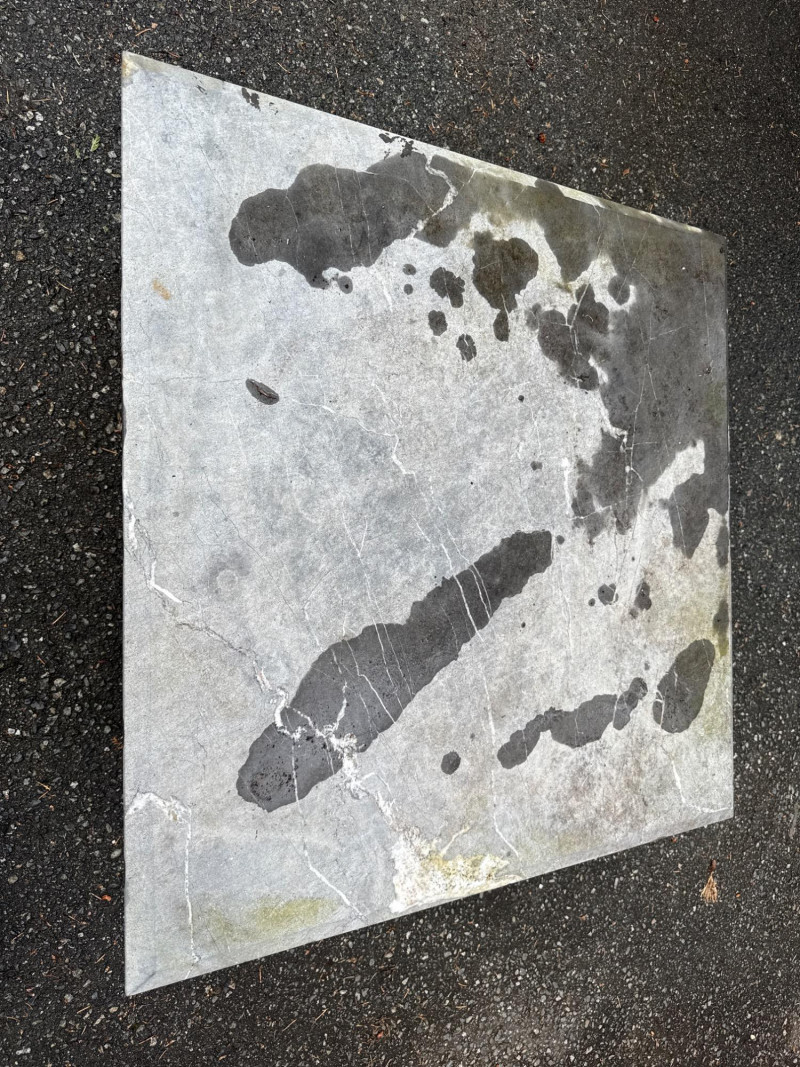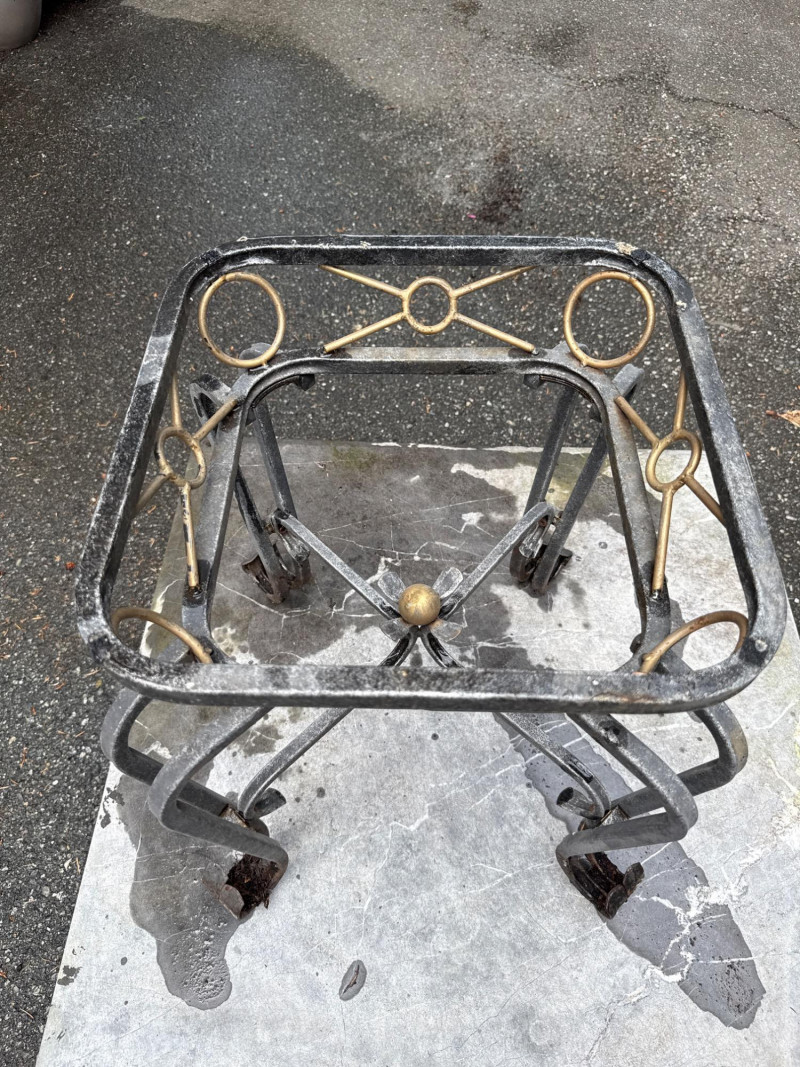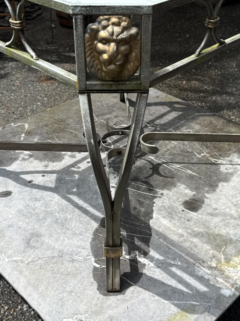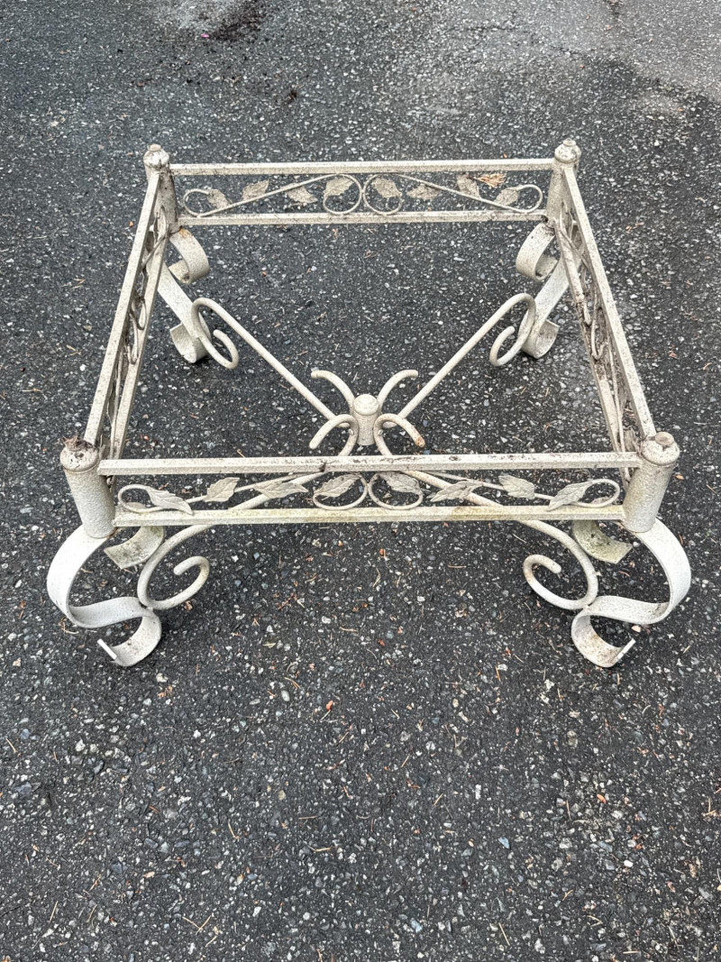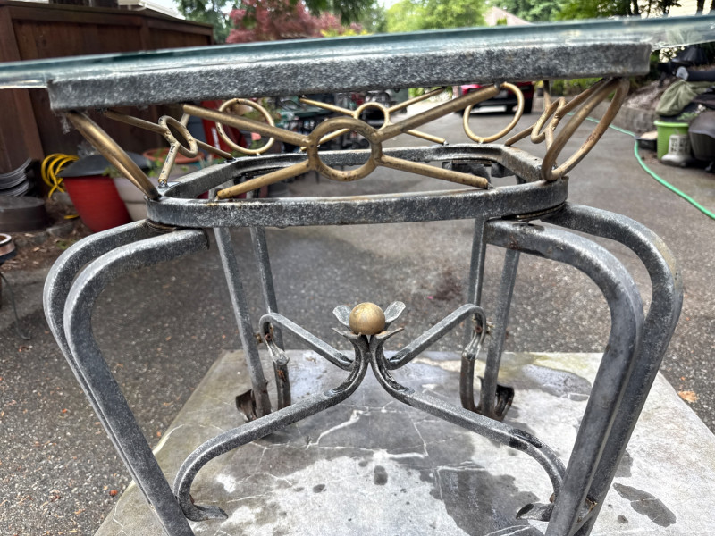 Four ornate tables with metal frames and glass/marble tops. Glass is beveled and in good condition. Needs cleaned. Large square table includes very heavy marble top. Will need two people to load. All need cleaned and have been used outdoors. Two are matching styles.