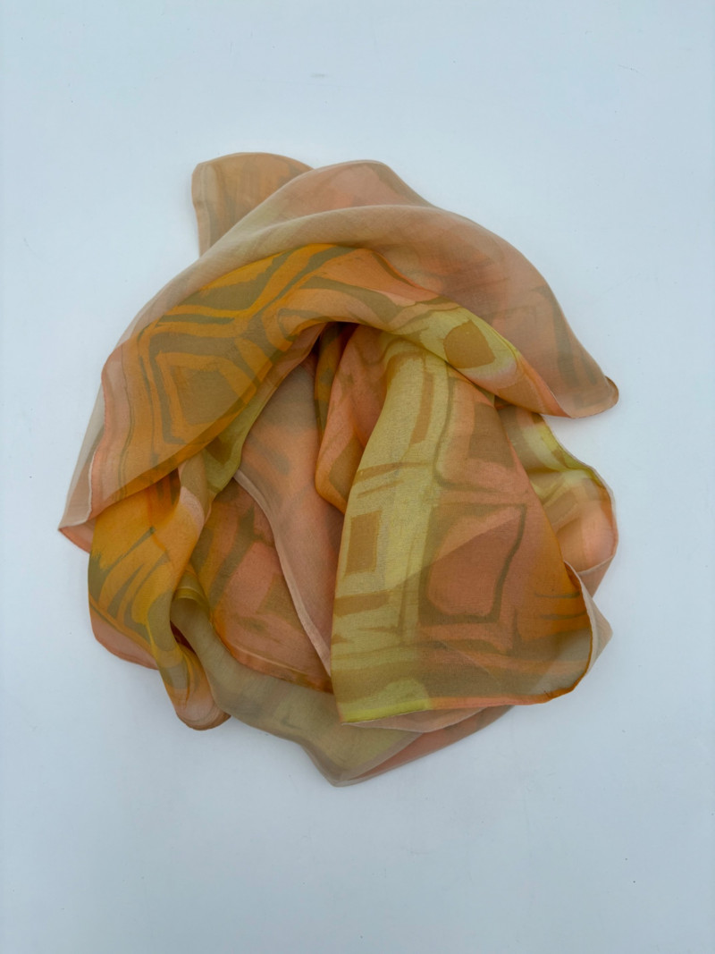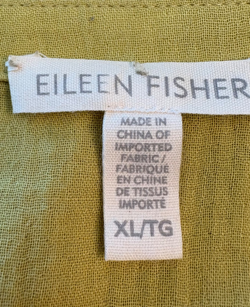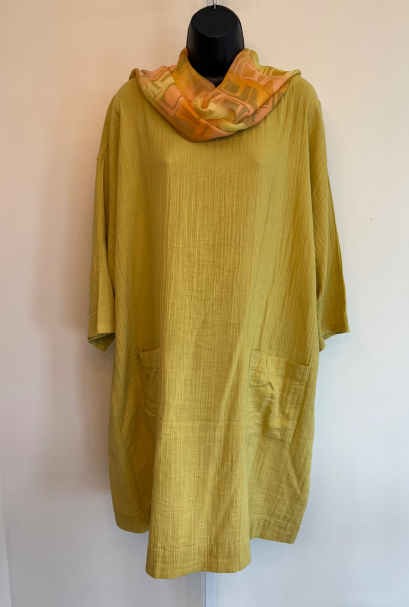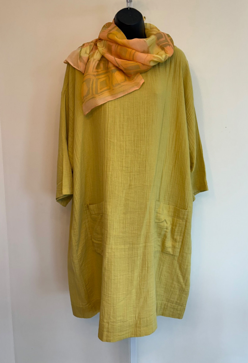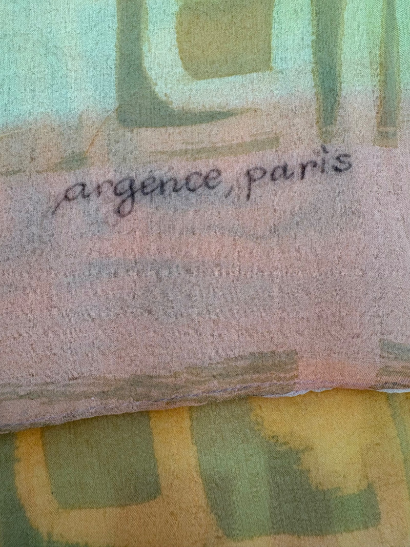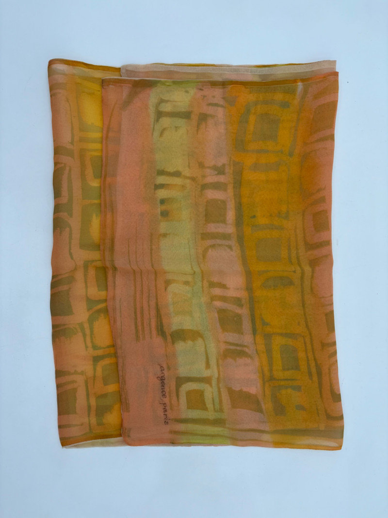 Lovely pairing of a simple tunic from Eileen Fisher and Argence Paris vintage silk scarf. Gold-green tunic has curved neckline, dropped shoulders, 3/4 sleeves, and front patch pockets. Super light-weight but still opaque. In excellent condition. 100% organic cotton. Measures 26" pit to pit and 37" from back neckline to hem. Size tag says XL. Scarf with geometric shapes from Argence Paris in pale green, orange and yellow with solid pale orange back lining. No fabric tag. Measures approx. 16" x 46".