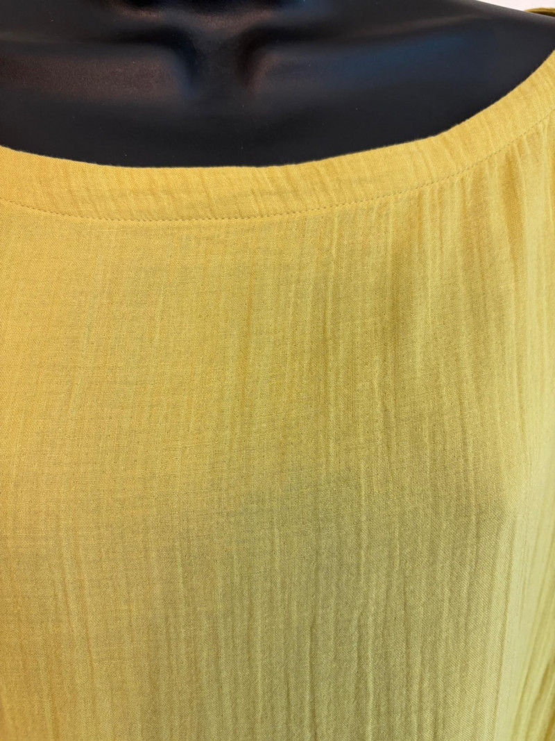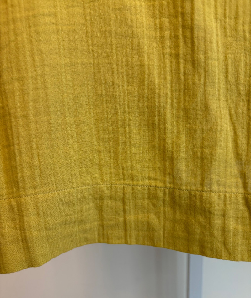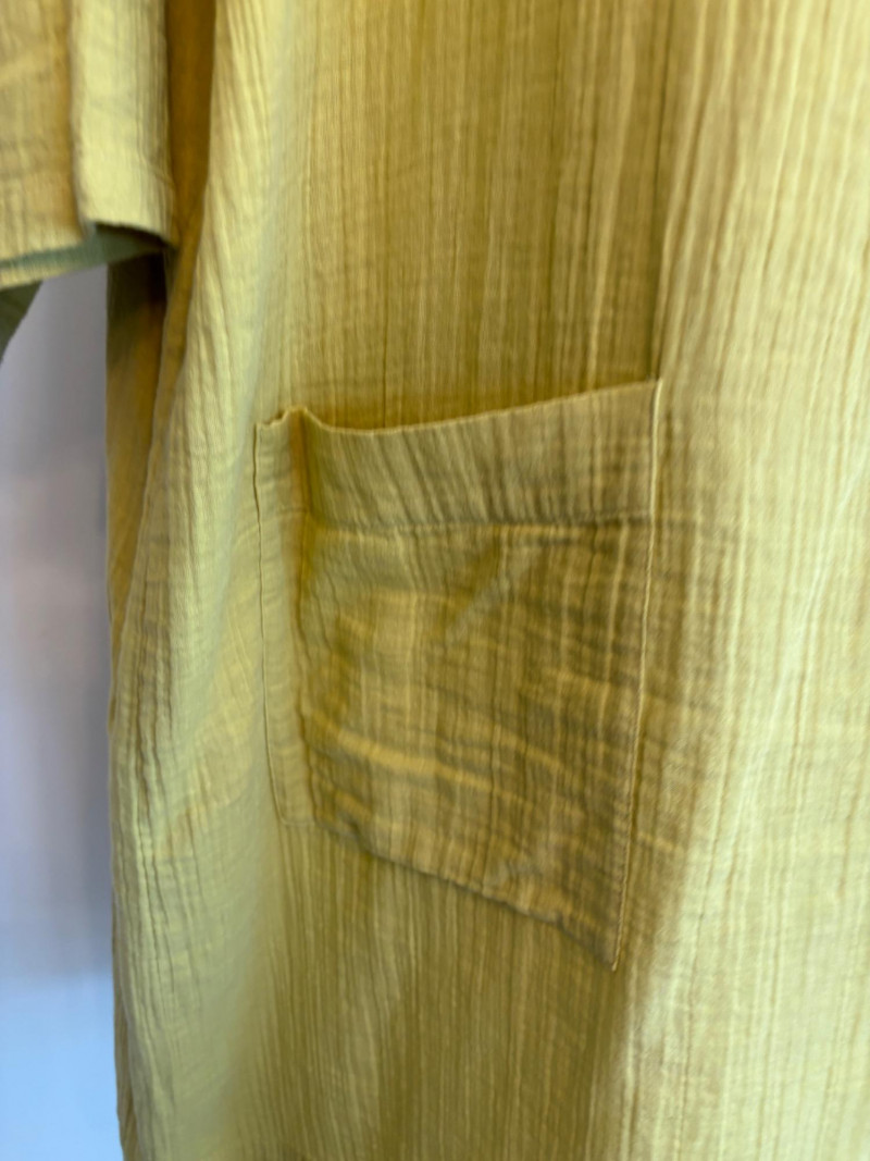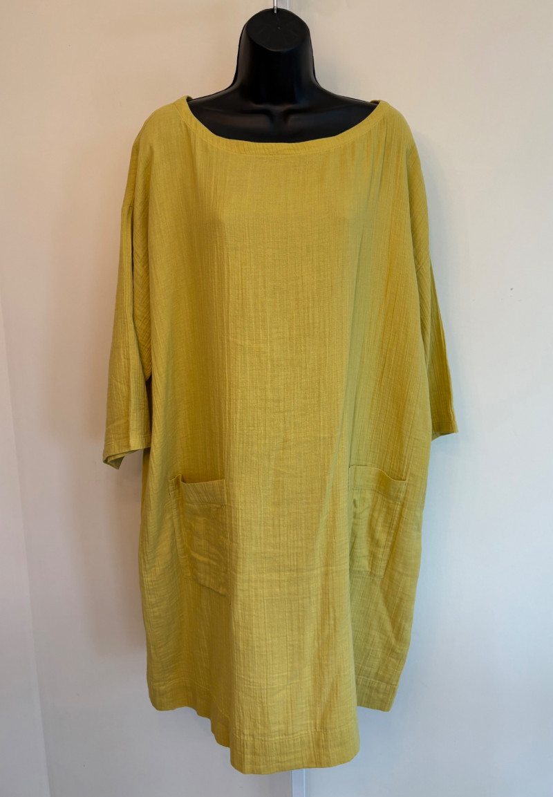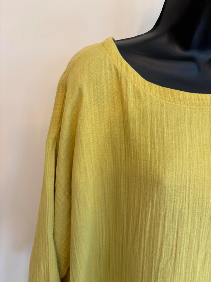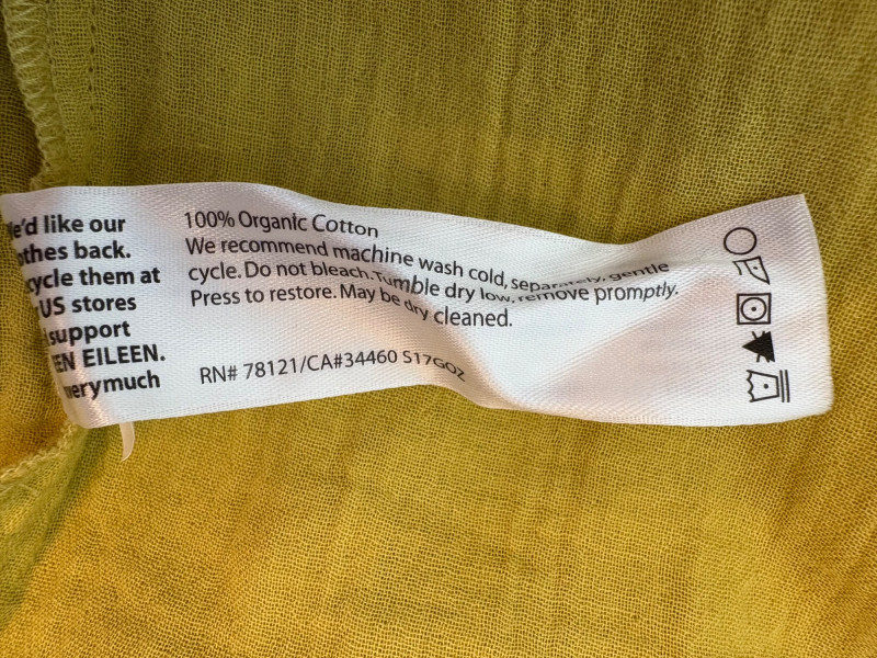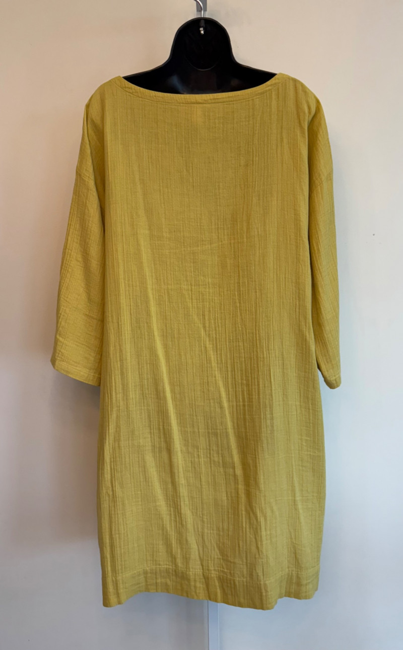 Lovely pairing of a simple tunic from Eileen Fisher and Argence Paris vintage silk scarf. Gold-green tunic has curved neckline, dropped shoulders, 3/4 sleeves, and front patch pockets. Super light-weight but still opaque. In excellent condition. 100% organic cotton. Measures 26" pit to pit and 37" from back neckline to hem. Size tag says XL. Scarf with geometric shapes from Argence Paris in pale green, orange and yellow with solid pale orange back lining. No fabric tag. Measures approx. 16" x 46".
