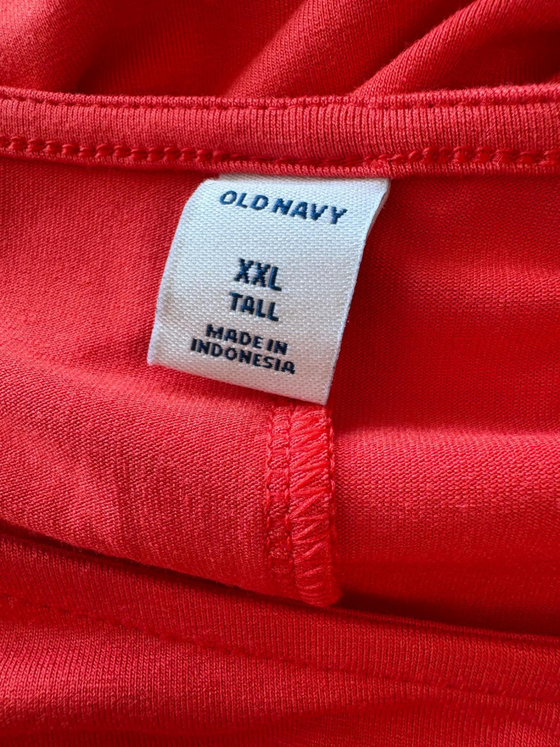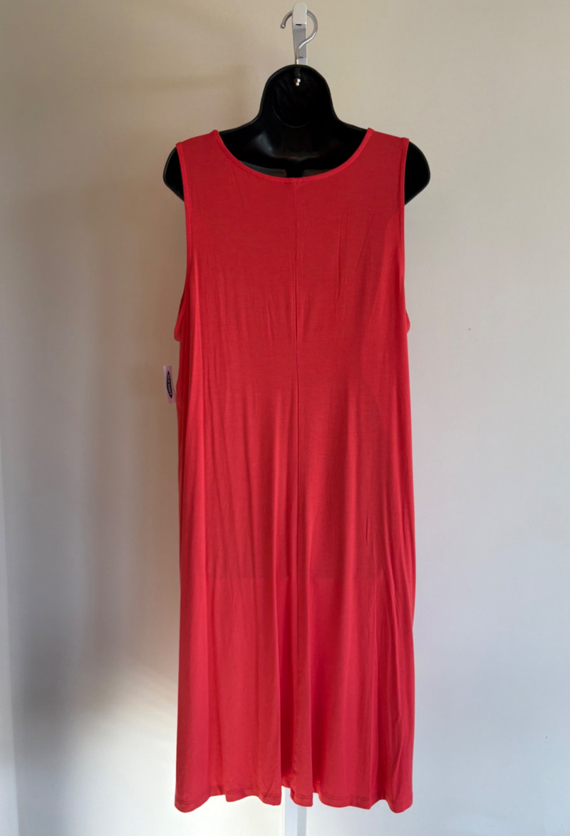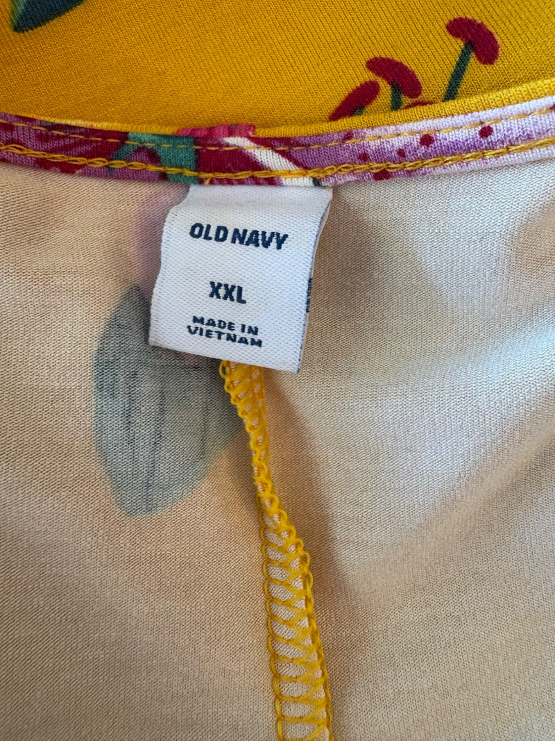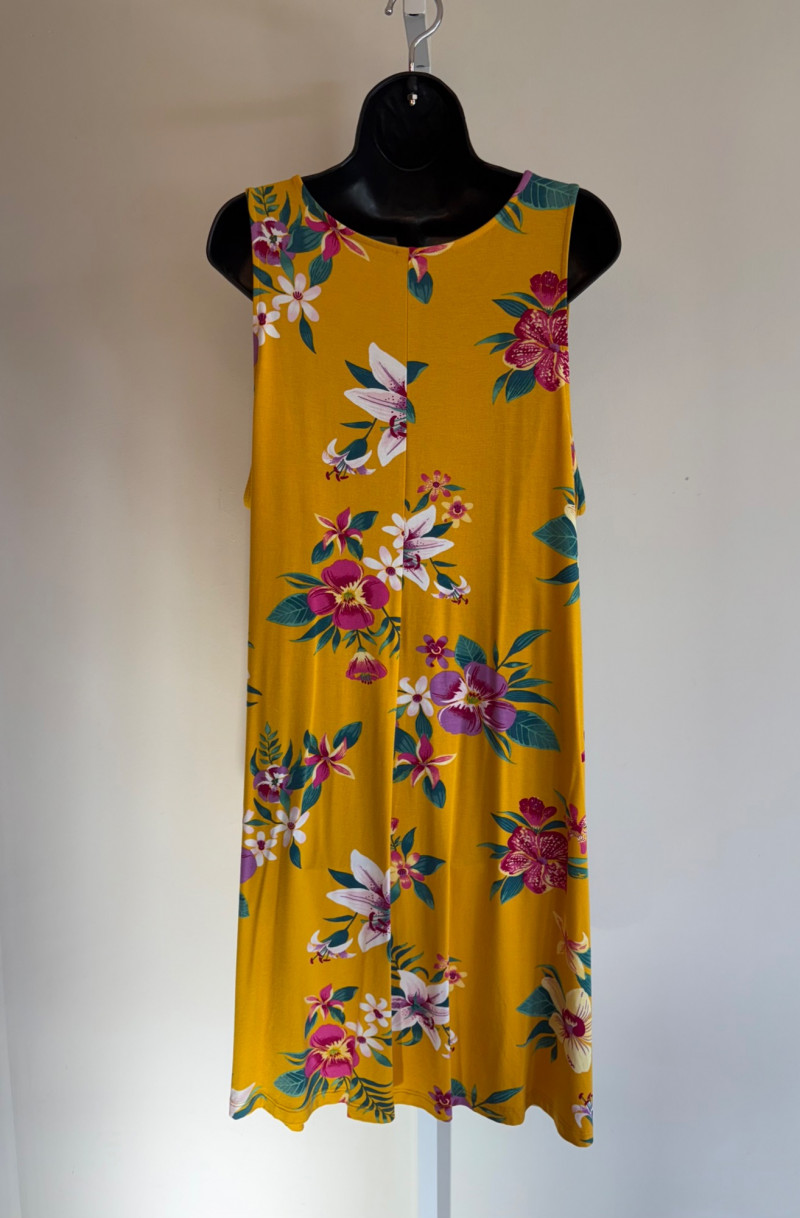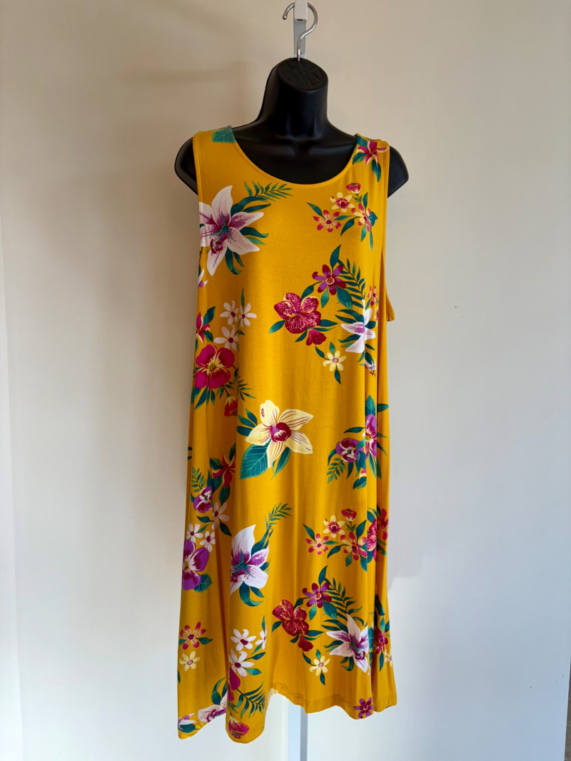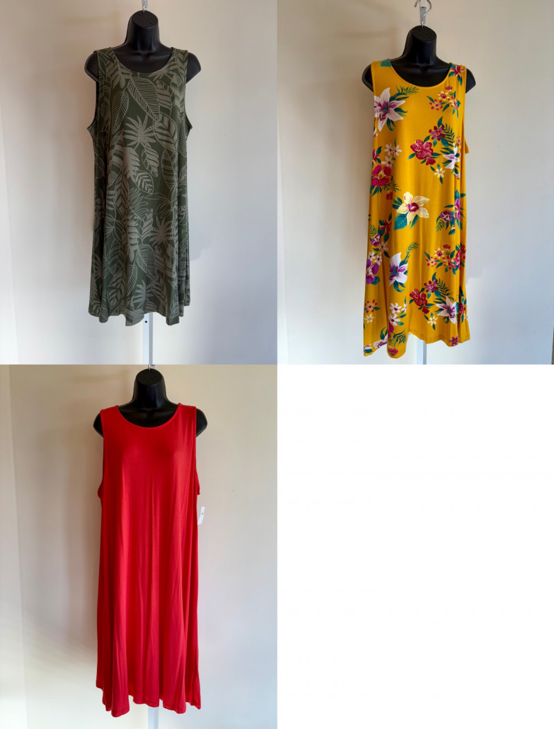 Trio of brightly colored dresses from Old Navy (vintage Old Navy before the construction quality declined). All are in excellent condition (orange is new) and all are sleeveless with a curved neckline. 95% rayon viscose with 5% spandex so they stretch quite a bit and fall beautifully. Orange solid measures 23" pit to pit and 41.5" from shoulder strap to bottom hem. New with tag. Size tag says XXL Tall. Yellow with tropical flowers measures 23" pit to pit and 39" from shoulder strap to bottom hem. Size tag says XXL. Green with foliage print measures 22.5" pit to pit and 36" from shoulder strap to bottom hem. Size tag says XL.
