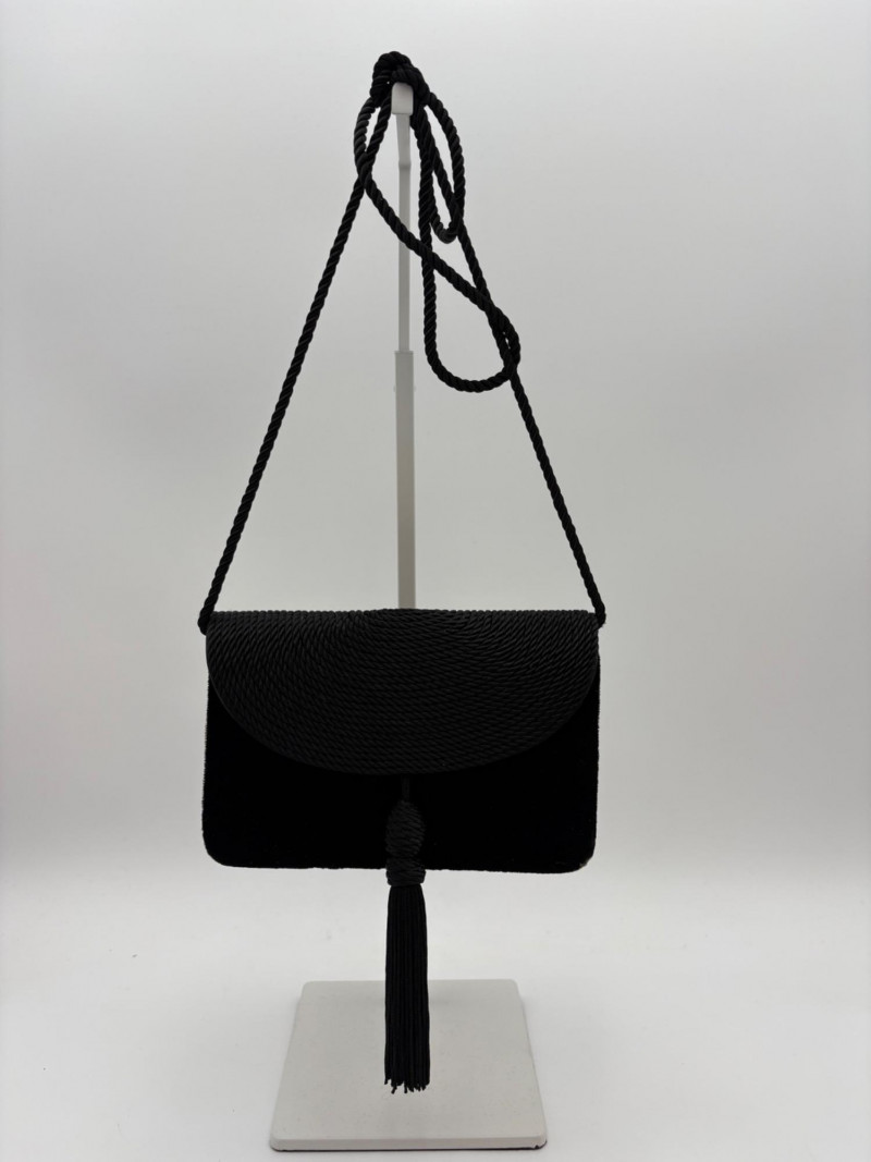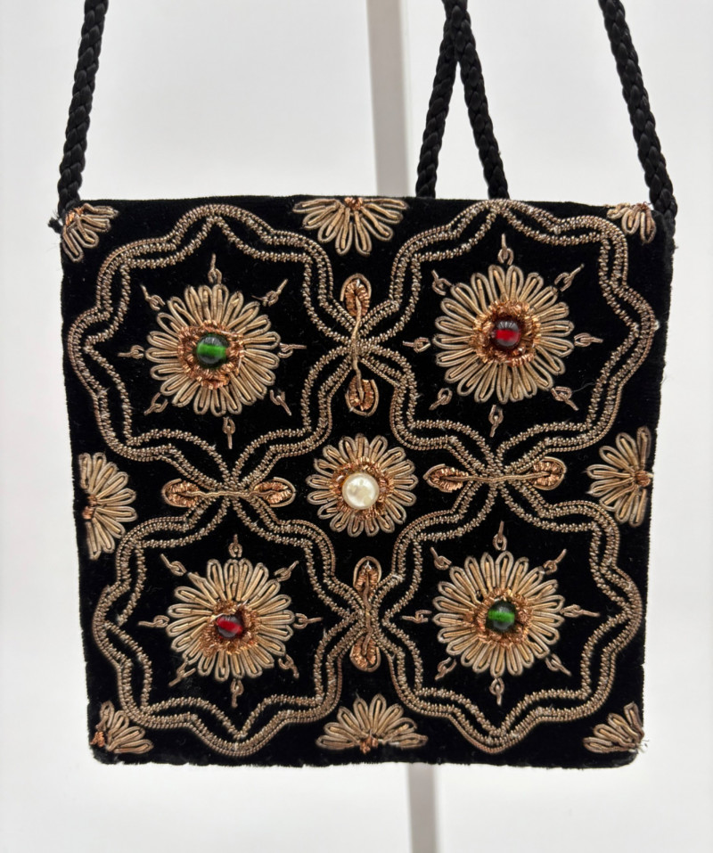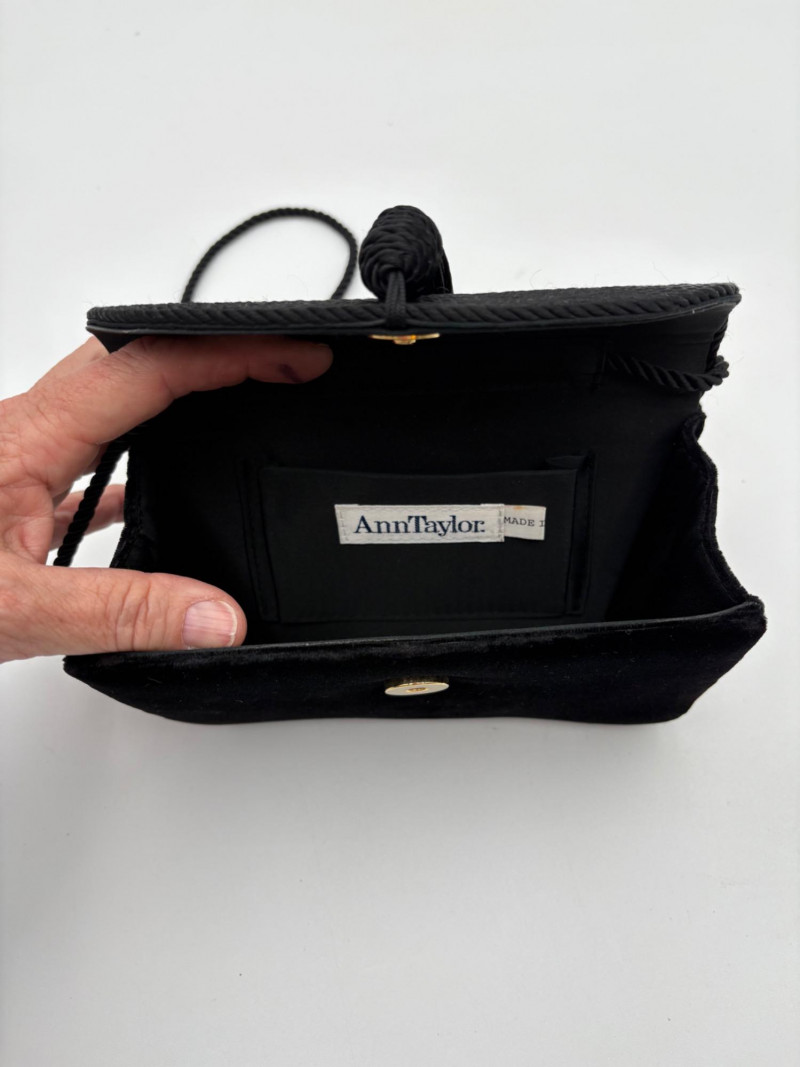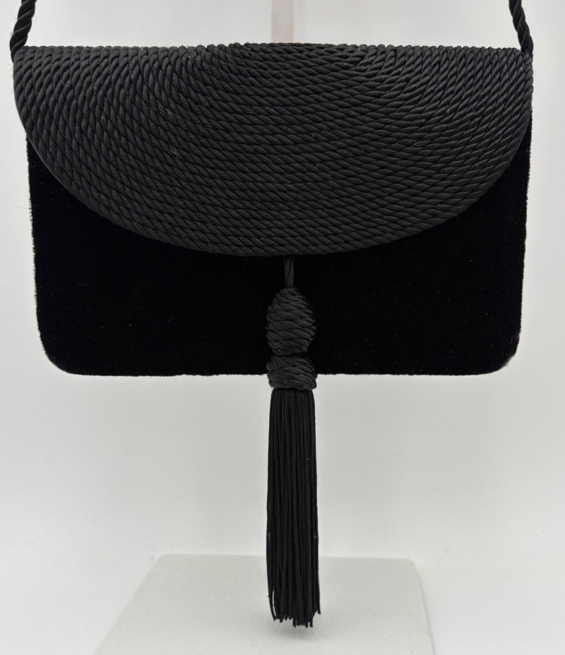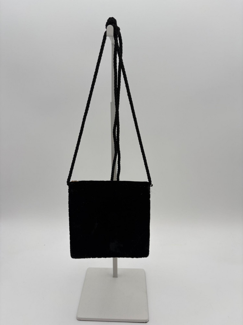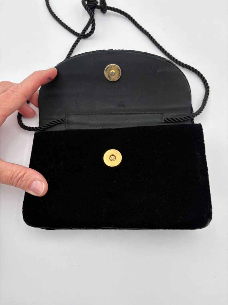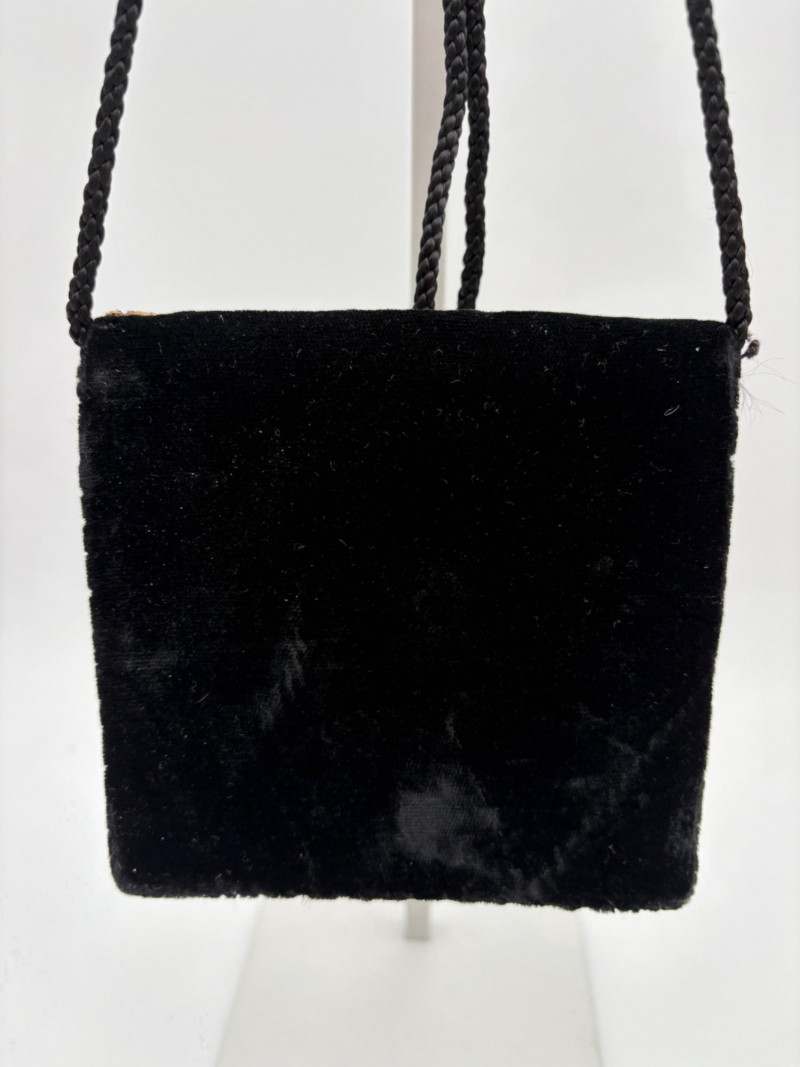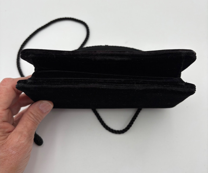 Two lovely velvet purses just large enough for a compact and other essentials. Classic black velvet purse from Ann Taylor has twisted cord shoulder strap, snap front closure with long tassel, and front flap with same twisted cord as strap. Interior has small pocket. In excellent condition. Measures 5" x 7" with a 23" drop from the top of the strap to the top of the purse. Square black velvet purse has embroidery & sparkle gems on the from with twisted cord shoulder strap. Interior has small pocket. In good condition (some pressed nap on the velvet back). Measures 5" square with a 24" drop from the top of the strap to the top of the purse. No maker label.