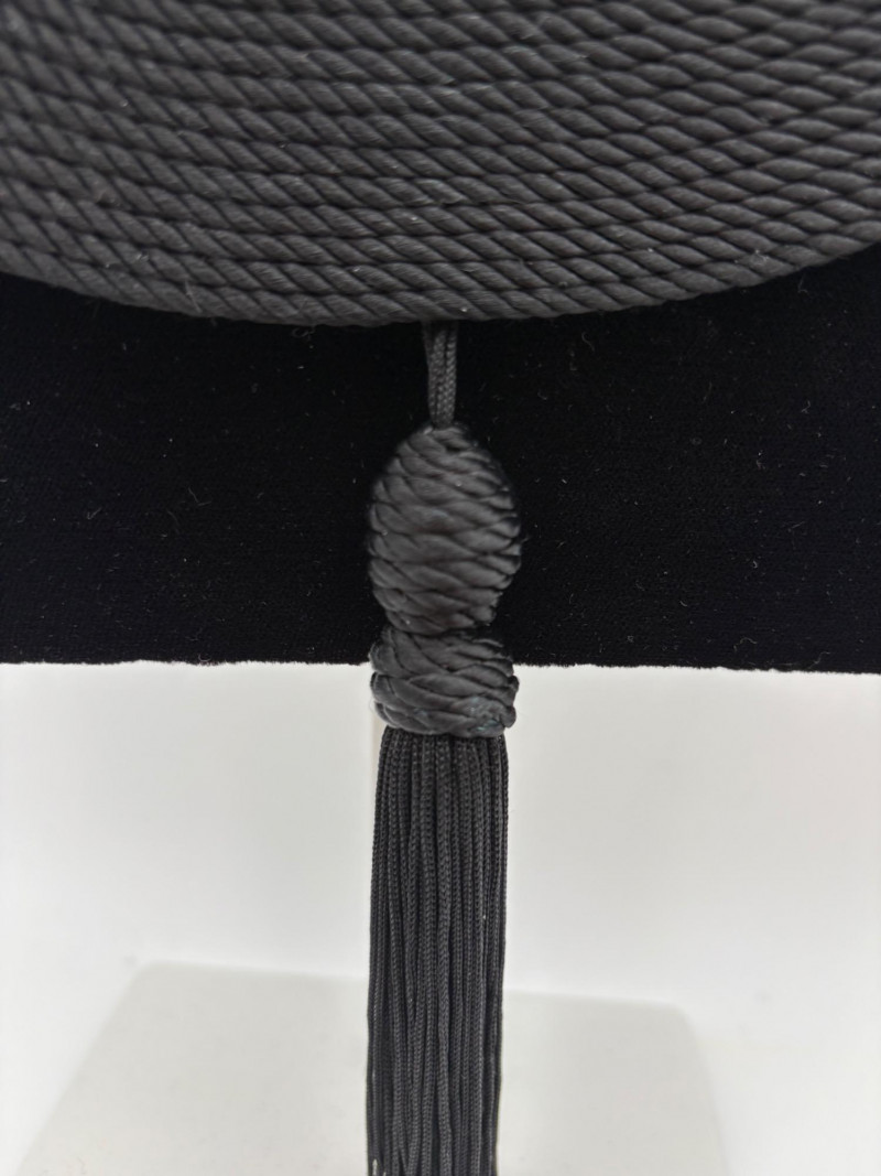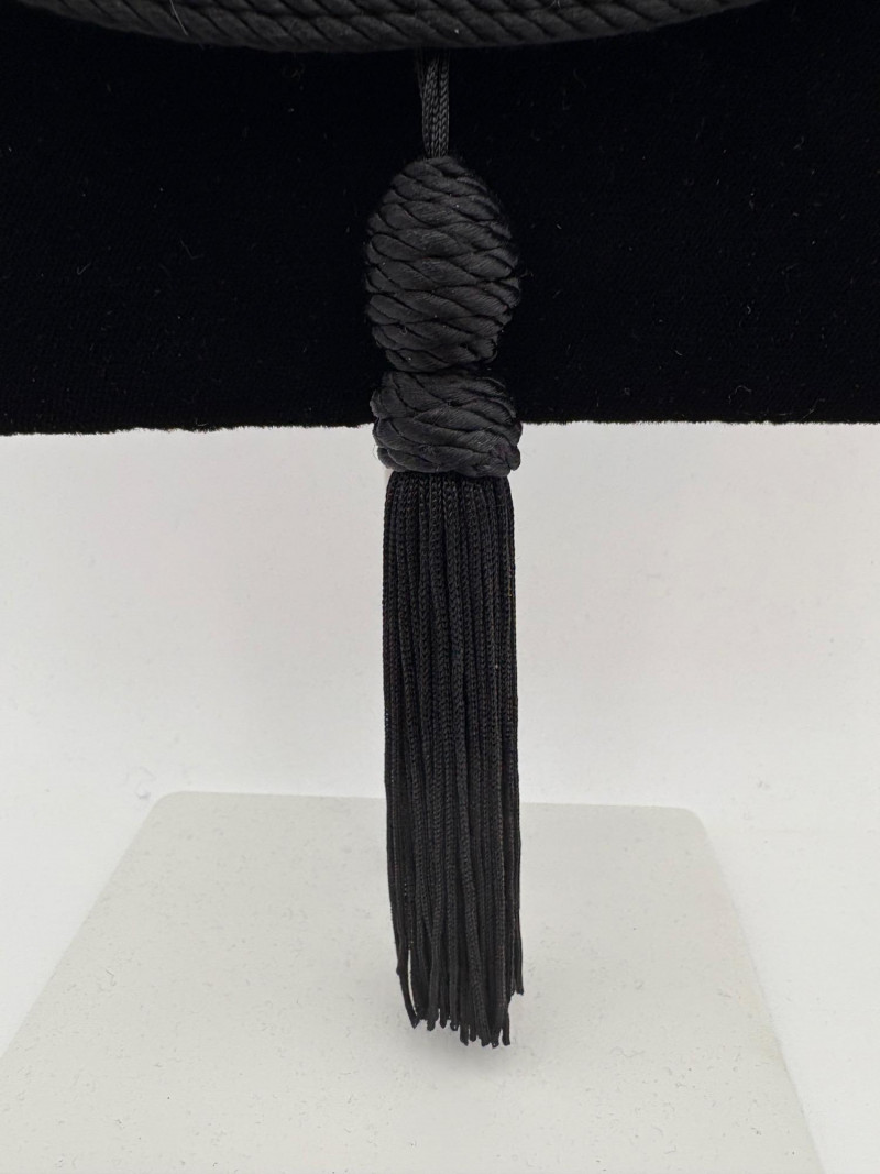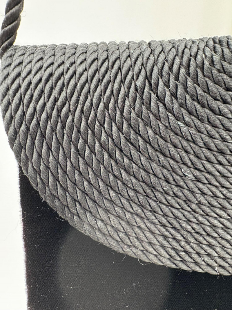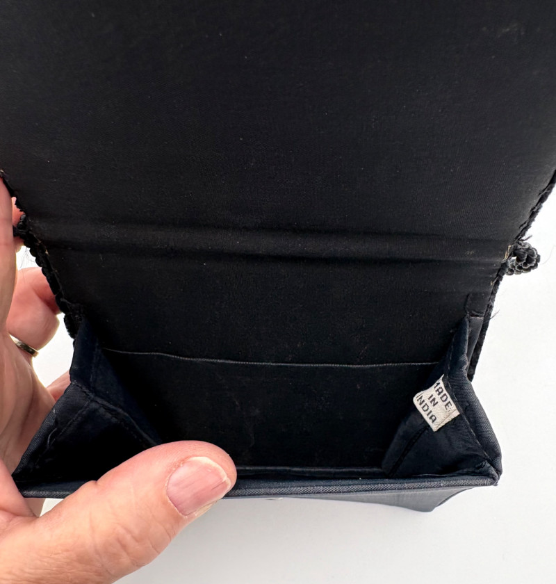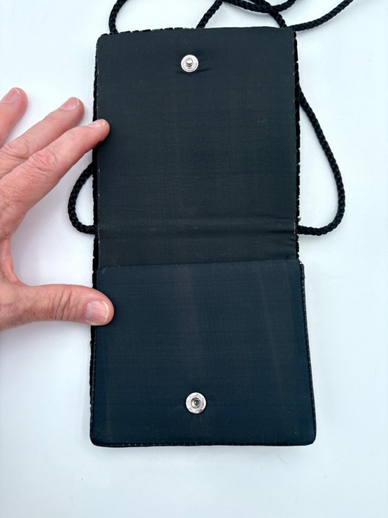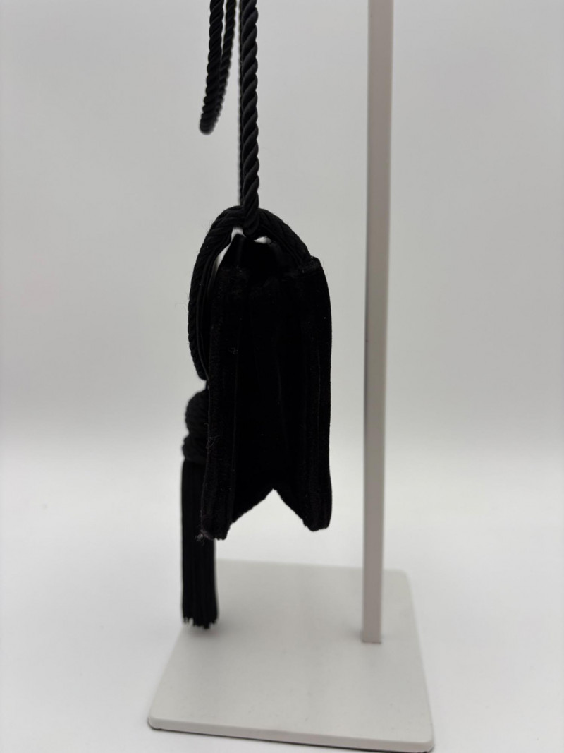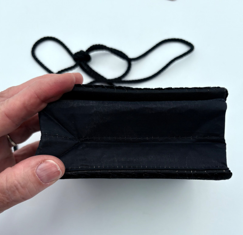 Two lovely velvet purses just large enough for a compact and other essentials. Classic black velvet purse from Ann Taylor has twisted cord shoulder strap, snap front closure with long tassel, and front flap with same twisted cord as strap. Interior has small pocket. In excellent condition. Measures 5" x 7" with a 23" drop from the top of the strap to the top of the purse. Square black velvet purse has embroidery & sparkle gems on the from with twisted cord shoulder strap. Interior has small pocket. In good condition (some pressed nap on the velvet back). Measures 5" square with a 24" drop from the top of the strap to the top of the purse. No maker label.