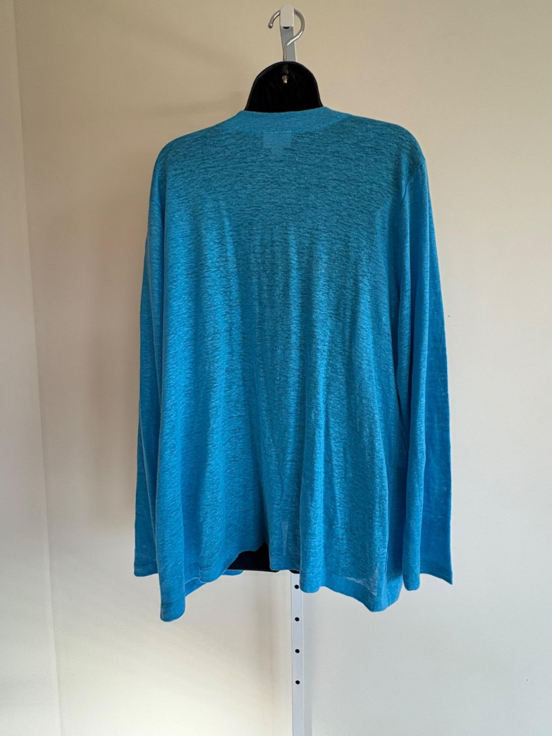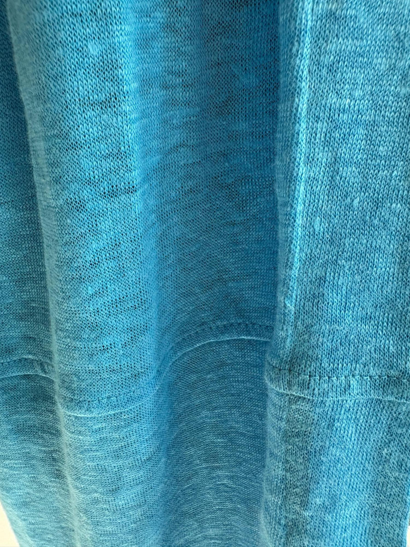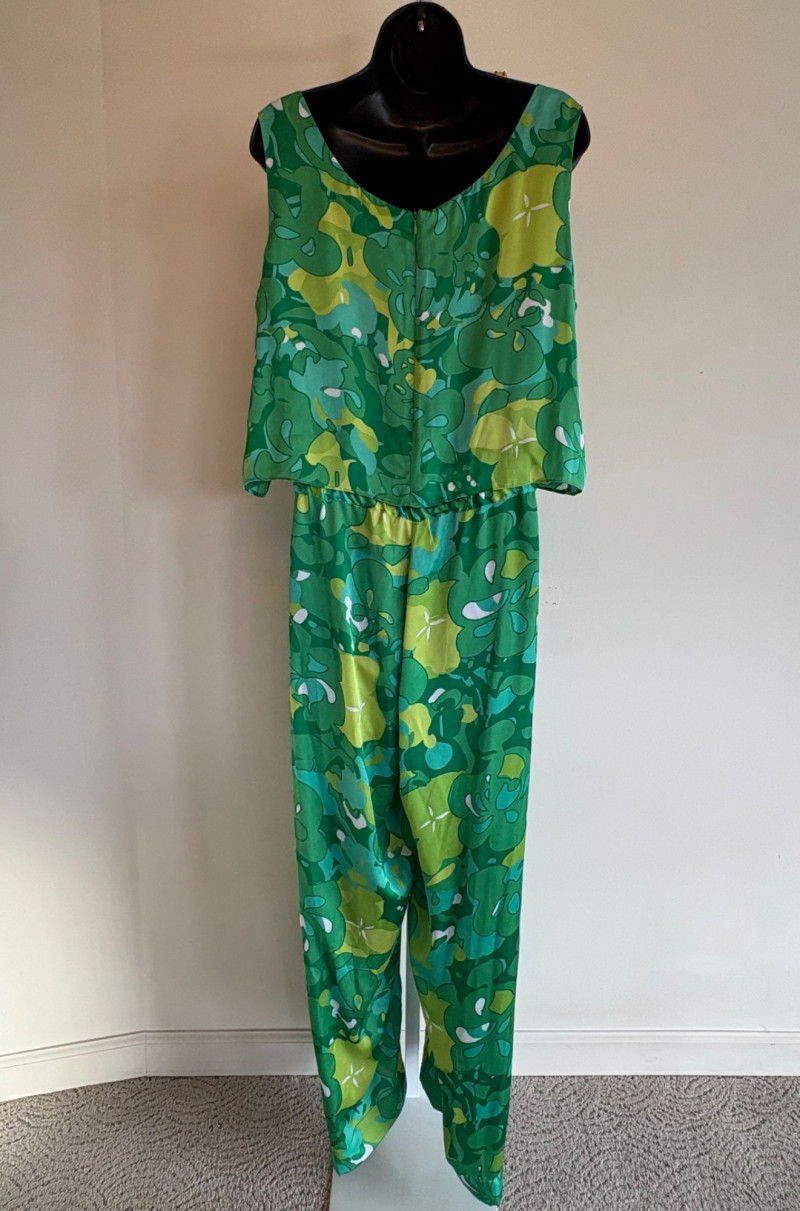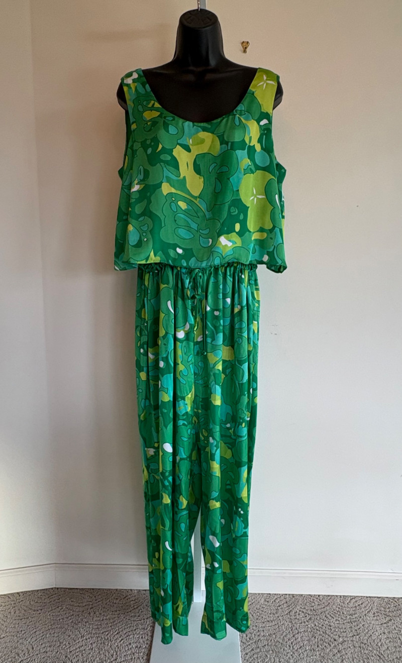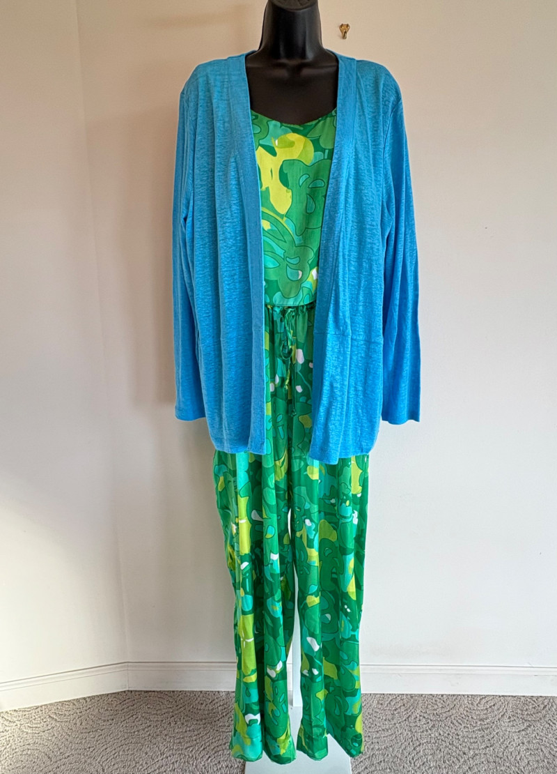 Great retro outfit in bright summer colors! One-piece jumpsuit from Skye's the Limit in a predominantly green silky fabric. Abstract designs in yellow, greens, and white. Low curved neckline front and back with blouson over-tank (green lining underneath), a drawstring waist, and wide-hemmed legs. Invisible zip in back. 100% easy care (machine wash) polyester. Appears to be in excellent condition, Measures 22.5" pit to pit and 57" from shoulder seam to pants hem. 27" inseam. Size tag says XL. Brilliant blue super light-weight knit cardigan from J. Jill has an open front and provides a great color balance to all the green. In excellent condition. 100% linen. Measures 22" pit to pit and 26.5" from back neckline to hem. Size tag says XL.