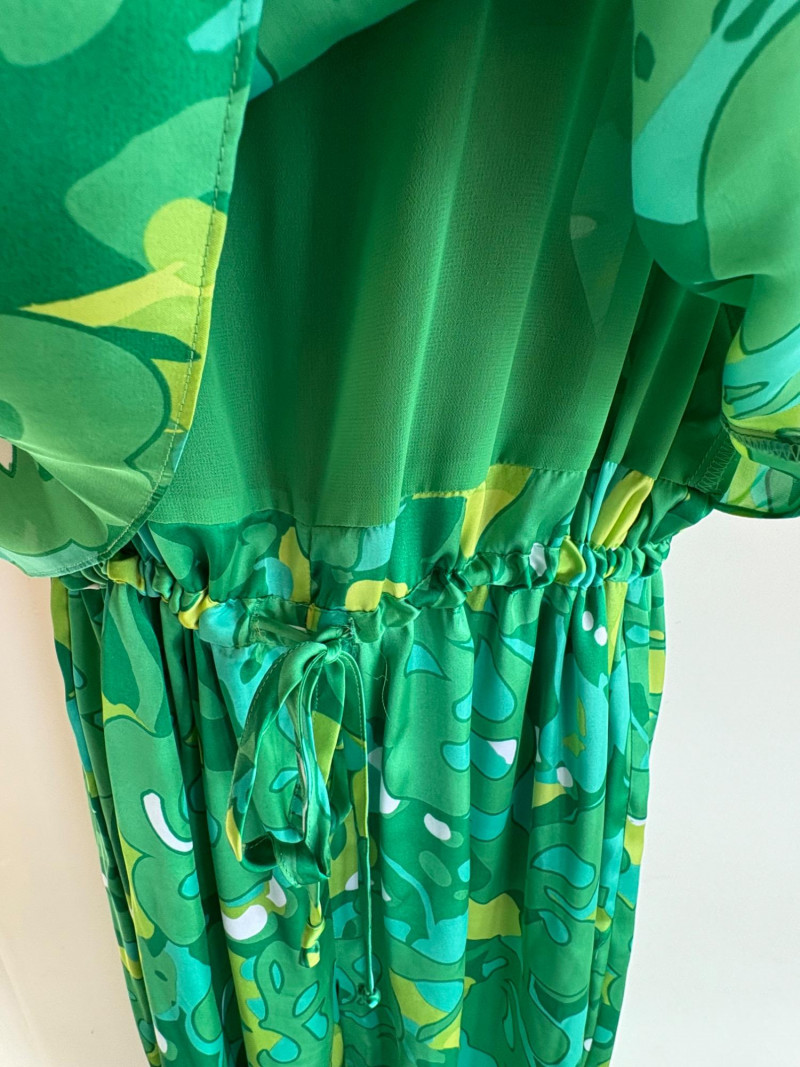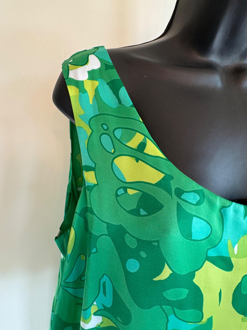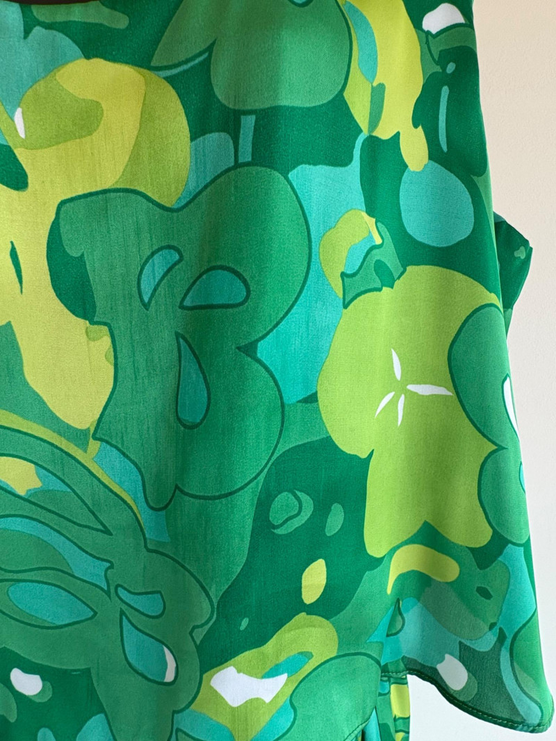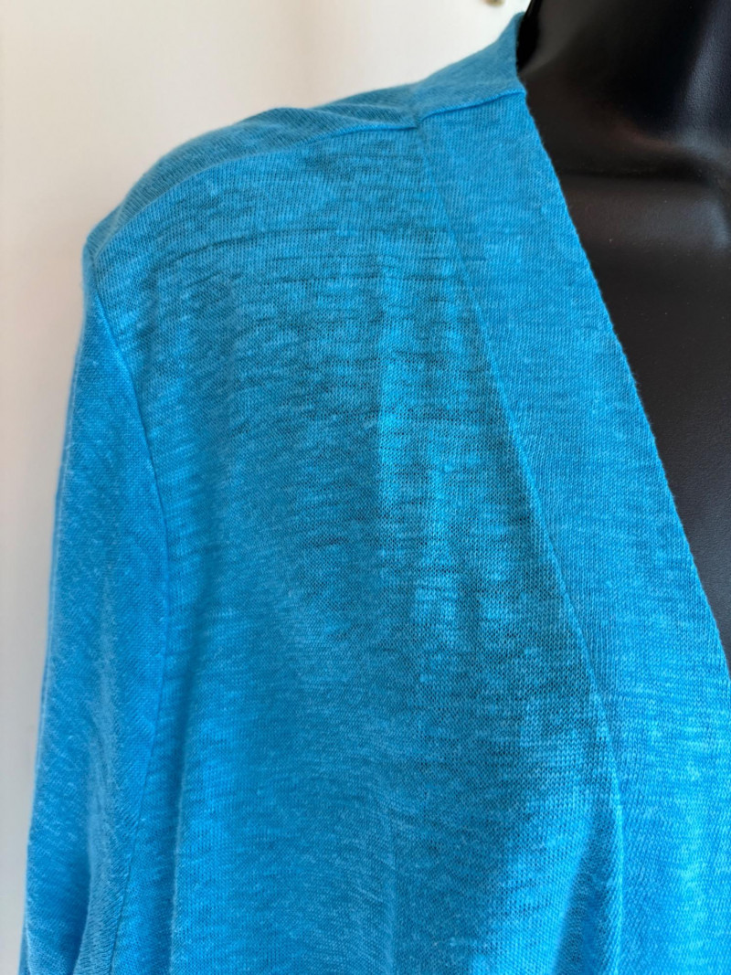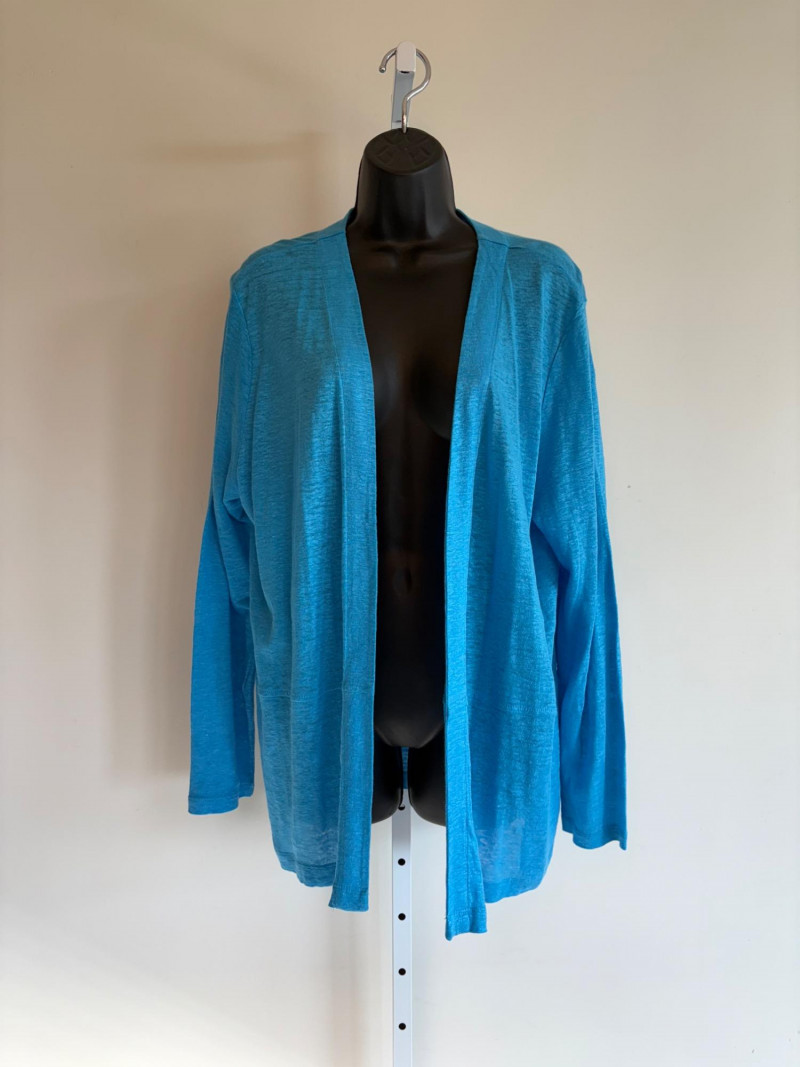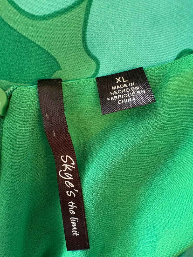 Great retro outfit in bright summer colors! One-piece jumpsuit from Skye's the Limit in a predominantly green silky fabric. Abstract designs in yellow, greens, and white. Low curved neckline front and back with blouson over-tank (green lining underneath), a drawstring waist, and wide-hemmed legs. Invisible zip in back. 100% easy care (machine wash) polyester. Appears to be in excellent condition, Measures 22.5" pit to pit and 57" from shoulder seam to pants hem. 27" inseam. Size tag says XL. Brilliant blue super light-weight knit cardigan from J. Jill has an open front and provides a great color balance to all the green. In excellent condition. 100% linen. Measures 22" pit to pit and 26.5" from back neckline to hem. Size tag says XL.