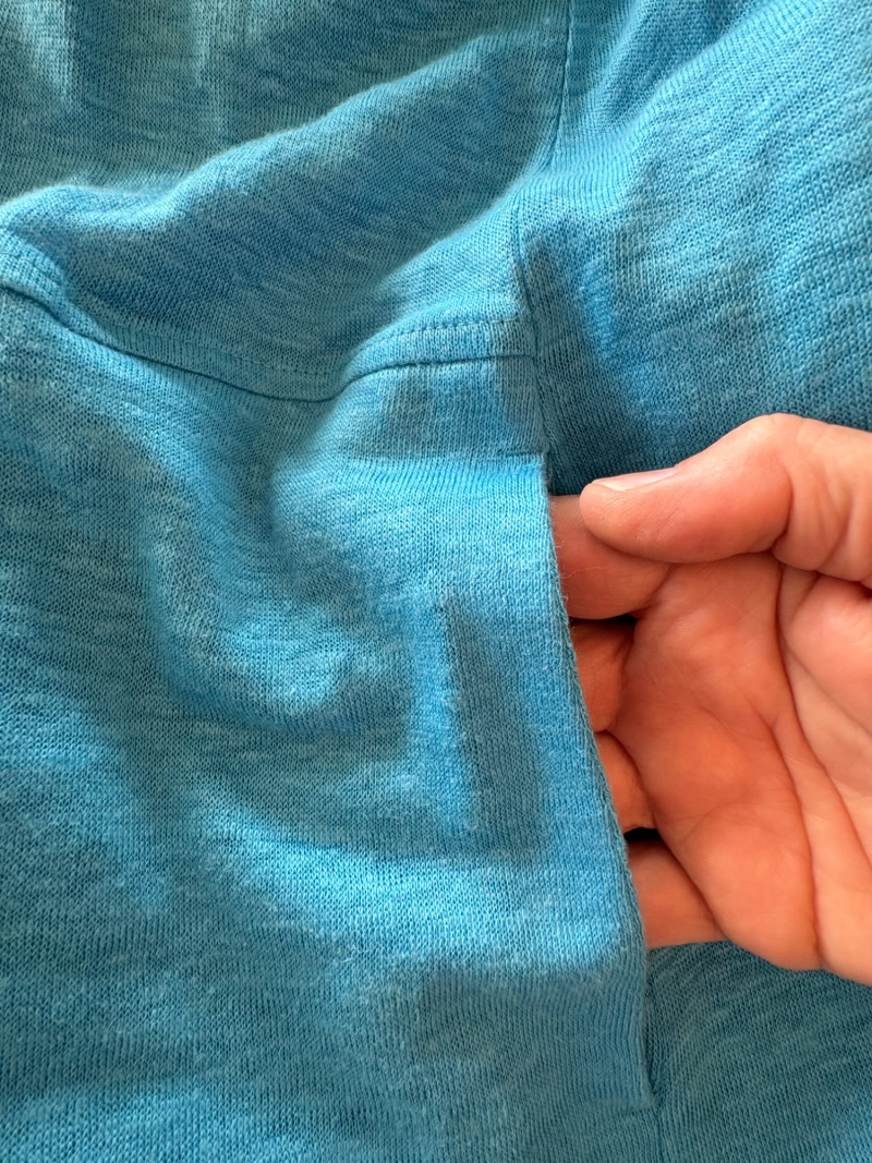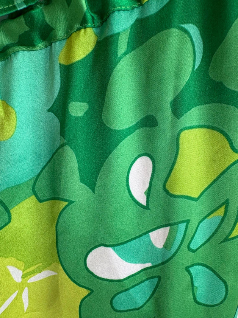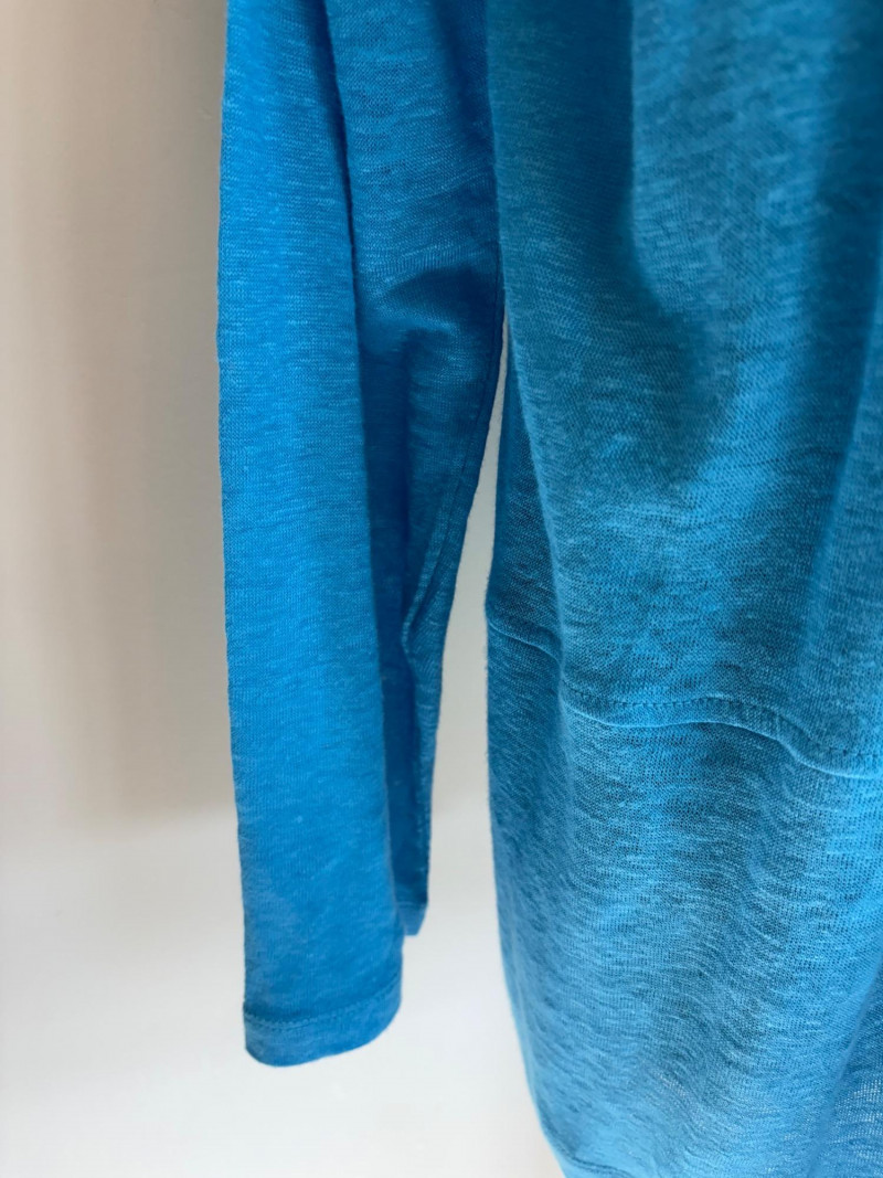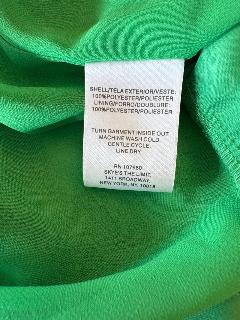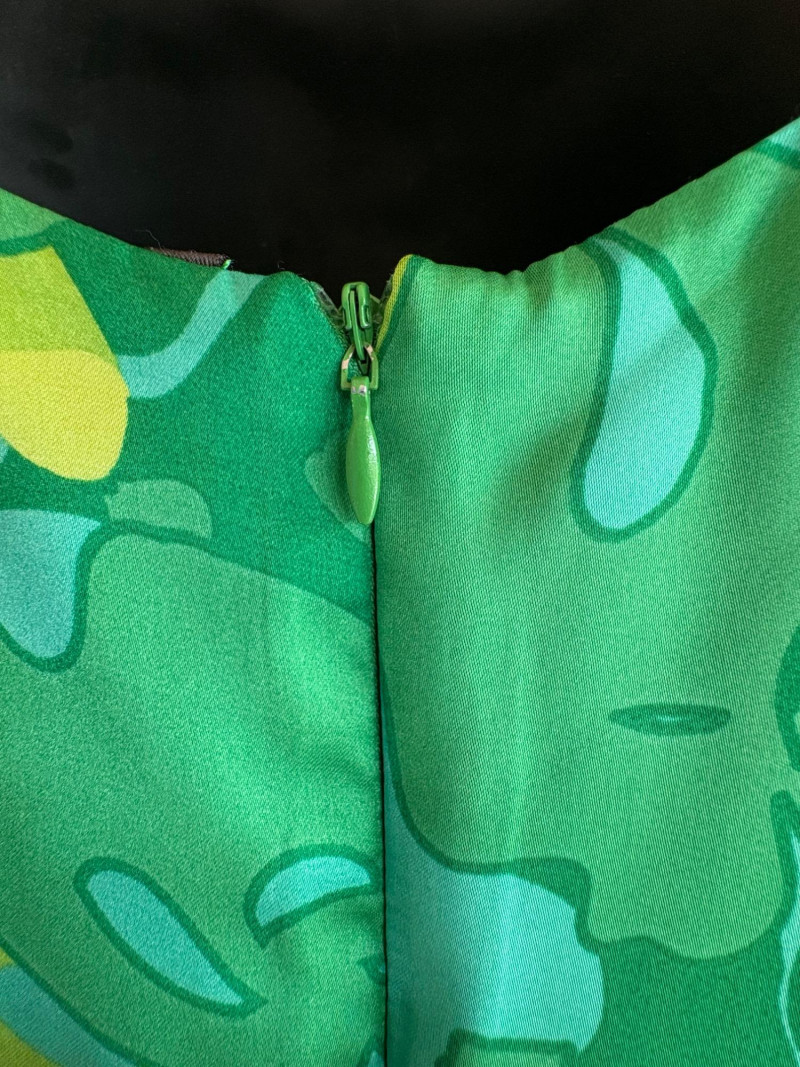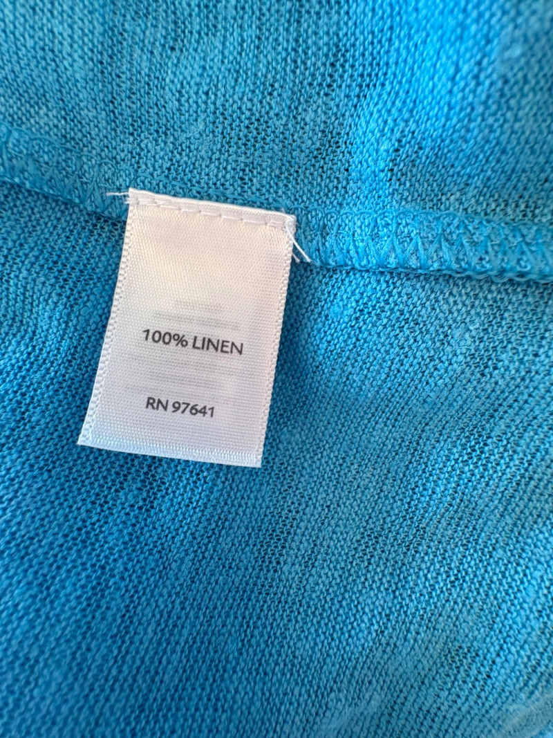 Great retro outfit in bright summer colors! One-piece jumpsuit from Skye's the Limit in a predominantly green silky fabric. Abstract designs in yellow, greens, and white. Low curved neckline front and back with blouson over-tank (green lining underneath), a drawstring waist, and wide-hemmed legs. Invisible zip in back. 100% easy care (machine wash) polyester. Appears to be in excellent condition, Measures 22.5" pit to pit and 57" from shoulder seam to pants hem. 27" inseam. Size tag says XL. Brilliant blue super light-weight knit cardigan from J. Jill has an open front and provides a great color balance to all the green. In excellent condition. 100% linen. Measures 22" pit to pit and 26.5" from back neckline to hem. Size tag says XL.