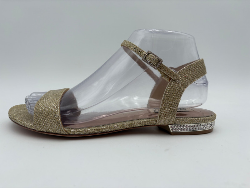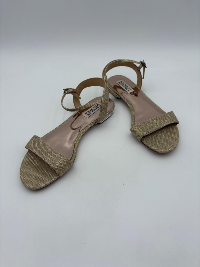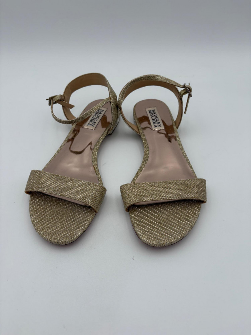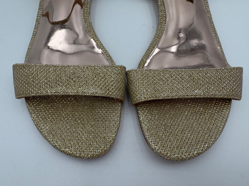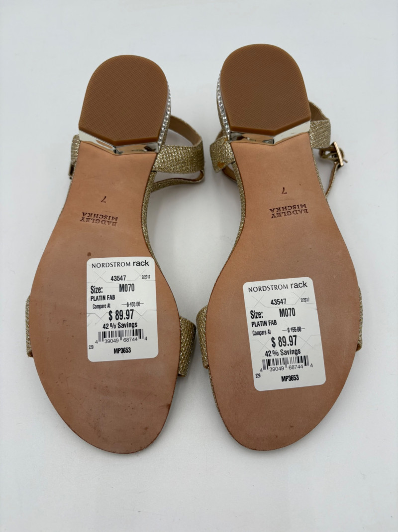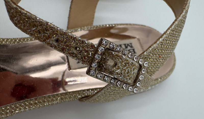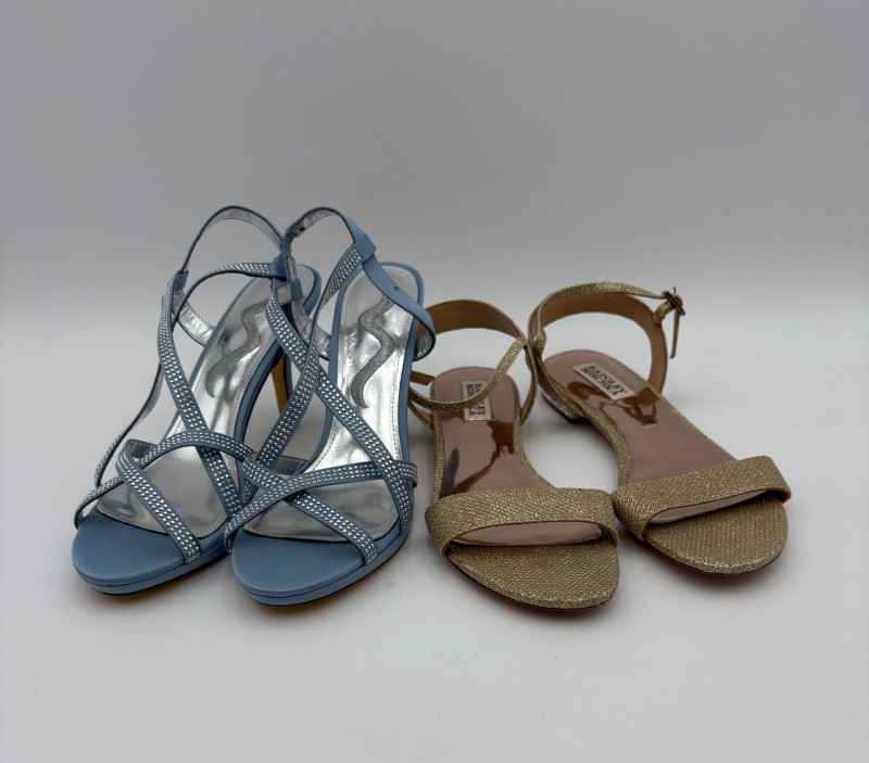 Two pairs of strappy sparkling sandals for summer dressy wear! Blue spike heel sandals from Nina in a matte medium blue fabric have small square studs in silver on straps over the top of the toes and foot. Elasticated heel strap to keep them on your foot but comfortable. 3.5" heel with leather sole. Appear new with no signs of use on soles or uppers. Size 7. Gold sparkly flats from Badgley Mischke have strap across the ball of the foot and secure ankle strap. Buckle on ankle has rhinestones for added bling. New with tags - no signs of use on soles or uppers. 1/2" heel with natural leather sole. Size 7.* * Please note that there are two small rhinestones missing on the right buckle and a couple of glue spots - both are very minor, but we wanted to mention - see last 2 photos..
