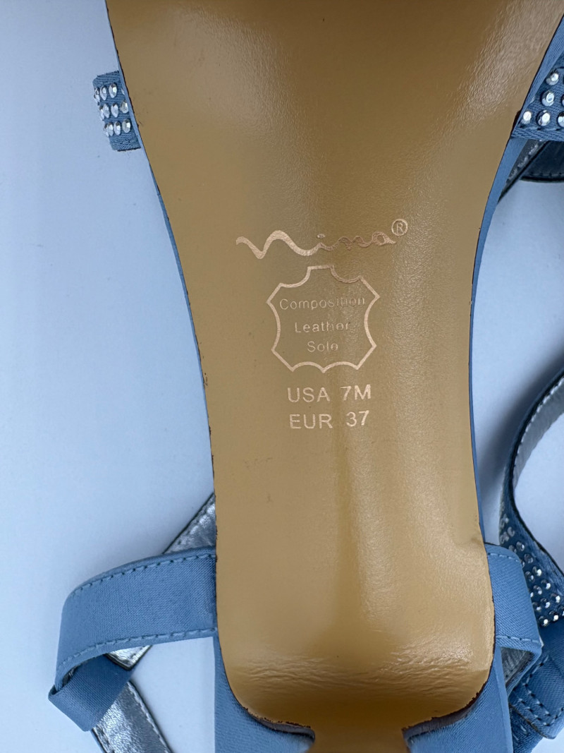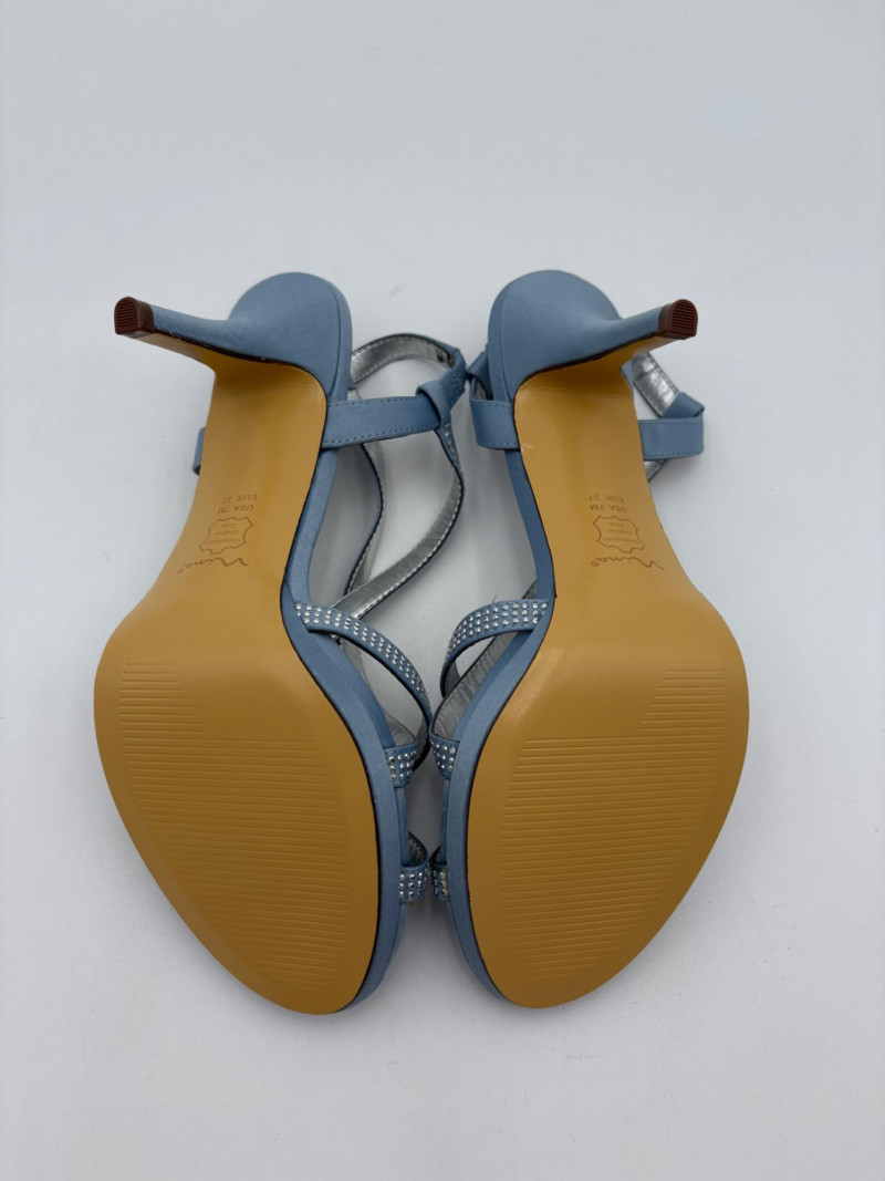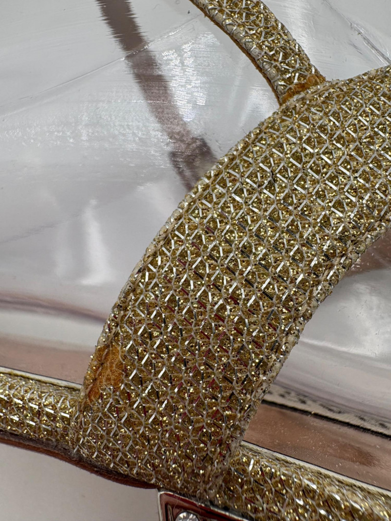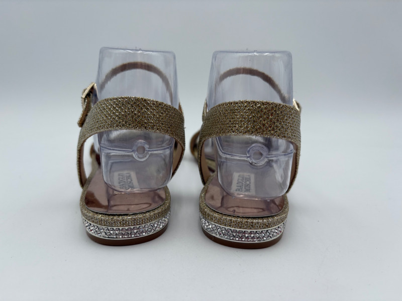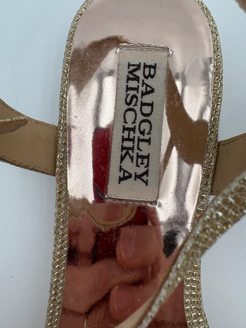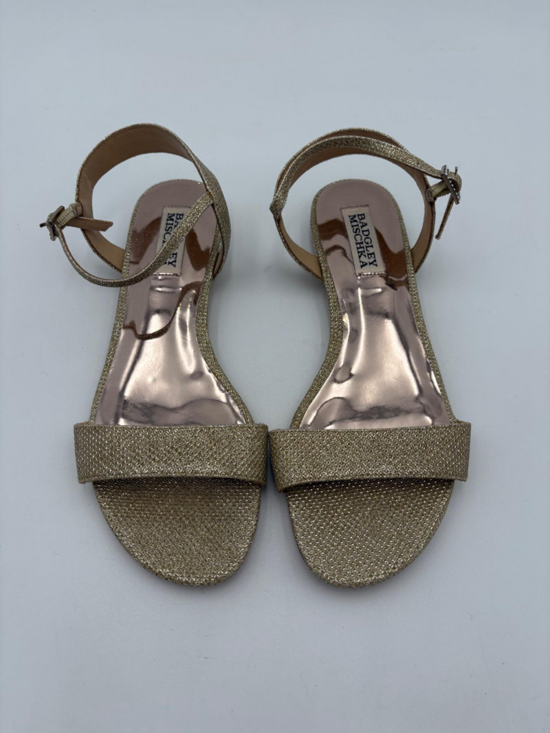 Two pairs of strappy sparkling sandals for summer dressy wear! Blue spike heel sandals from Nina in a matte medium blue fabric have small square studs in silver on straps over the top of the toes and foot. Elasticated heel strap to keep them on your foot but comfortable. 3.5" heel with leather sole. Appear new with no signs of use on soles or uppers. Size 7. Gold sparkly flats from Badgley Mischke have strap across the ball of the foot and secure ankle strap. Buckle on ankle has rhinestones for added bling. New with tags - no signs of use on soles or uppers. 1/2" heel with natural leather sole. Size 7.* * Please note that there are two small rhinestones missing on the right buckle and a couple of glue spots - both are very minor, but we wanted to mention - see last 2 photos..