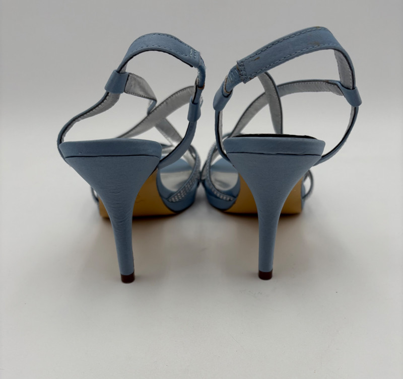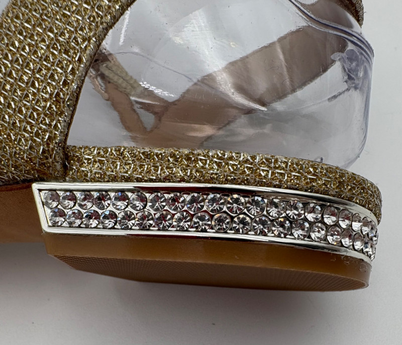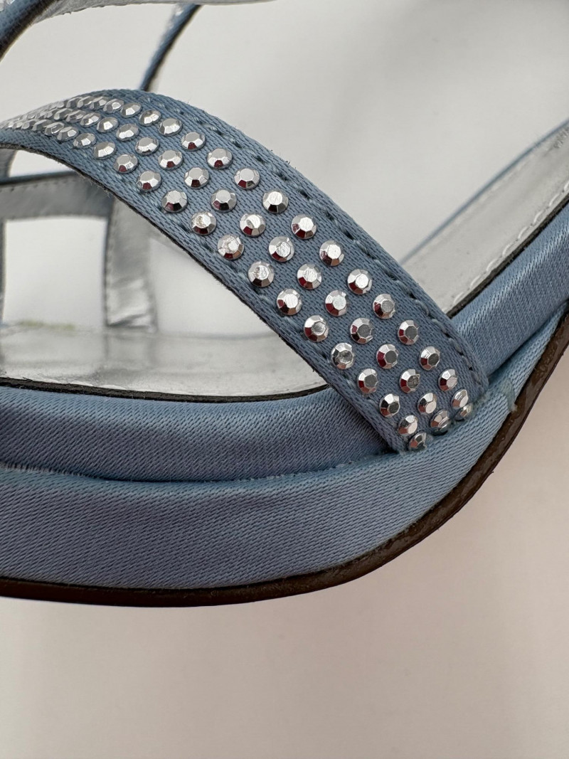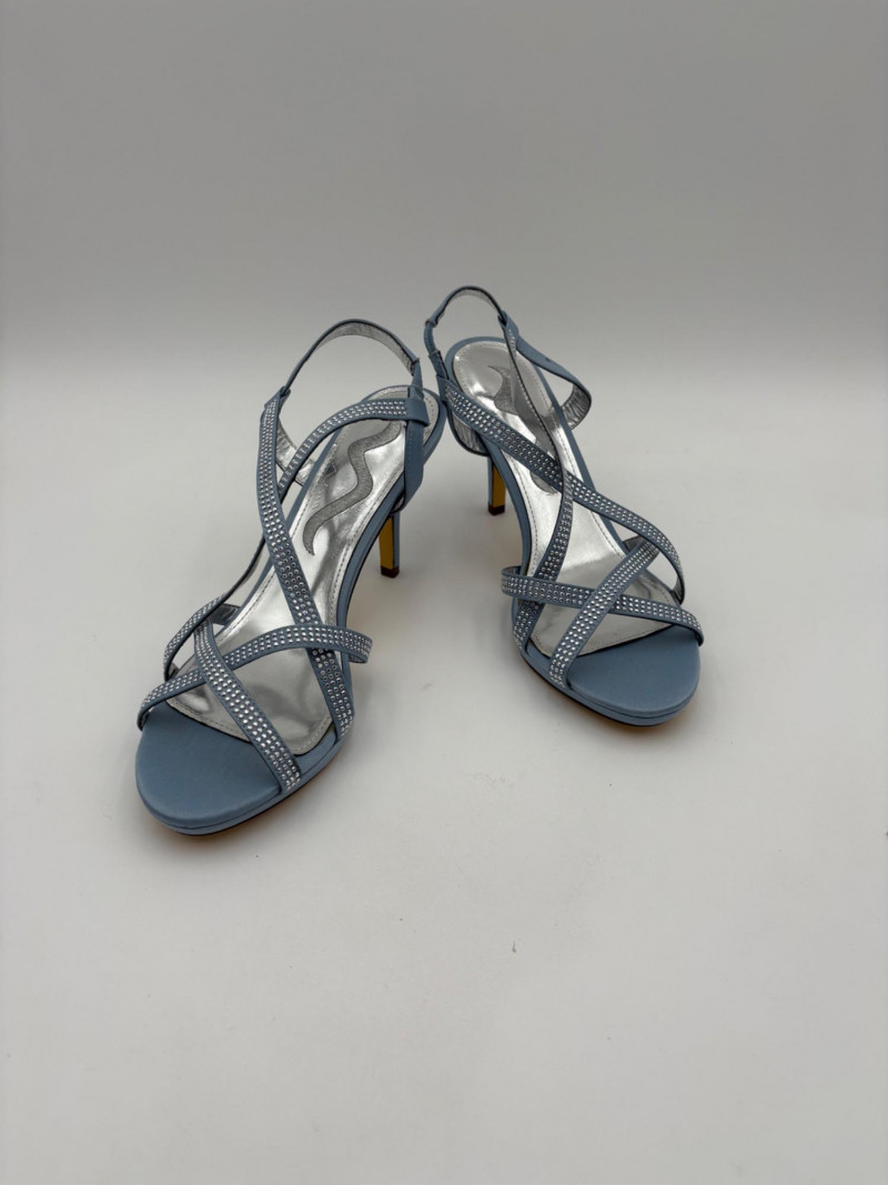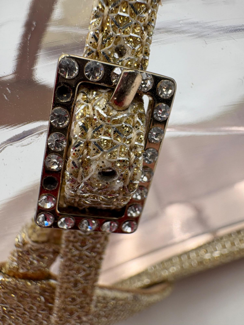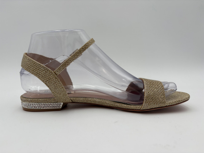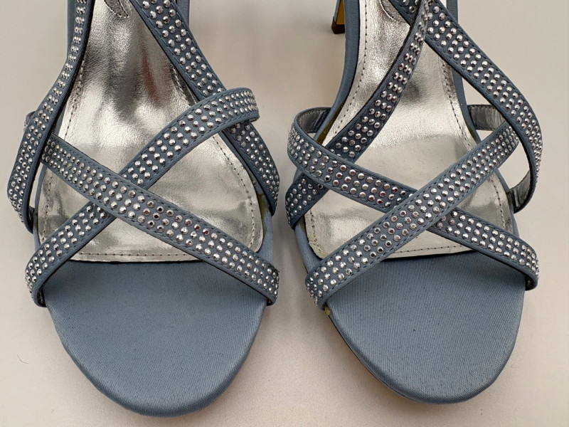 Two pairs of strappy sparkling sandals for summer dressy wear! Blue spike heel sandals from Nina in a matte medium blue fabric have small square studs in silver on straps over the top of the toes and foot. Elasticated heel strap to keep them on your foot but comfortable. 3.5" heel with leather sole. Appear new with no signs of use on soles or uppers. Size 7. Gold sparkly flats from Badgley Mischke have strap across the ball of the foot and secure ankle strap. Buckle on ankle has rhinestones for added bling. New with tags - no signs of use on soles or uppers. 1/2" heel with natural leather sole. Size 7.* * Please note that there are two small rhinestones missing on the right buckle and a couple of glue spots - both are very minor, but we wanted to mention - see last 2 photos..