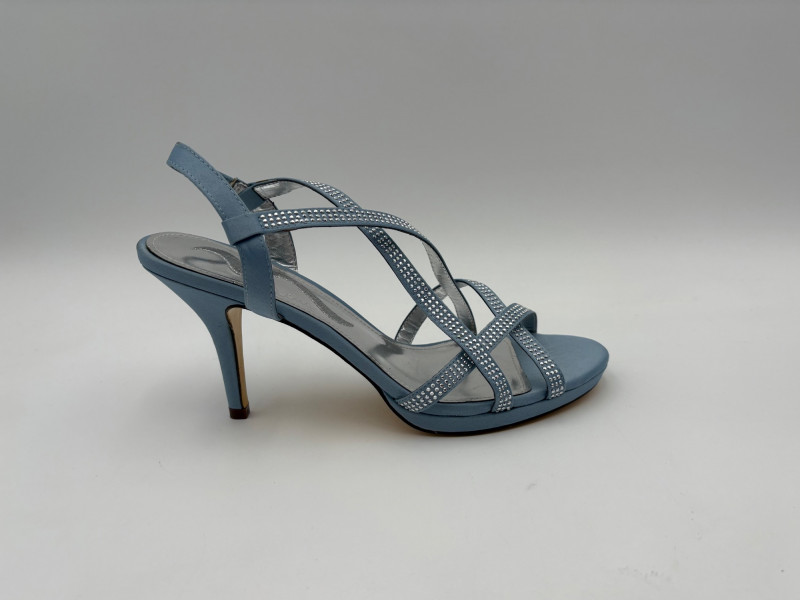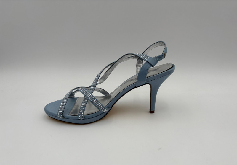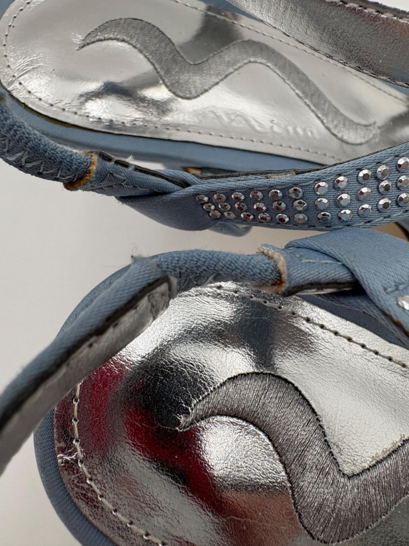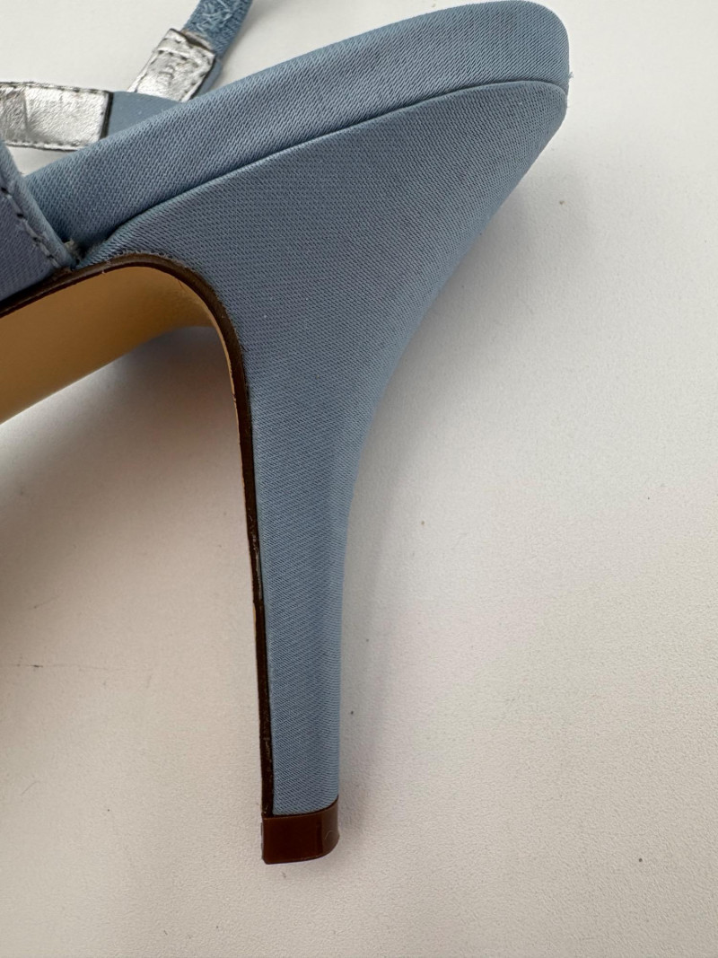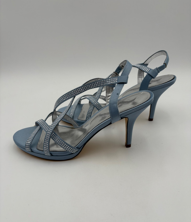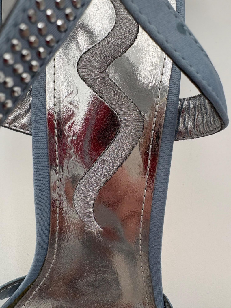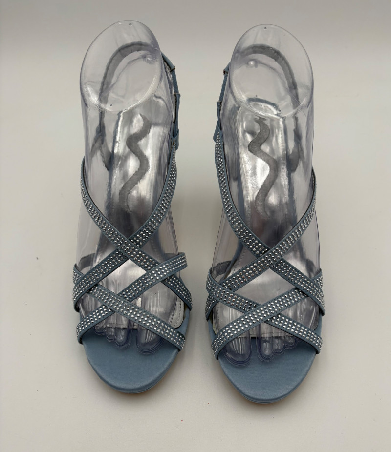 Two pairs of strappy sparkling sandals for summer dressy wear! Blue spike heel sandals from Nina in a matte medium blue fabric have small square studs in silver on straps over the top of the toes and foot. Elasticated heel strap to keep them on your foot but comfortable. 3.5" heel with leather sole. Appear new with no signs of use on soles or uppers. Size 7. Gold sparkly flats from Badgley Mischke have strap across the ball of the foot and secure ankle strap. Buckle on ankle has rhinestones for added bling. New with tags - no signs of use on soles or uppers. 1/2" heel with natural leather sole. Size 7.* * Please note that there are two small rhinestones missing on the right buckle and a couple of glue spots - both are very minor, but we wanted to mention - see last 2 photos..