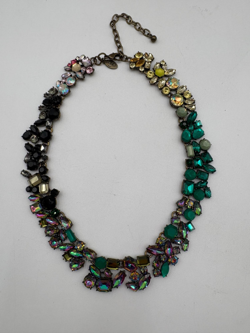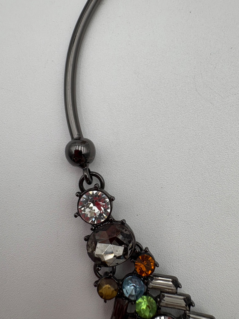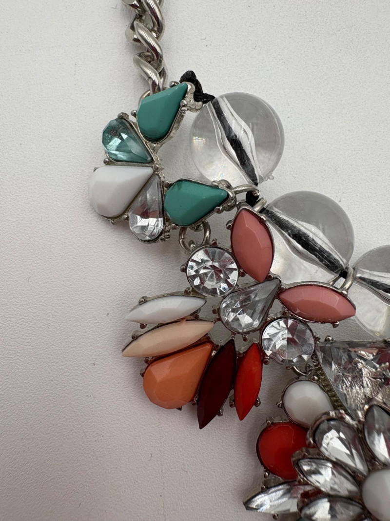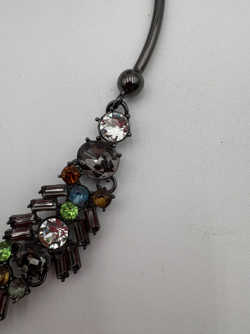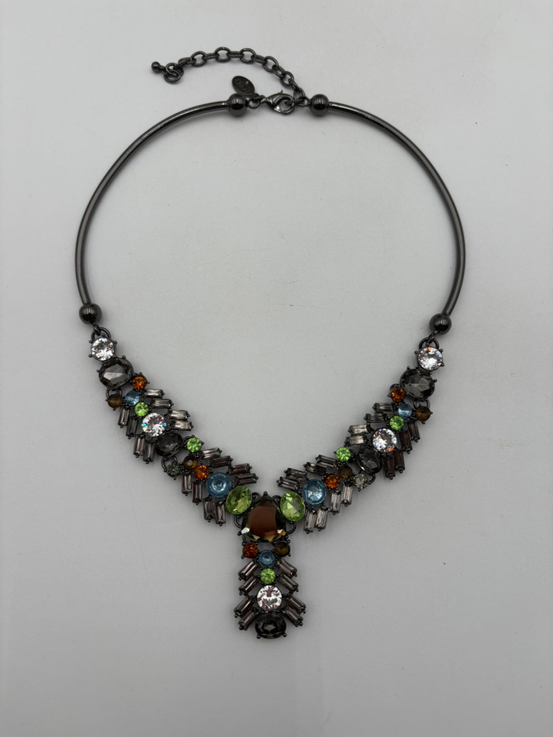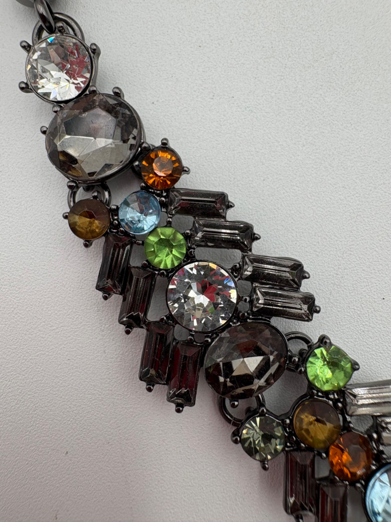 4 great necklaces that really glitter and catch the light! Silver chain with pendants in oranges and clear round beads atop the pendants measures 18" with lobster claw clasp. No maker mark. Color-grouped rhinestone necklace measures approx. 16" with lobster claw clasp. From Logo. Multi-colored rhinestone necklace with center front drop pendant and solid curved neckband measures 16" with lobster claw clasp. From Logo. Black and silver necklace with clear rhinestones measures 18" with lobster claw clasp. Maker mark says "C"