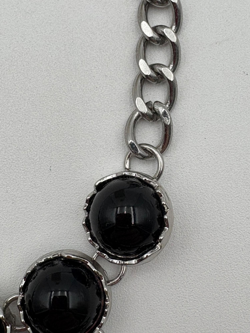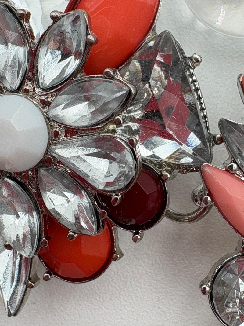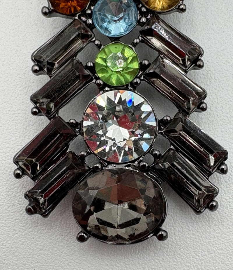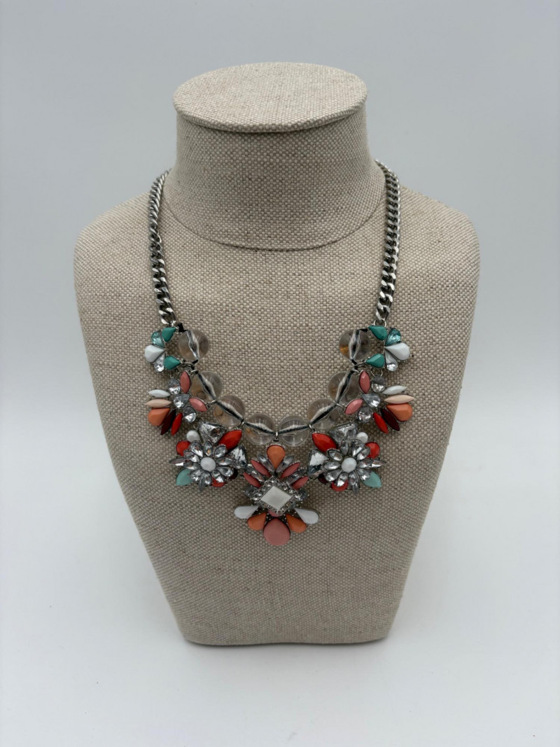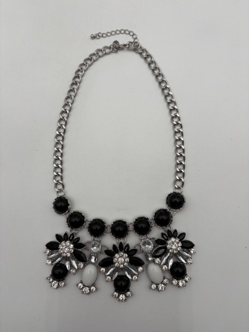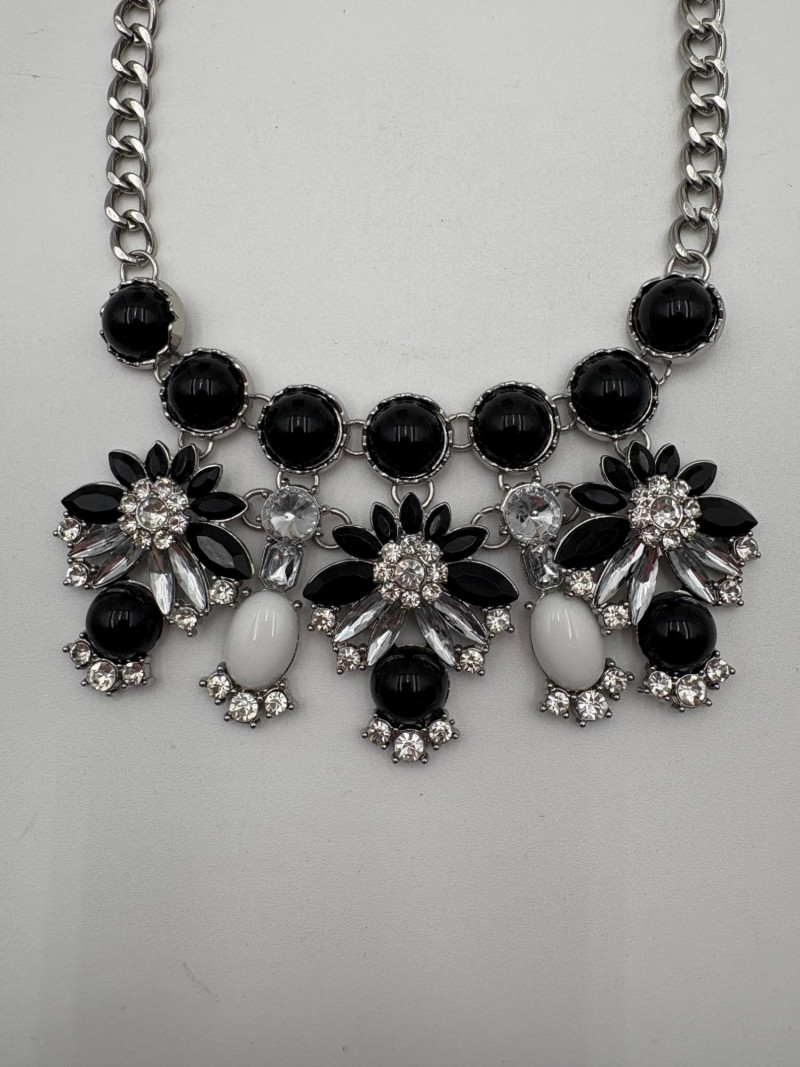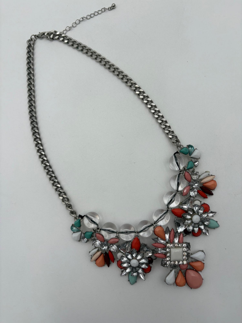 4 great necklaces that really glitter and catch the light! Silver chain with pendants in oranges and clear round beads atop the pendants measures 18" with lobster claw clasp. No maker mark. Color-grouped rhinestone necklace measures approx. 16" with lobster claw clasp. From Logo. Multi-colored rhinestone necklace with center front drop pendant and solid curved neckband measures 16" with lobster claw clasp. From Logo. Black and silver necklace with clear rhinestones measures 18" with lobster claw clasp. Maker mark says "C"