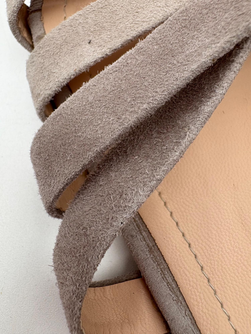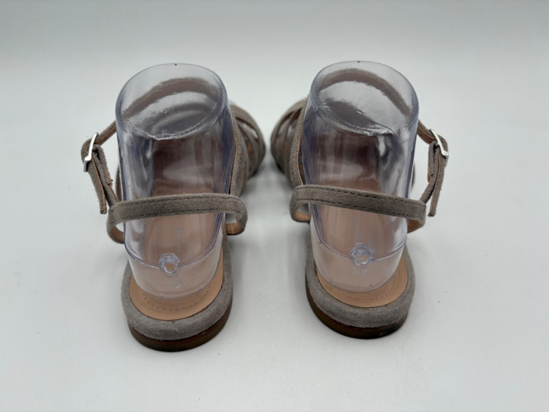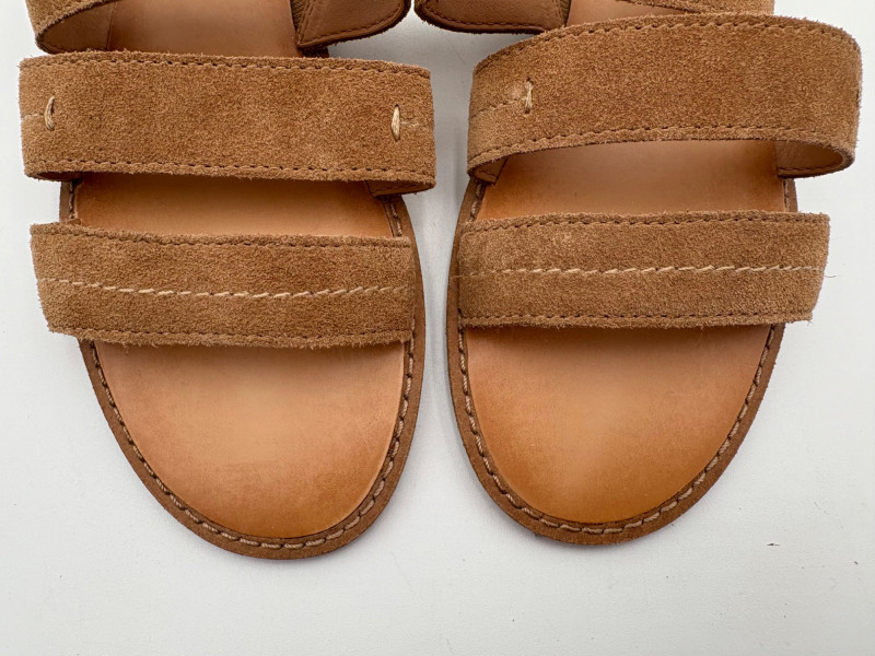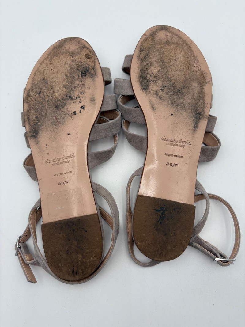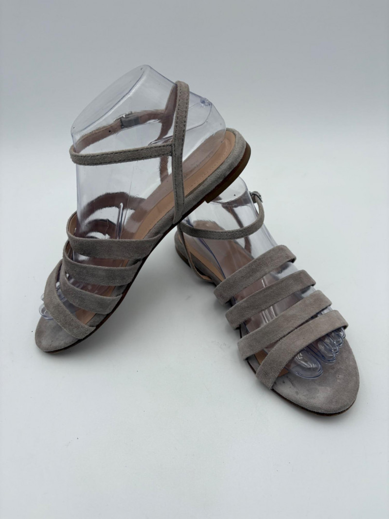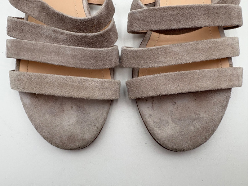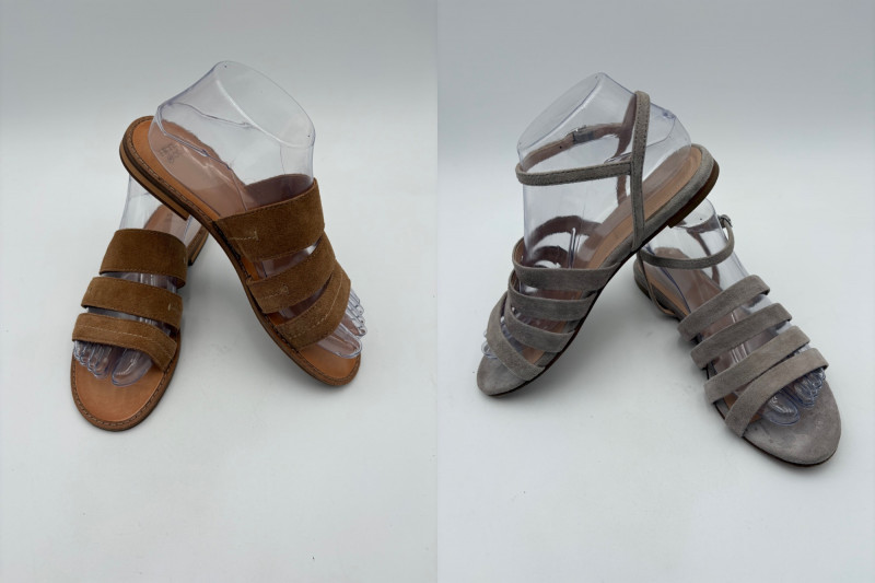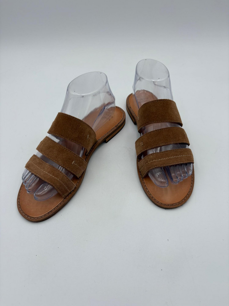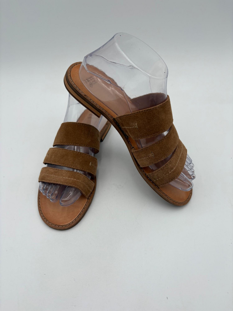 2 pairs of neutral flat sandals - one a bit more casual and the other a bit more dressy without being formal. The tan slides from Frye & Co have 3 straps across the foot - the highest one with a small elastic insert on the inside of the foot to allow for comfortable walking and better fit. Suede uppers and natural leather sole with non-slip rubber. Appear new with no wear to soles or uppers. Size 7. Soft beige suede strappy sandals from Joan & David have 4 straps on the vamp and an ankle strap secured with a silver buckle. Leather sole with self-faced platform. In excellent condition. Size 7.