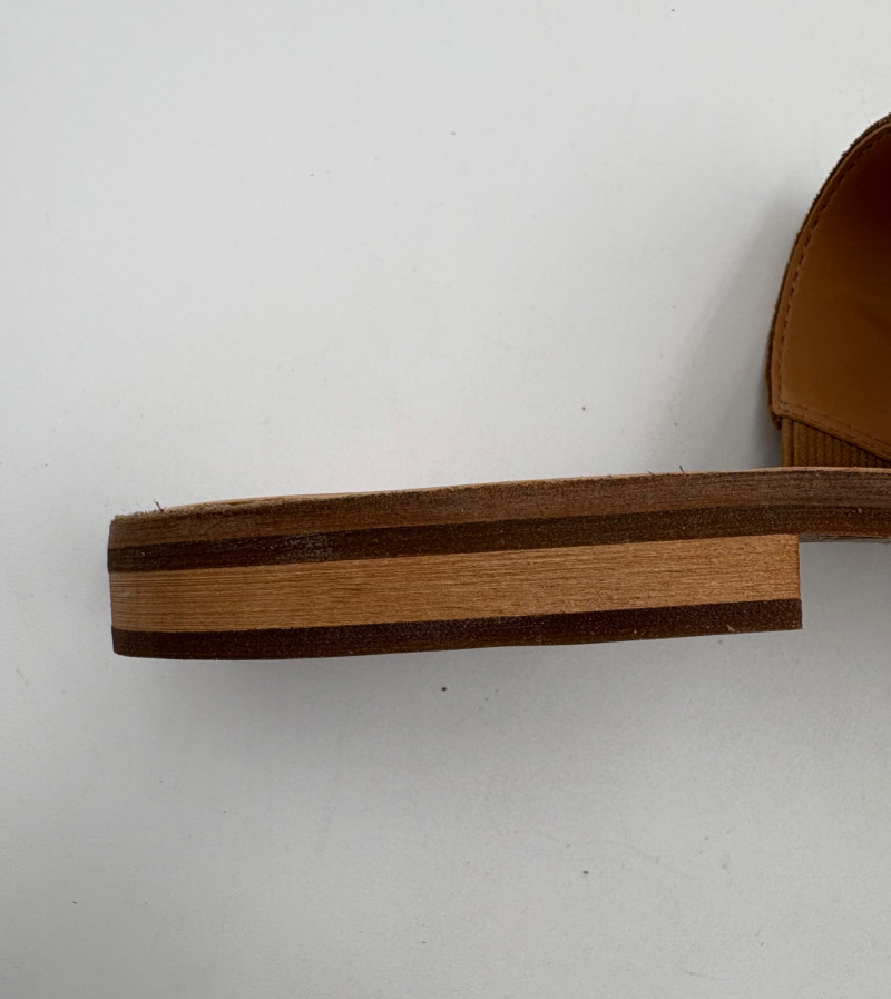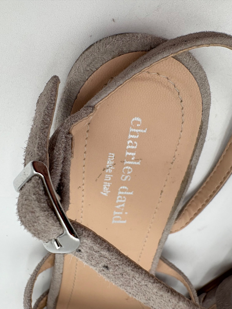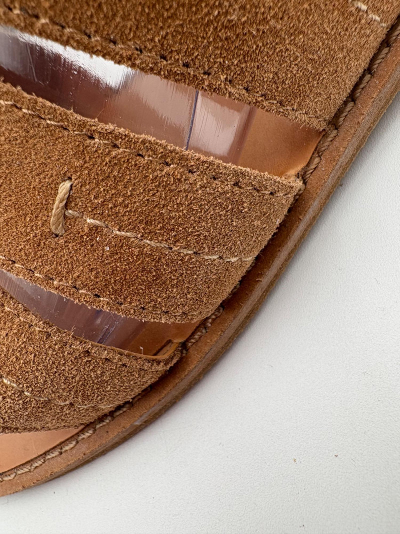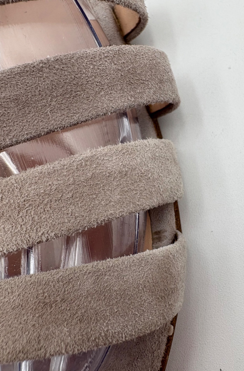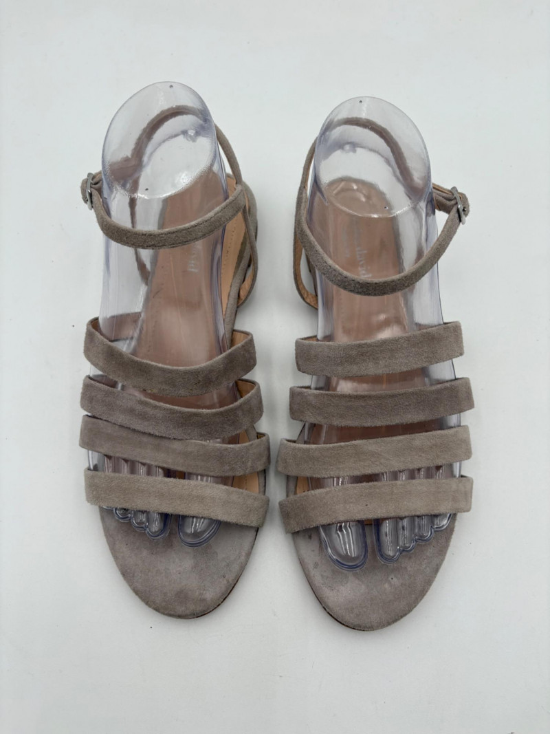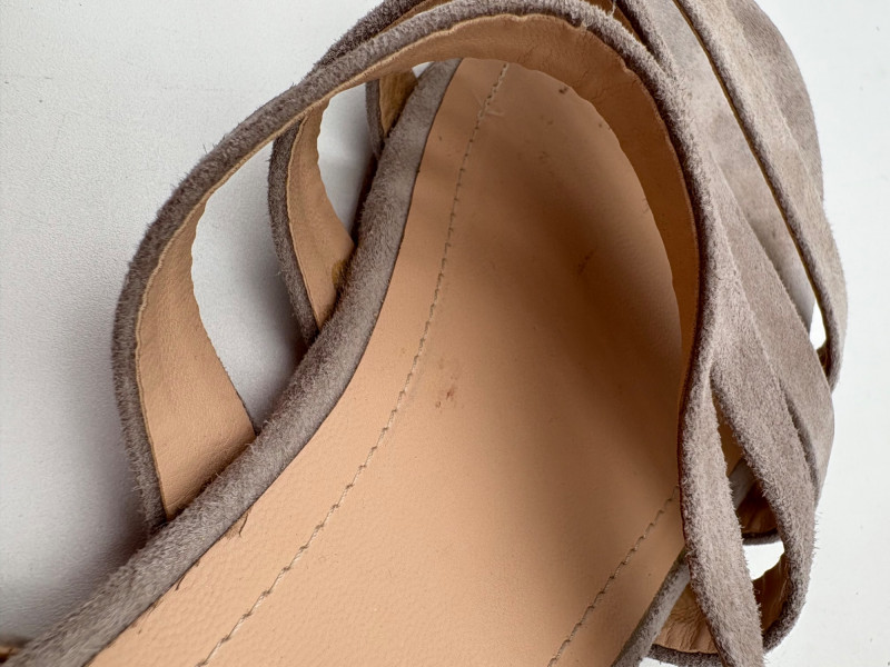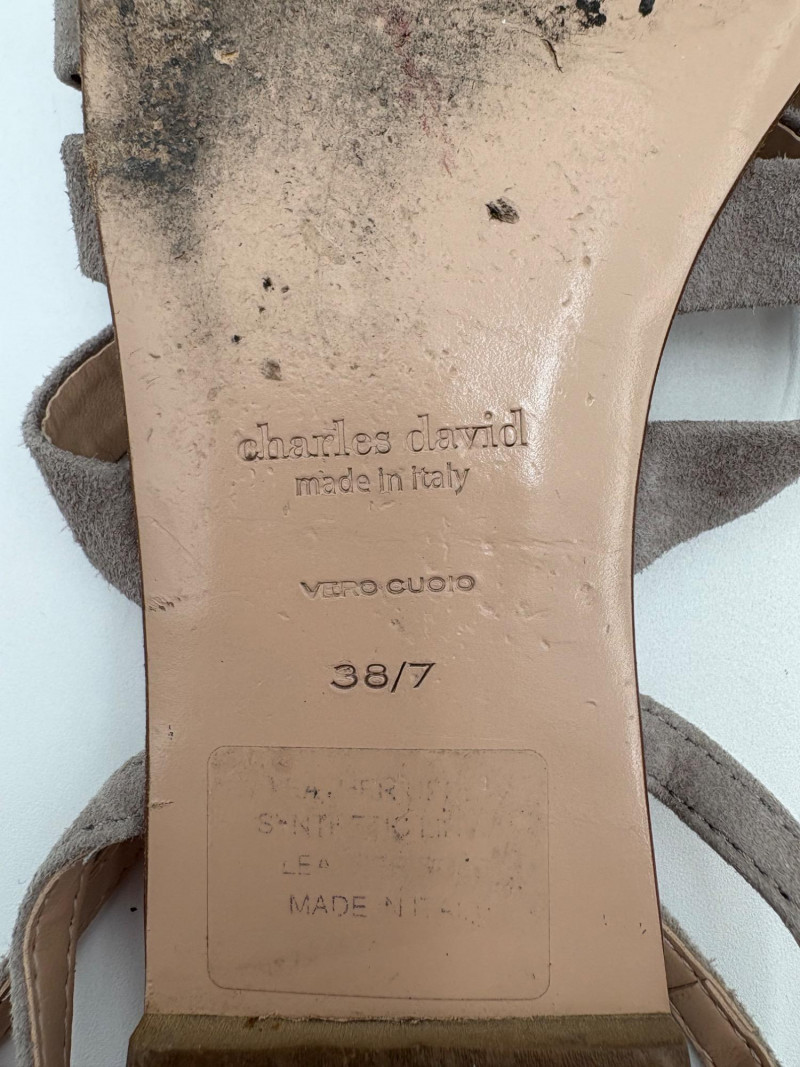 2 pairs of neutral flat sandals - one a bit more casual and the other a bit more dressy without being formal. The tan slides from Frye & Co have 3 straps across the foot - the highest one with a small elastic insert on the inside of the foot to allow for comfortable walking and better fit. Suede uppers and natural leather sole with non-slip rubber. Appear new with no wear to soles or uppers. Size 7. Soft beige suede strappy sandals from Joan & David have 4 straps on the vamp and an ankle strap secured with a silver buckle. Leather sole with self-faced platform. In excellent condition. Size 7.