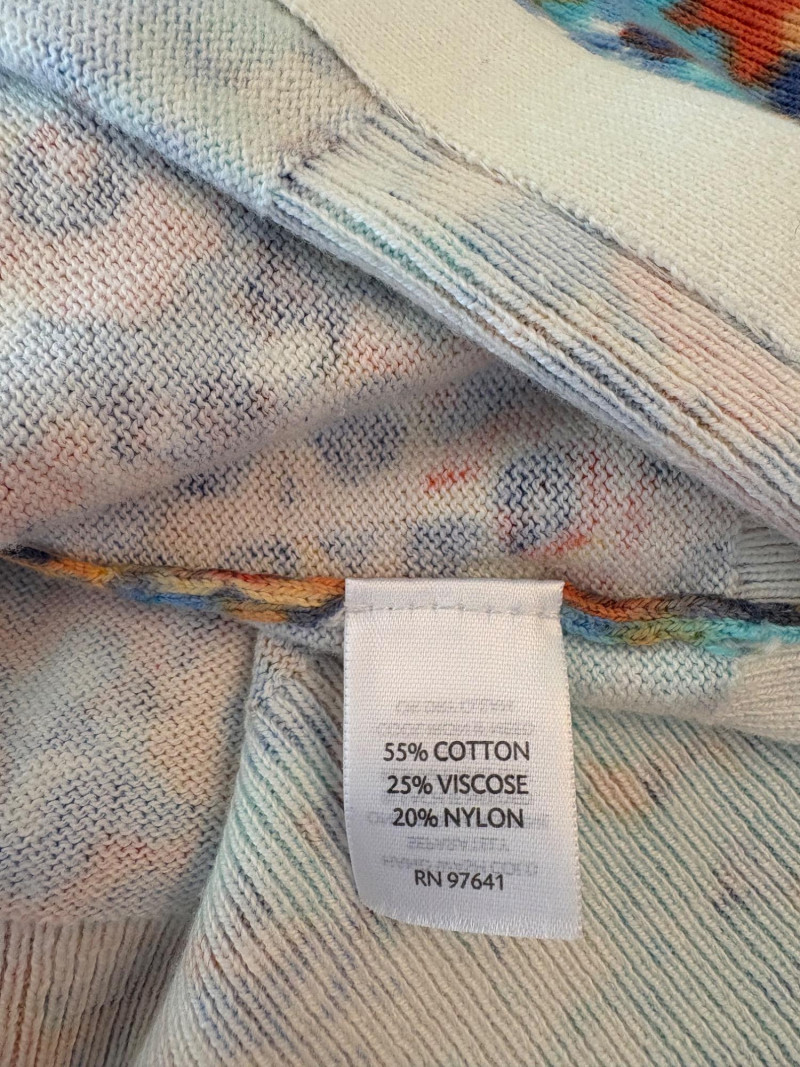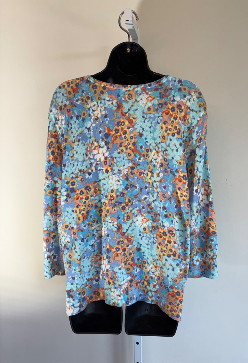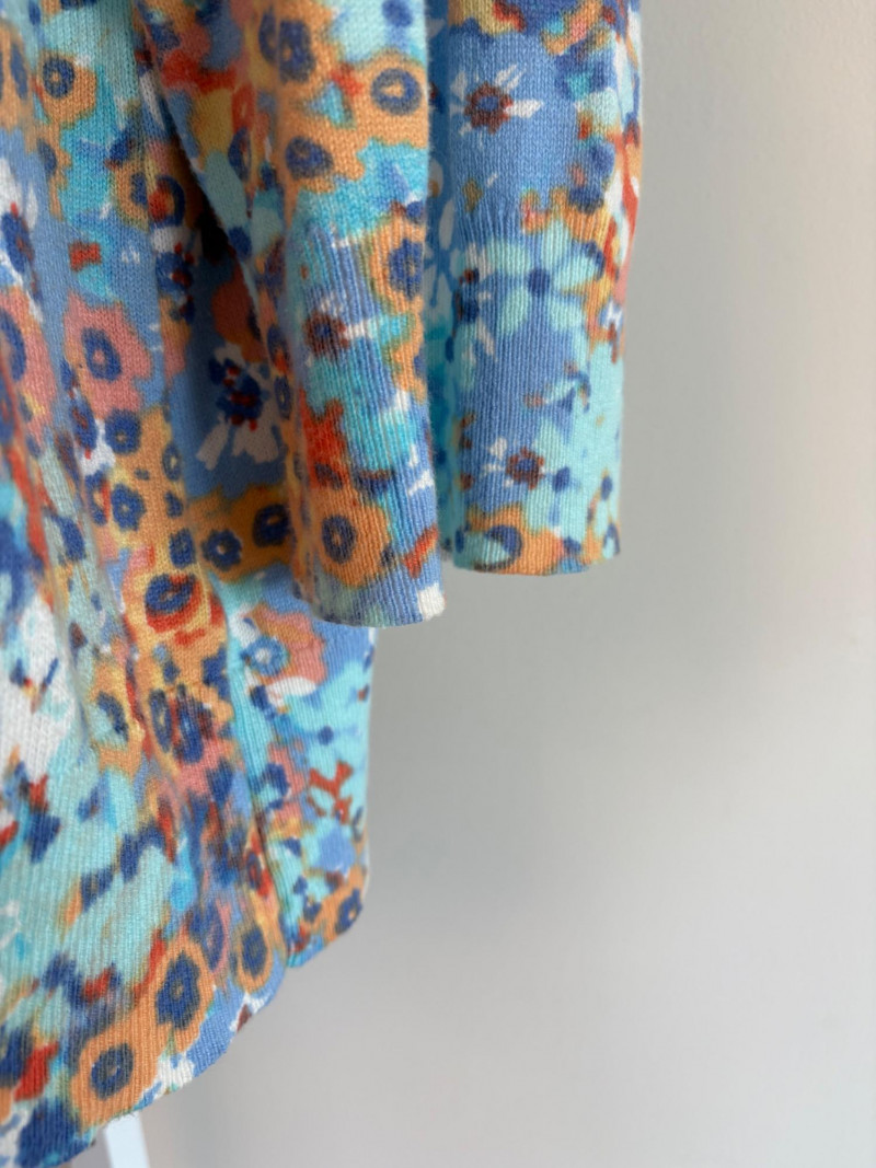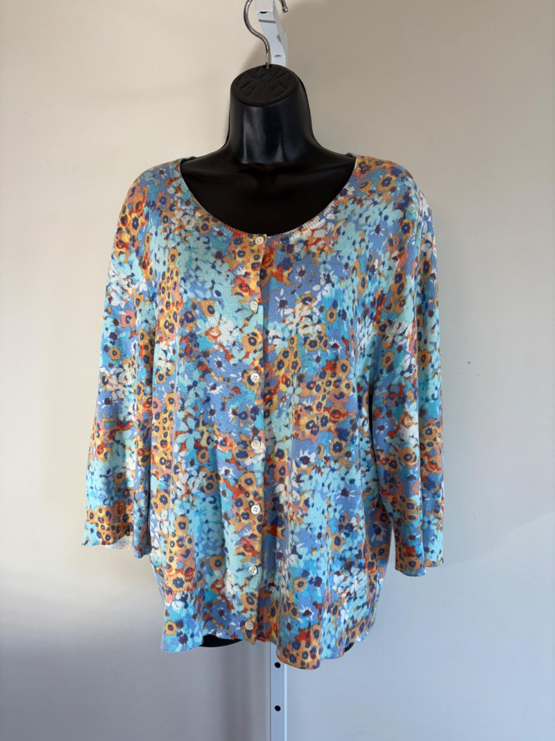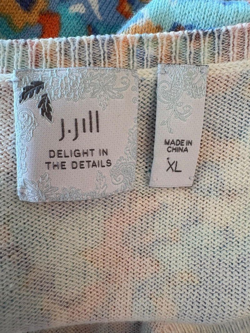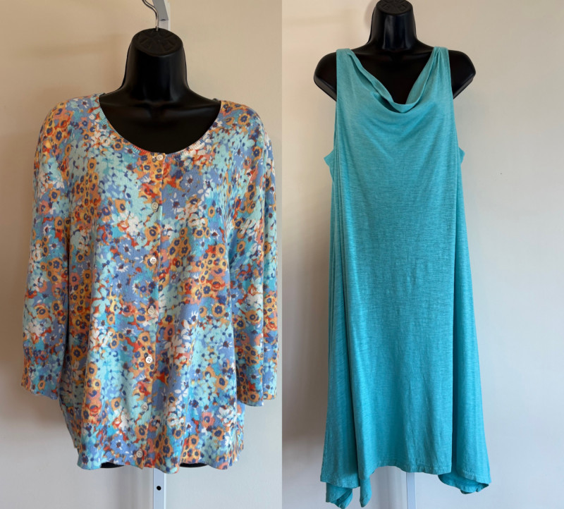 Two great separates from Eileen Fisher & J. Jill that can go from the heat of the day to the cool of a summer evening. In a lovely shade of blue, knit dress from Eileen Fisher has cowl neckline, faced bodice, and shark bite hem. Dress measures 22" pit to pit and 45" from back neckline to back bottom hem. In excellent condition. 55% hemp with 45% organic cotton. Size tag says XL. Abstract soft floral cardigan from J. Jill has ribbed curved neckline, cuffs, and waist along with a traditional button front closure and 3/4 sleeves.. In excellent condition. 55% cotton and 25% viscose with 20% nylon. Size tag says XL.