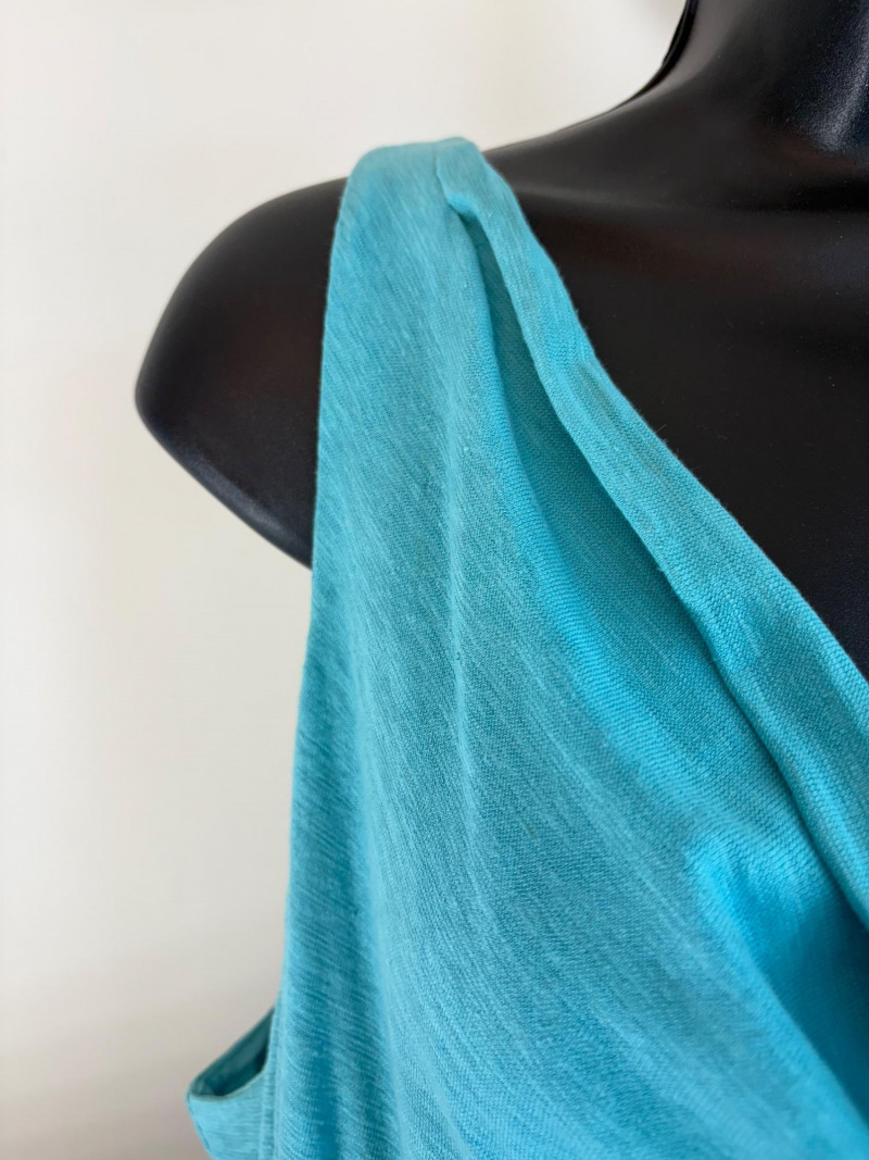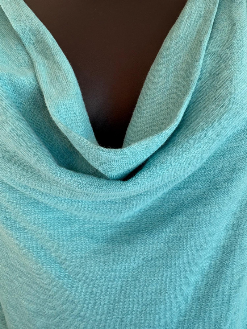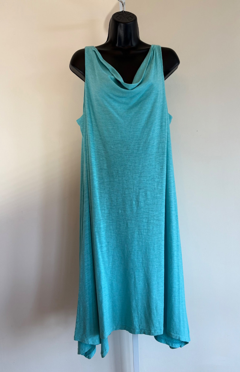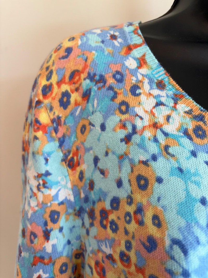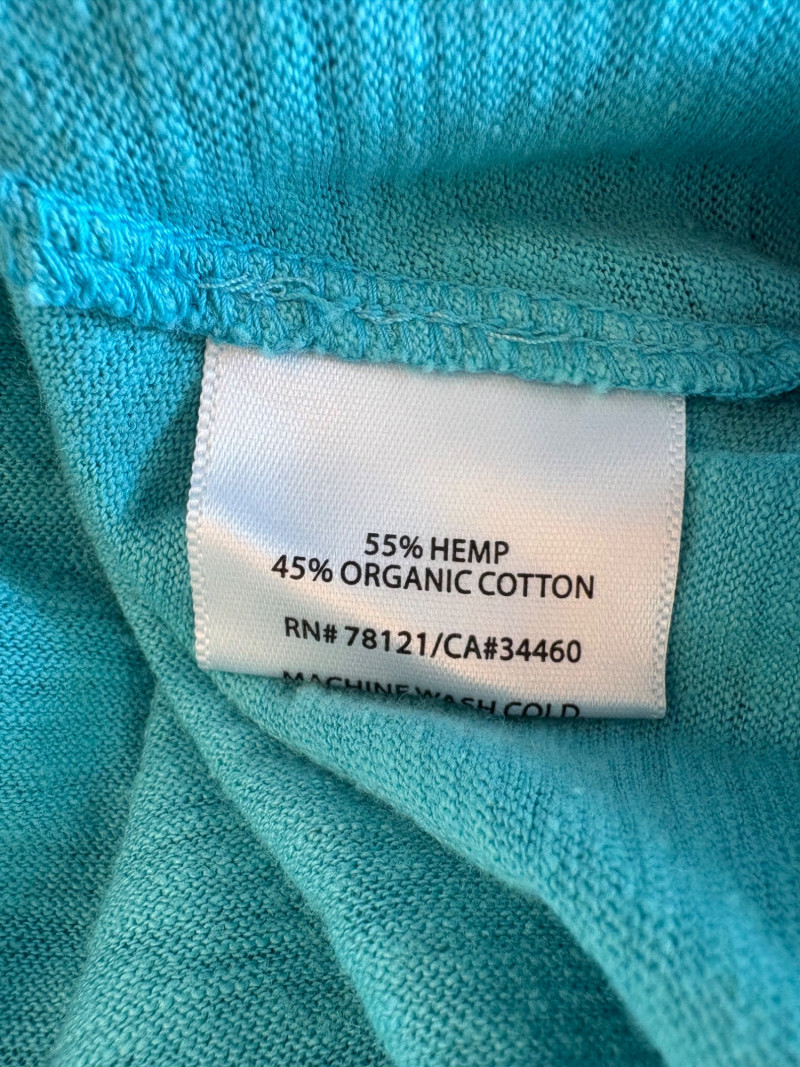 Two great separates from Eileen Fisher & J. Jill that can go from the heat of the day to the cool of a summer evening. In a lovely shade of blue, knit dress from Eileen Fisher has cowl neckline, faced bodice, and shark bite hem. Dress measures 22" pit to pit and 45" from back neckline to back bottom hem. In excellent condition. 55% hemp with 45% organic cotton. Size tag says XL. Abstract soft floral cardigan from J. Jill has ribbed curved neckline, cuffs, and waist along with a traditional button front closure and 3/4 sleeves.. In excellent condition. 55% cotton and 25% viscose with 20% nylon. Size tag says XL.