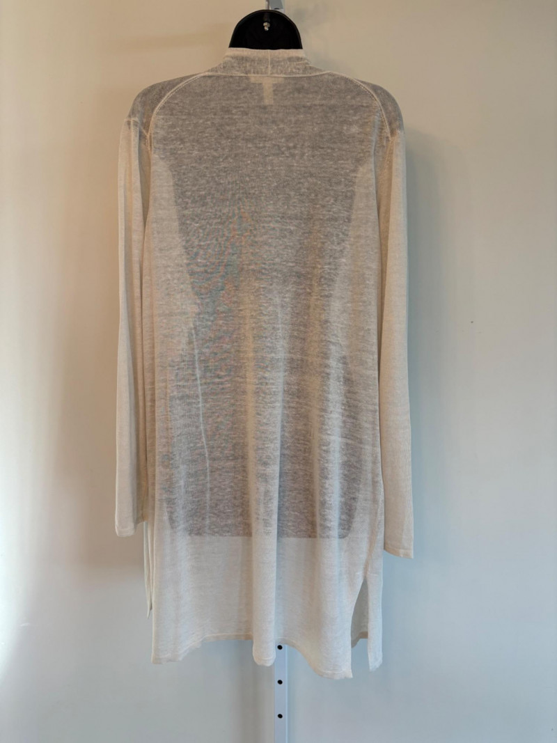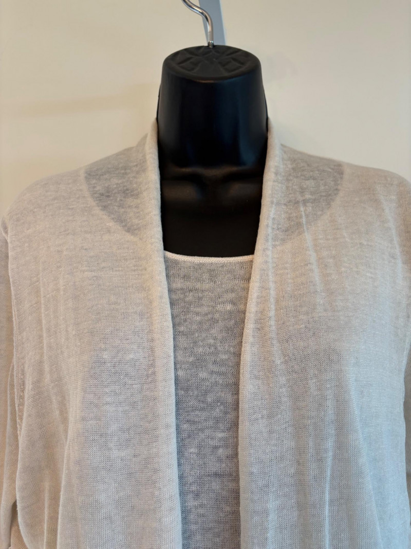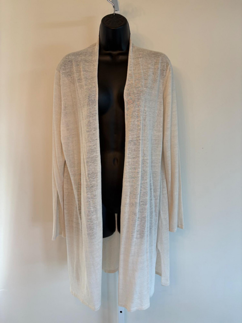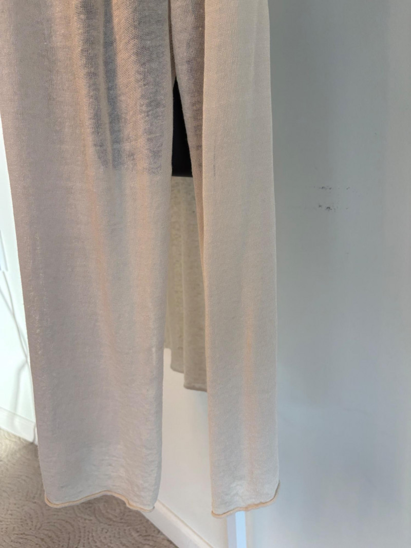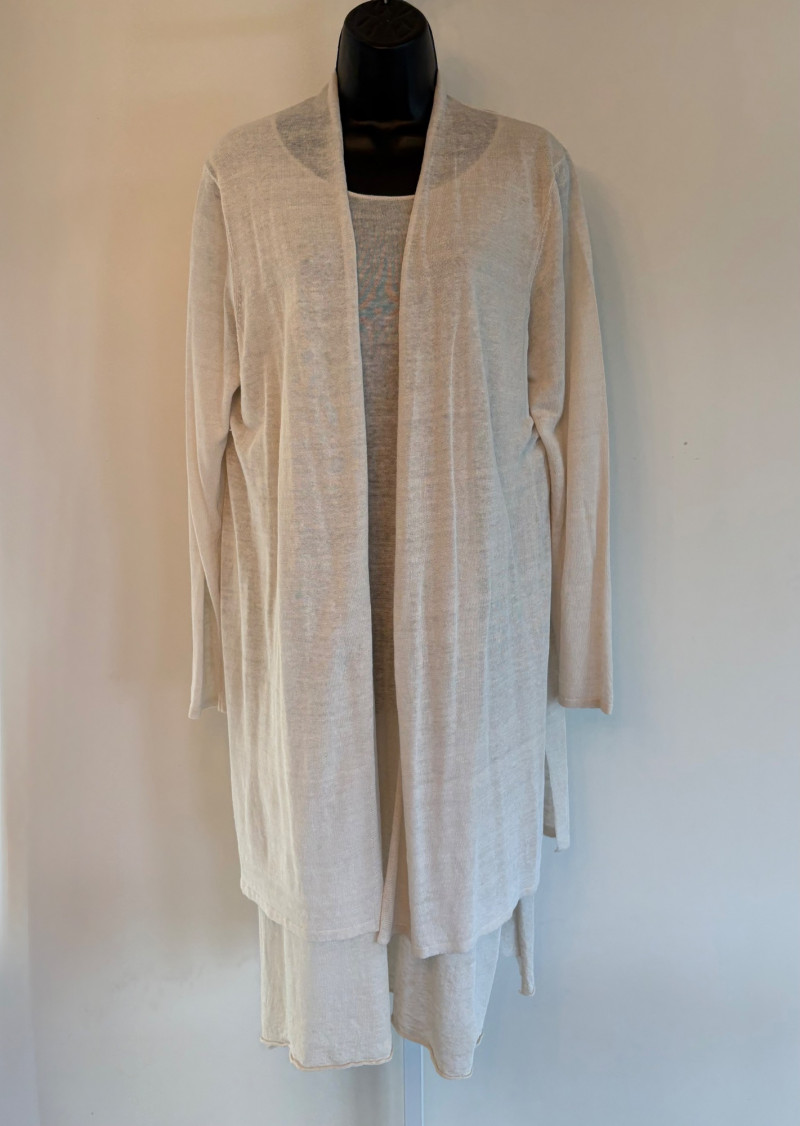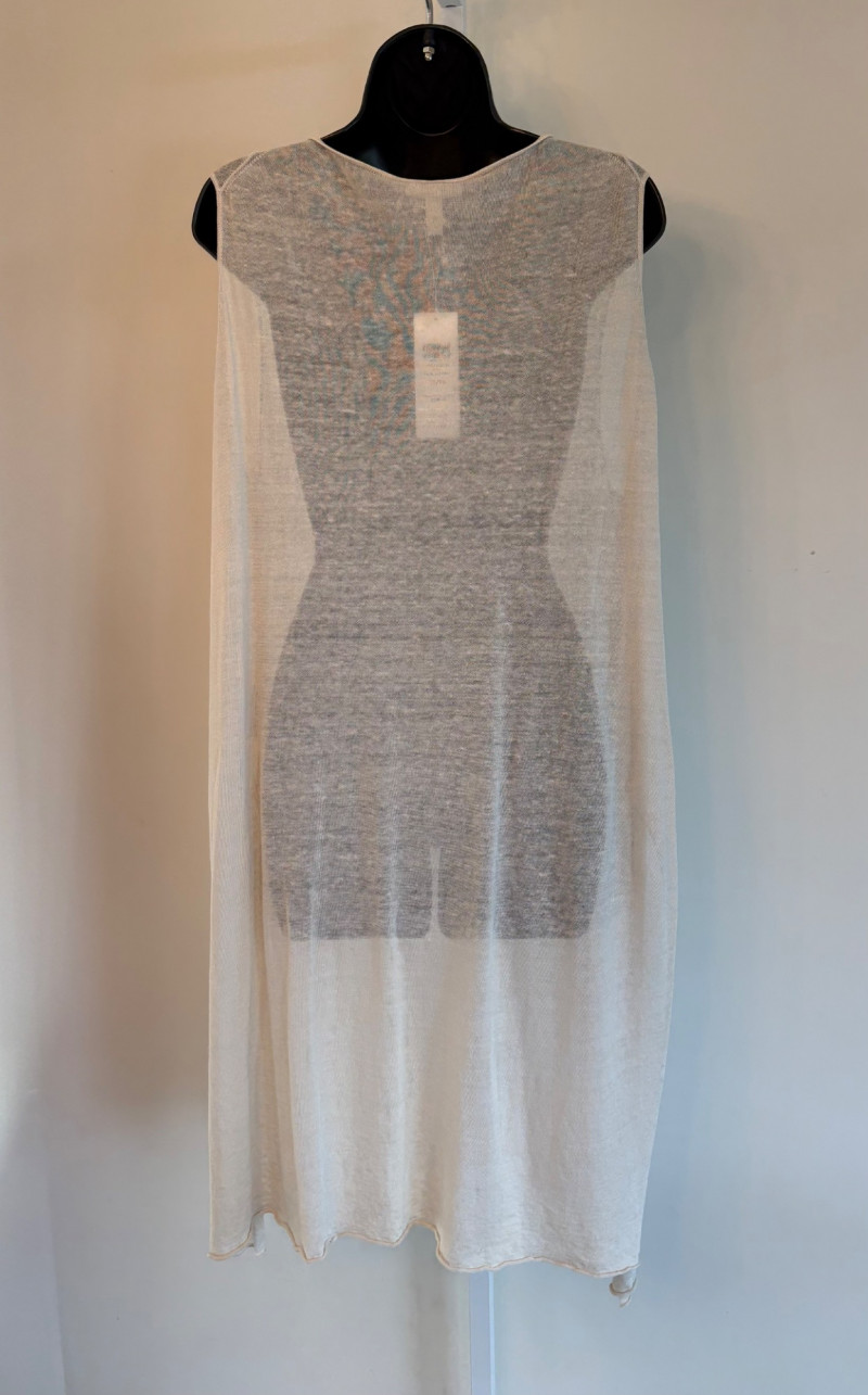 Superb tunic and duster in very lightweight linen knit from Eileen Fisher that is quite sheer. Both pieces of this bone-colored duo are made of the same knit that literally feels like you are wearing nothing. Each would work well with other layers as well if you want to be a bit more covered. Sleeveless tunic has a curved neckline with a deeply split hem. New with tag. 87% organic linen with 13% nylon. Measures 23" pit to pit and 35" from shoulder to hem. Size tag says XL. Matching open front duster has long sleeves and split hem. In excellent condition. 87% organic linen with 13% nylon. Measures 22" pit to pit and 29" from back neckline seam to hem. Size tag says L/G.