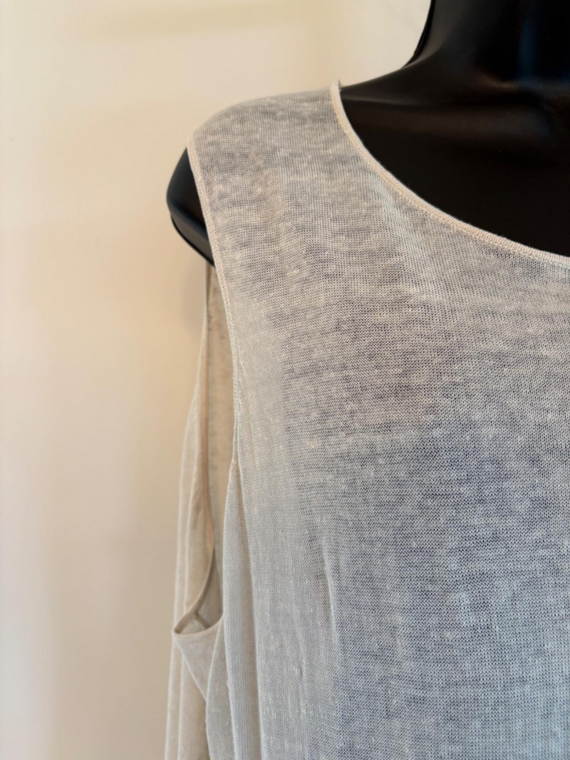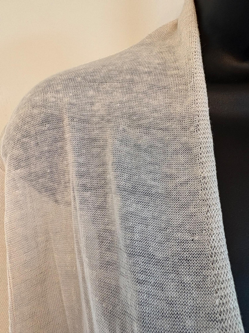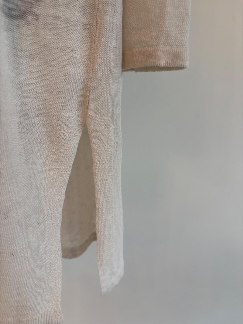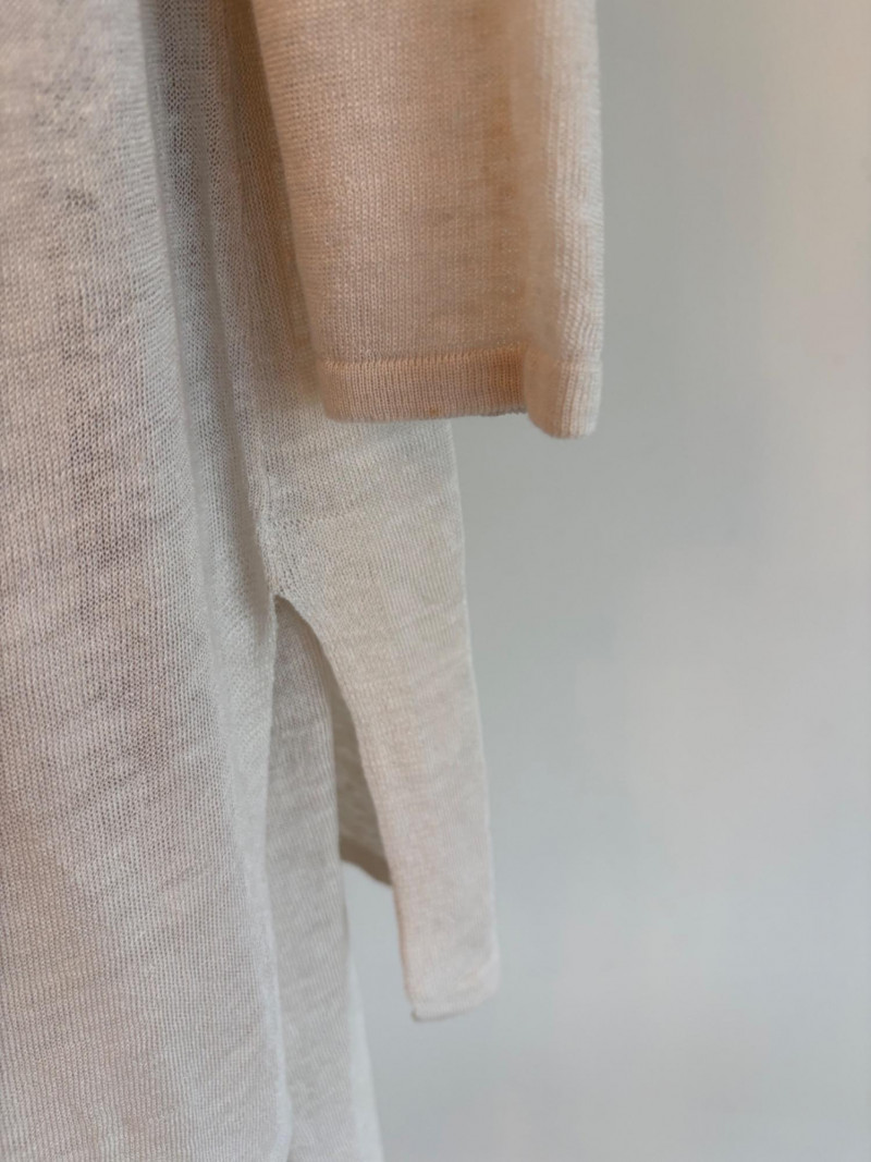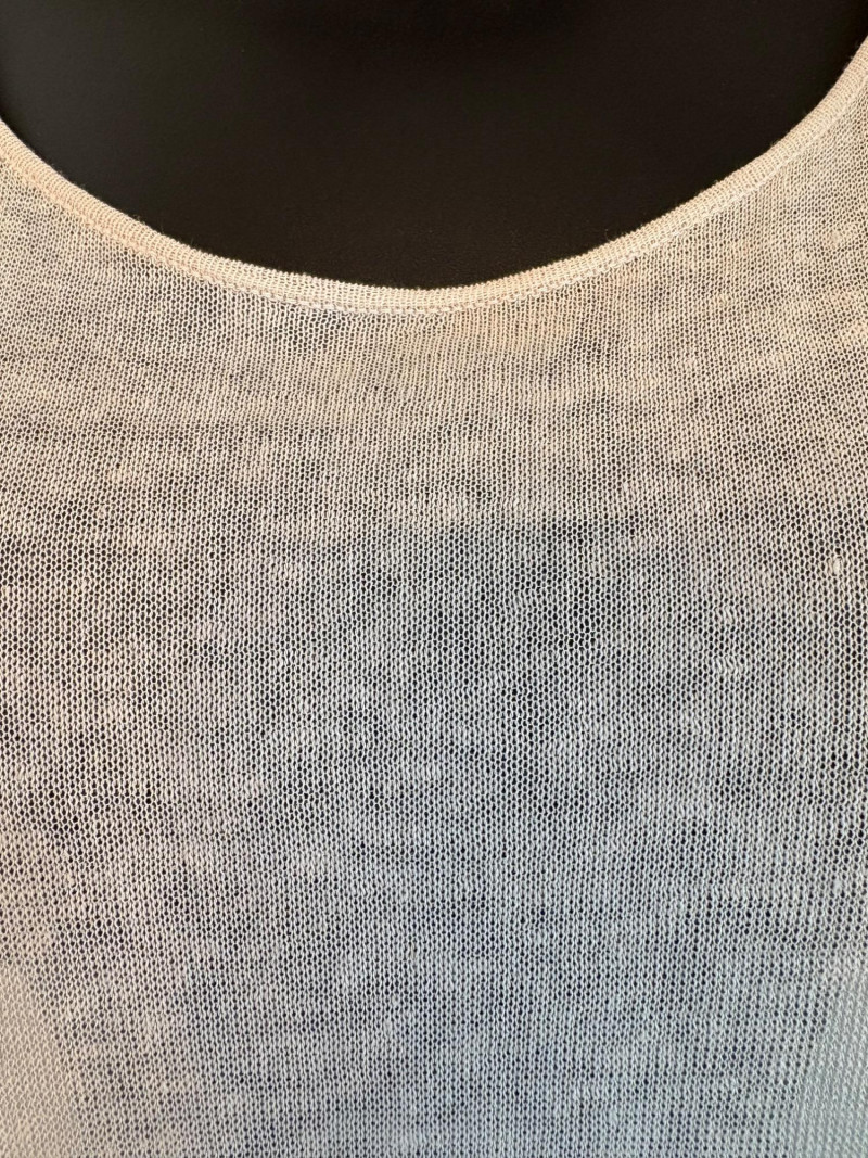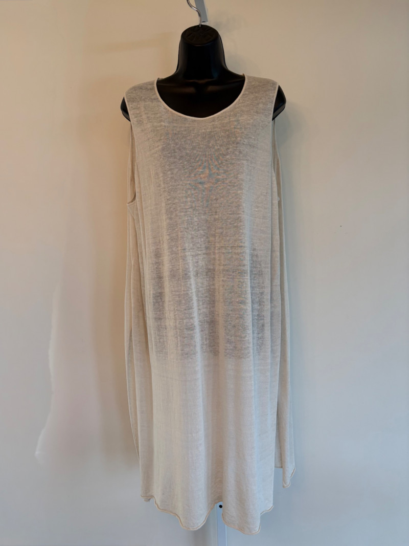 Superb tunic and duster in very lightweight linen knit from Eileen Fisher that is quite sheer. Both pieces of this bone-colored duo are made of the same knit that literally feels like you are wearing nothing. Each would work well with other layers as well if you want to be a bit more covered. Sleeveless tunic has a curved neckline with a deeply split hem. New with tag. 87% organic linen with 13% nylon. Measures 23" pit to pit and 35" from shoulder to hem. Size tag says XL. Matching open front duster has long sleeves and split hem. In excellent condition. 87% organic linen with 13% nylon. Measures 22" pit to pit and 29" from back neckline seam to hem. Size tag says L/G.