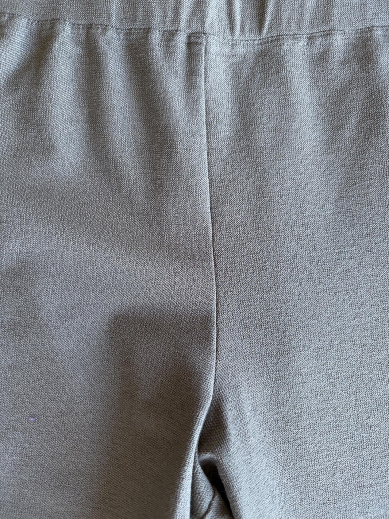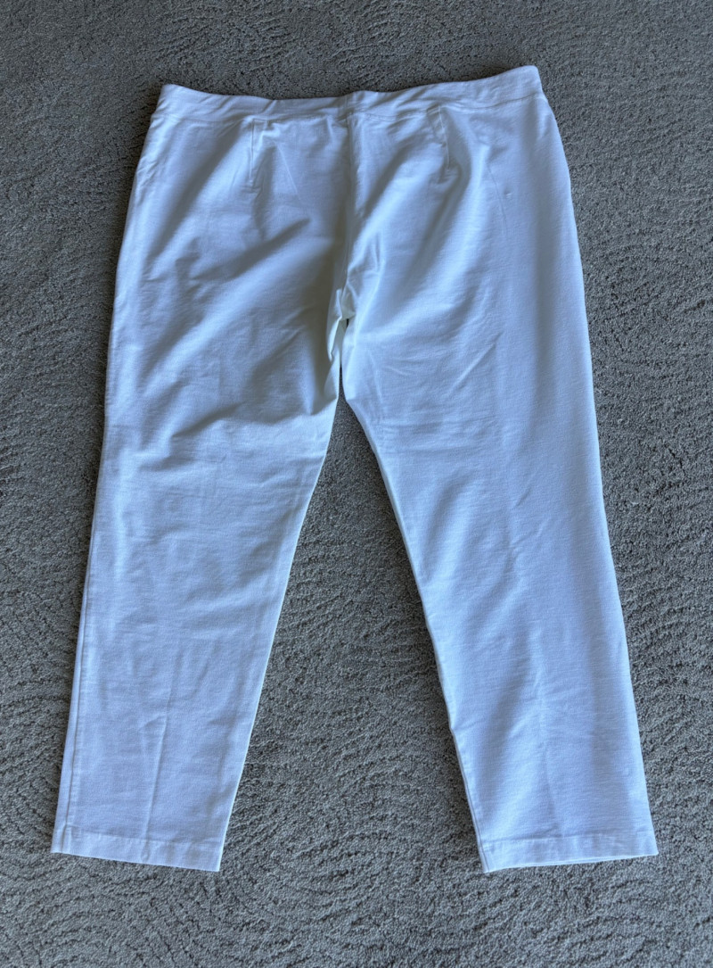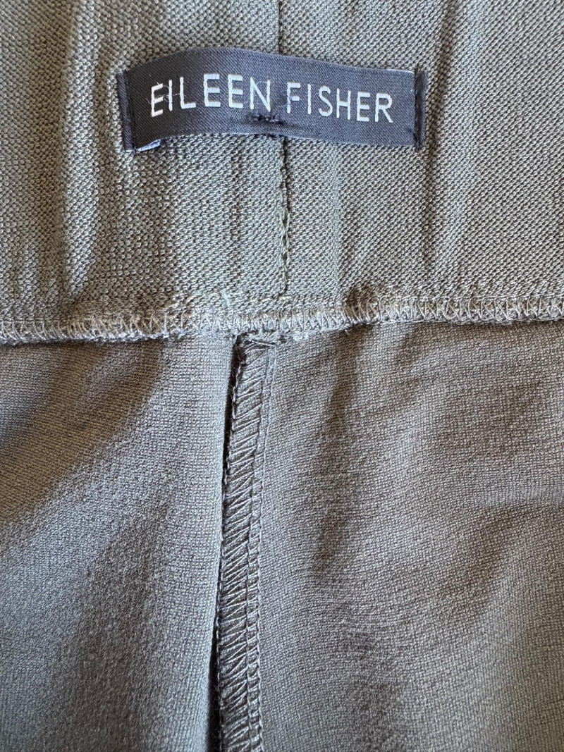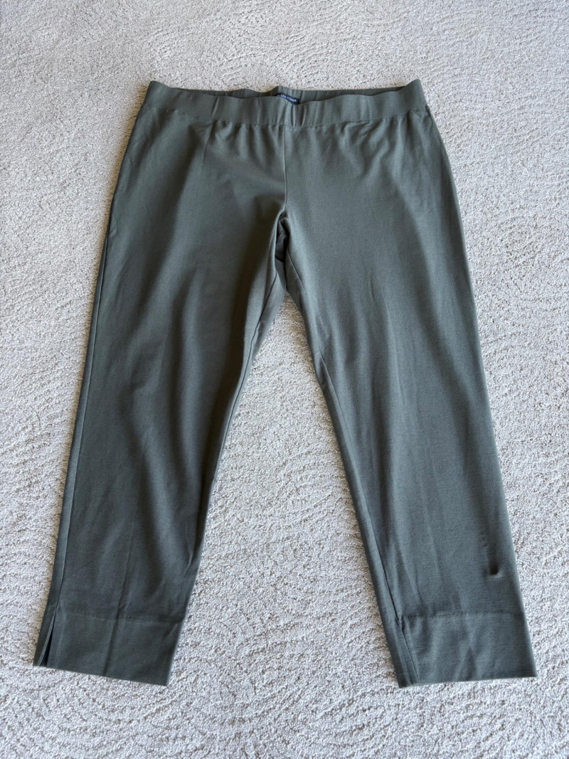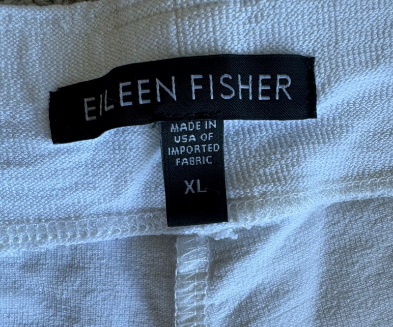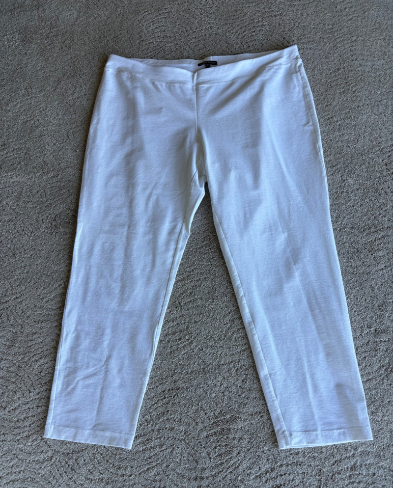 2 pairs of lightweight knit stretch pants from Eileen Fisher - one in dark green and one in white. Both measure 19.5" side to side at the waist with 27" inseams. Both have wide flat elastic waistbands and shaping back darts with a fairly straight leg. The green pair has a 2" split leg hem whereas the white pair does not. Very flattering under a larger shirt with a sleek sliming fit. They are 70% viscose and 24% nylon with 5% spandex and are in excellent condition. Size tag on green pair is missing, but white says XL and they are the same waist size and fabric.