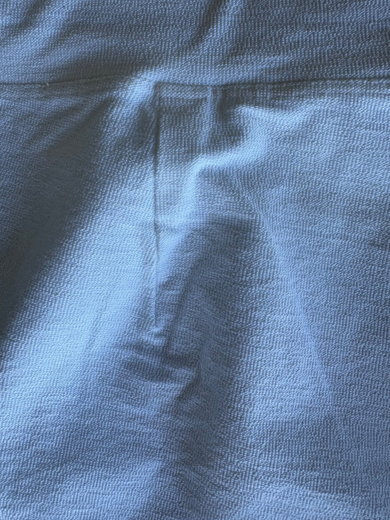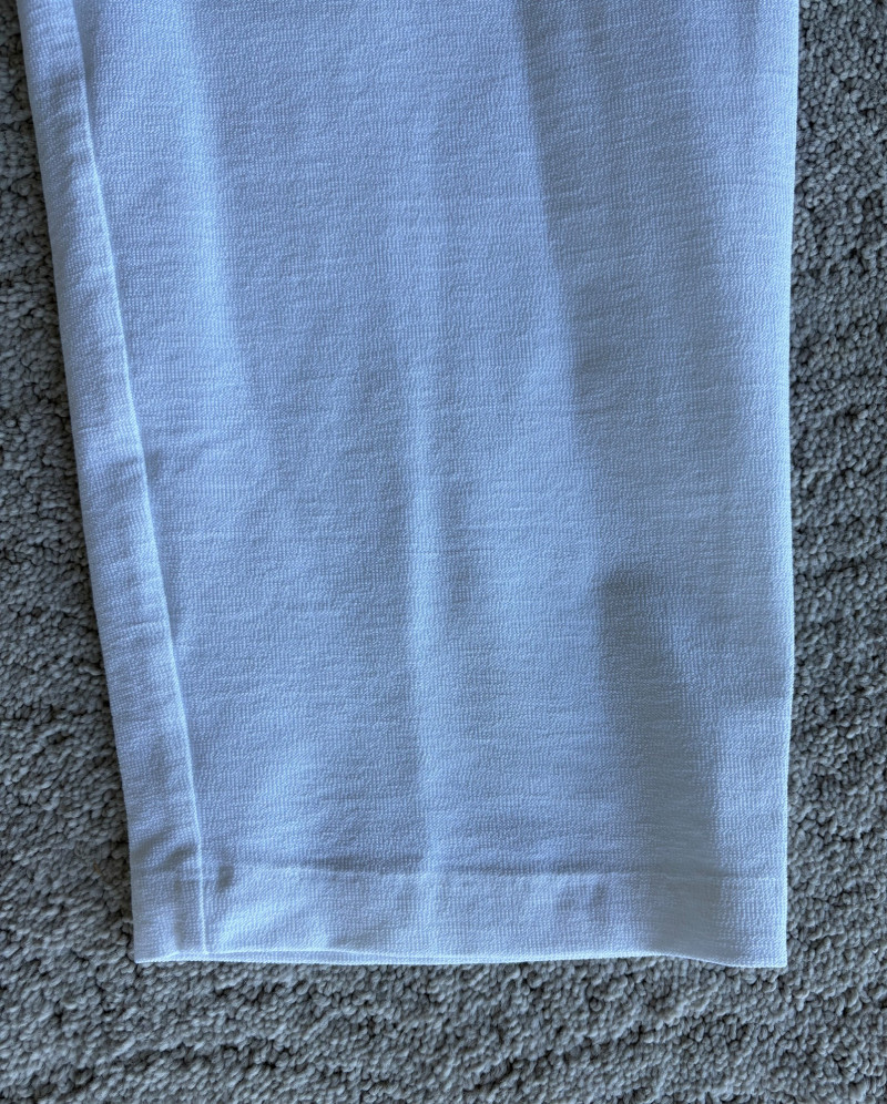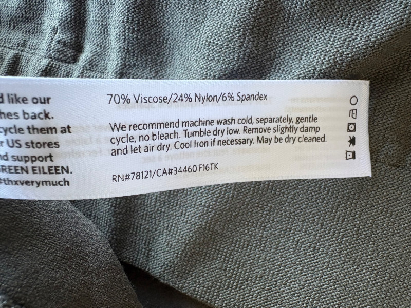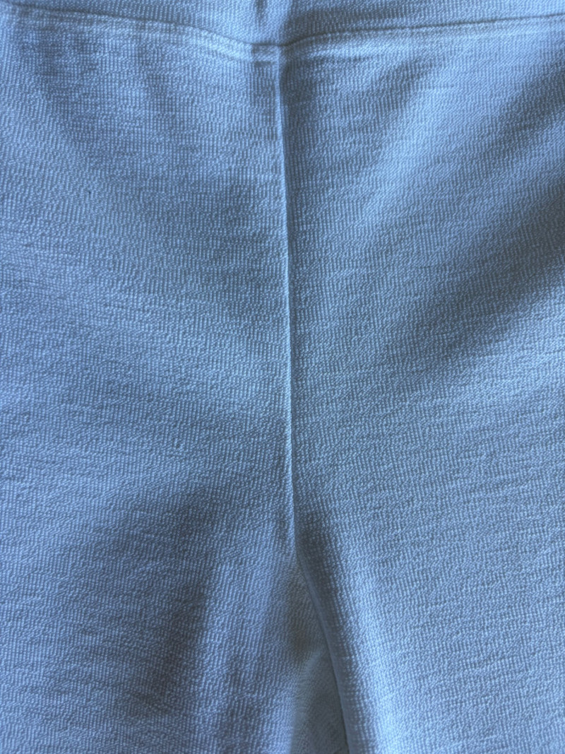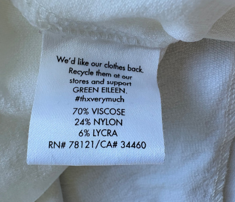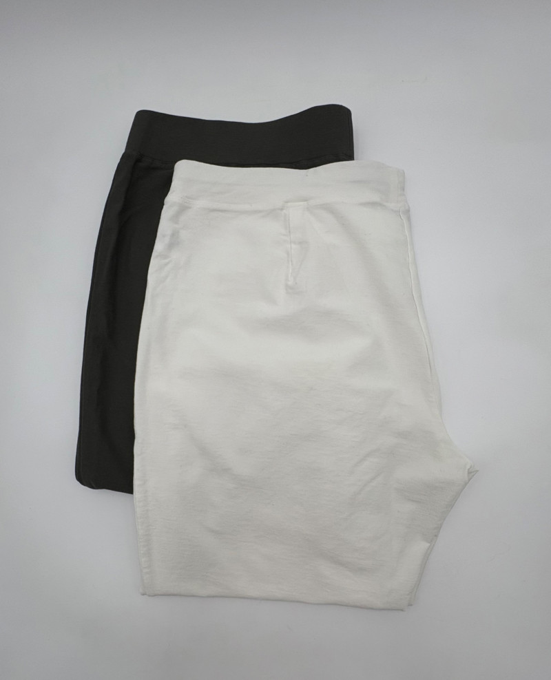 2 pairs of lightweight knit stretch pants from Eileen Fisher - one in dark green and one in white. Both measure 19.5" side to side at the waist with 27" inseams. Both have wide flat elastic waistbands and shaping back darts with a fairly straight leg. The green pair has a 2" split leg hem whereas the white pair does not. Very flattering under a larger shirt with a sleek sliming fit. They are 70% viscose and 24% nylon with 5% spandex and are in excellent condition. Size tag on green pair is missing, but white says XL and they are the same waist size and fabric.
