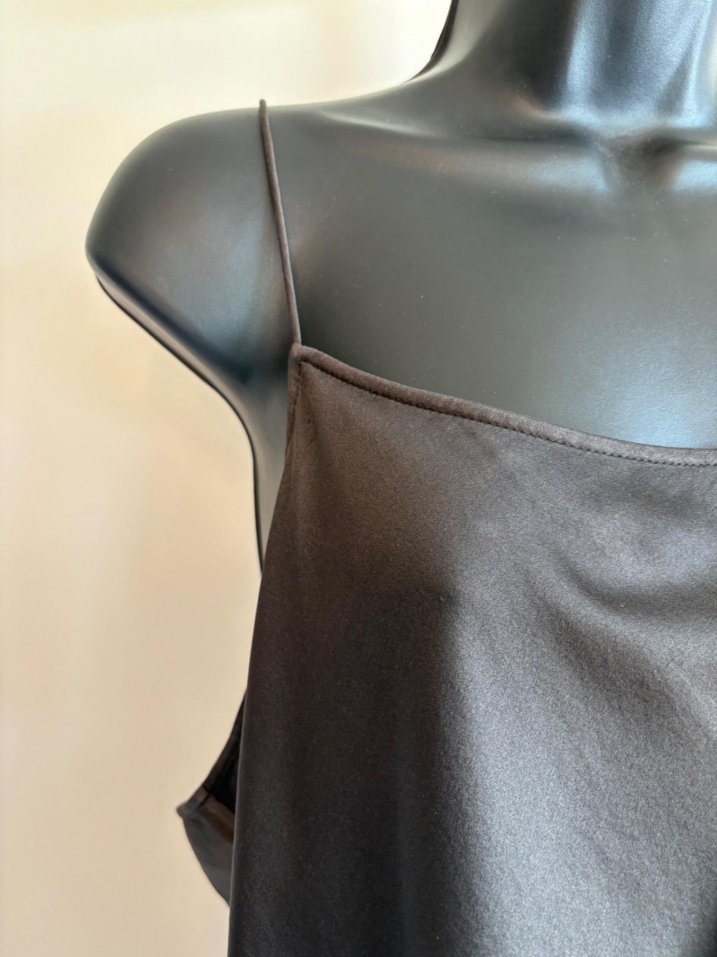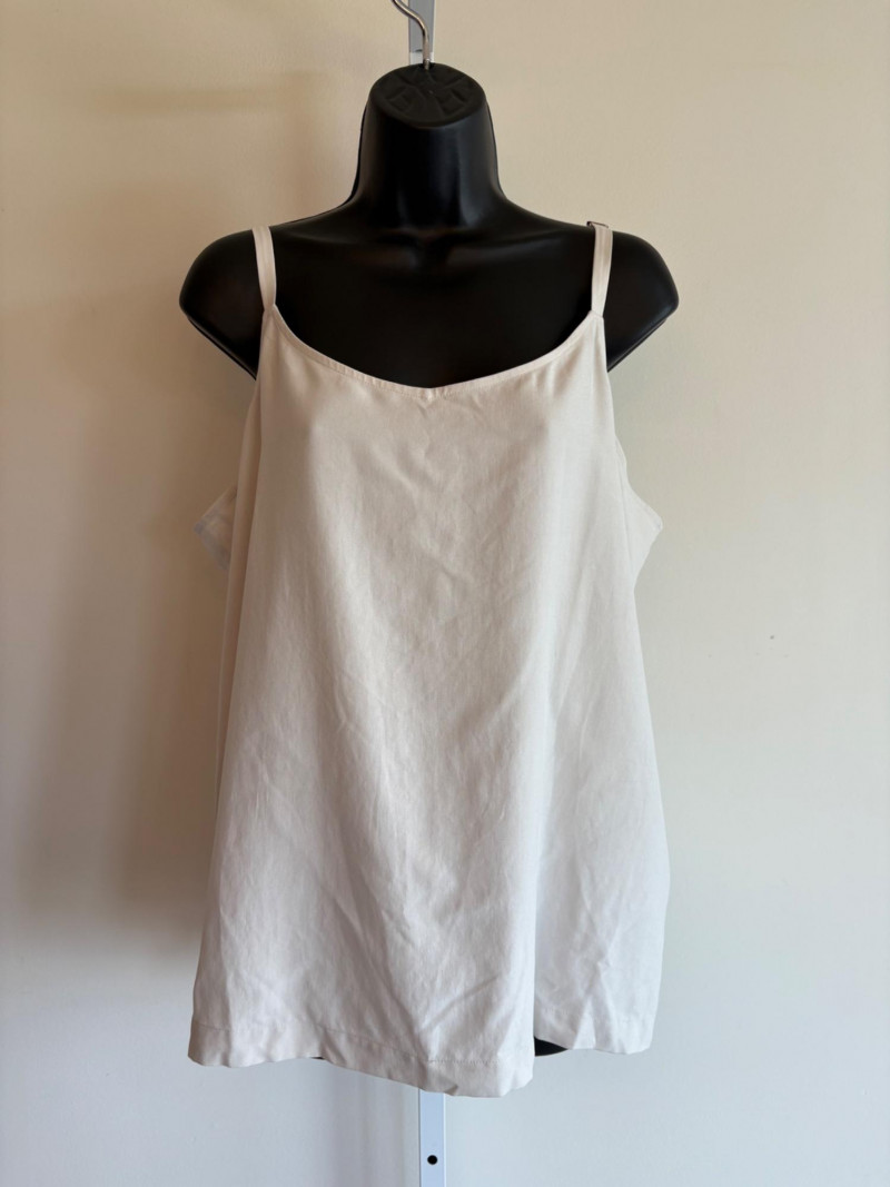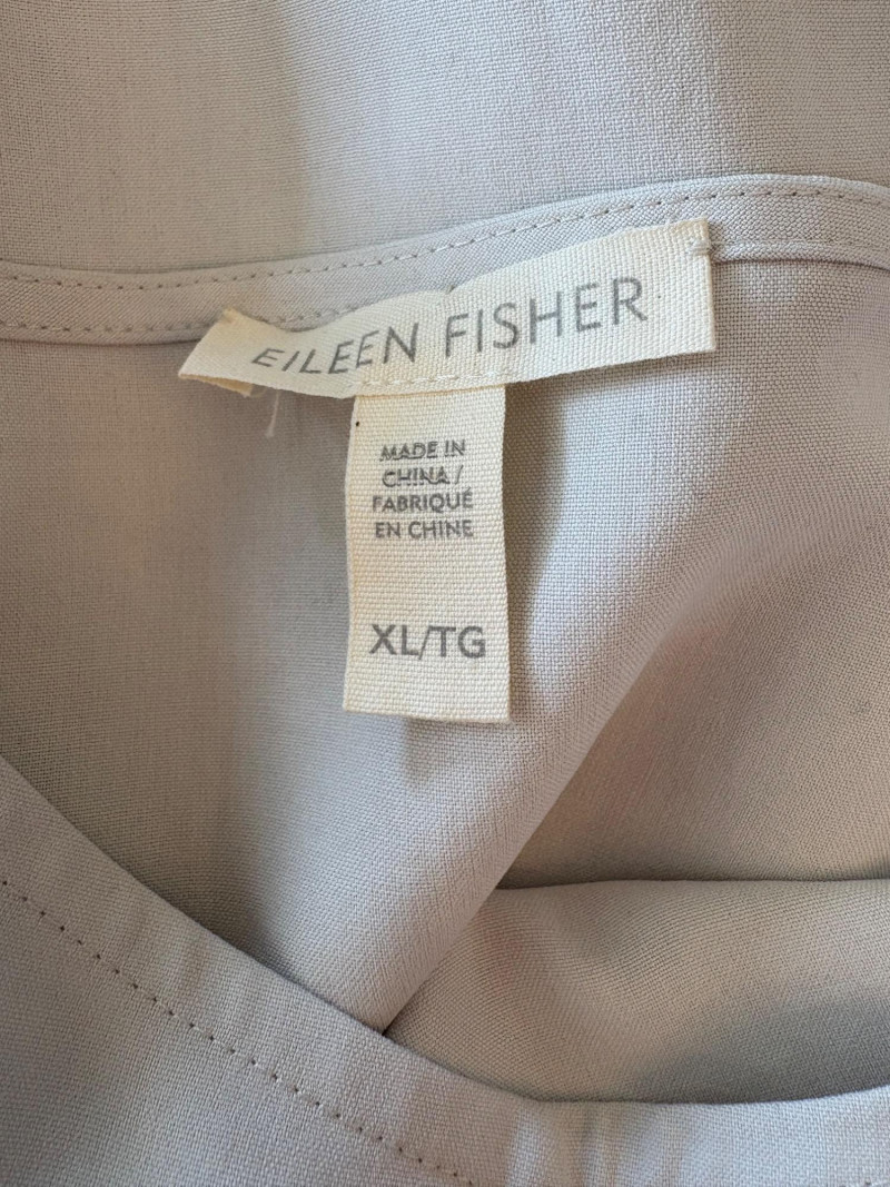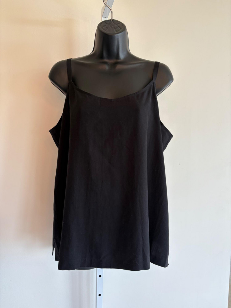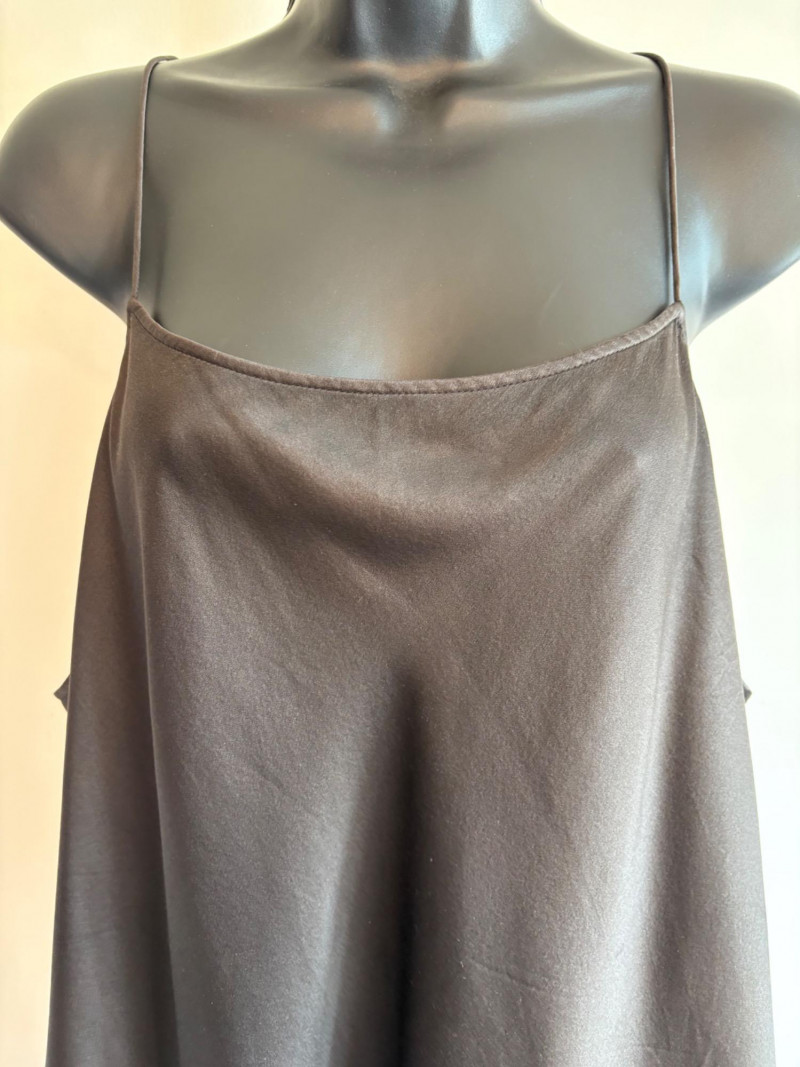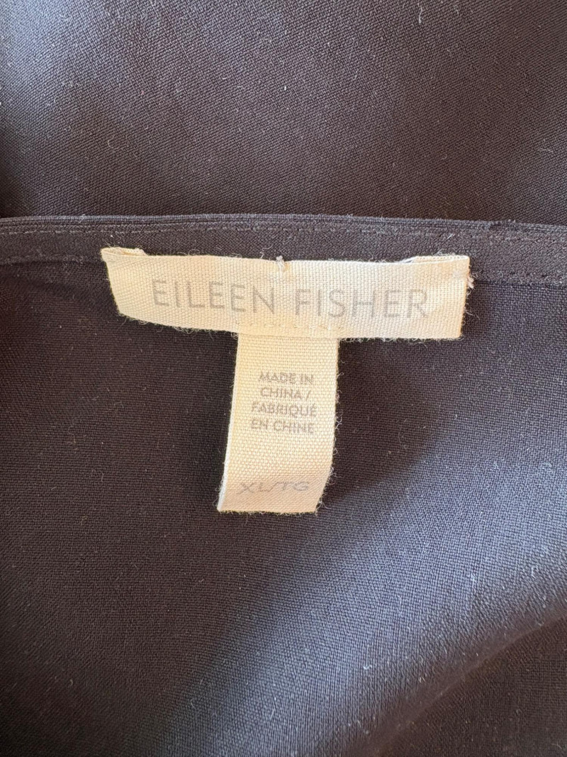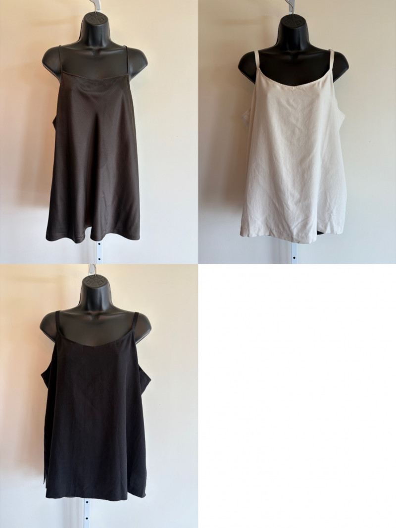 Three lovely camisoles from Eileen Fisher. All measure 22.5" pit to pit and are in excellent condition. Black & white camisoles are identical in design with curved neckline, adjustable shoulder straps, and split hem. Both are 100% silk and have size tags that say XL. Chocolate brown spaghetti strap camisole has squared back and shimmery texture. 100% silk. Measures 28" from top of shoulder strap to hem. Size tag says XL.