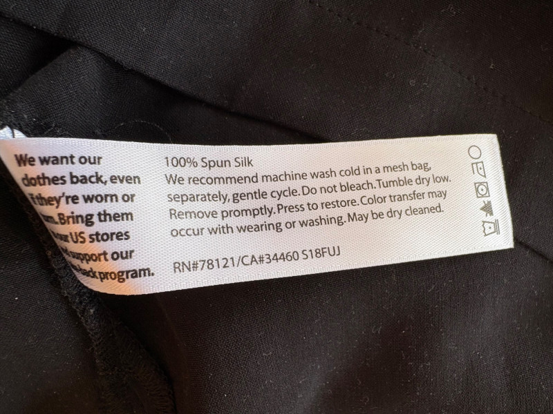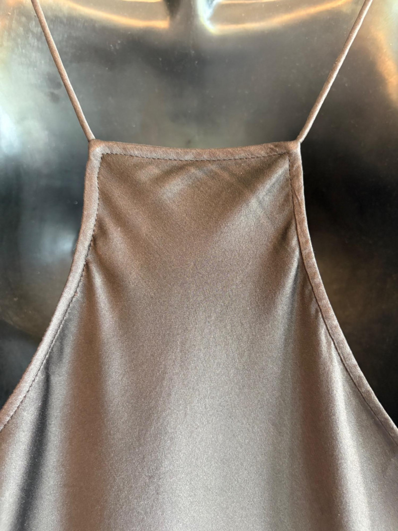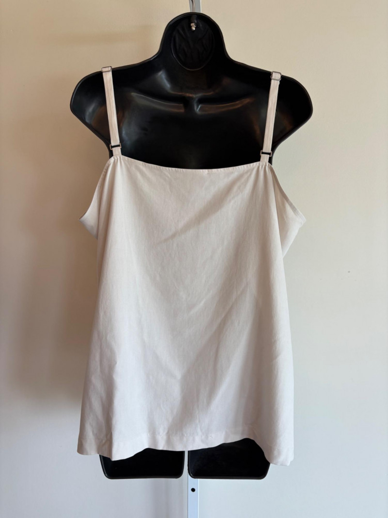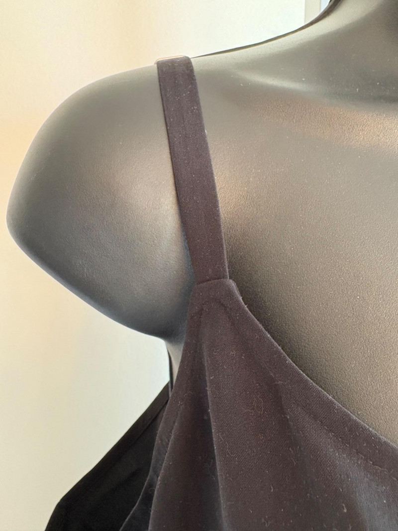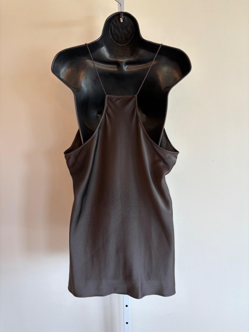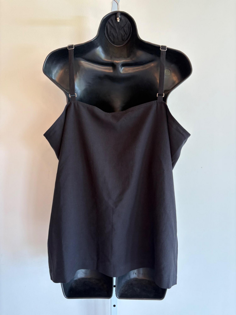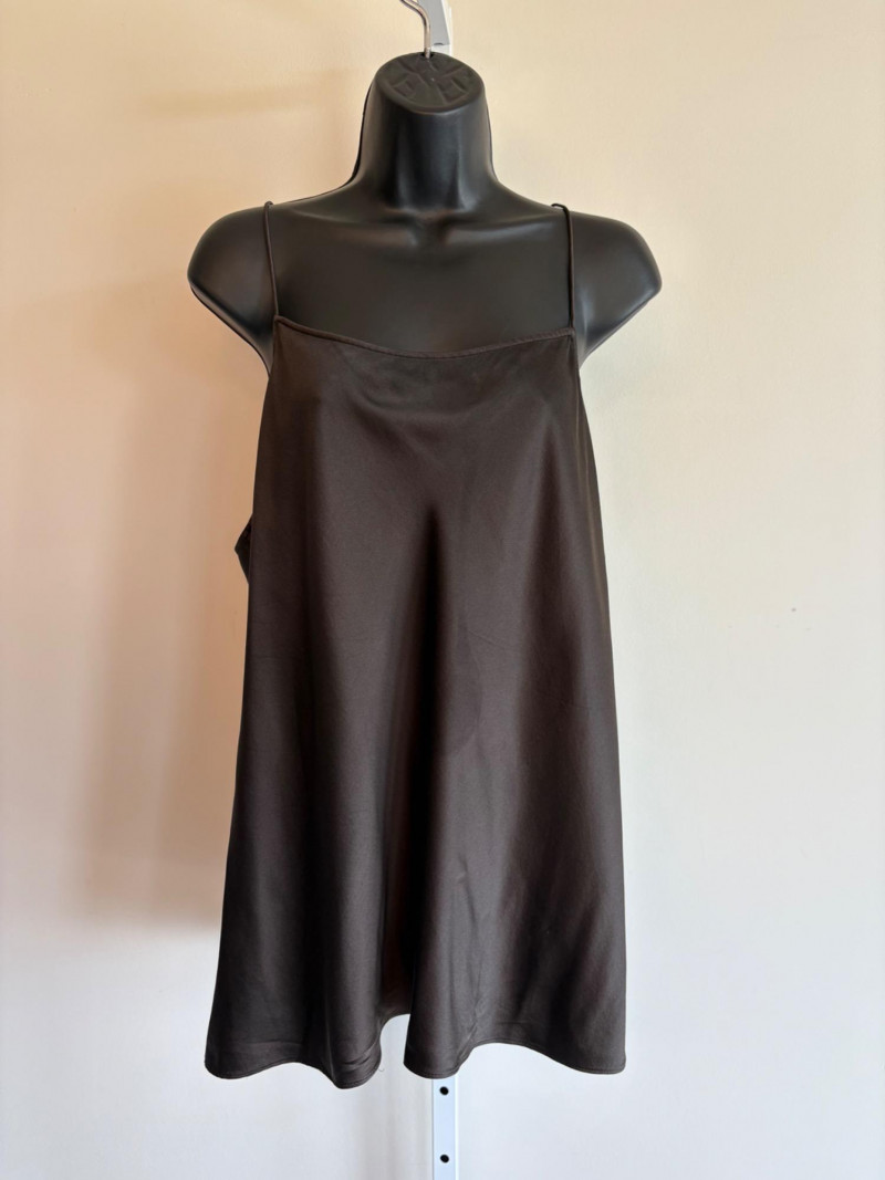 Three lovely camisoles from Eileen Fisher. All measure 22.5" pit to pit and are in excellent condition. Black & white camisoles are identical in design with curved neckline, adjustable shoulder straps, and split hem. Both are 100% silk and have size tags that say XL. Chocolate brown spaghetti strap camisole has squared back and shimmery texture. 100% silk. Measures 28" from top of shoulder strap to hem. Size tag says XL.