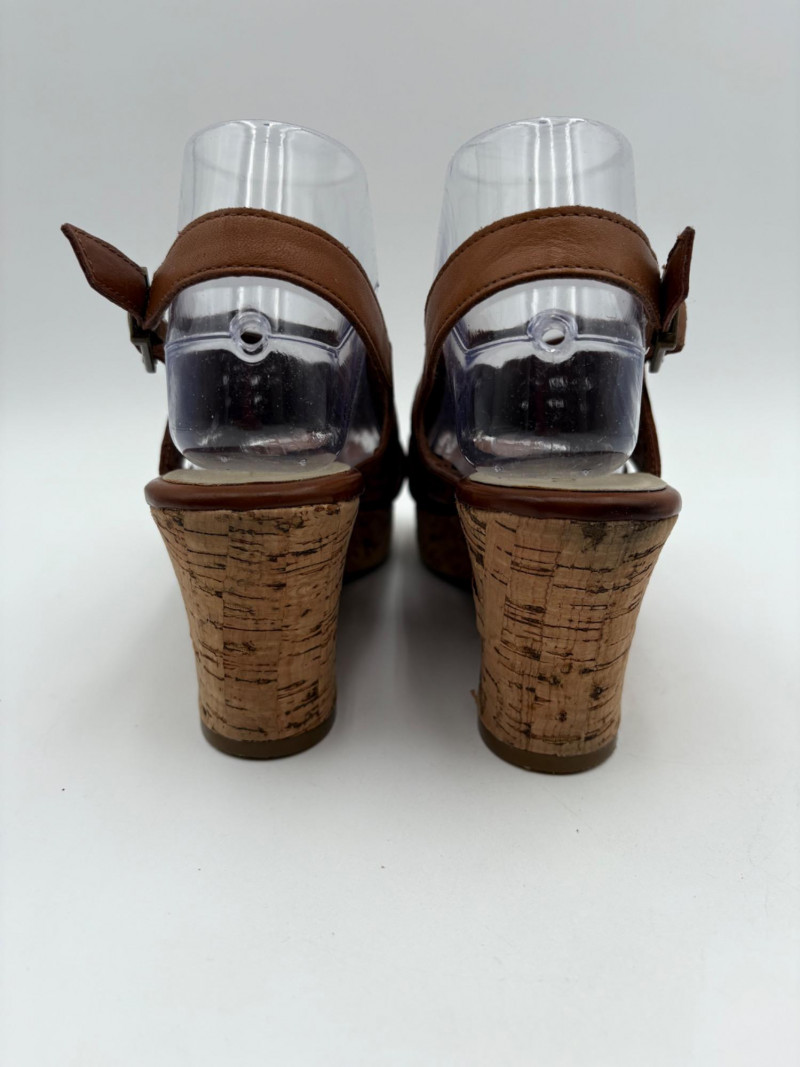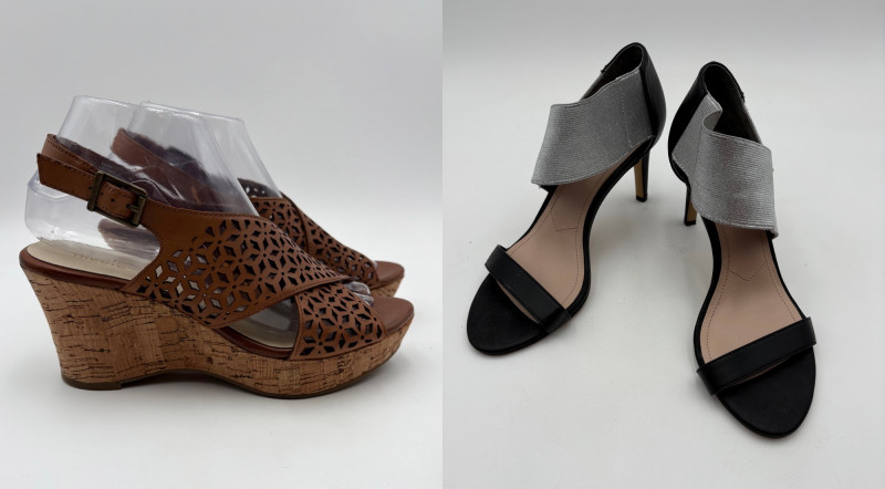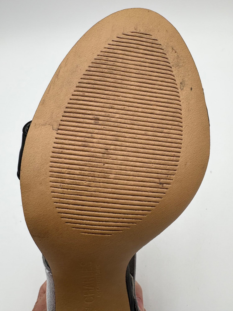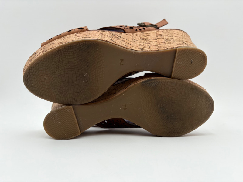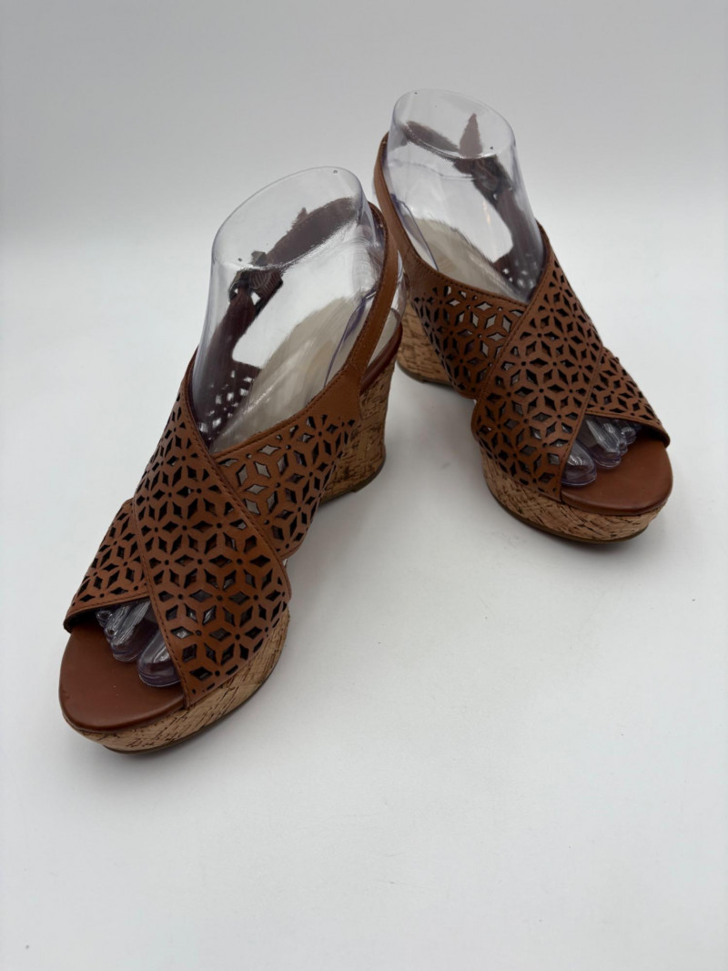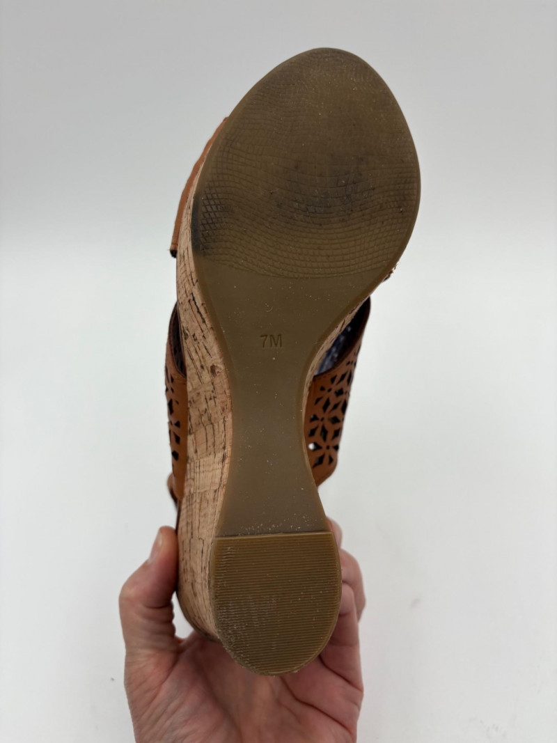 Sparkly spikes from Charles David have narrow black strap across ball of the foot and silver elasticated fabric across the top of the foot connected to a black heel. Heel height is 3" and the shoes look like new with miniscule soiling on soles and no indication of having been worn on the uppers. Size 7. Brown cork wedges from Nicole have perforated floral design on the thick leather upper wrap straps and close with a buckle on the ankle strap. Heel height is approx. 3" with a platform of about 1". In great condition - like the previous pair they look almost new with virtually no soil on either the uppers or the soles. Size 7.