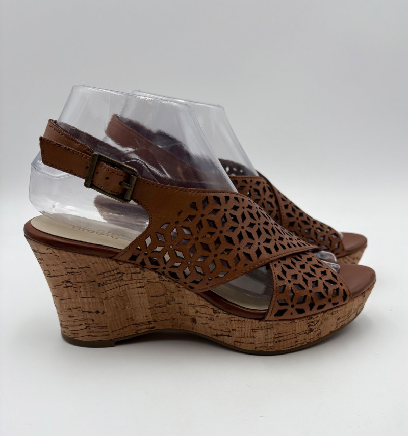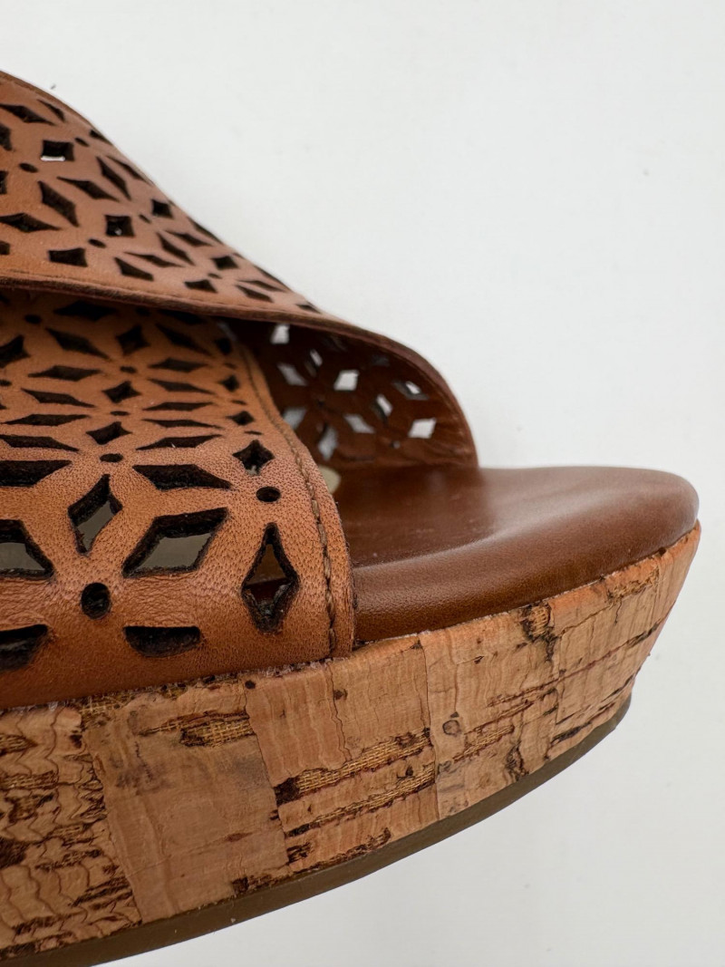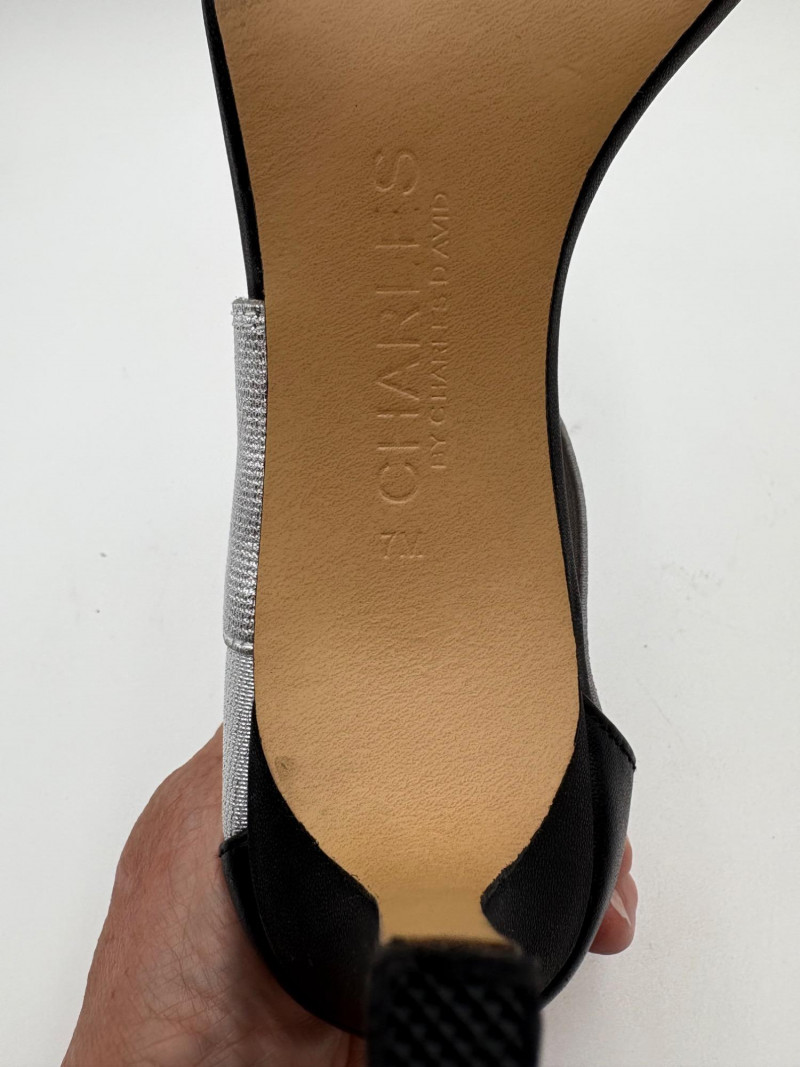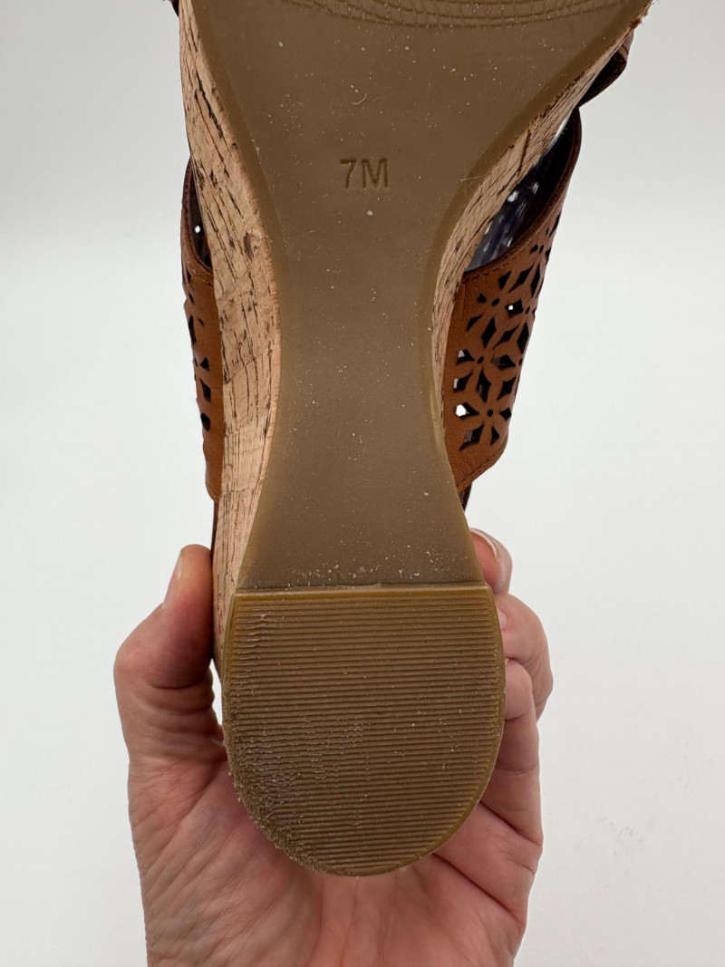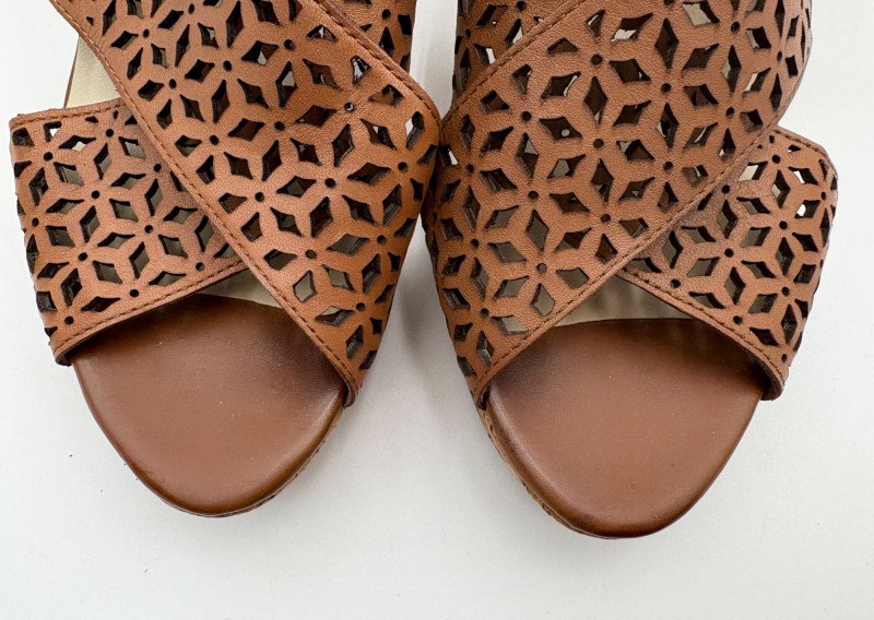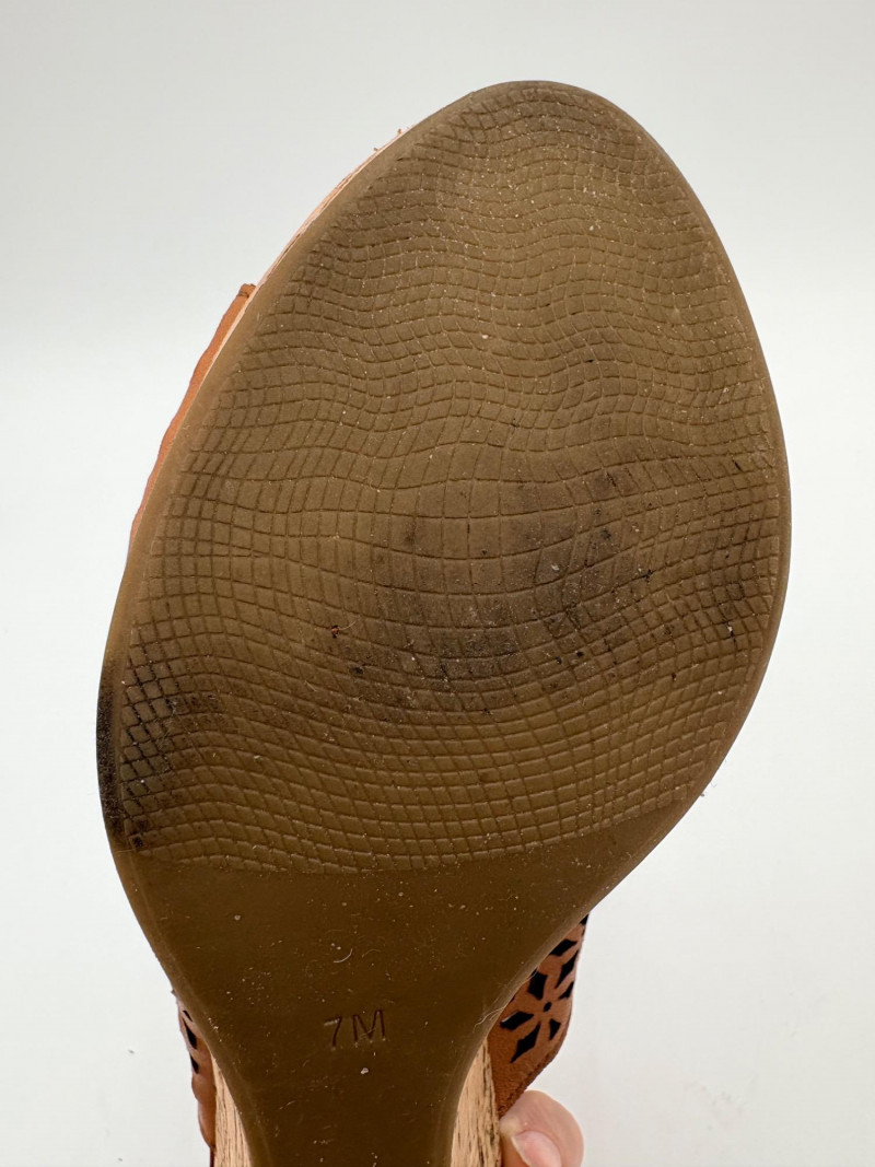 Sparkly spikes from Charles David have narrow black strap across ball of the foot and silver elasticated fabric across the top of the foot connected to a black heel. Heel height is 3" and the shoes look like new with miniscule soiling on soles and no indication of having been worn on the uppers. Size 7. Brown cork wedges from Nicole have perforated floral design on the thick leather upper wrap straps and close with a buckle on the ankle strap. Heel height is approx. 3" with a platform of about 1". In great condition - like the previous pair they look almost new with virtually no soil on either the uppers or the soles. Size 7.