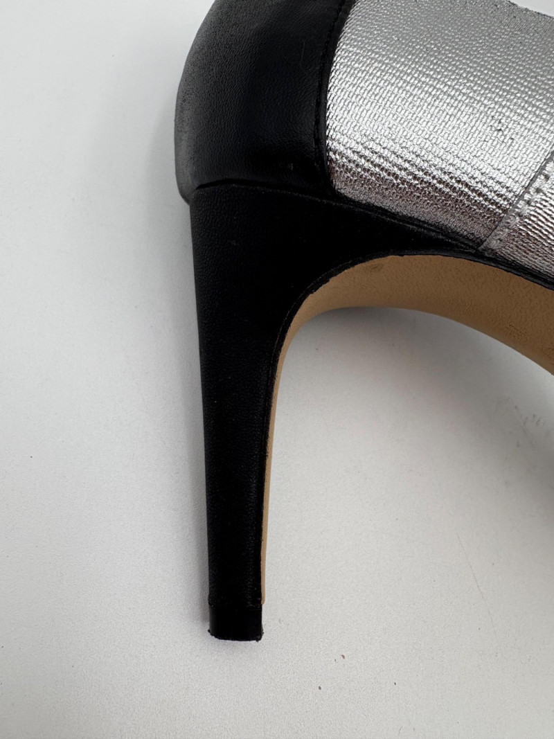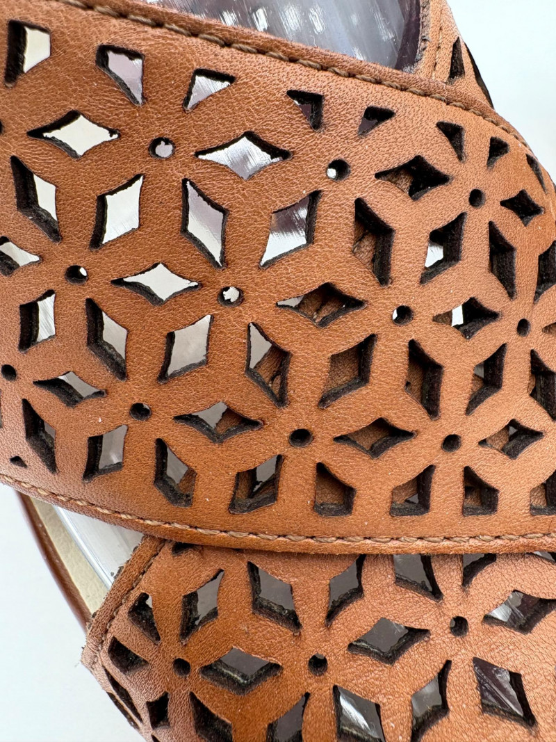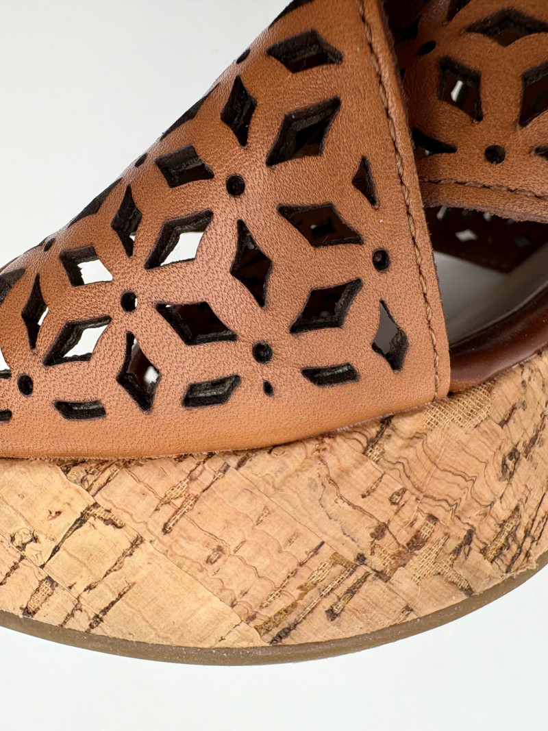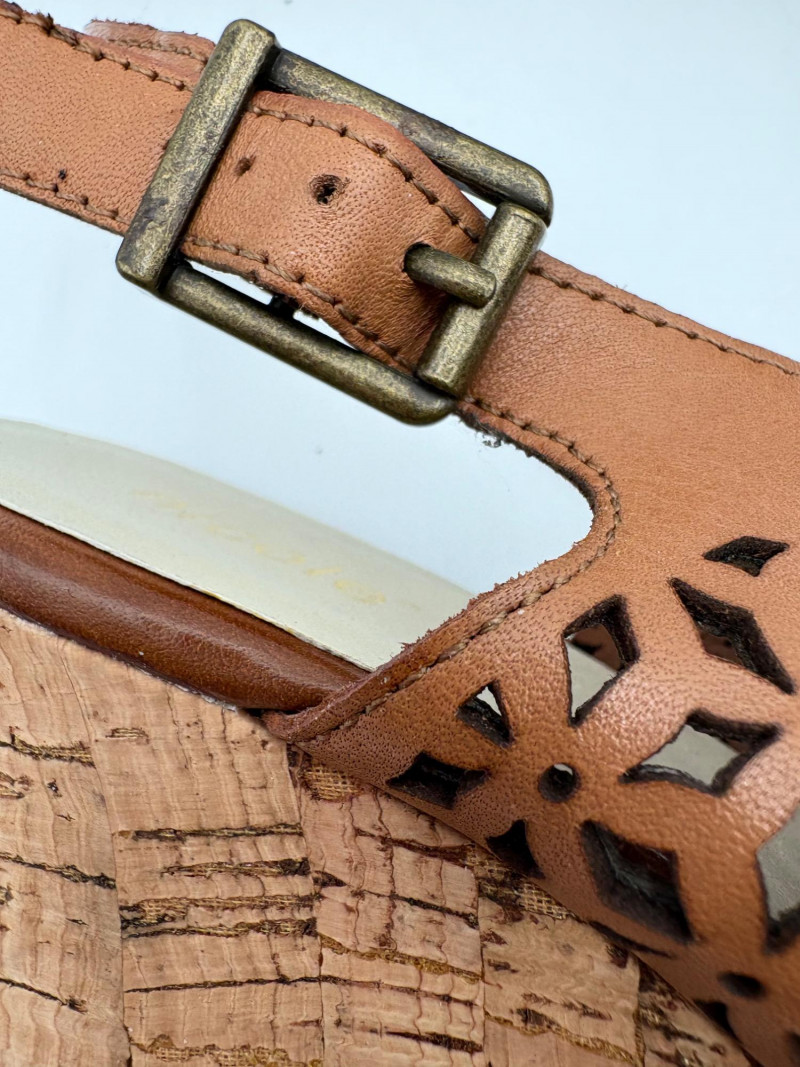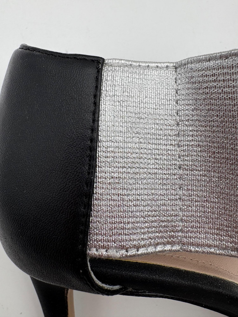 Sparkly spikes from Charles David have narrow black strap across ball of the foot and silver elasticated fabric across the top of the foot connected to a black heel. Heel height is 3" and the shoes look like new with miniscule soiling on soles and no indication of having been worn on the uppers. Size 7. Brown cork wedges from Nicole have perforated floral design on the thick leather upper wrap straps and close with a buckle on the ankle strap. Heel height is approx. 3" with a platform of about 1". In great condition - like the previous pair they look almost new with virtually no soil on either the uppers or the soles. Size 7.