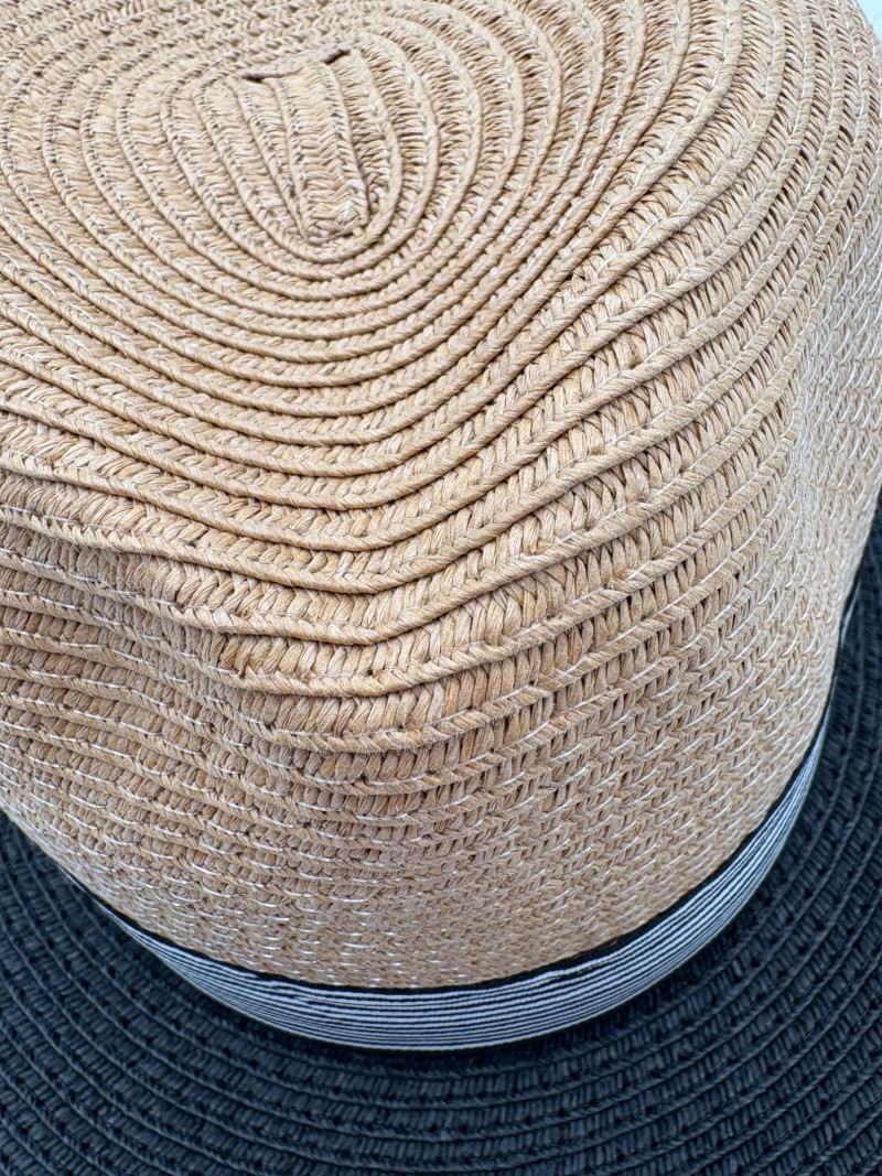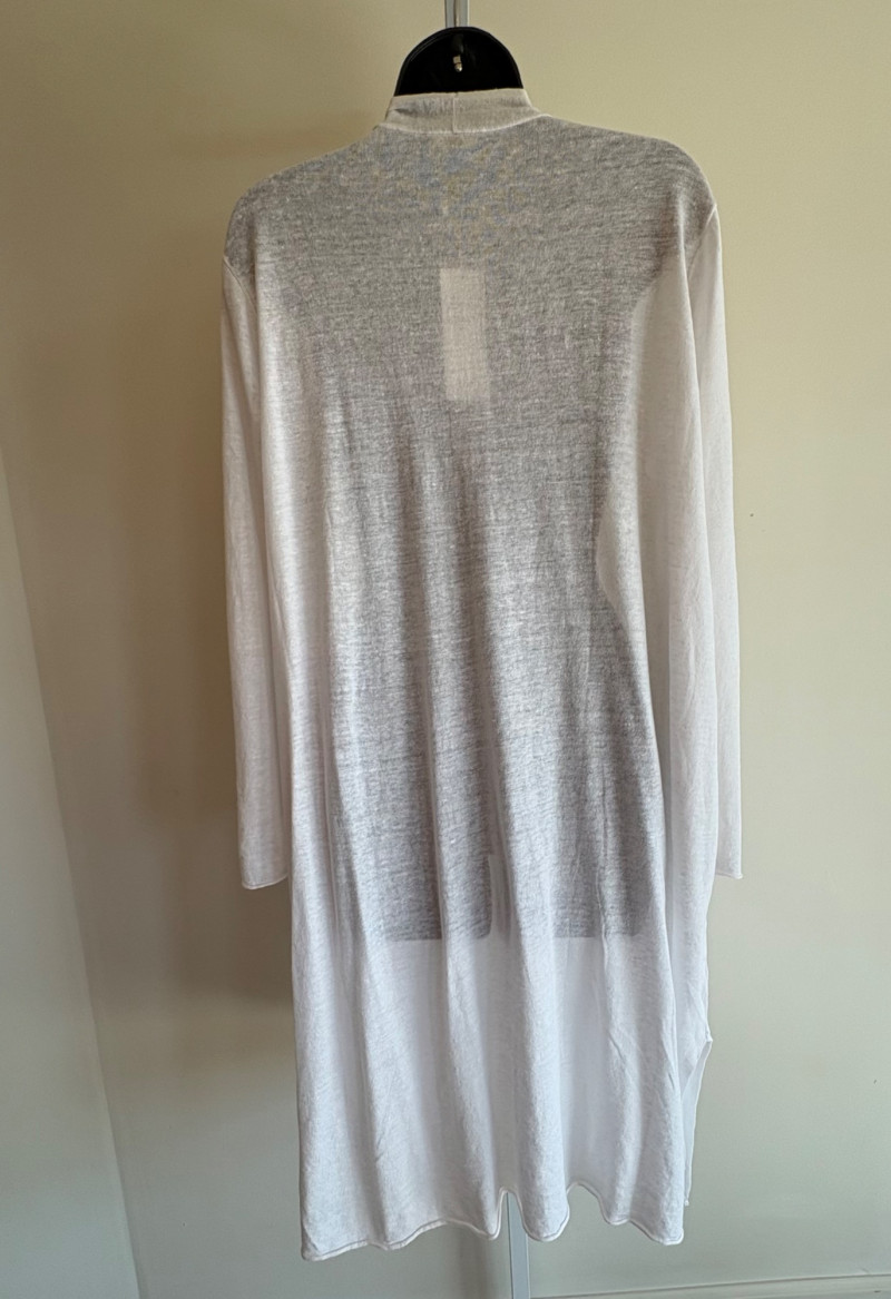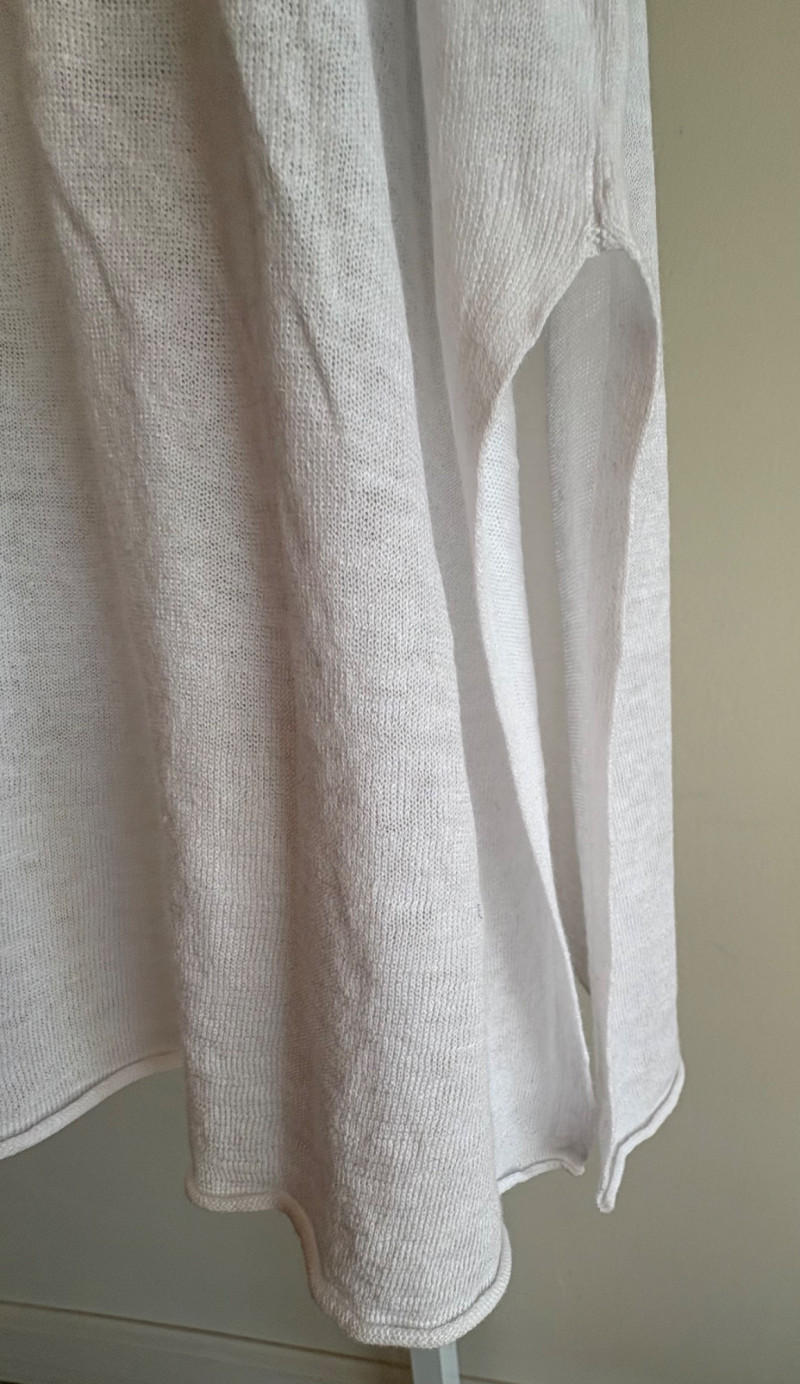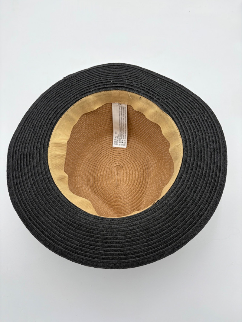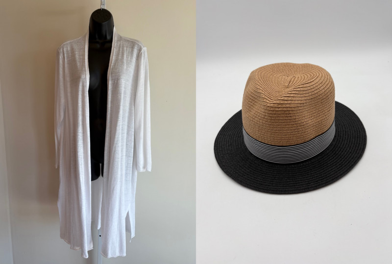 Super light knit duster is the perfect layer to give some protection from the sun without adding any weight to an outfit. This all-white piece has long sleeves, deep split hem, and open front with patch pockets. New with tag. 68% organic linen with 42% organic cotton. Measures 24" pit to pit (but could fit larger since it is open) and 40" from back neckline to bottom hem. 68% organic linen with 42% organic cotton. Size tag says 1X. Lightweight black & natural hat with black & white ribbon is made of "Paper Yarn" and has a brim just wide enough to protect from the sun without flopping around & getting int he way. No maker mark or size.