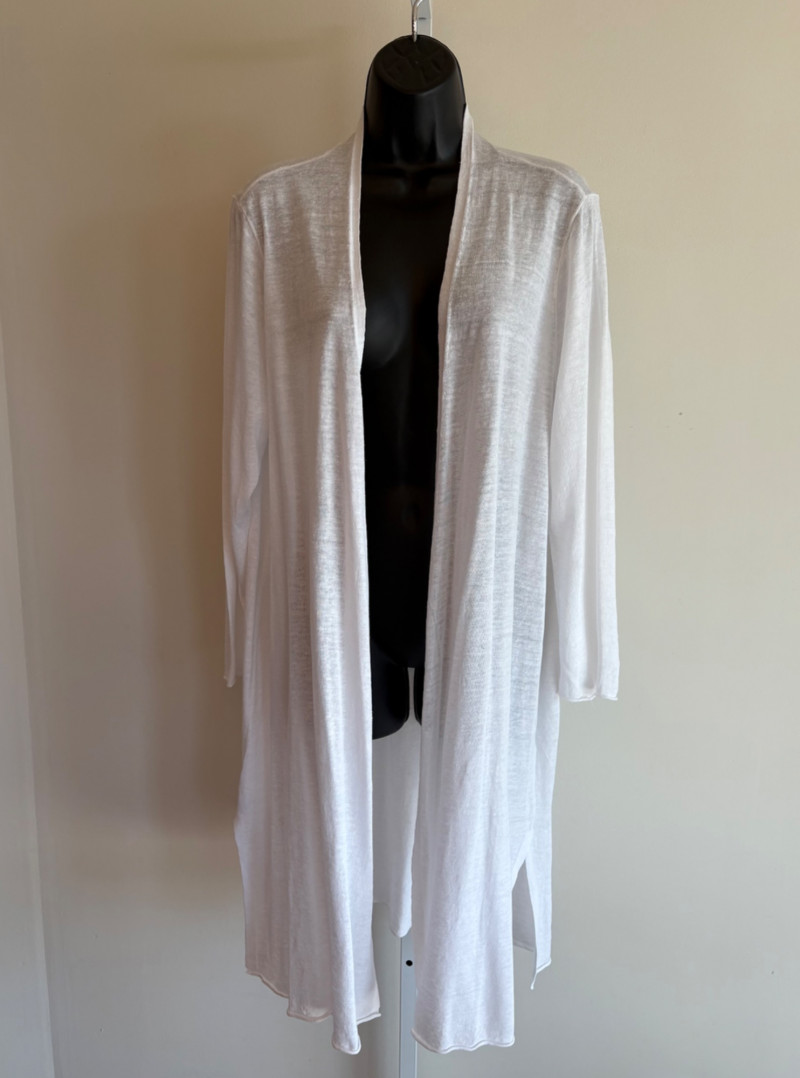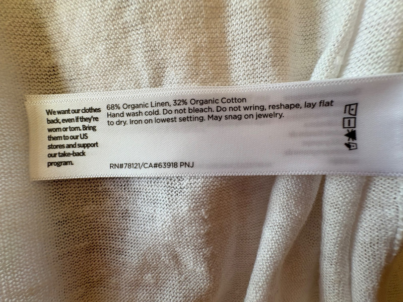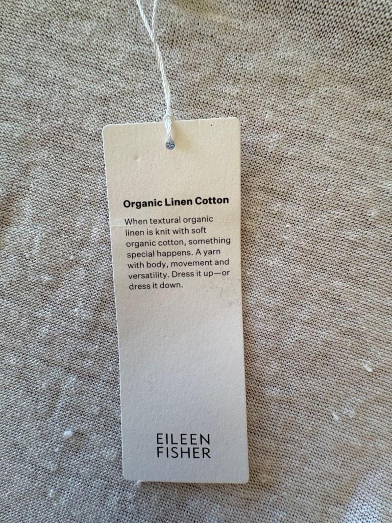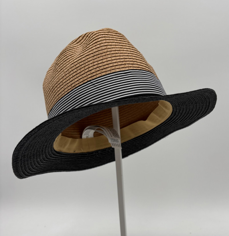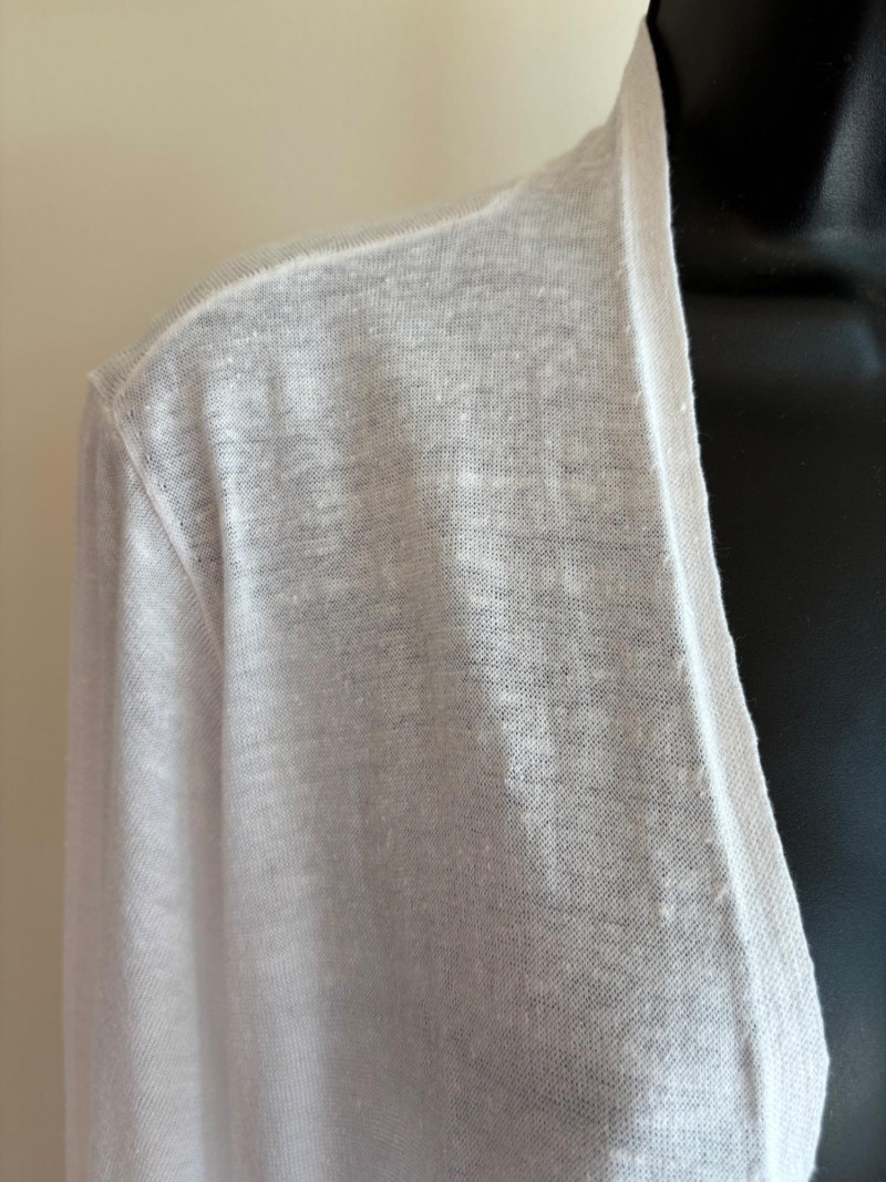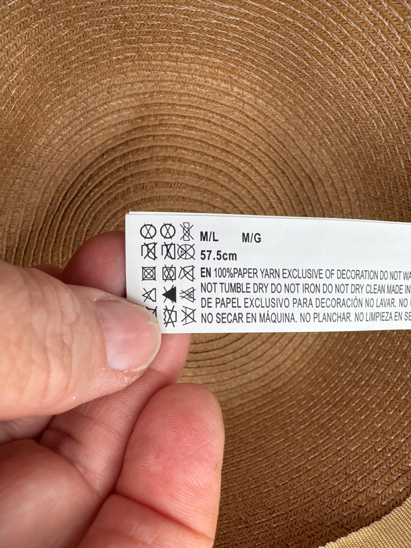 Super light knit duster is the perfect layer to give some protection from the sun without adding any weight to an outfit. This all-white piece has long sleeves, deep split hem, and open front with patch pockets. New with tag. 68% organic linen with 42% organic cotton. Measures 24" pit to pit (but could fit larger since it is open) and 40" from back neckline to bottom hem. 68% organic linen with 42% organic cotton. Size tag says 1X. Lightweight black & natural hat with black & white ribbon is made of "Paper Yarn" and has a brim just wide enough to protect from the sun without flopping around & getting int he way. No maker mark or size.