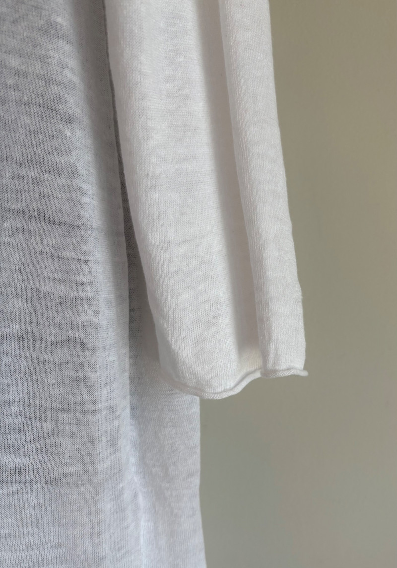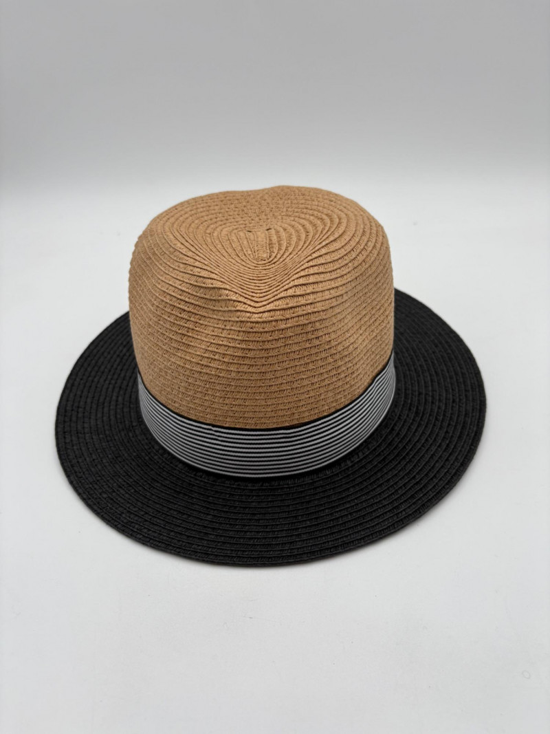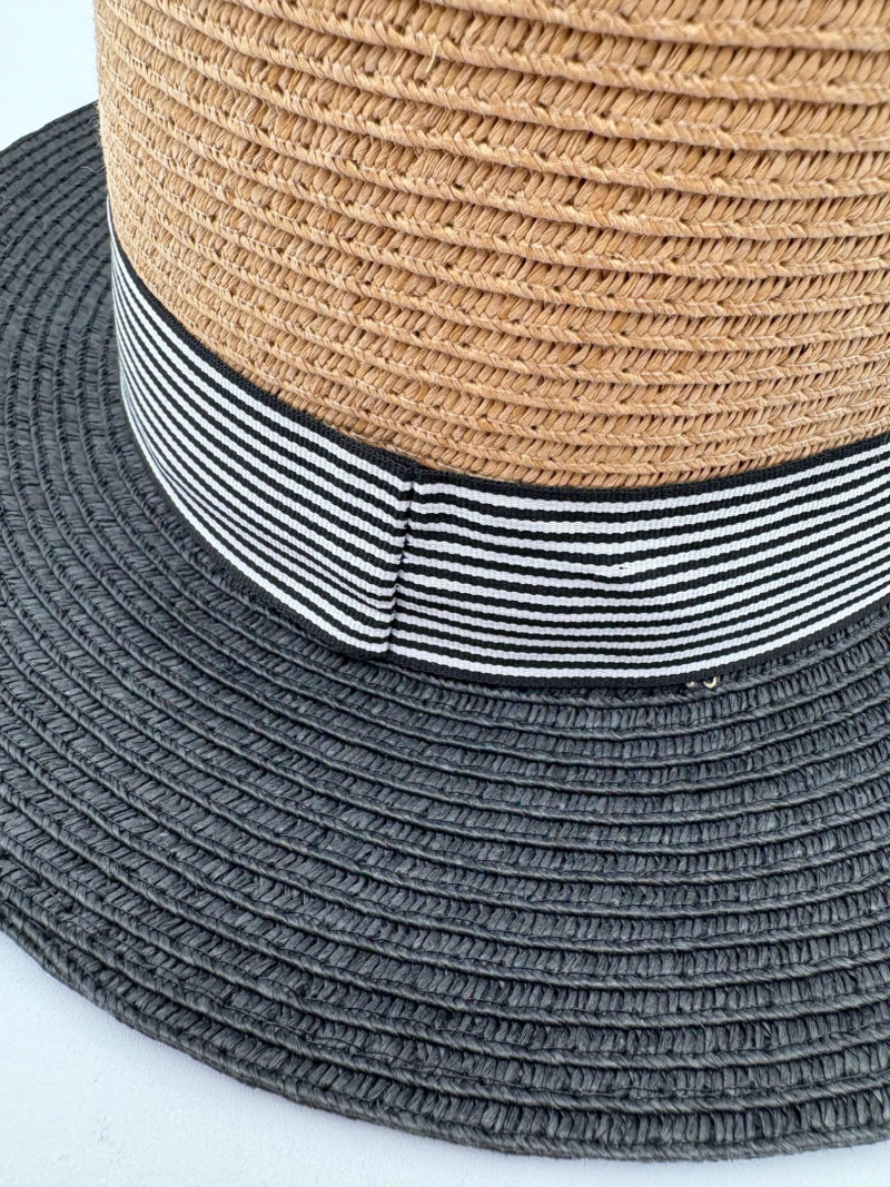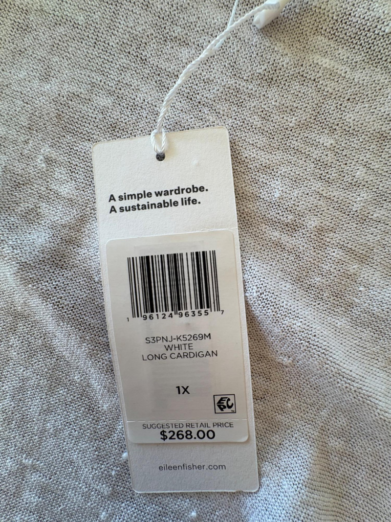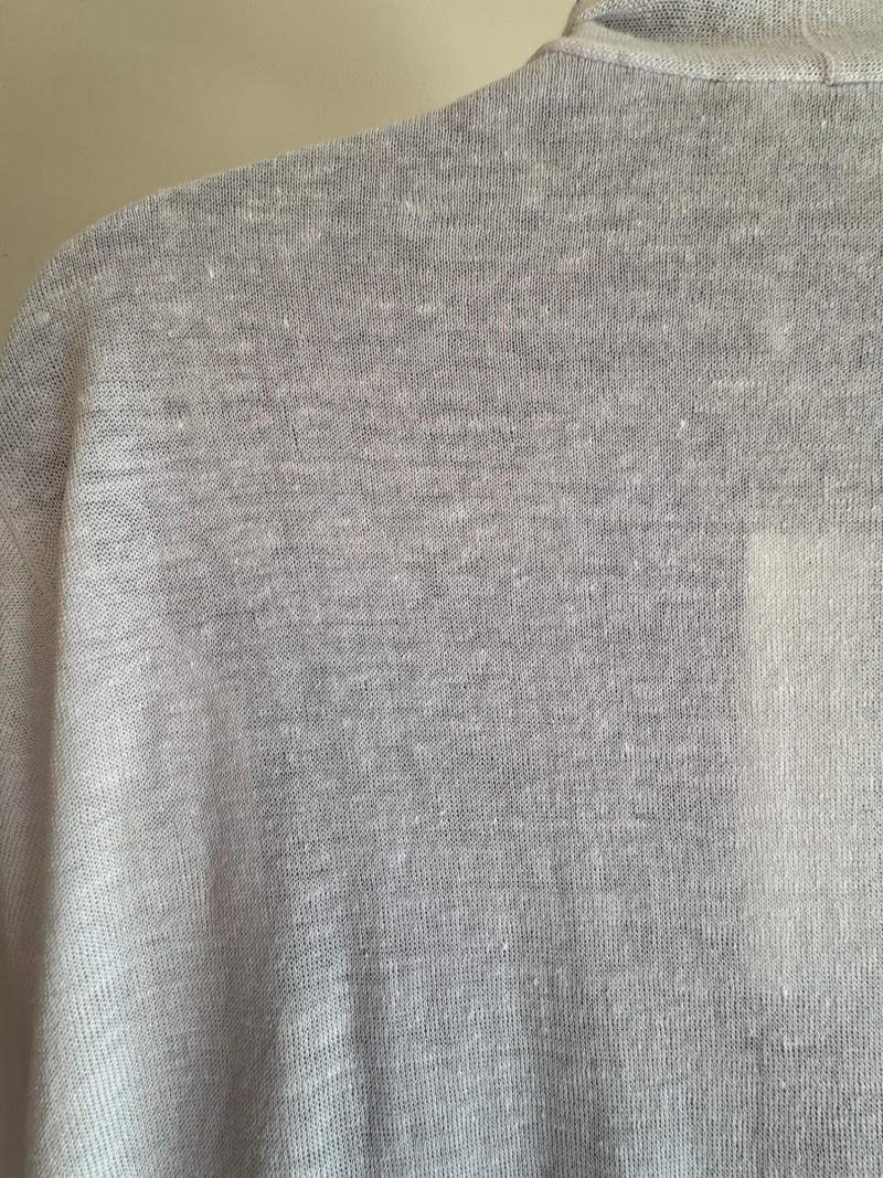 Super light knit duster is the perfect layer to give some protection from the sun without adding any weight to an outfit. This all-white piece has long sleeves, deep split hem, and open front with patch pockets. New with tag. 68% organic linen with 42% organic cotton. Measures 24" pit to pit (but could fit larger since it is open) and 40" from back neckline to bottom hem. 68% organic linen with 42% organic cotton. Size tag says 1X. Lightweight black & natural hat with black & white ribbon is made of "Paper Yarn" and has a brim just wide enough to protect from the sun without flopping around & getting int he way. No maker mark or size.