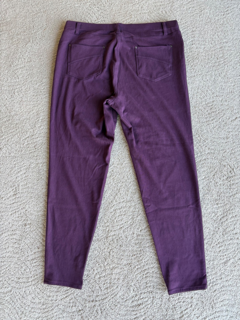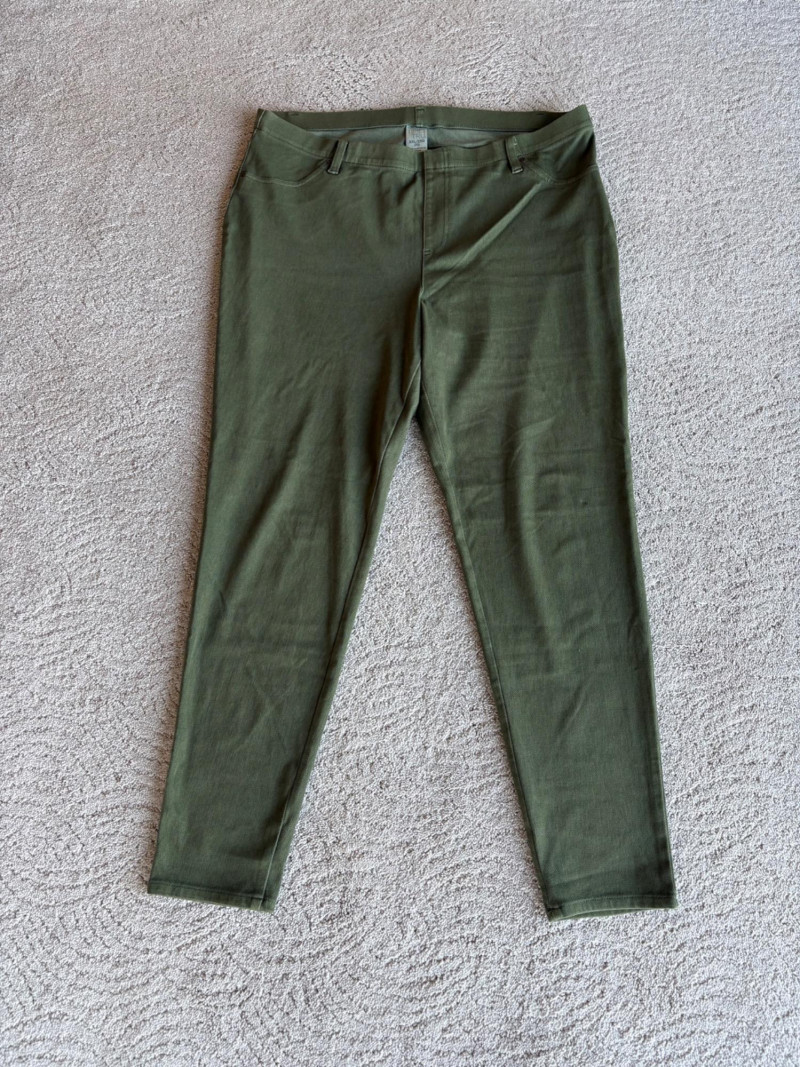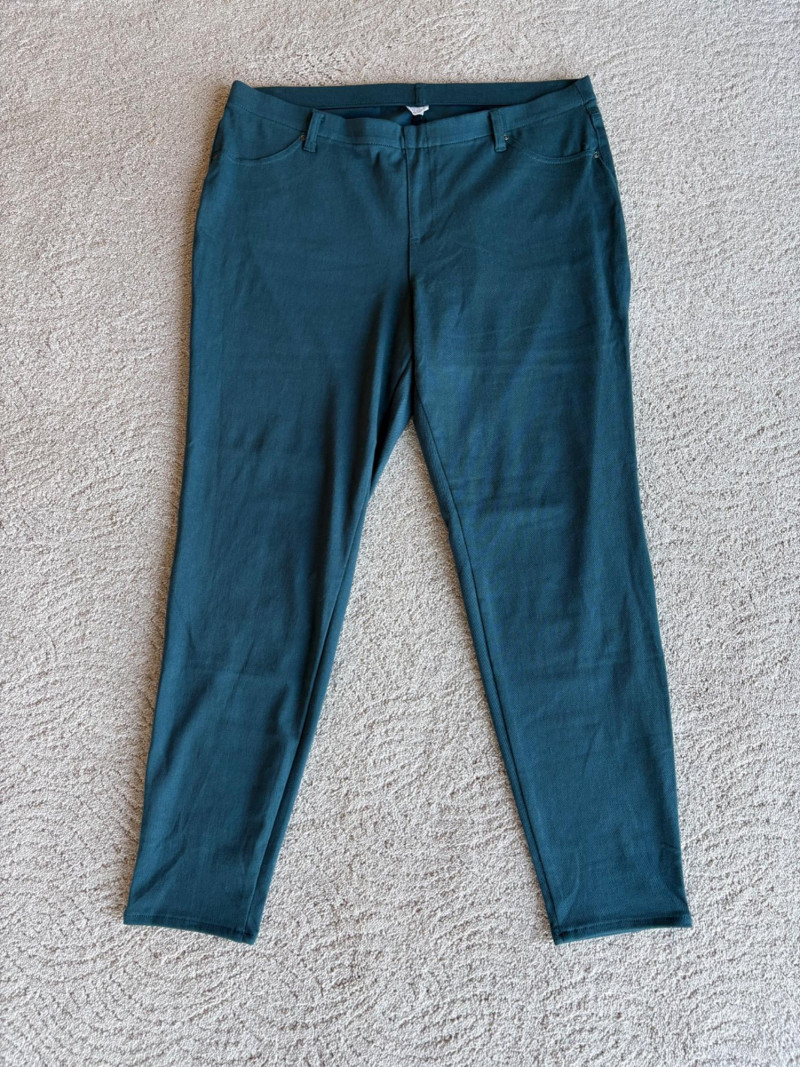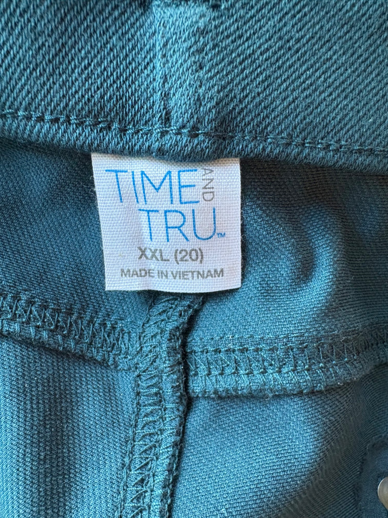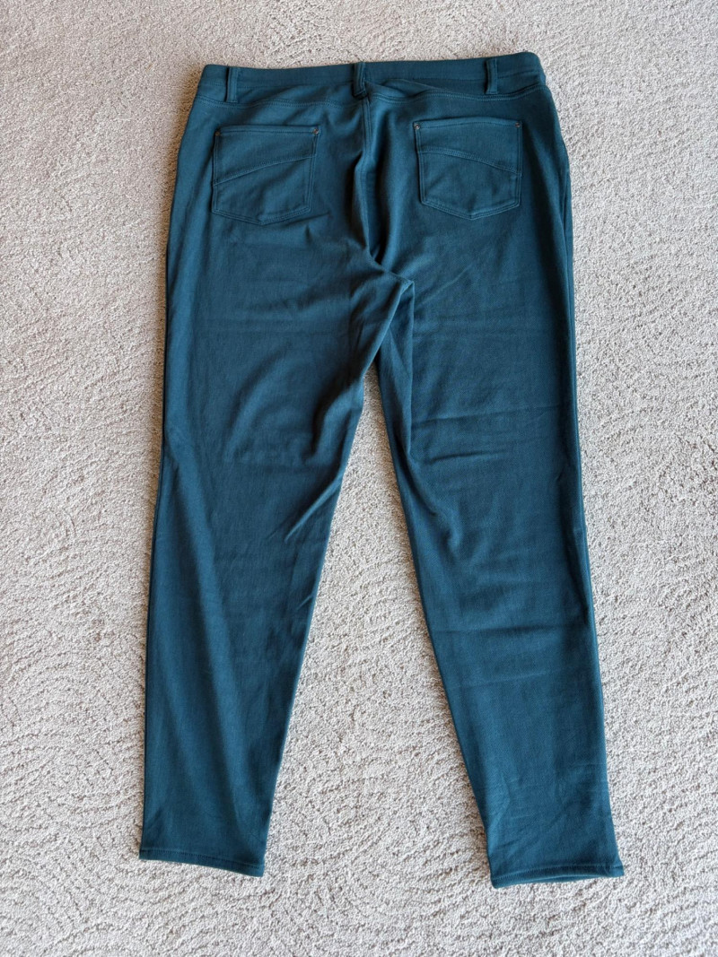 Three pairs of “jeggings” that truly resemble jeans in style, but are super comfortable and stretchy like leggings. All are from Time and True in shades of eggplant, olive green, and teal/blue and in excellent condition. All measure 18.5" side to side at the waist and have a 28" or 28.5" inseam. 56% cotton with 37% polyester and 7% spandex. Size tags all say XXL (20).