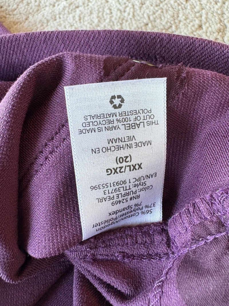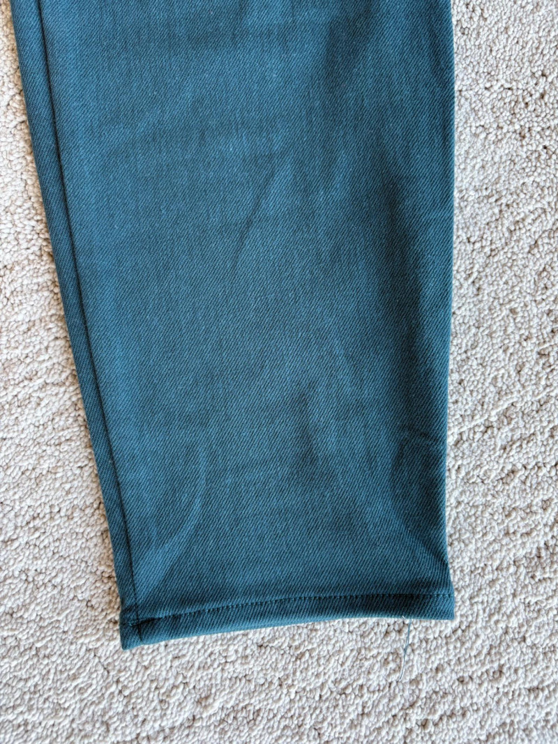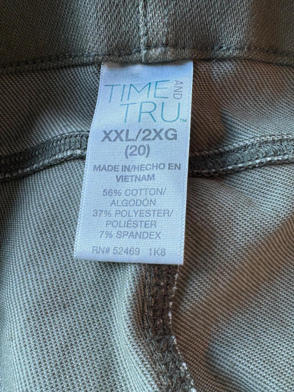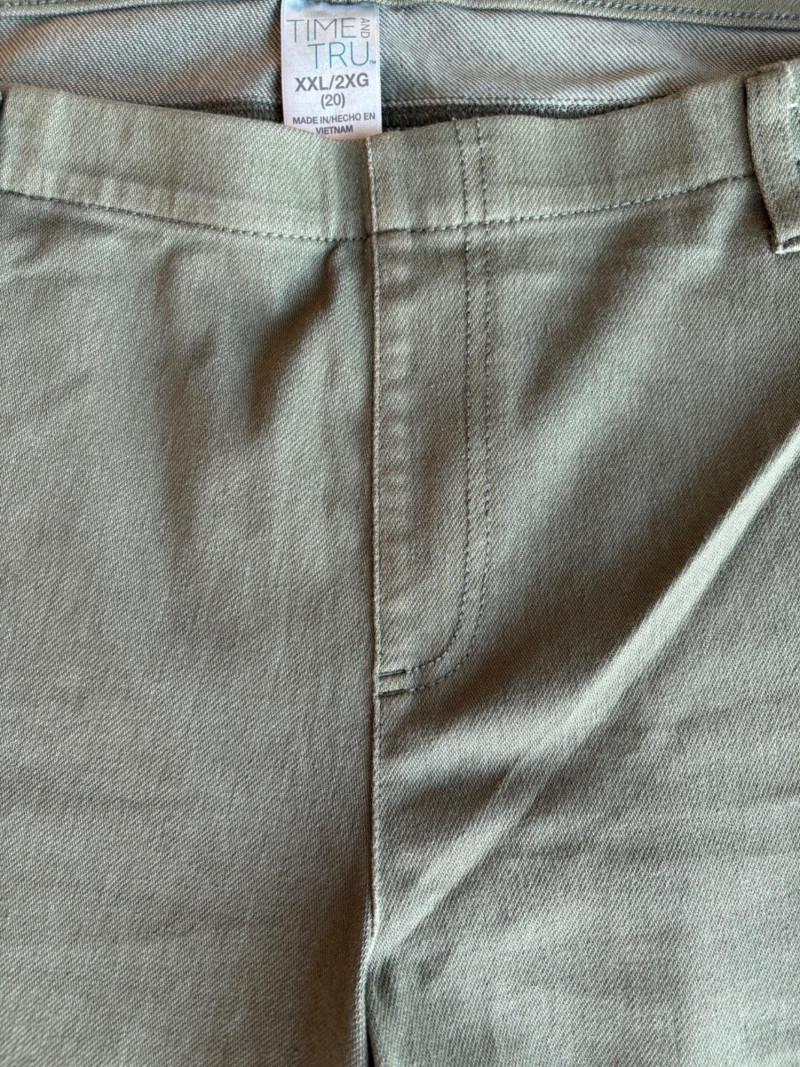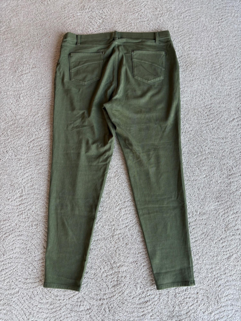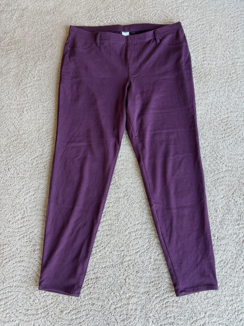 Three pairs of “jeggings” that truly resemble jeans in style, but are super comfortable and stretchy like leggings. All are from Time and True in shades of eggplant, olive green, and teal/blue and in excellent condition. All measure 18.5" side to side at the waist and have a 28" or 28.5" inseam. 56% cotton with 37% polyester and 7% spandex. Size tags all say XXL (20).