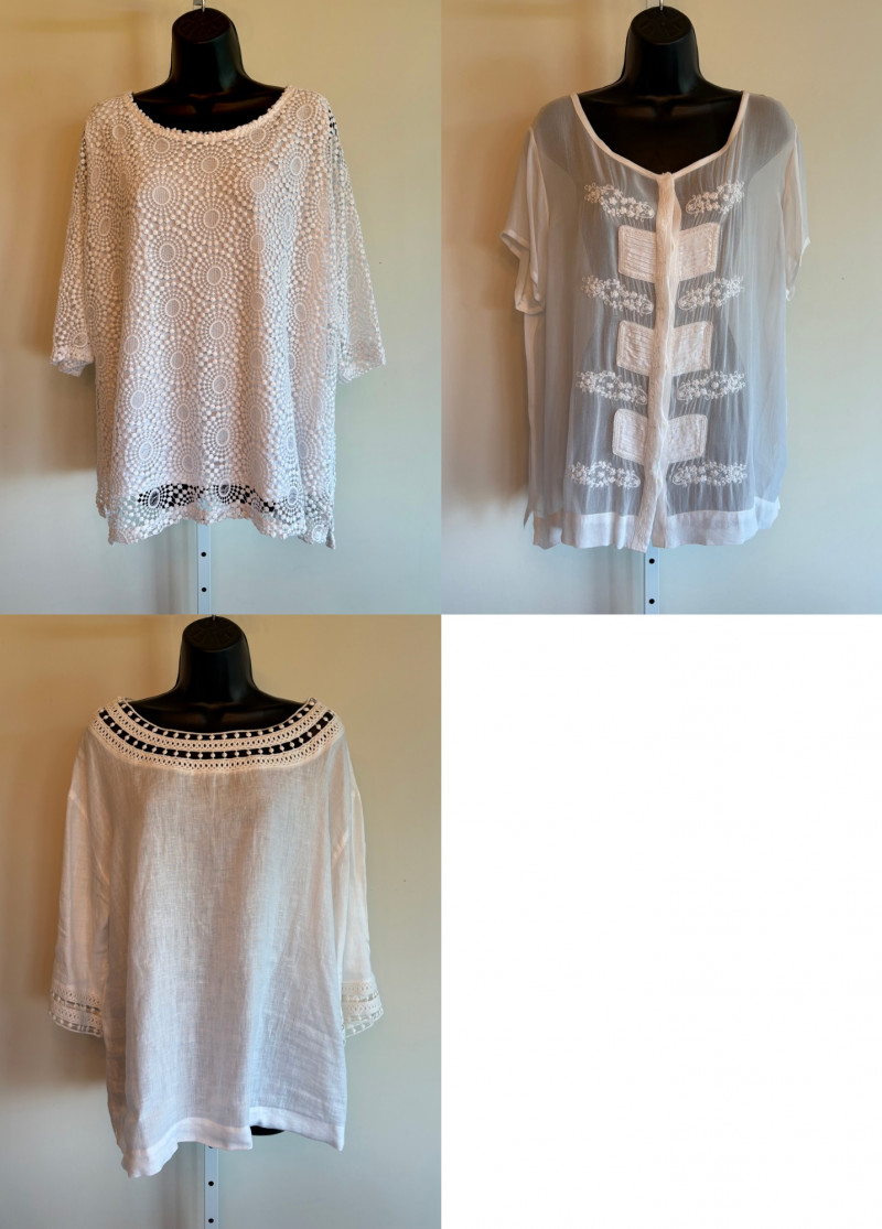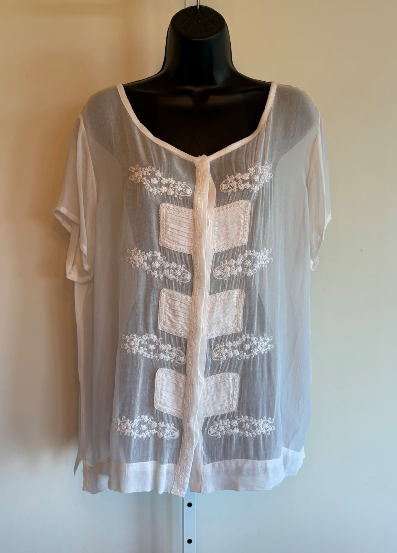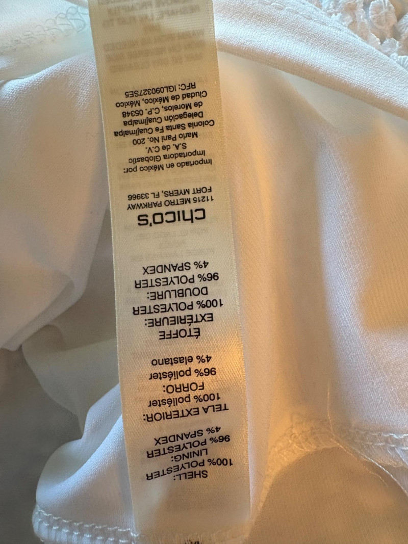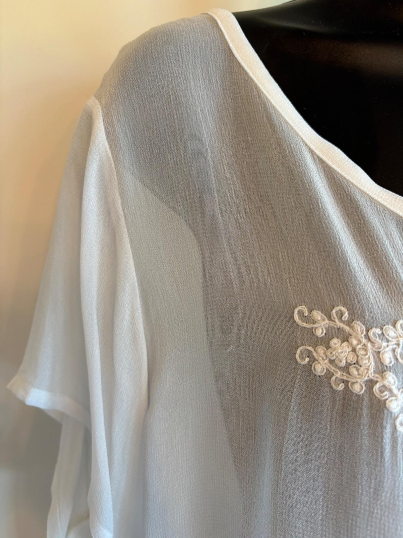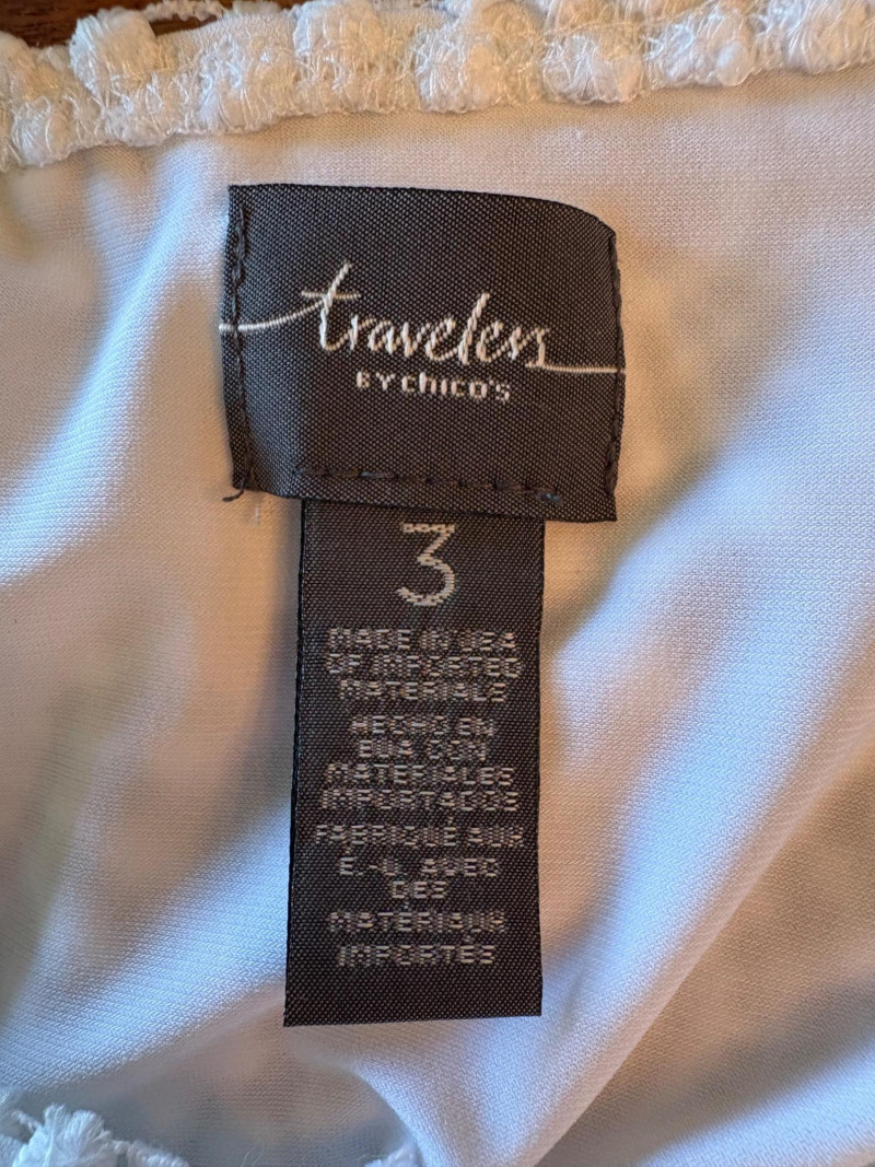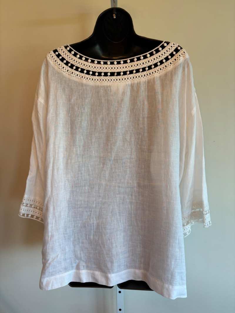 Trio of white on white tops that with details that provide interest but allow you to mix with any other color coordinate. Open border top from J. Jill has matching soft border on 3/4 sleeves, curved neckline, and small split hem. In excellent condition. 100% linen. Measures 25.5" pit to pit and 25" from back neckline to bottom hem. Size tag says XL. Filmy embroidered and appliqued top from One Fine Day has curved neckline, short sleeves, split hem, and hidden placket front button closure. Lots of embroidery & applique on the front with gathers along the back neckline. In very good used condition - there is a small snag on the front panel - see last photo, 100% rayon. Measures 24.5" pit to pit and 25" from shoulder to back hem. Size tag says L. Circle overlay top from Chico's has attached inner white shell with intricate white circle patterned overlay, curved neckline, split hem, and 3/4 sleeves. In excellent condition. Overlay is 100% polyester while inside shell is polyester & spandex blend. Measures 23.5" pit to pit and 27" from back neckline to bottom hem. Size tag says 3.