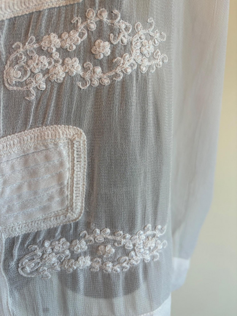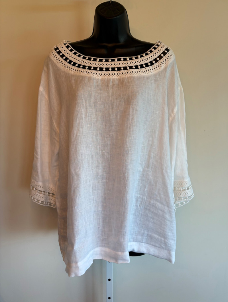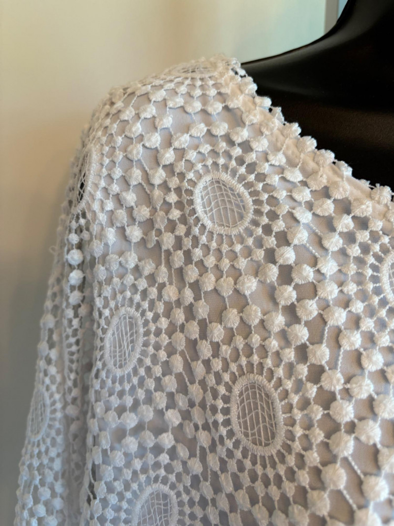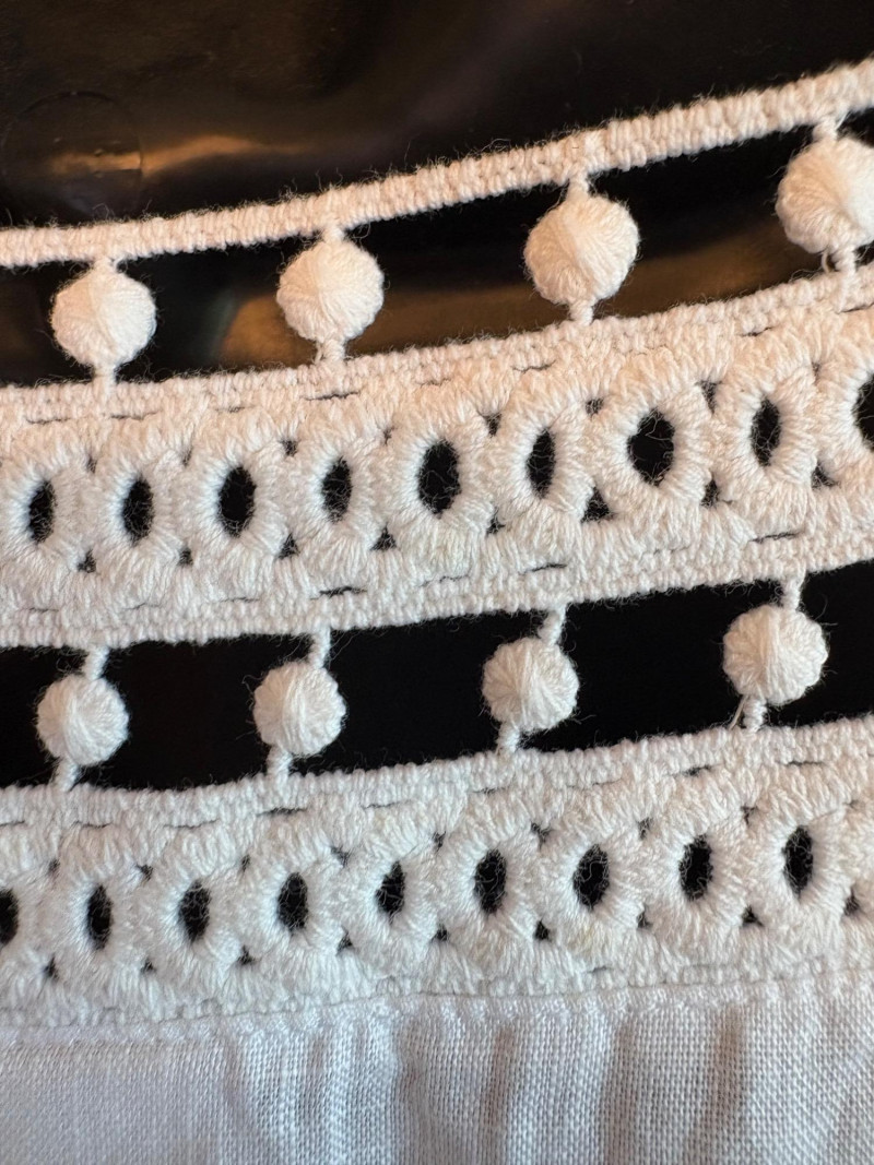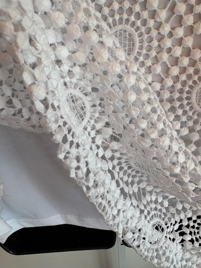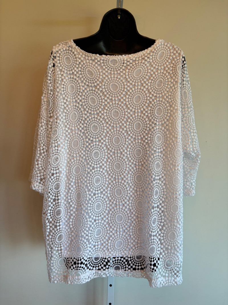 Trio of white on white tops that with details that provide interest but allow you to mix with any other color coordinate. Open border top from J. Jill has matching soft border on 3/4 sleeves, curved neckline, and small split hem. In excellent condition. 100% linen. Measures 25.5" pit to pit and 25" from back neckline to bottom hem. Size tag says XL. Filmy embroidered and appliqued top from One Fine Day has curved neckline, short sleeves, split hem, and hidden placket front button closure. Lots of embroidery & applique on the front with gathers along the back neckline. In very good used condition - there is a small snag on the front panel - see last photo, 100% rayon. Measures 24.5" pit to pit and 25" from shoulder to back hem. Size tag says L. Circle overlay top from Chico's has attached inner white shell with intricate white circle patterned overlay, curved neckline, split hem, and 3/4 sleeves. In excellent condition. Overlay is 100% polyester while inside shell is polyester & spandex blend. Measures 23.5" pit to pit and 27" from back neckline to bottom hem. Size tag says 3.