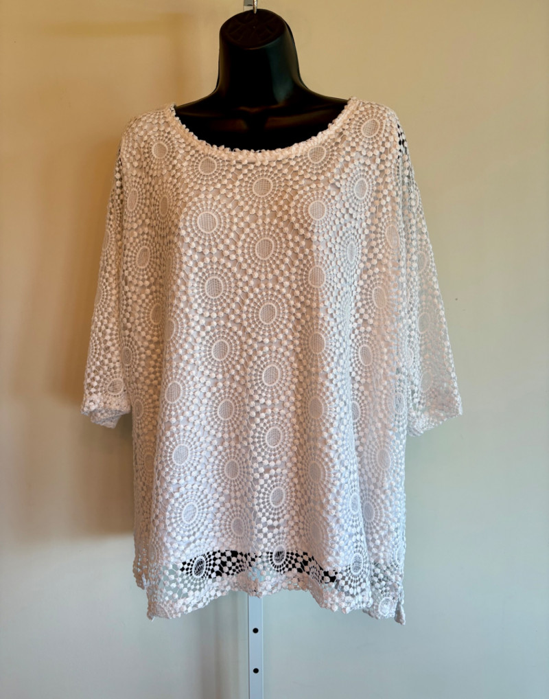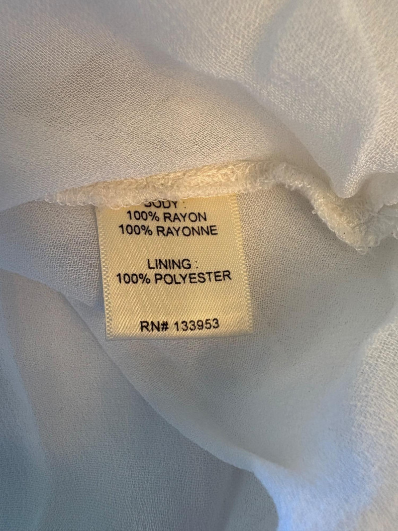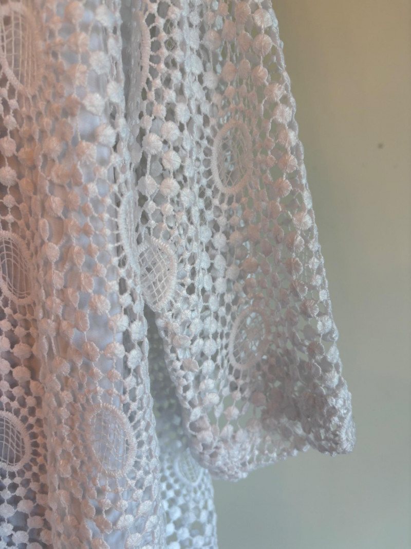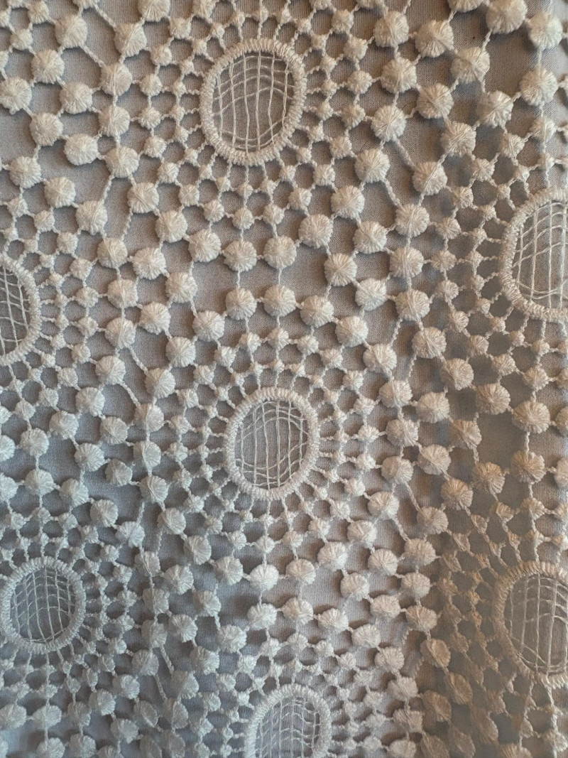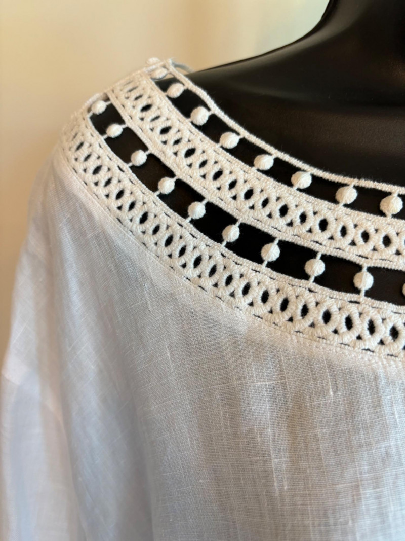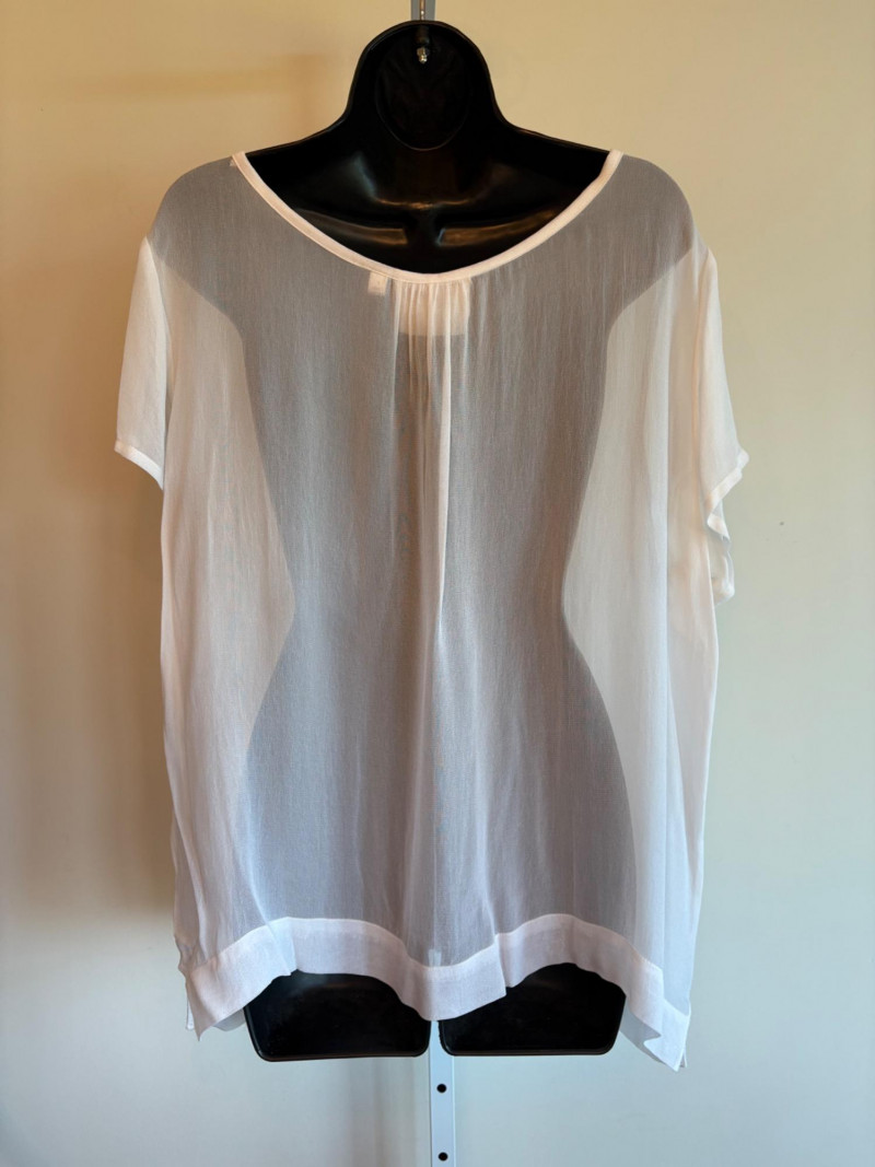 Trio of white on white tops that with details that provide interest but allow you to mix with any other color coordinate. Open border top from J. Jill has matching soft border on 3/4 sleeves, curved neckline, and small split hem. In excellent condition. 100% linen. Measures 25.5" pit to pit and 25" from back neckline to bottom hem. Size tag says XL. Filmy embroidered and appliqued top from One Fine Day has curved neckline, short sleeves, split hem, and hidden placket front button closure. Lots of embroidery & applique on the front with gathers along the back neckline. In very good used condition - there is a small snag on the front panel - see last photo, 100% rayon. Measures 24.5" pit to pit and 25" from shoulder to back hem. Size tag says L. Circle overlay top from Chico's has attached inner white shell with intricate white circle patterned overlay, curved neckline, split hem, and 3/4 sleeves. In excellent condition. Overlay is 100% polyester while inside shell is polyester & spandex blend. Measures 23.5" pit to pit and 27" from back neckline to bottom hem. Size tag says 3.