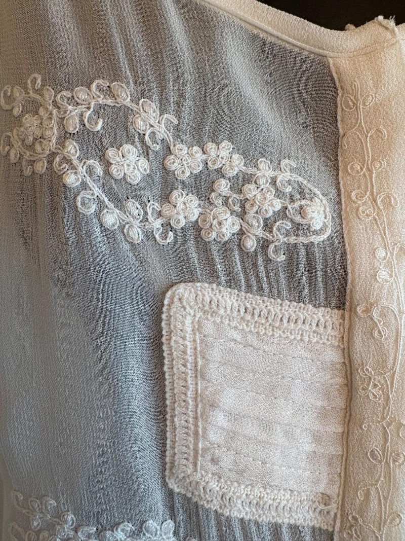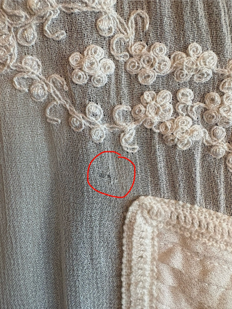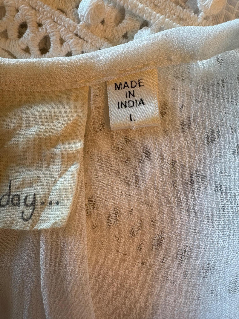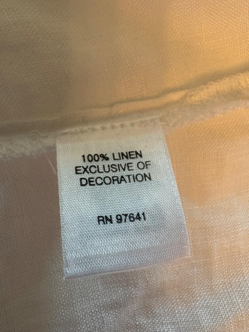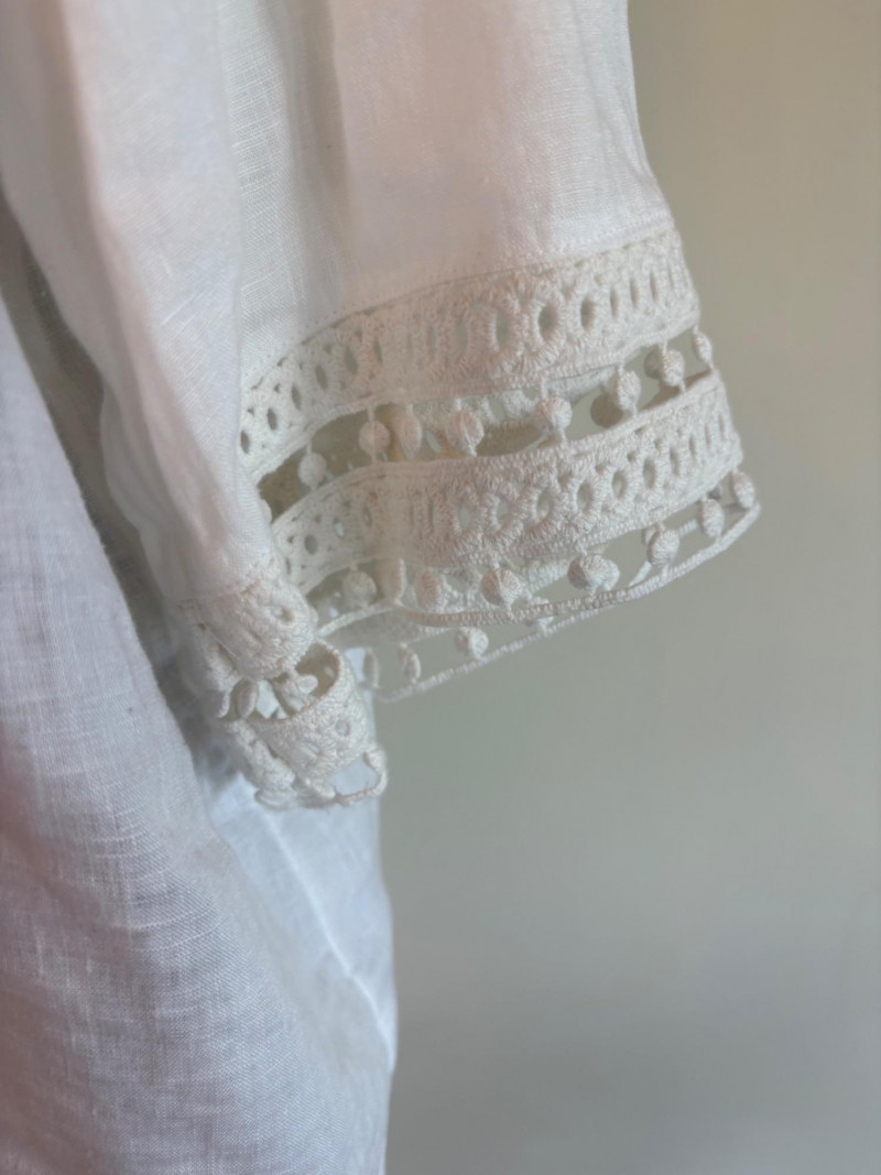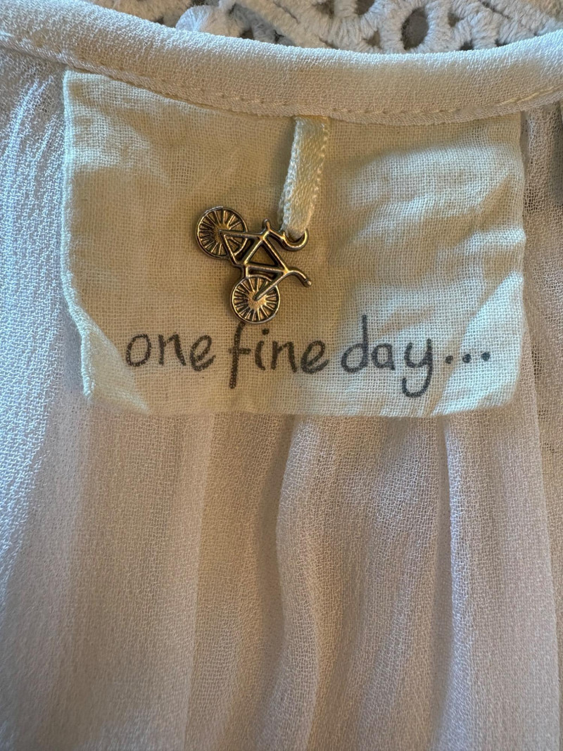 Trio of white on white tops that with details that provide interest but allow you to mix with any other color coordinate. Open border top from J. Jill has matching soft border on 3/4 sleeves, curved neckline, and small split hem. In excellent condition. 100% linen. Measures 25.5" pit to pit and 25" from back neckline to bottom hem. Size tag says XL. Filmy embroidered and appliqued top from One Fine Day has curved neckline, short sleeves, split hem, and hidden placket front button closure. Lots of embroidery & applique on the front with gathers along the back neckline. In very good used condition - there is a small snag on the front panel - see last photo, 100% rayon. Measures 24.5" pit to pit and 25" from shoulder to back hem. Size tag says L. Circle overlay top from Chico's has attached inner white shell with intricate white circle patterned overlay, curved neckline, split hem, and 3/4 sleeves. In excellent condition. Overlay is 100% polyester while inside shell is polyester & spandex blend. Measures 23.5" pit to pit and 27" from back neckline to bottom hem. Size tag says 3.