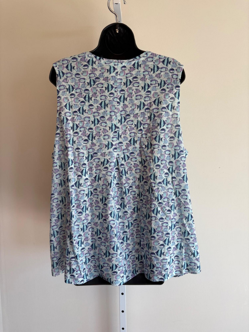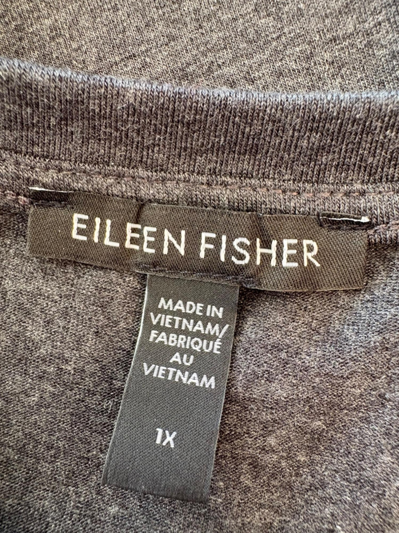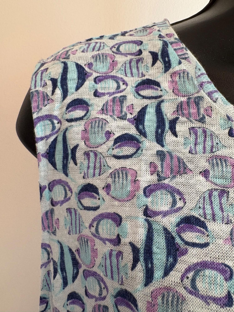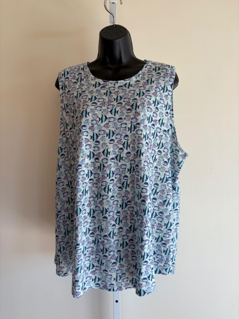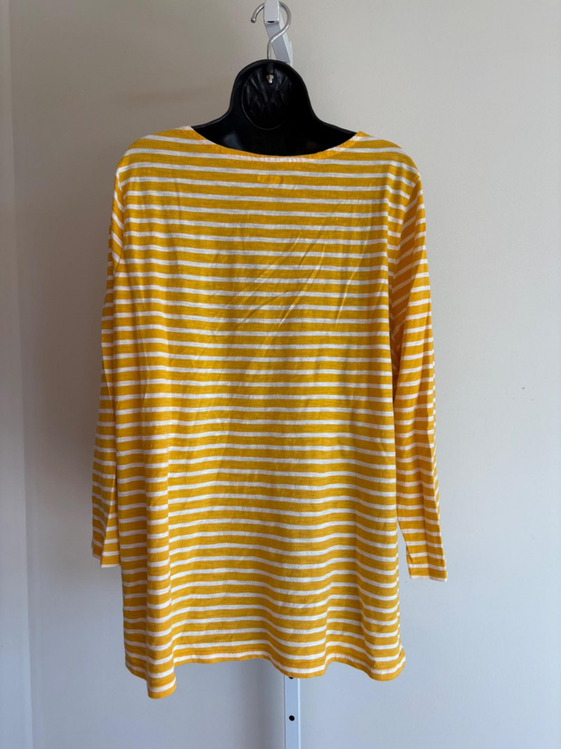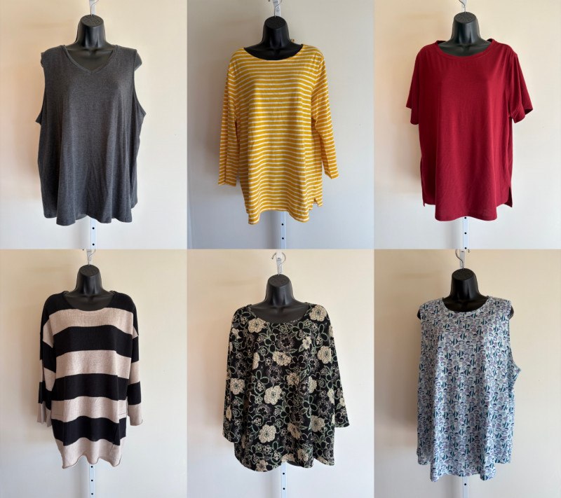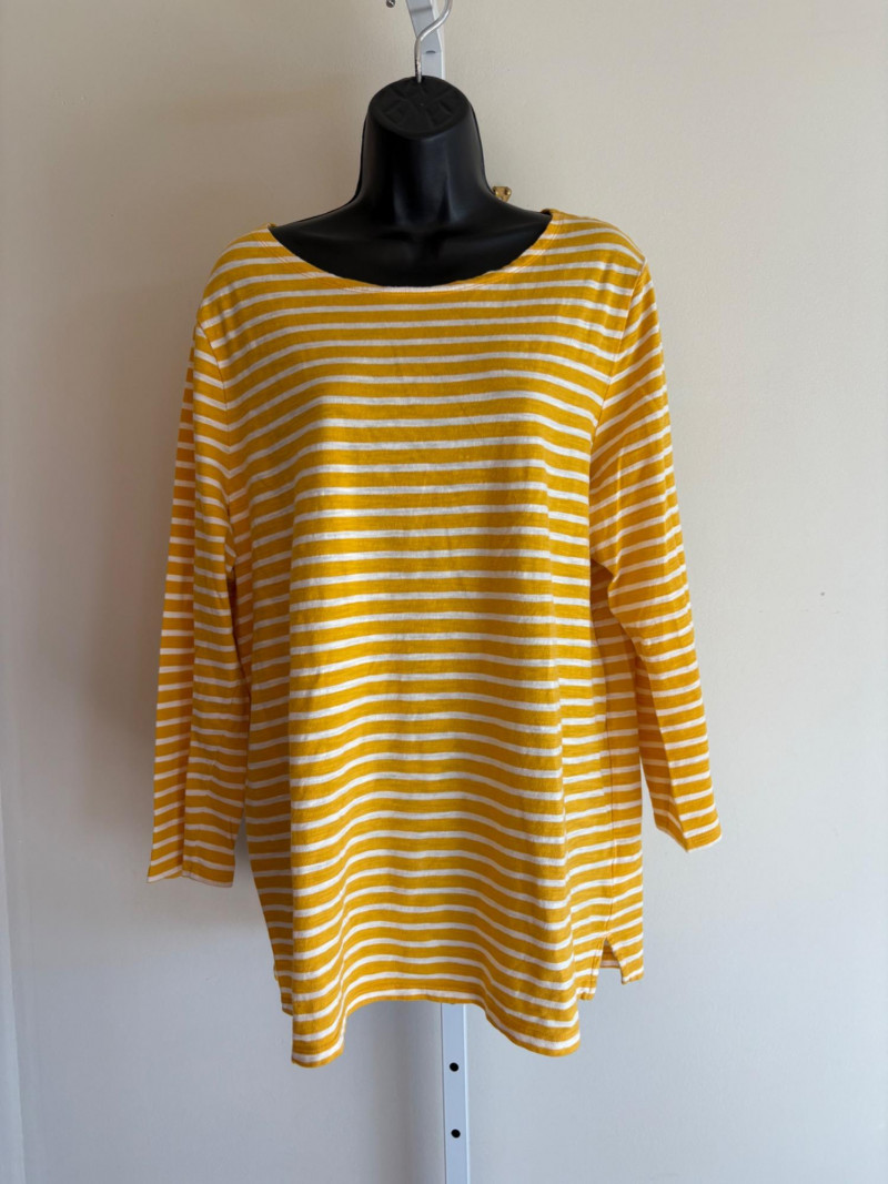 6 summer shirts/light sweaters from various makers. All measure 23.5" pit to pit and are in excellent condition. Yellow & white horizontal stripe shirt from Old Navy has 3.4 sleeves and split hem. 100% cotton. Measures 26" from back neckline to hem. Size tag says XXL. Maroon curved neck classic t-shirt from Athletic with split/lower back hem & back pleat. 62% polyester with 33% rayon and 5% spandex. Measures 28.5" from back neckline to hem. Size tag says XXL (20) Beige and black horizontal striped sweater from Eileen Fisher has curved neck, 3/4 sleeves, and 2 front patch pockets with side access. 100% organic linen. Measures 27" from back neckline to hem. Size tag says L/G. Blue fish print tank shirt from J. Jill has centered back pleat. 100% linen. Measures 26" from back neckline to hem. Size tag says XL. Black, green, and beige textured shirt from French Laundry has round neck and 3/4 sleeves. 83% polyester with 10% nylon and 7% spandex. Measures 24.5" from back neckline to hem. Size tag says XL. Super soft grey sleeveless t-shirt from Eileen Fisher has V-neck and slight flare. 95% Tencel Lyocell with 5% spandex. Measures 24" from back neckline to hem. Size tag says 1X.