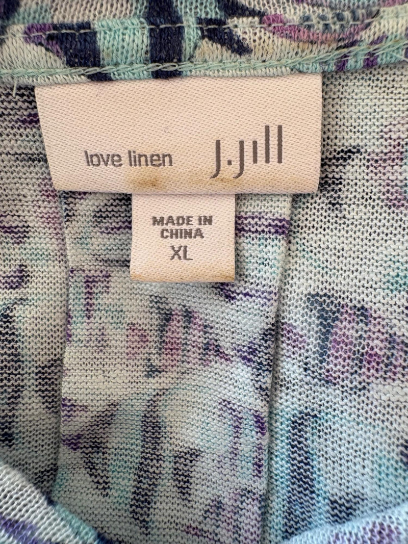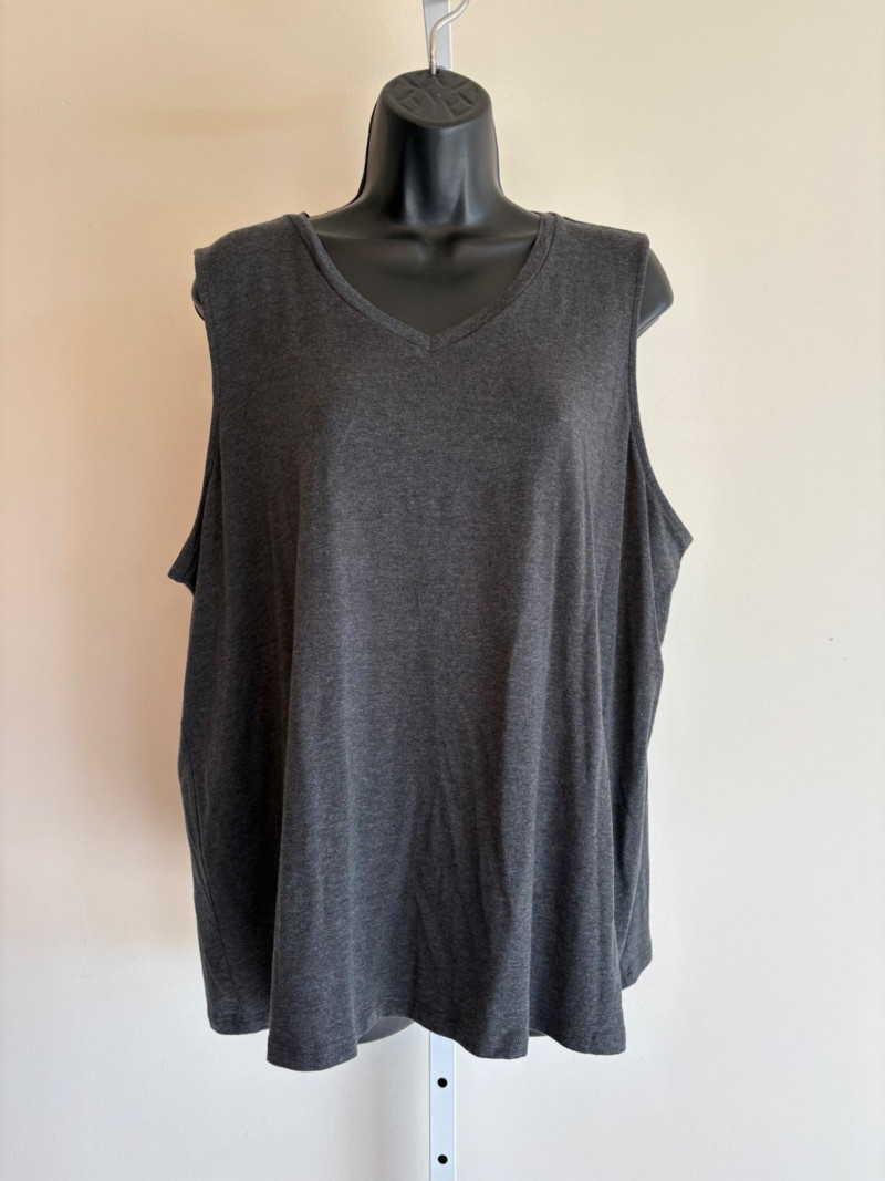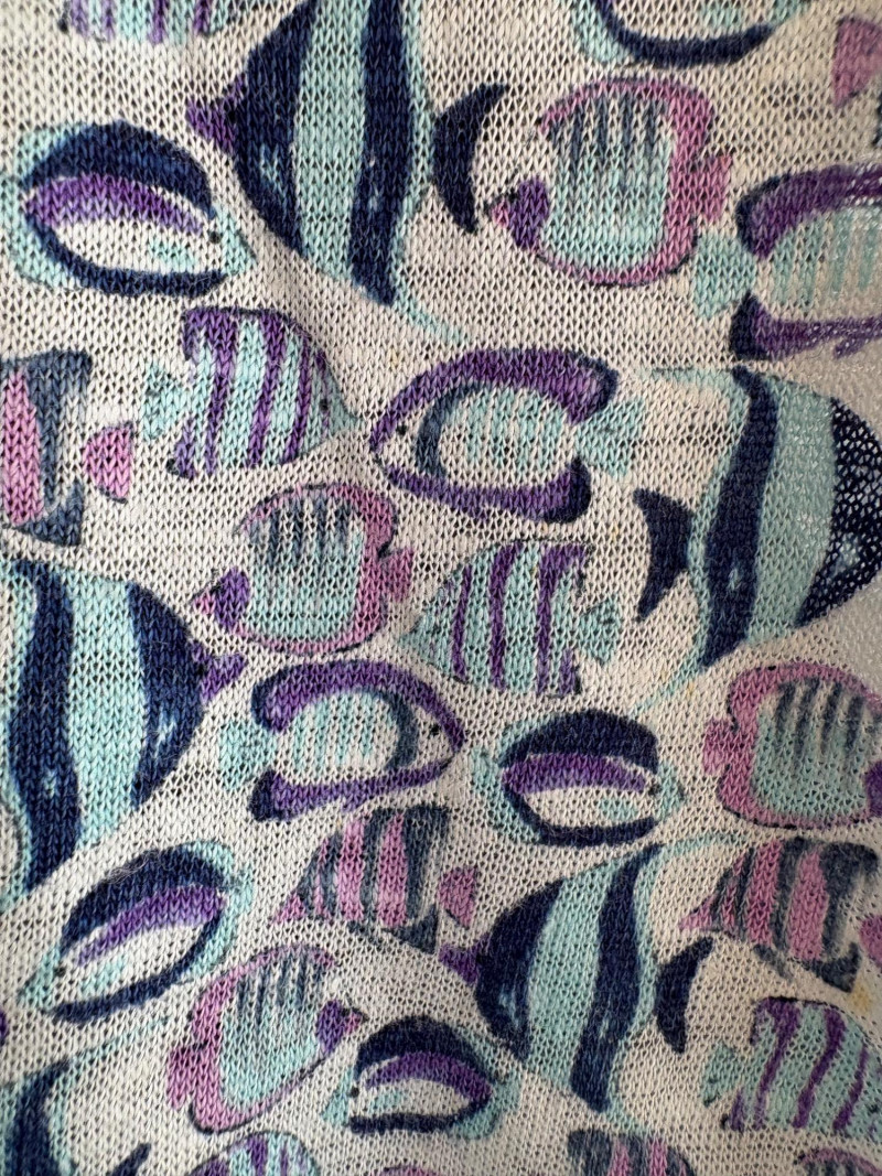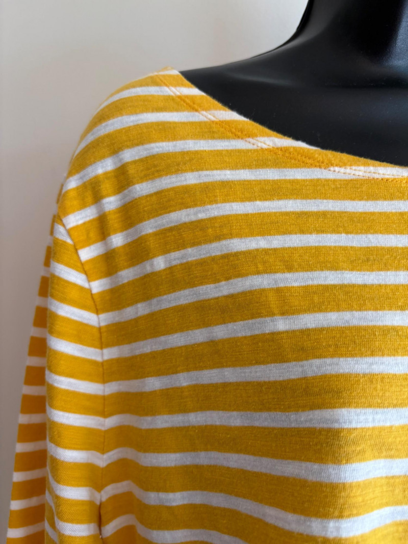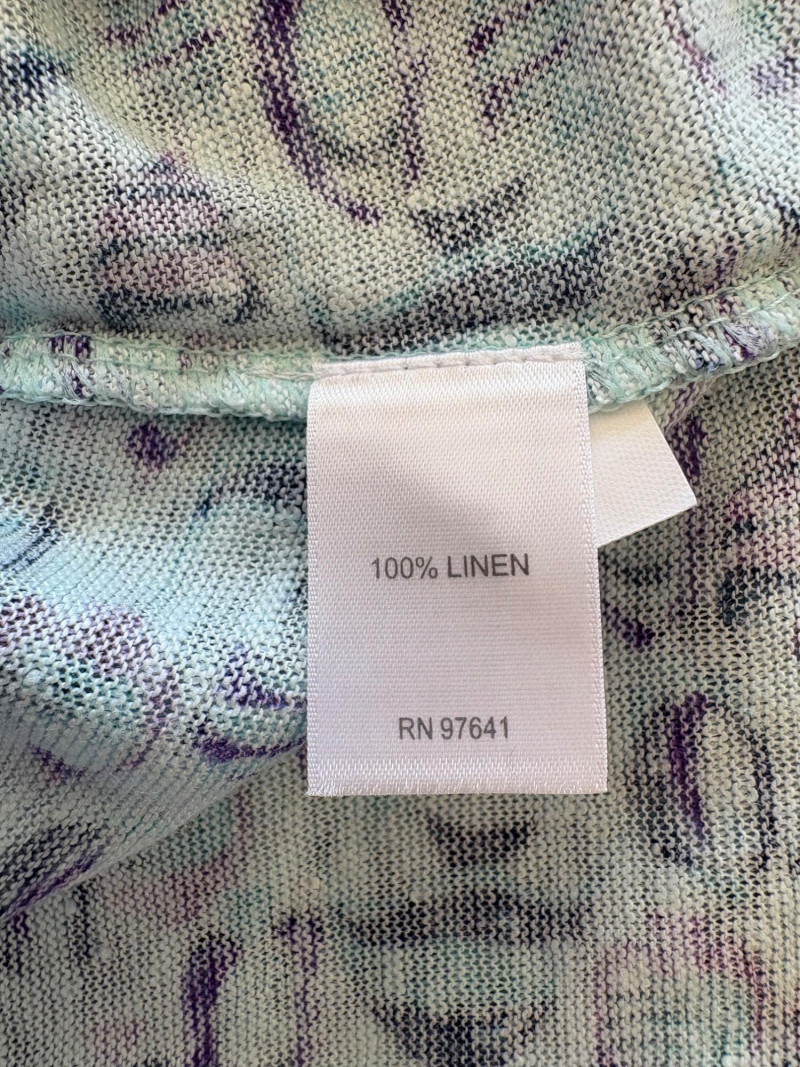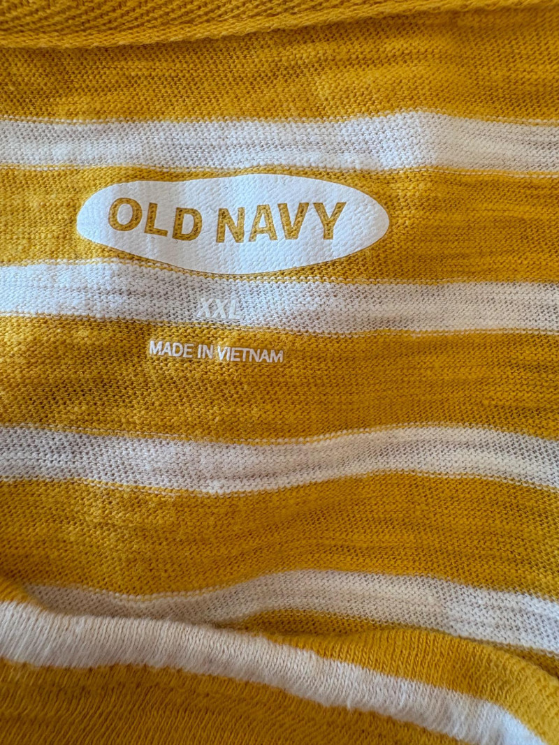 6 summer shirts/light sweaters from various makers. All measure 23.5" pit to pit and are in excellent condition. Yellow & white horizontal stripe shirt from Old Navy has 3.4 sleeves and split hem. 100% cotton. Measures 26" from back neckline to hem. Size tag says XXL. Maroon curved neck classic t-shirt from Athletic with split/lower back hem & back pleat. 62% polyester with 33% rayon and 5% spandex. Measures 28.5" from back neckline to hem. Size tag says XXL (20) Beige and black horizontal striped sweater from Eileen Fisher has curved neck, 3/4 sleeves, and 2 front patch pockets with side access. 100% organic linen. Measures 27" from back neckline to hem. Size tag says L/G. Blue fish print tank shirt from J. Jill has centered back pleat. 100% linen. Measures 26" from back neckline to hem. Size tag says XL. Black, green, and beige textured shirt from French Laundry has round neck and 3/4 sleeves. 83% polyester with 10% nylon and 7% spandex. Measures 24.5" from back neckline to hem. Size tag says XL. Super soft grey sleeveless t-shirt from Eileen Fisher has V-neck and slight flare. 95% Tencel Lyocell with 5% spandex. Measures 24" from back neckline to hem. Size tag says 1X.