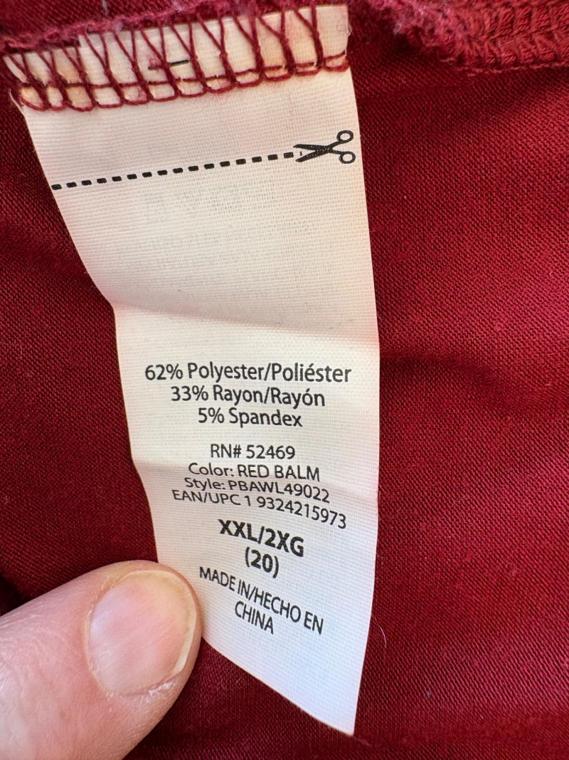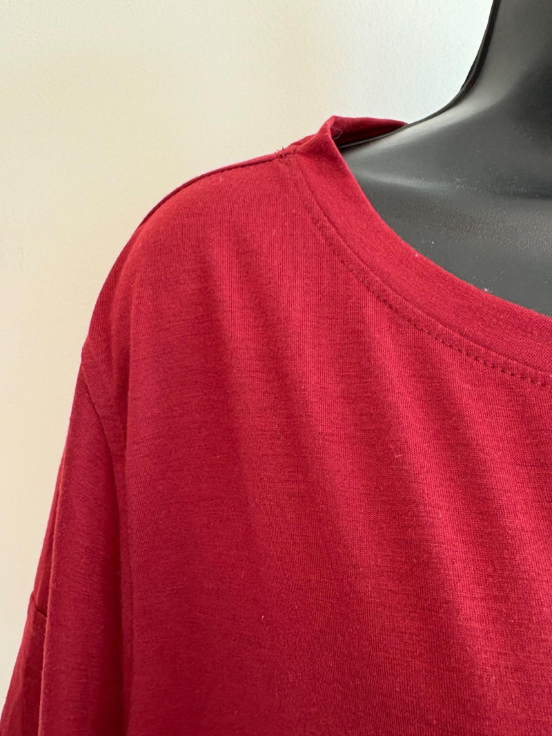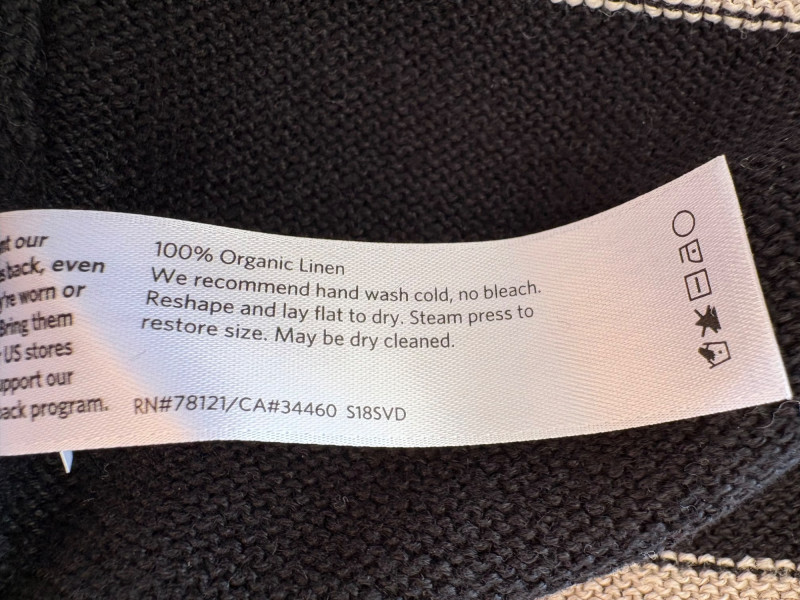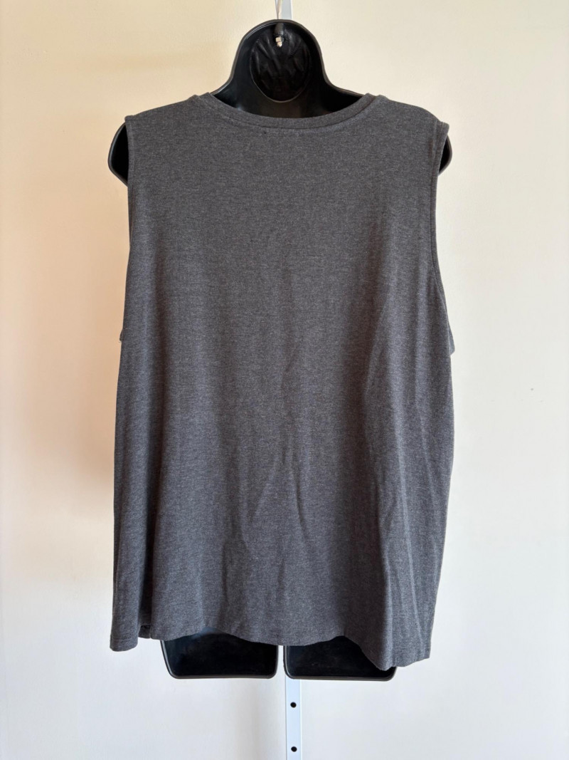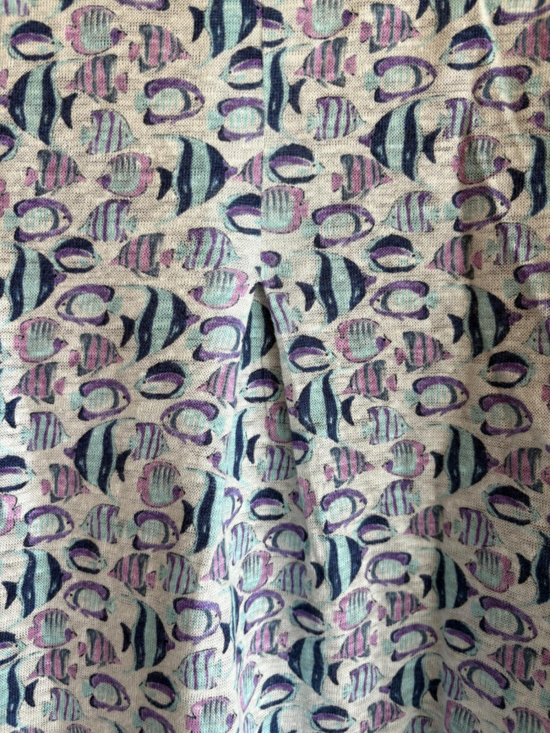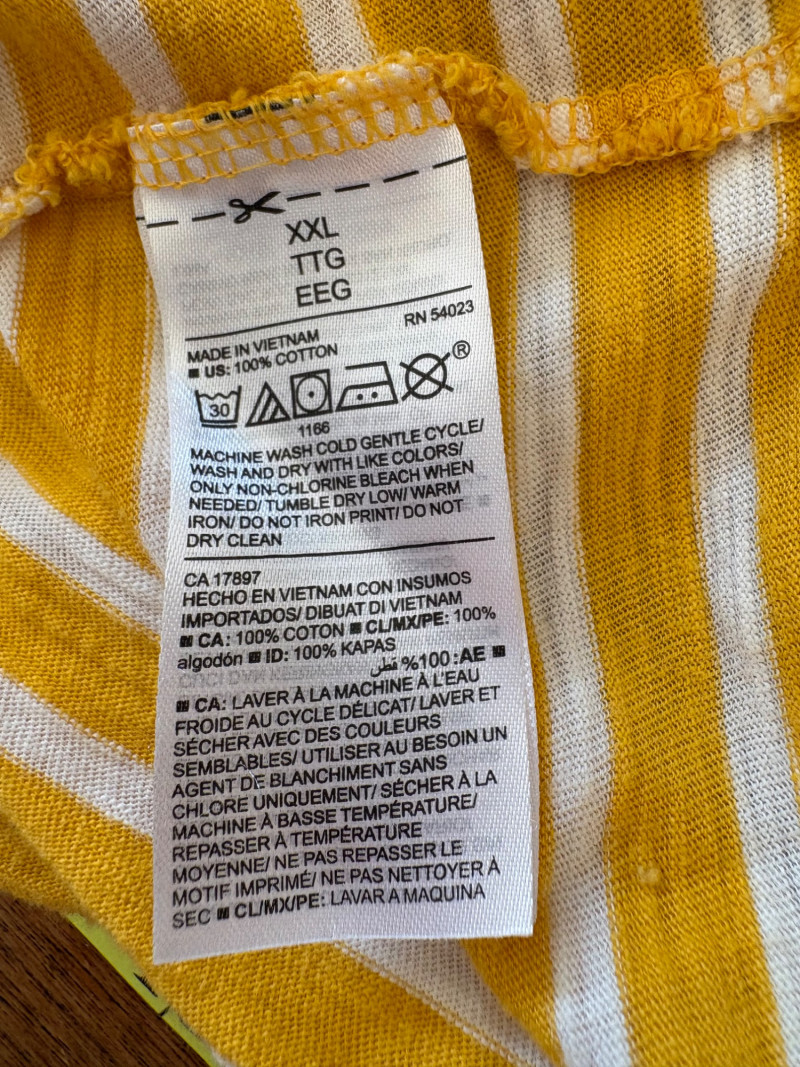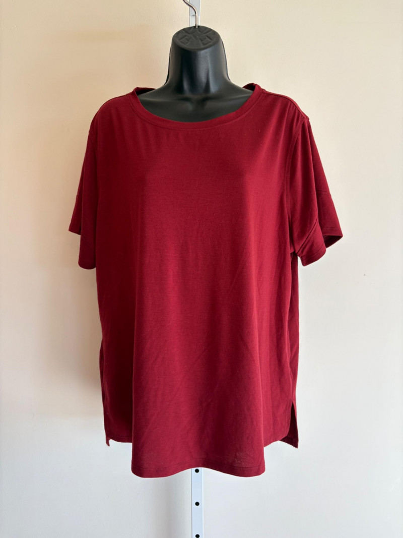 6 summer shirts/light sweaters from various makers. All measure 23.5" pit to pit and are in excellent condition. Yellow & white horizontal stripe shirt from Old Navy has 3.4 sleeves and split hem. 100% cotton. Measures 26" from back neckline to hem. Size tag says XXL. Maroon curved neck classic t-shirt from Athletic with split/lower back hem & back pleat. 62% polyester with 33% rayon and 5% spandex. Measures 28.5" from back neckline to hem. Size tag says XXL (20) Beige and black horizontal striped sweater from Eileen Fisher has curved neck, 3/4 sleeves, and 2 front patch pockets with side access. 100% organic linen. Measures 27" from back neckline to hem. Size tag says L/G. Blue fish print tank shirt from J. Jill has centered back pleat. 100% linen. Measures 26" from back neckline to hem. Size tag says XL. Black, green, and beige textured shirt from French Laundry has round neck and 3/4 sleeves. 83% polyester with 10% nylon and 7% spandex. Measures 24.5" from back neckline to hem. Size tag says XL. Super soft grey sleeveless t-shirt from Eileen Fisher has V-neck and slight flare. 95% Tencel Lyocell with 5% spandex. Measures 24" from back neckline to hem. Size tag says 1X.