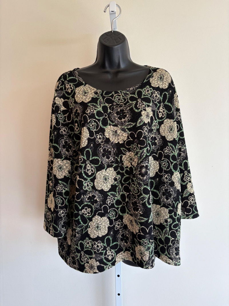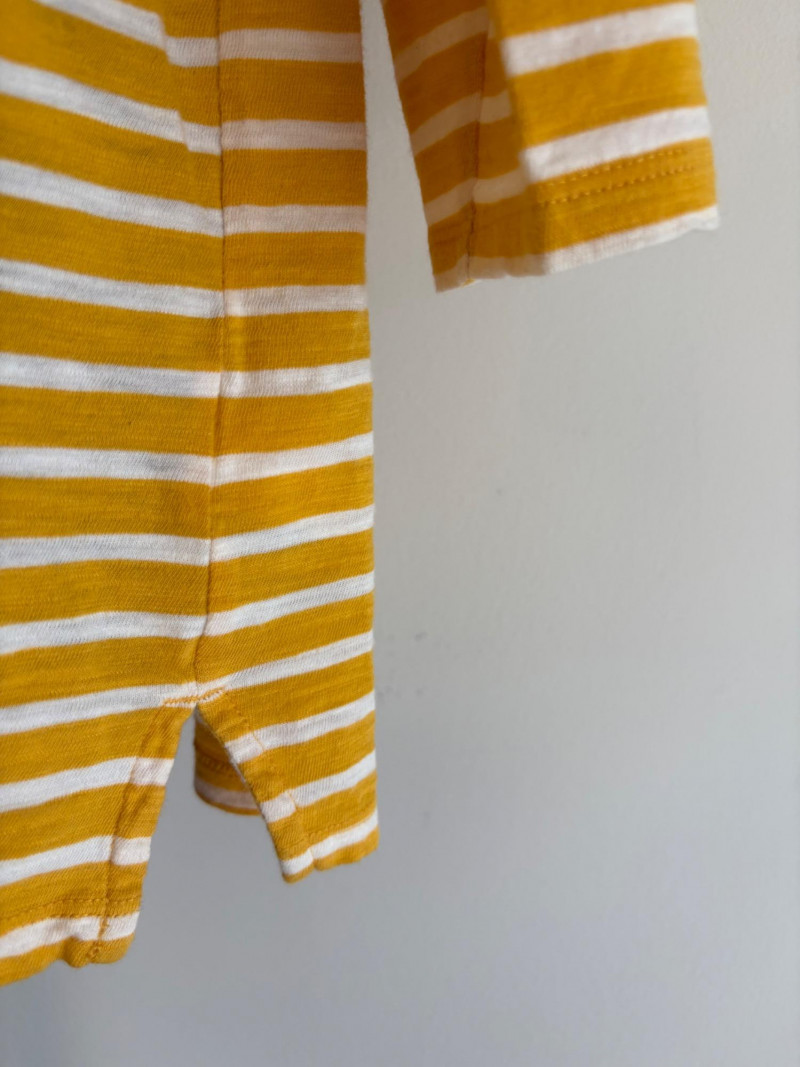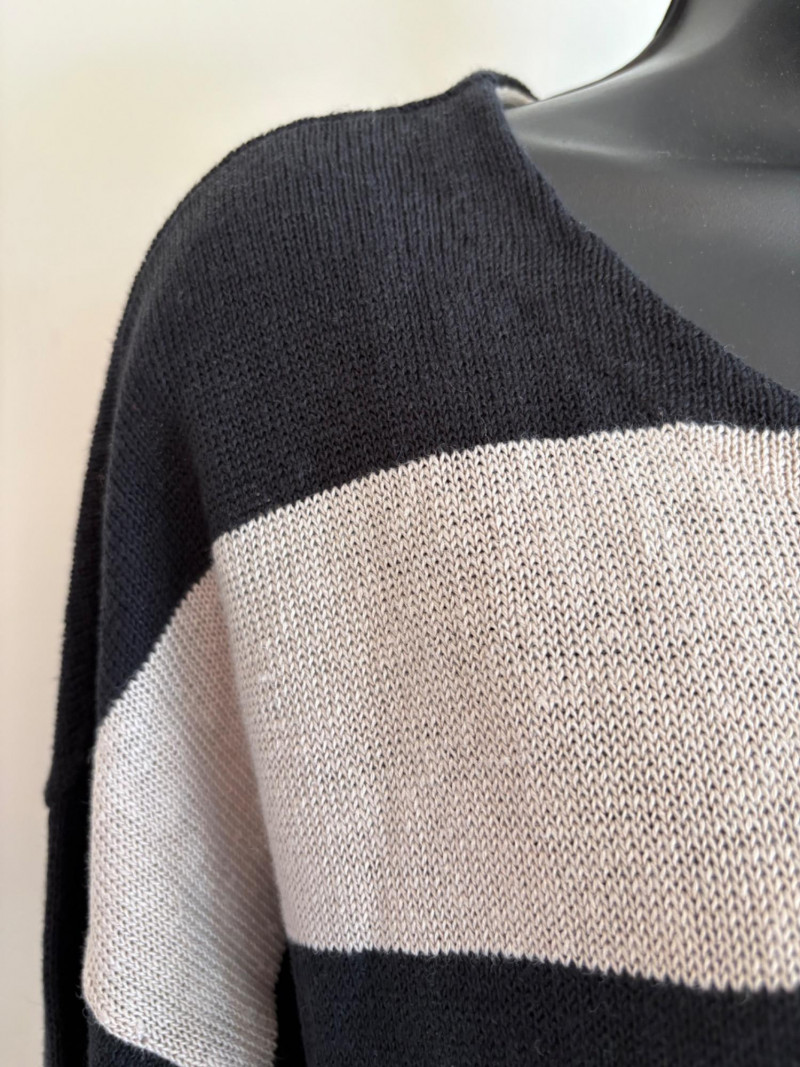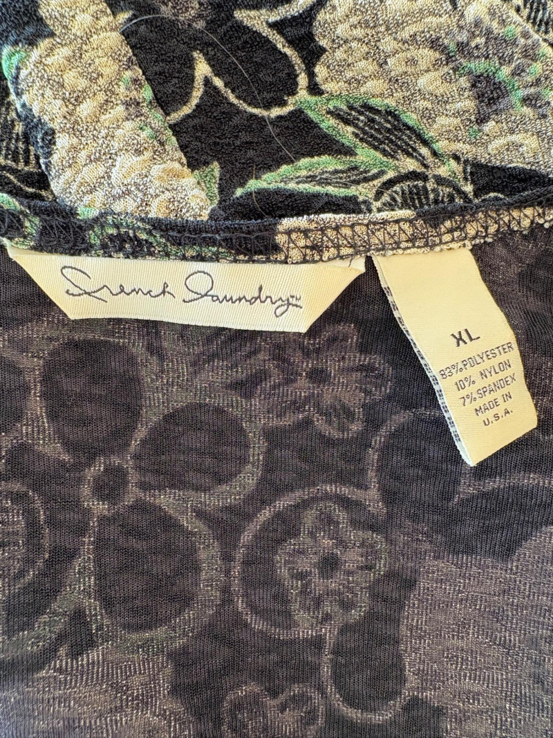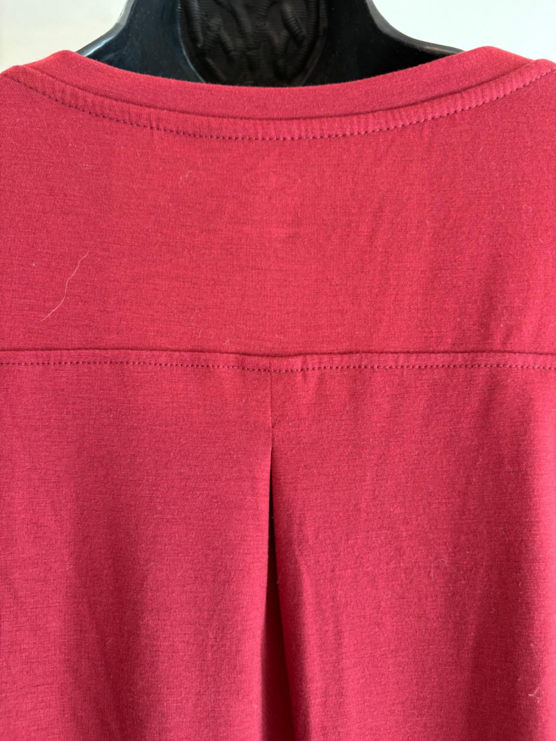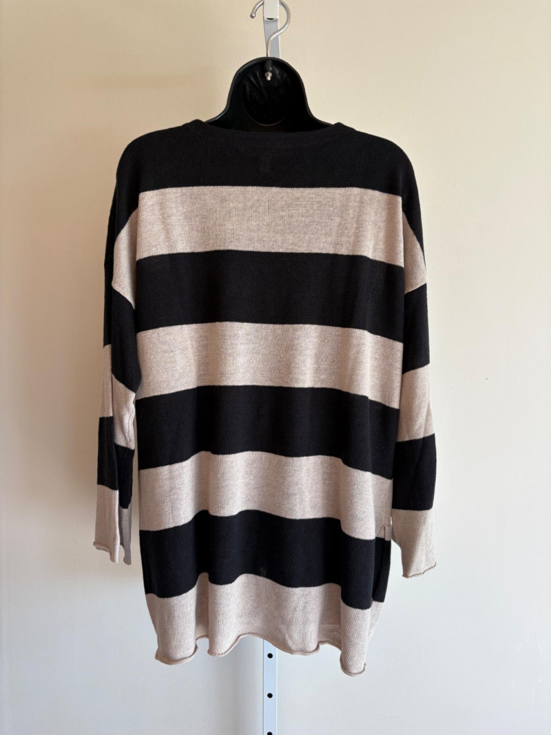 6 summer shirts/light sweaters from various makers. All measure 23.5" pit to pit and are in excellent condition. Yellow & white horizontal stripe shirt from Old Navy has 3.4 sleeves and split hem. 100% cotton. Measures 26" from back neckline to hem. Size tag says XXL. Maroon curved neck classic t-shirt from Athletic with split/lower back hem & back pleat. 62% polyester with 33% rayon and 5% spandex. Measures 28.5" from back neckline to hem. Size tag says XXL (20) Beige and black horizontal striped sweater from Eileen Fisher has curved neck, 3/4 sleeves, and 2 front patch pockets with side access. 100% organic linen. Measures 27" from back neckline to hem. Size tag says L/G. Blue fish print tank shirt from J. Jill has centered back pleat. 100% linen. Measures 26" from back neckline to hem. Size tag says XL. Black, green, and beige textured shirt from French Laundry has round neck and 3/4 sleeves. 83% polyester with 10% nylon and 7% spandex. Measures 24.5" from back neckline to hem. Size tag says XL. Super soft grey sleeveless t-shirt from Eileen Fisher has V-neck and slight flare. 95% Tencel Lyocell with 5% spandex. Measures 24" from back neckline to hem. Size tag says 1X.