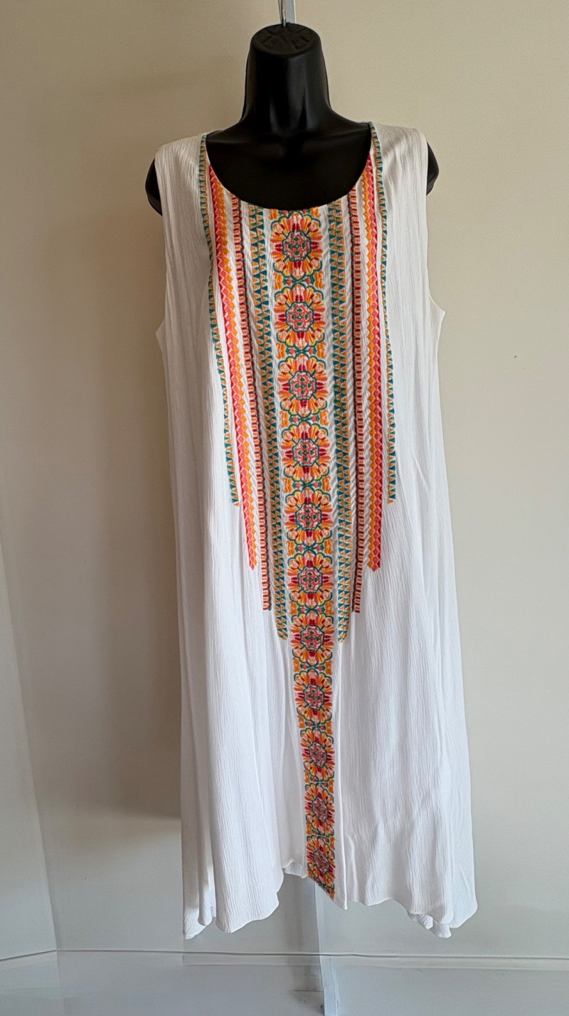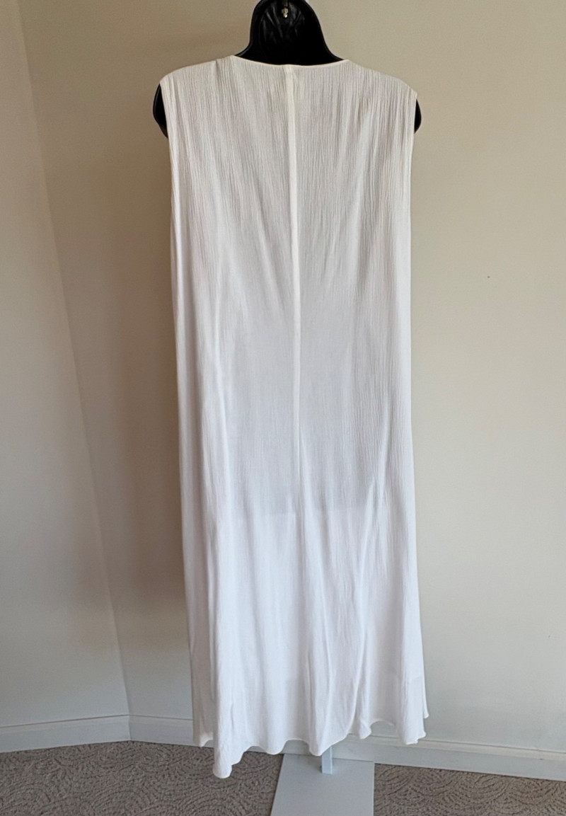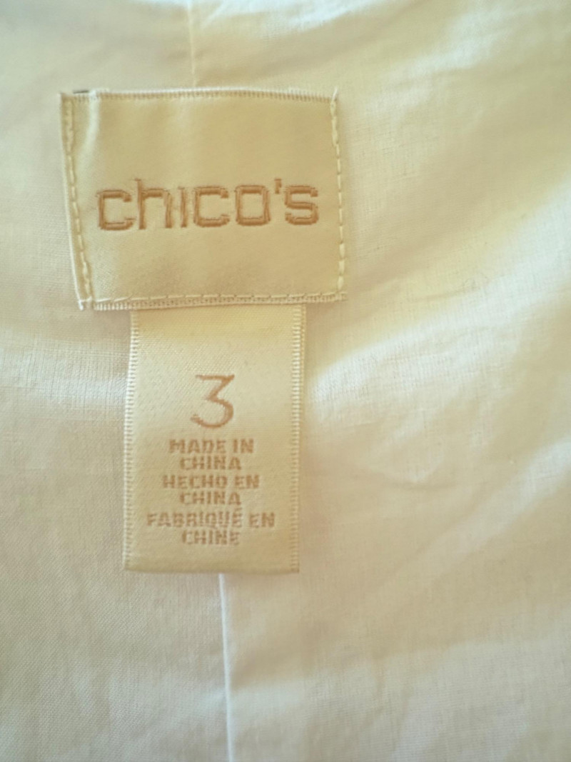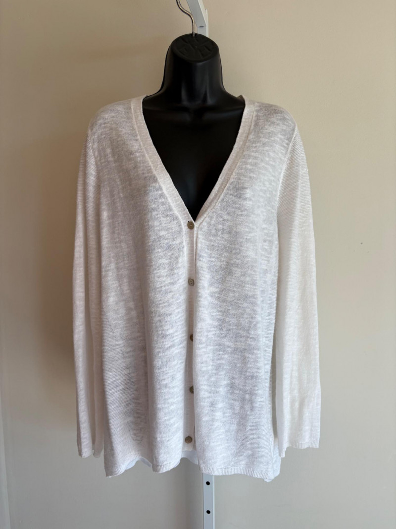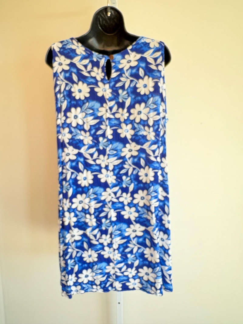 Two great summer dresses with a pure white cardigan for cooler evenings that will work with either dress. White gauze dress from Chico's has center front embroidery in cheery colors, curved pull-over neckline, and is fully lined. In excellent condition. Outer dress is 100% rayon with 100% cotton lining. Measures 22.5" pit to pit and 47" from back neckline to hem - note that hem is slightly longer & curved in back. Size tag says 3. Blue and white Hawaiian print floral from Hibiscus Collection of Hawaii has curved neckline, single back button closure, and A-line design. In excellent condition. 100% rayon. Measures 22" pit to pit and 32" from back neckline to hem. Size tag says OSFA (so NOT true!!!!) White lightweight open weave cardigan from Eileen Fisher has V-neck with 5 button front closure and ribbed cuffs & hem. Contrast white on white weave on sleeves and center back to add interest. In excellent condition. 56% organic linen with 44% organic cotton. Measures 23" pit to pit and 29" from back neckline to hem. Size tag says XL.