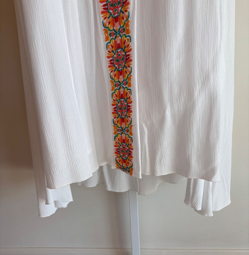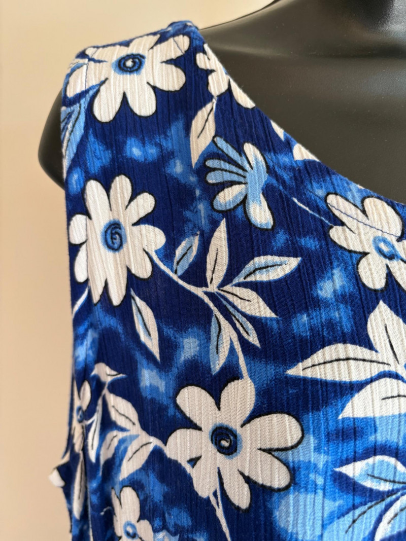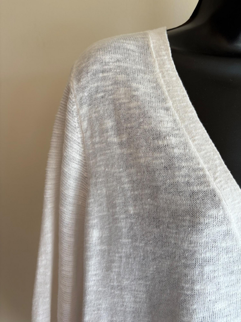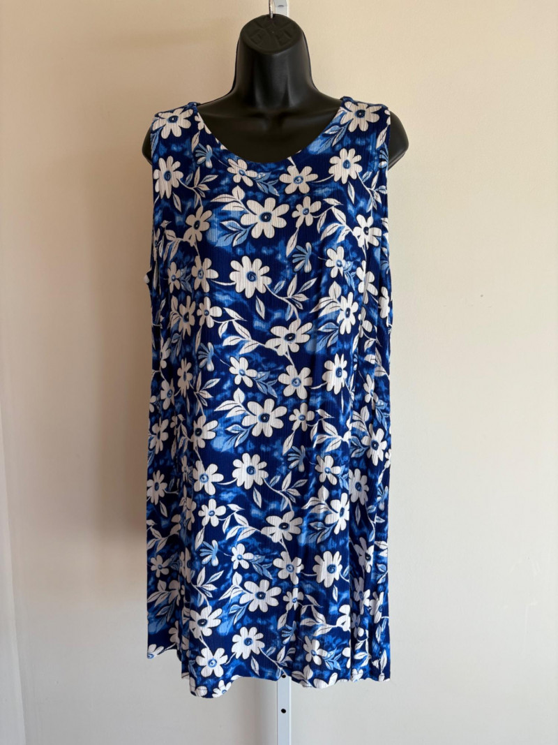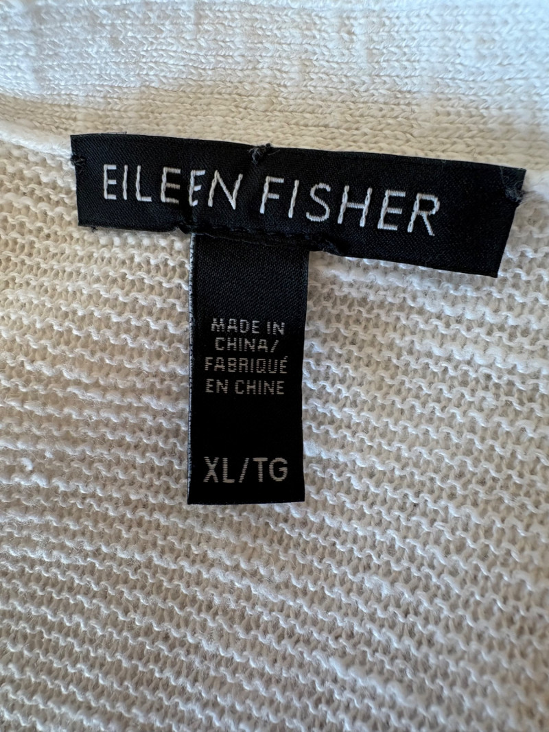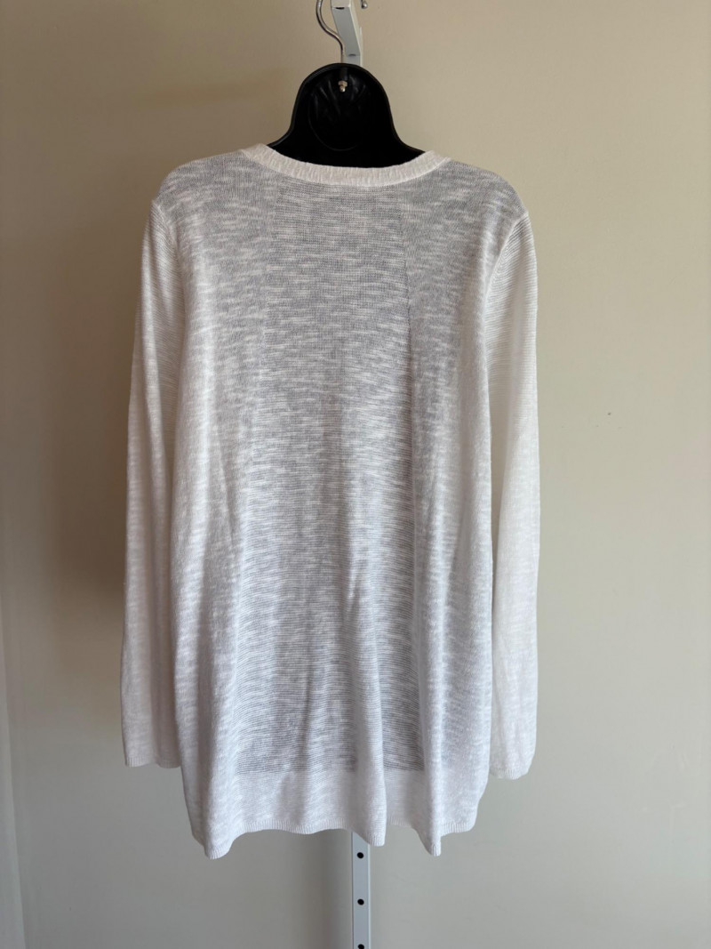 Two great summer dresses with a pure white cardigan for cooler evenings that will work with either dress. White gauze dress from Chico's has center front embroidery in cheery colors, curved pull-over neckline, and is fully lined. In excellent condition. Outer dress is 100% rayon with 100% cotton lining. Measures 22.5" pit to pit and 47" from back neckline to hem - note that hem is slightly longer & curved in back. Size tag says 3. Blue and white Hawaiian print floral from Hibiscus Collection of Hawaii has curved neckline, single back button closure, and A-line design. In excellent condition. 100% rayon. Measures 22" pit to pit and 32" from back neckline to hem. Size tag says OSFA (so NOT true!!!!) White lightweight open weave cardigan from Eileen Fisher has V-neck with 5 button front closure and ribbed cuffs & hem. Contrast white on white weave on sleeves and center back to add interest. In excellent condition. 56% organic linen with 44% organic cotton. Measures 23" pit to pit and 29" from back neckline to hem. Size tag says XL.