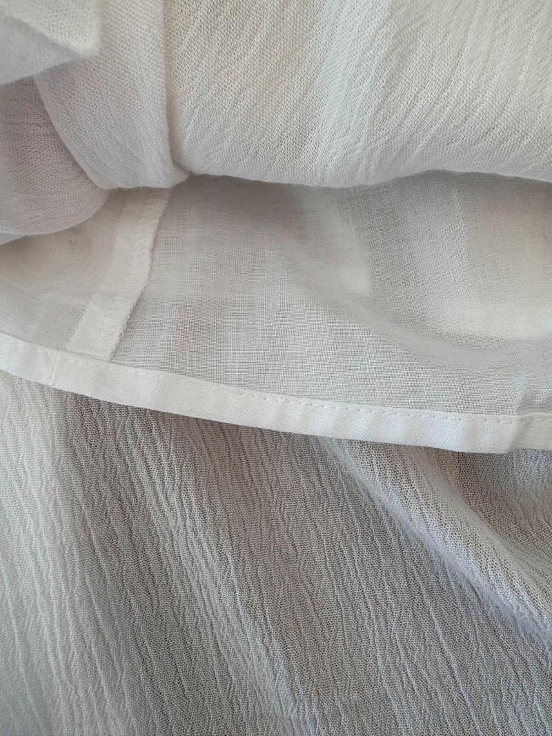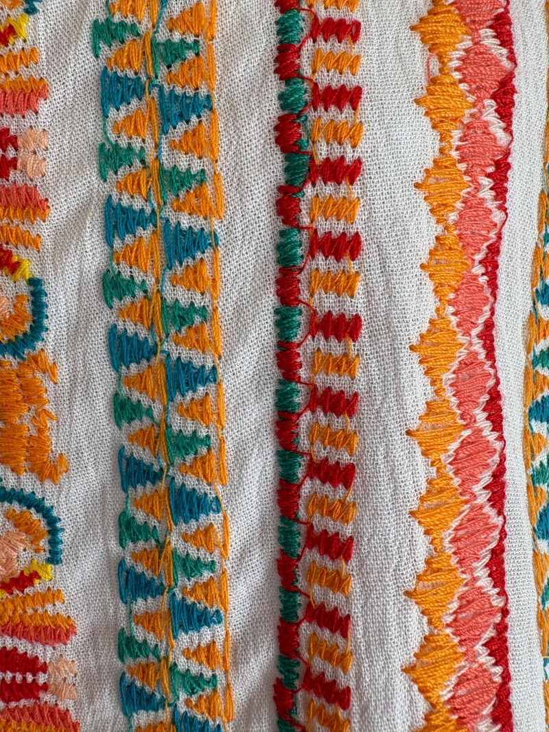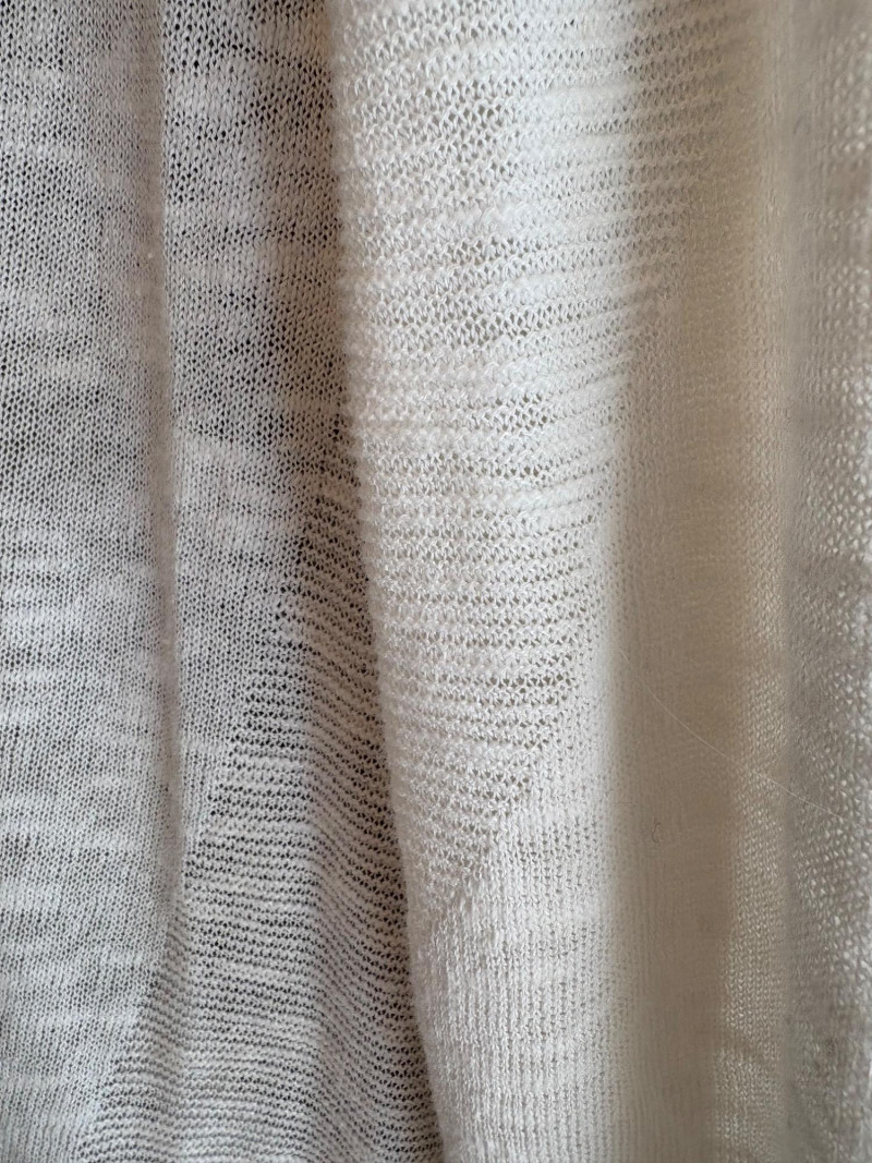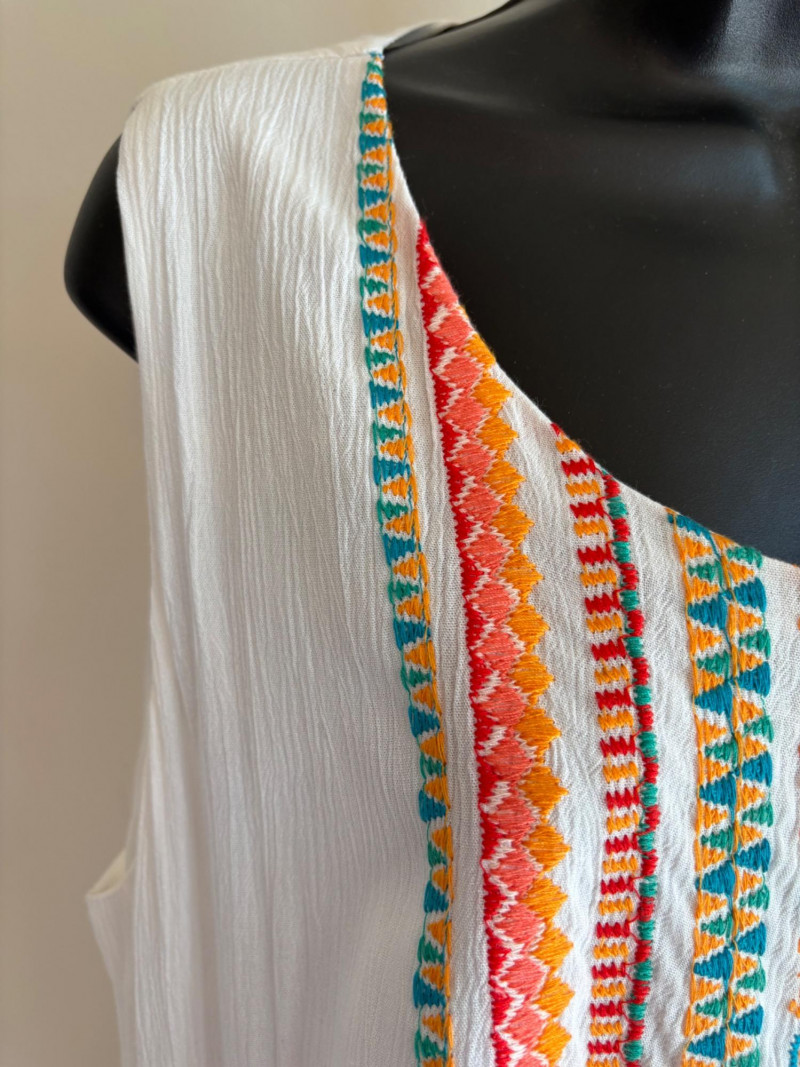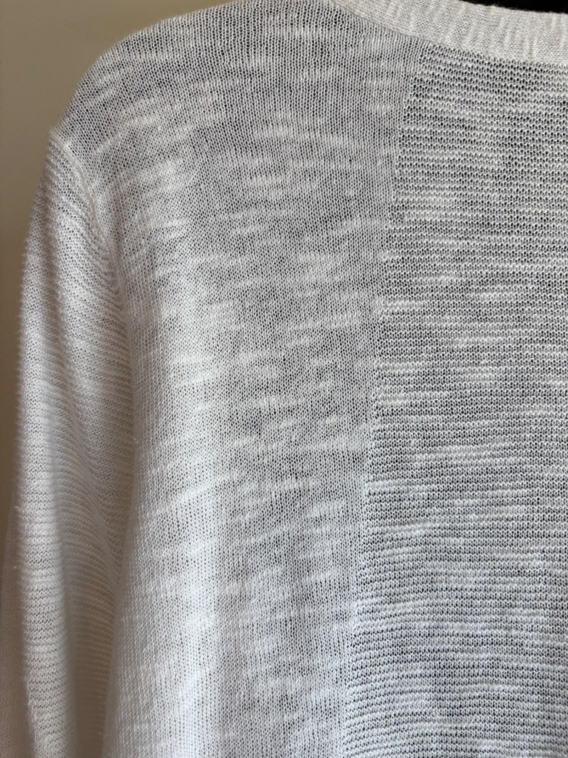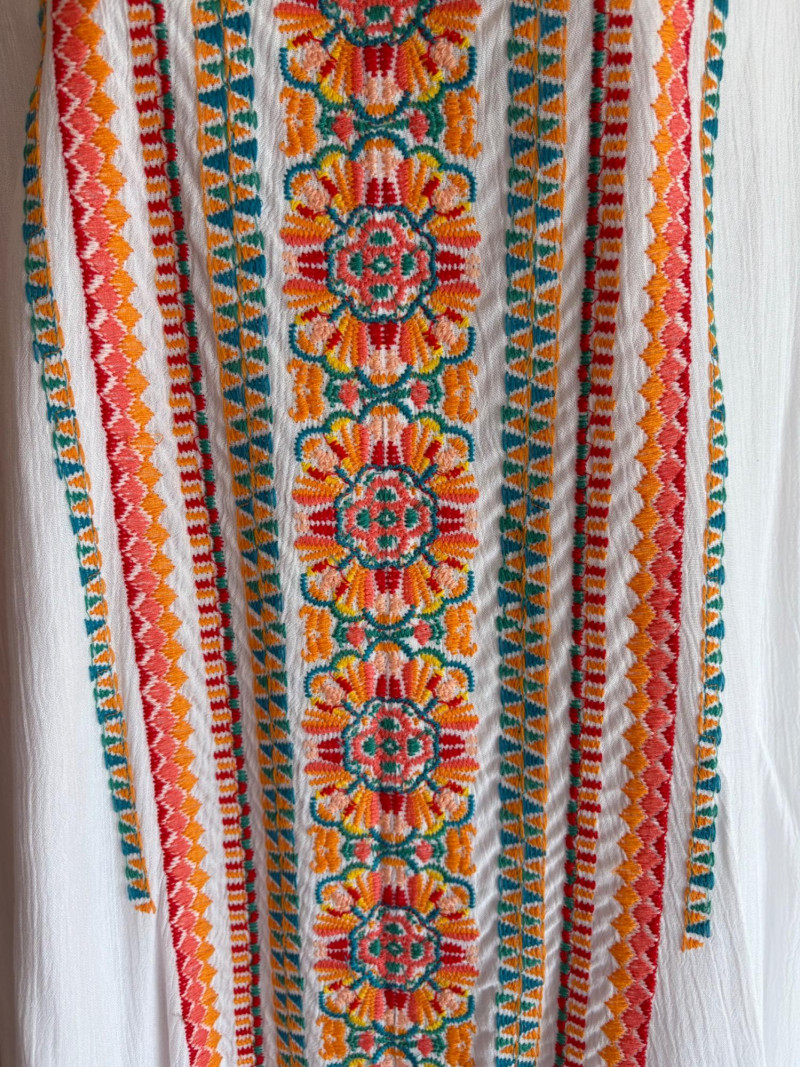 Two great summer dresses with a pure white cardigan for cooler evenings that will work with either dress. White gauze dress from Chico's has center front embroidery in cheery colors, curved pull-over neckline, and is fully lined. In excellent condition. Outer dress is 100% rayon with 100% cotton lining. Measures 22.5" pit to pit and 47" from back neckline to hem - note that hem is slightly longer & curved in back. Size tag says 3. Blue and white Hawaiian print floral from Hibiscus Collection of Hawaii has curved neckline, single back button closure, and A-line design. In excellent condition. 100% rayon. Measures 22" pit to pit and 32" from back neckline to hem. Size tag says OSFA (so NOT true!!!!) White lightweight open weave cardigan from Eileen Fisher has V-neck with 5 button front closure and ribbed cuffs & hem. Contrast white on white weave on sleeves and center back to add interest. In excellent condition. 56% organic linen with 44% organic cotton. Measures 23" pit to pit and 29" from back neckline to hem. Size tag says XL.