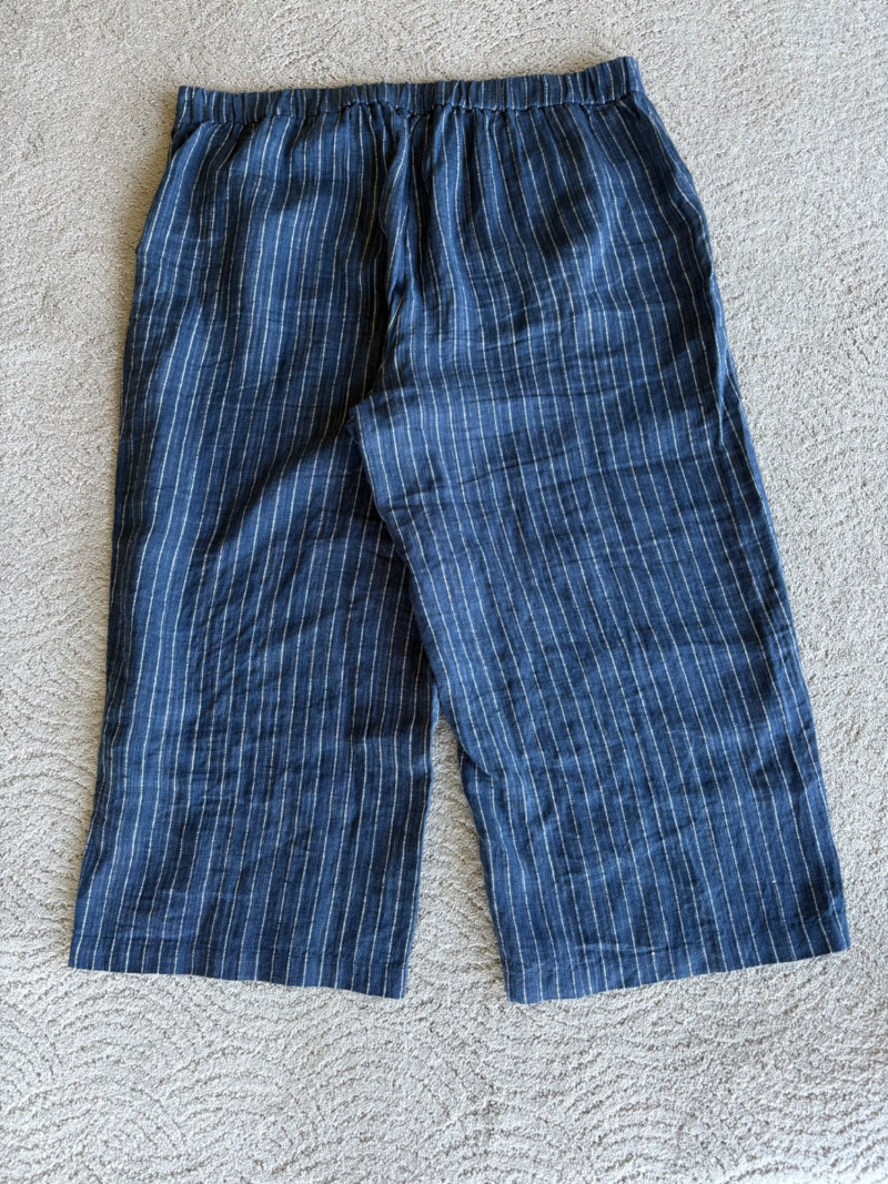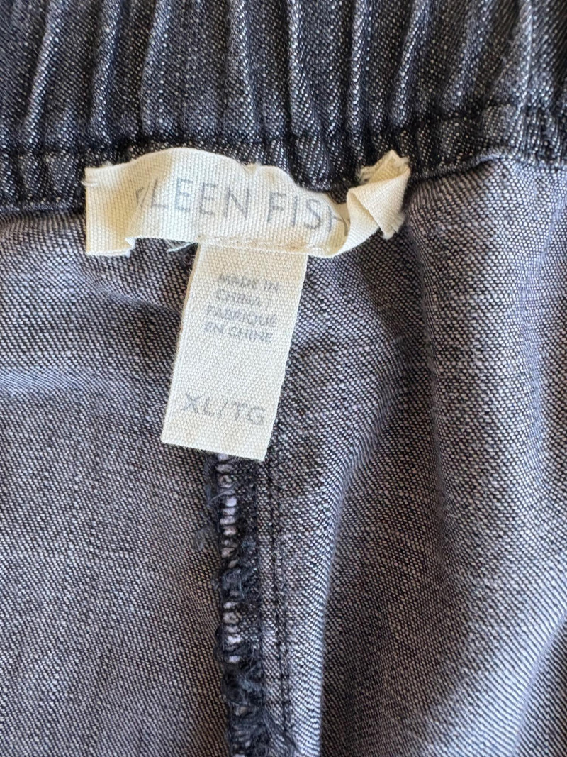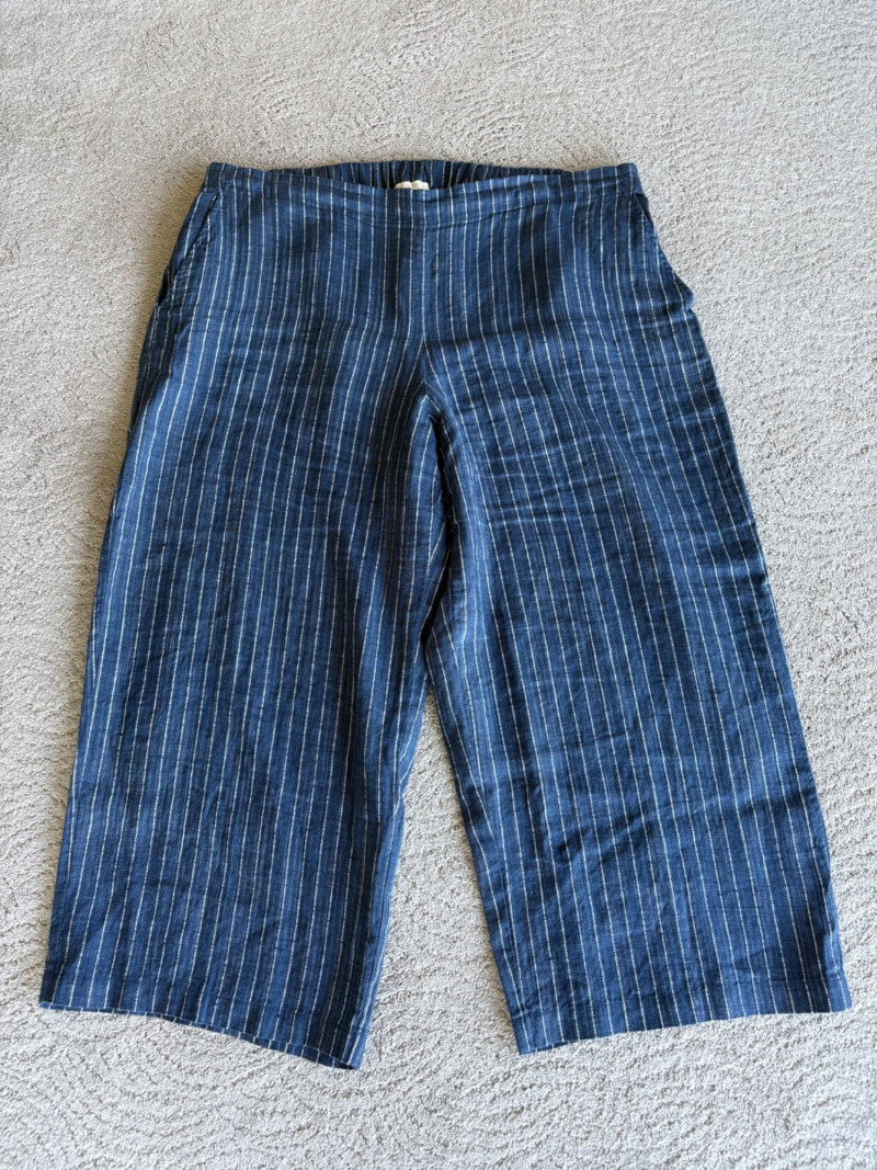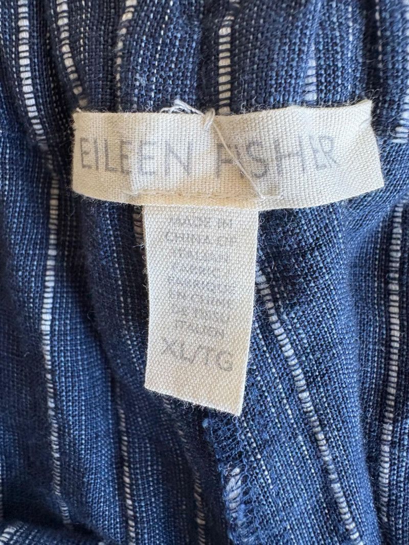 2 pairs of great summer pants from Eileen Fisher. Both measure 20" side to side at waist and are in excellent condition. Blue pair has vertical white stripes and a wide waistband that's elasticated in the back. Set-in side front pockets with very wide legs. 100% linen. 24" inseam. Size tag says XL. Grey pieced pair has roomy slanted set-in front pockets, zip fly closure, slightly tapered leg, back welted pockets, and elasticated back waistband. In excellent condition. 25" inseam. 63% Lyocell with 37% cotton. Size tag says XL.